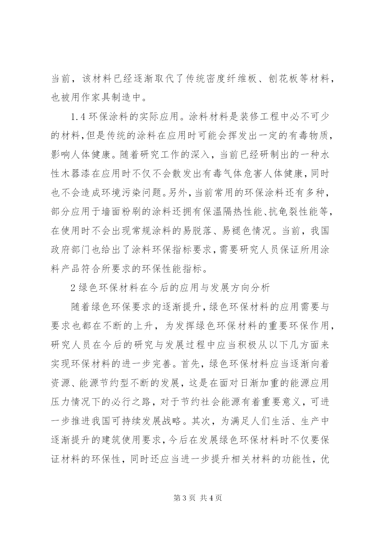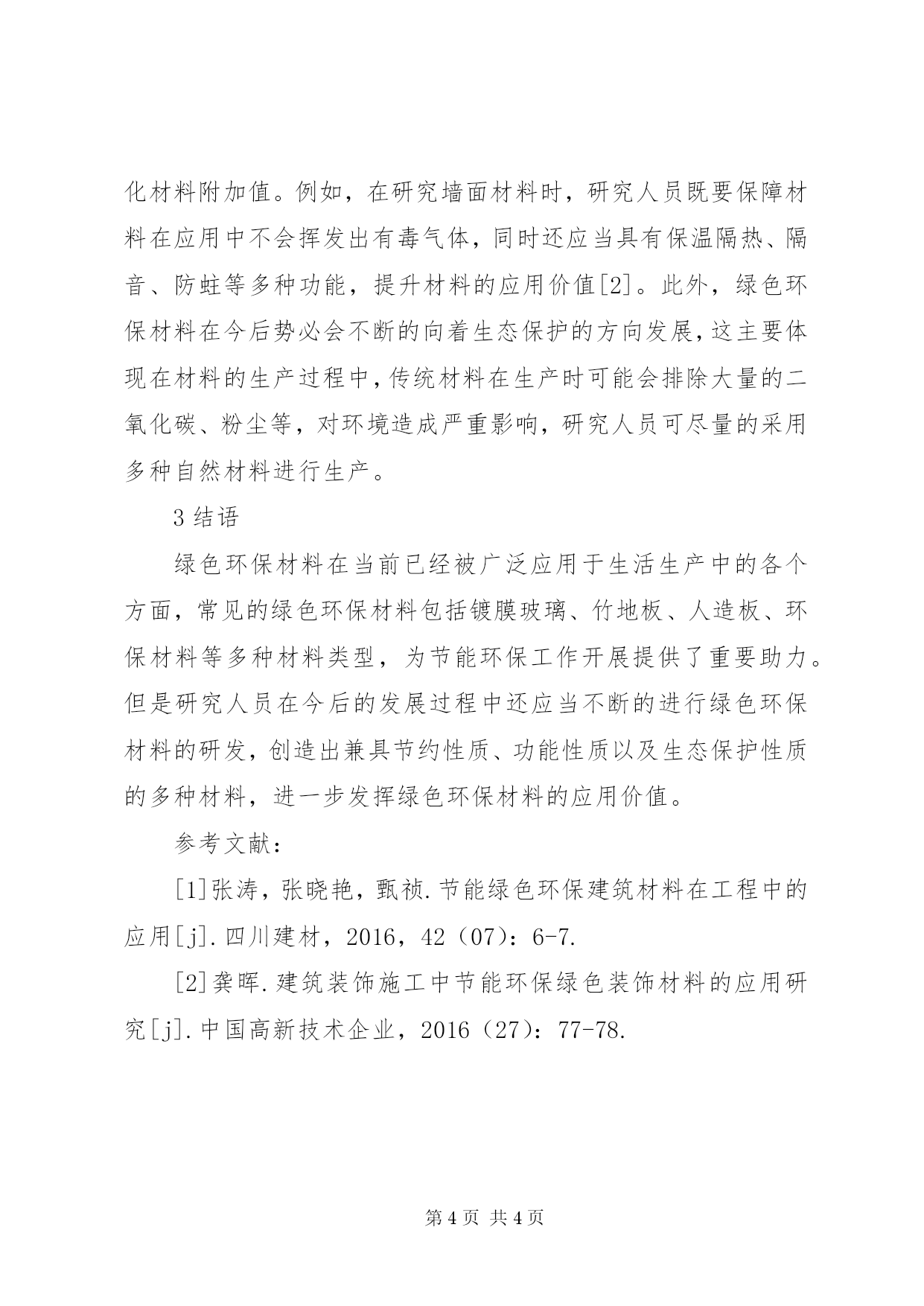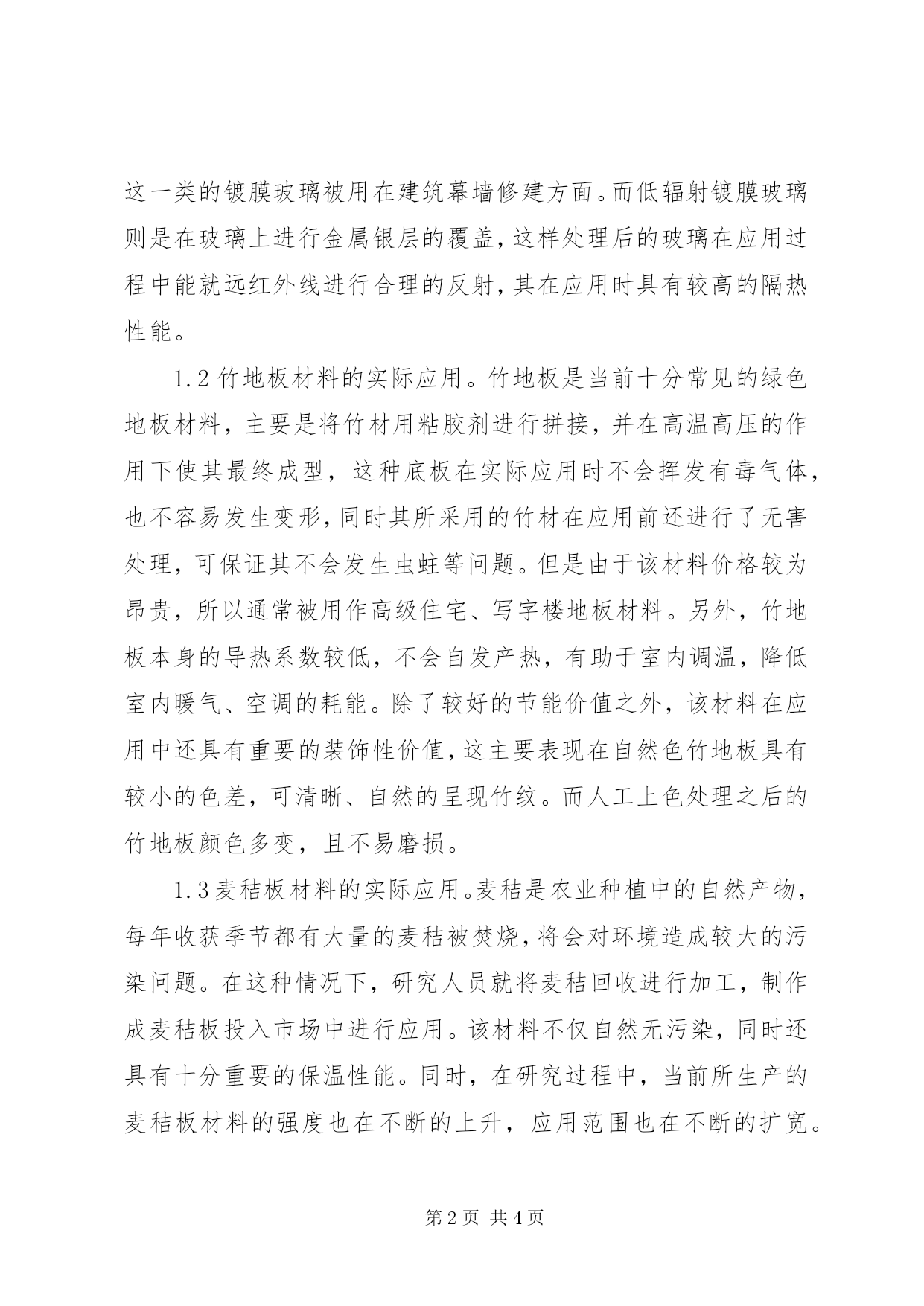 第PAGE\*Arabic\*MERGEFORMAT4页共NUMPAGES\*MERGEFORMAT4页绿色环保节能材料研究摘要。随着现代环境污染情况不断加重,绿色环保观念逐渐被提出,并被运用于多个方面,多种绿色环保节能材料被研发,在实际应用中发挥了重要的环保价值。本文简要就常见的绿色环保节能材料运用进行列举与分析,同时探讨了绿色环保节能材料在今后的研究与应用方向。以期为实现绿色环保节能材料的运用推广提供参考。关键词:绿色环保;节能材料;运用;发展能源紧缺状况的不断加深,节能环保已经逐渐重要的研究话题。以建筑耗能情况分析为例,其在总体能源消耗中的占比最重,并在人口数量不断提升的当前持续上涨,不利于可持续发展战略的实现与落实。积极将绿色环保材料应用于建筑建设工作中不仅能保证建筑节能效果得到显著提升,同时还能完成重要的建筑装饰作用。1常见的绿色环保材料应用分析1.1镀膜玻璃材料的实际应用。当前所采用的镀膜玻璃往往包括热反射镀膜玻璃与低辐射镀膜玻璃两种,其都能在实际应用时发挥重要的环保作用。其中,热反射镀膜玻璃也被叫做阳光控制玻璃,主要是在传统玻璃上覆盖几层膜系,使其达到所要求的厚度,进而在受到太阳辐射时能够适当的调整透射率,反射太阳光中的红外线,同时就其中的紫外线进行吸收[1]。通常情况下,这一类的镀膜玻璃被用在建筑幕墙修建方面。而低辐射镀膜玻璃则是在玻璃上进行金属银层的覆盖,这样处理后的玻璃在应用过程中能就远红外线进行合理的反射,其在应用时具有较高的隔热性能。1.2竹地板材料的实际应用。竹地板是当前十分常见的绿色地板材料,主要是将竹材用粘胶剂进行拼接,并在高温高压的作用下使其最终成型,这种底板在实际应用时不会挥发有毒气体,也不容易发生变形,同时其所采用的竹材在应用前还进行了无害处理,可保证其不会发生虫蛀等问题。但是由于该材料价格较为昂贵,所以通常被用作高级住宅、写字楼地板材料。另外,竹地板本身的导热系数较低,不会自发产热,有助于室内调温,降低室内暖气、空调的耗能。除了较好的节能价值之外,该材料在应用中还具有重要的装饰性价值,这主要表现在自然色竹地板具有较小的色差,可清晰、自然的呈现竹纹。而人工上色处理之后的竹地板颜色多变,且不易磨损。1.3麦秸板材料的实际应用。麦秸是农业种植中的自然产物,每年收获季节都有大量的麦秸被焚烧,将会对环境造成较大的污染问题。在这种情况下,研究人员就将麦秸回收进行加工,制作成麦秸板投入市场中进行应用。该材料不仅自然无污染,同时还具有十分重要的保温性能。同时,在研究过程中,当前所生产的麦秸板材料的强度也在不断的上升,应用范围也在不断的扩宽。当前,该材料已经逐渐取代了传统密度纤维板、刨花板等材料,也被用作家具制造中。1.4环保涂料的实际应用。涂料材料是装修工程中必不可少的材料,但是传统的涂料在应用时可能会挥发出一定的有毒物质,影响人体健康。随着研究工作的深入,当前已经研制出的一种水性木器漆在应用时不仅不会散发出有毒气体危害人体健康,同时也不会造成环境污染问题。另外,当前常用的环保涂料还有多种,部分应用于墙面粉刷的涂料还拥有保温隔热性能、抗龟裂性能等,在使用时不会出现常规涂料的易脱落、易褪色情况。当前,我国政府部门也给出了涂料环保指标要求,需要研究人员保证所用涂料产品符合所要求的环保性能指标。2绿色环保材料在今后的应用与发展方向分析随着绿色环保要求的逐渐提升,绿色环保材料的应用需要与要求也都在不断的上升,为发挥绿色环保材料的重要环保作用,研究人员在今后的研究与发展过程中应当积极从以下几方面来实现环保材料的进一步完善。首先,绿色环保材料应当逐渐向着资源、能源节约型不断的发展,这是在面对日渐加重的能源应用压力情况下的必行之路,对于节约社会能源有着重要意义,可进一步推进我国可持续发展战略。其次,为满足人们生活、生产中逐渐提升的建筑使用要求,今后在发展绿色环保材料时不仅要保证材料的环保性,同时还应当进一步提升相关材料的功能性,优化材料附加值。例如,在研究墙面材料时,研究人员既要保障材料在应用中不会挥发出有毒气体,同时还应当具有保温隔热、隔音、防蛀等多种功能,提升材料的应用价值[2]。此外,绿色环保材料在今后势必会不断的向着生态保护的方向发展,这主要体现在材料的生产过程中,传统材料在生产时可能会排除大量的二氧化碳、粉尘等,对环境造成严重影响,研究人员可尽量的采用多种自然材料进行生产。3结语绿色环保材料在当前已经被广泛应用于生活生产中的各个方面,常见的绿色环保材料包括镀膜玻璃、竹地板、人造板、环保材料等多种材料类型,为节能环保工作开展提供了重要助力。但是研究人员在今后的发展过程中还应当不断的进行绿色环保材料的研发,创造出兼具节约性质、功能性质以及生态保护性质的多种材料,进一步发挥绿色环保材料的应