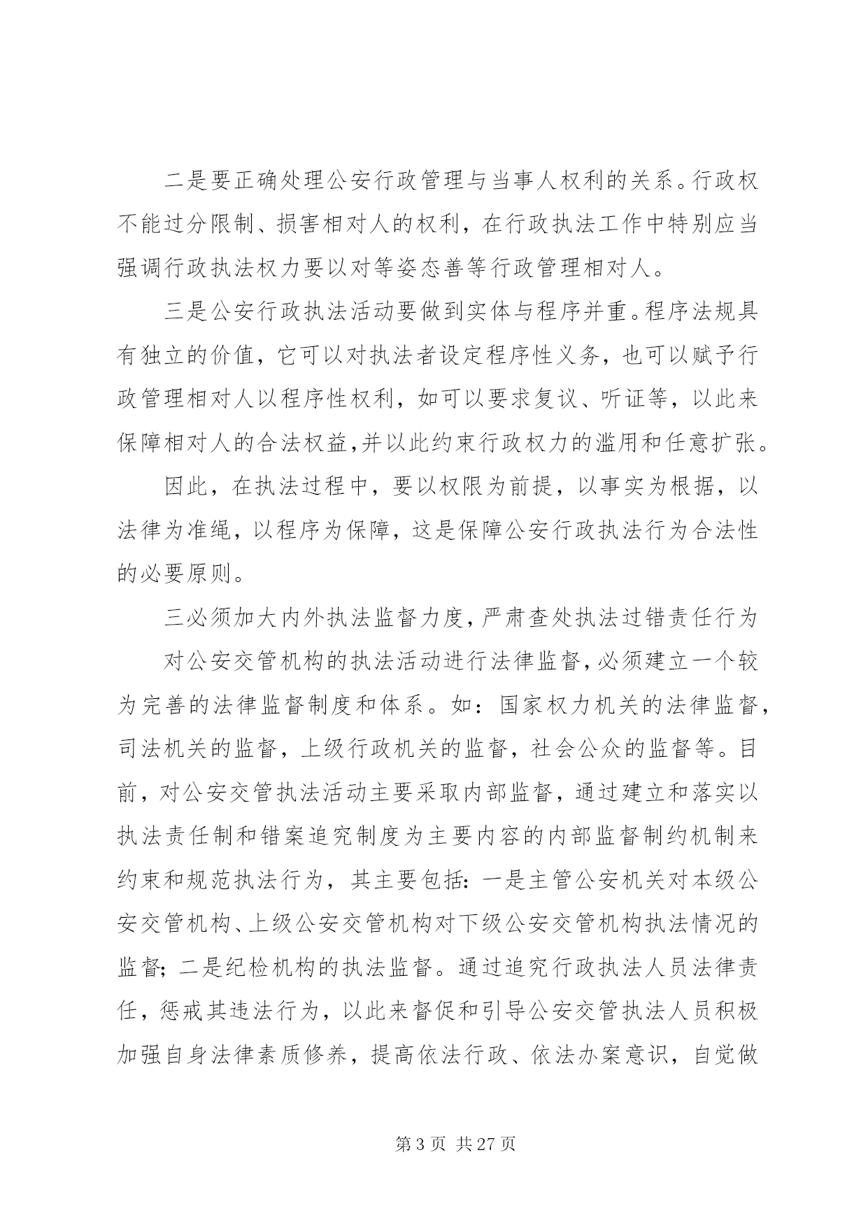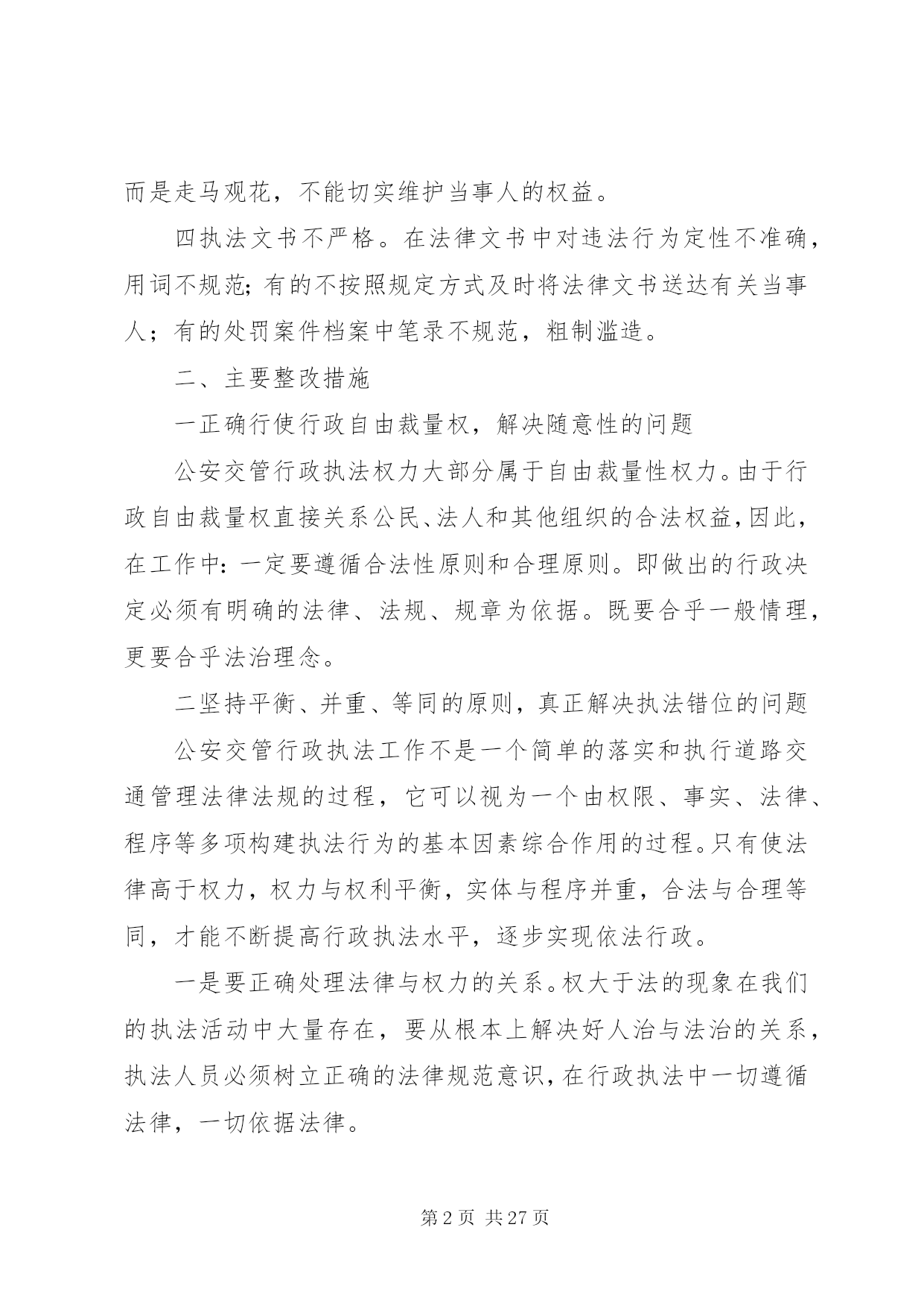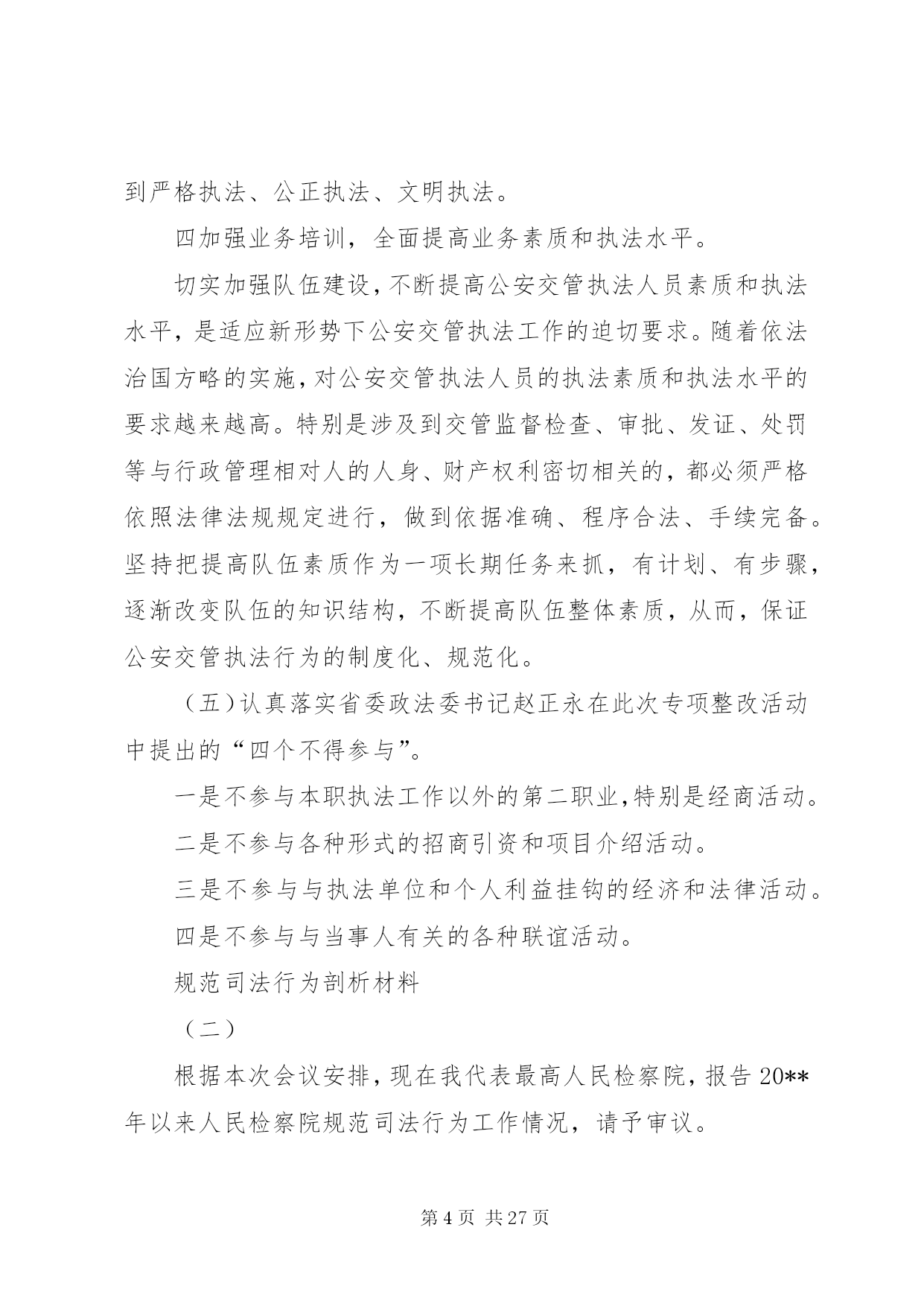 第PAGE\*Arabic\*MERGEFORMAT27页共NUMPAGES\*MERGEFORMAT27页规范司法行为剖析材料(一)全心全意为人民服务是公安机关的根本宗旨,也是立警为公、执法为民的根本基点,离开为民这个主题,就无从谈起服务话题。坚持执法为民,实现好、维护好、发展好最广大人民的根本利益是我们公安机关一切工作的根本立脚点和出发点,也是实践“三个代表”重要思想最本质的体现。通过参加“规范执法行为,促进执法公正”专项整改活动第一阶段的学习教育,我增长了知识,触及了思想,提高了认识,增强了做好本职工作的紧迫感和责任感。但也发现了工作、学习和思想中存在的一些问题,尤其是执法过程存在的一些问题,现结合学习和工作实际,逐一剖析。一、存在在主要问题一执法随意性比较大。在行政执法工作中,引用法律依据不准确,对一些应当进行行政处罚的违法行为,则采取以罚款代替行政拘留;执法不公正,对同样的违法行为因人而异,量罚差别大,有的处罚了,有的则放过了;有的处罚很严厉,有的处罚则不痛不痒,违犯了执法工作的严肃性。二执法行为不规范。在行政执法工作中,适用法律程序不准确,重实体轻程序,有的没有按照规定程序对当事人进行告知,存有不细致、不全面、不到位等问题。三执法程序不严谨。对行政处罚案件,不认真履行告知程序,而是走马观花,不能切实维护当事人的权益。四执法文书不严格。在法律文书中对违法行为定性不准确,用词不规范;有的不按照规定方式及时将法律文书送达有关当事人;有的处罚案件档案中笔录不规范,粗制滥造。二、主要整改措施一正确行使行政自由裁量权,解决随意性的问题公安交管行政执法权力大部分属于自由裁量性权力。由于行政自由裁量权直接关系公民、法人和其他组织的合法权益,因此,在工作中:一定要遵循合法性原则和合理原则。即做出的行政决定必须有明确的法律、法规、规章为依据。既要合乎一般情理,更要合乎法治理念。二坚持平衡、并重、等同的原则,真正解决执法错位的问题公安交管行政执法工作不是一个简单的落实和执行道路交通管理法律法规的过程,它可以视为一个由权限、事实、法律、程序等多项构建执法行为的基本因素综合作用的过程。只有使法律高于权力,权力与权利平衡,实体与程序并重,合法与合理等同,才能不断提高行政执法水平,逐步实现依法行政。一是要正确处理法律与权力的关系。权大于法的现象在我们的执法活动中大量存在,要从根本上解决好人治与法治的关系,执法人员必须树立正确的法律规范意识,在行政执法中一切遵循法律,一切依据法律。二是要正确处理公安行政管理与当事人权利的关系。行政权不能过分限制、损害相对人的权利,在行政执法工作中特别应当强调行政执法权力要以对等姿态善等行政管理相对人。三是公安行政执法活动要做到实体与程序并重。程序法规具有独立的价值,它可以对执法者设定程序性义务,也可以赋予行政管理相对人以程序性权利,如可以要求复议、听证等,以此来保障相对人的合法权益,并以此约束行政权力的滥用和任意扩张。因此,在执法过程中,要以权限为前提,以事实为根据,以法律为准绳,以程序为保障,这是保障公安行政执法行为合法性的必要原则。三必须加大内外执法监督力度,严肃查处执法过错责任行为对公安交管机构的执法活动进行法律监督,必须建立一个较为完善的法律监督制度和体系。如:国家权力机关的法律监督,司法机关的监督,上级行政机关的监督,社会公众的监督等。目前,对公安交管执法活动主要采取内部监督,通过建立和落实以执法责任制和错案追究制度为主要内容的内部监督制约机制来约束和规范执法行为,其主要包括:一是主管公安机关对本级公安交管机构、上级公安交管机构对下级公安交管机构执法情况的监督;二是纪检机构的执法监督。通过追究行政执法人员法律责任,惩戒其违法行为,以此来督促和引导公安交管执法人员积极加强自身法律素质修养,提高依法行政、依法办案意识,自觉做到严格执法、公正执法、文明执法。四加强业务培训,全面提高业务素质和执法水平。切实加强队伍建设,不断提高公安交管执法人员素质和执法水平,是适应新形势下公安交管执法工作的迫切要求。随着依法治国方略的实施,对公安交管执法人员的执法素质和执法水平的要求越来越高。特别是涉及到交管监督检查、审批、发证、处罚等与行政管理相对人的人身、财产权利密切相关的,都必须严格依照法律法规规定进行,做到依据准确、程序合法、手续完备。坚持把提高队伍素质作为一项长期任务来抓,有计划、有步骤,逐渐改变队伍的知识结构,不断提高队伍整体素质,从而,保证公安交管执法行为的制度化、规范化。(五)认真落实省委政法委书记赵正永在此次专项整改活动中提出的“四个不得参与”。一是不参与本职执法工作以外的第二职业,特别是经商活动。二是不参与各种形式的招商引资和项目介绍活动。三是不参与与执法单位和个人利益挂钩的经济和