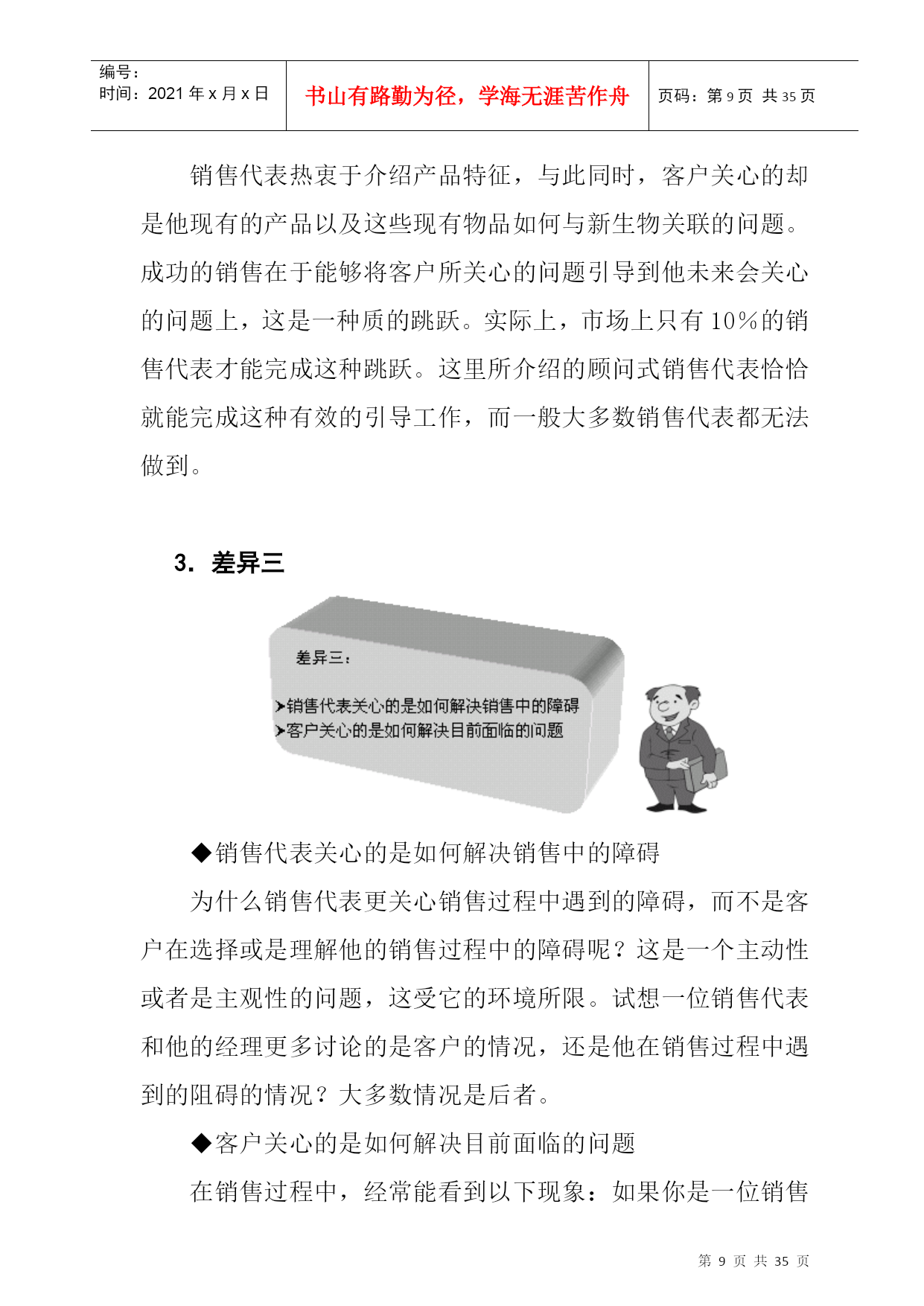 编号:时间:2021年x月x日书山有路勤为径,学海无涯苦作舟页码:第PAGE35页共NUMPAGES35页第PAGE\*MERGEFORMAT35页共NUMPAGES\*MERGEFORMAT35页顾问式销售技术(节选)【课程名称】顾问式销售技术【课程编号】G07【所属体系】营销类【主讲专家】和锋【内含产品】课程12讲,VCD光盘6张,CD-ROM2张,文字教材与工具表单1套(北京大学出版社)【全套定价】700元□内容提要第一讲销售行为和顾客购买行为1、销售行为2、购买行为3、销售行为和购买行为的差异4、什么是销售成功的关键第二讲顾问式销售的几个基本概念1、问题点2、需求3、购买循环4、优先顺序第三讲关于购买循环1、销售对话的路径2、销售代表的决策VS客户的决策3、发现客户问题VS客户明了自己的问题4、优先顺序5、对话举例第四讲顾问式销售面临的难点1、销售的方向2、客户的特征3、客户面临的风险4、销售对话的难点5、对话举例第五讲SPIN与FAB1、FAB方法2、大客户销售3、什么是产品的利益第六讲顾问式销售对话策略第七讲SPIN技术进阶第八讲SPIN与PSS第九讲SPIN运用关键――准备第十讲通过问题询问确认需求第十一讲通过满足需求完成销售第十二讲顾问式销售应注意的几个问题第1讲销售行为与客户购买行为【本讲重点】销售行为购买行为销售行为与购买行为的差异销售机会点SPIN模式是英国辉瑞普公司经过20年,通过对35-000个销售对话以及销售案例进行深入研究并在全球500强企业中广泛推广的一种技术。而全球范围内流行的顾问式销售就是建立在SPIN模式上的一种实战销售技术,它包括问题性询问、状况性询问、暗示性询问和需求确认询问。顾问式销售主要用来解决大客户销售的问题:◆它可以使你的客户说得更多;◆它可以使你的客户更理解你说的是什么;◆它可以使你的客户遵循你的逻辑去思考;◆它可以使你的客户做出有利于你的决策。以上这四点从表面上看起来很简单,但是,辉瑞普公司却围绕这四点建立起一整套称为销售行为研究的科学体系,并且使其成为销售领域的一个核心的技术支撑点。要想深入了解什么是顾问式销售技术,这就需要首先认识销售行为和购买行为及其关系。销售行为图1—1销售行为七步法表面上看,销售行为是一个混沌的过程,很难具体化,但是,可以运用质量控制的基本方法,使其量化、程序化和可监测化。图1—1中的七步法看起来虽然都是非常主观性的方法,但是,这七步法在销售管理和销售行为上具有非常积极的作用,也具有很强的实用性,因此,一定要掌握已经量化的销售行为七步法。购买行为如果只是单纯地研究一个销售行为而不去研究购买行为,销售代表会发现整个销售无法和客户的购买行为相对应,而这种对应无论是在客户的决策中还是销售代表的决策中都是非常关键的。所以,了解销售行为的七步法之后,接下来就要认识购买行为的七个阶段。图1-2购买行为七阶段购买行为的七个阶段都是围绕客户心理的,英国辉瑞普公司以这项研究的结果建立起它的SPIN模式的另外一个基础即客户决策指导。销售行为与购买行为的差异传统的销售行为和客户的购买行为之间存在很大的差异,这种差异来自于认识问题的角度不同。正因为如此,如果使用传统的销售技巧,将很难迎合客户的购买需求,只会一步步陷入一种想当然的销售误区,而不利于提高销售水平。而顾问式销售技术则可以有效克服传统销售技术的弱点,使销售情况大为改观,越来越好。1.差异一◆对销售行为而言销售行为对购买行为的影响是有限的。虽然,很多销售经理认为只要销售员努力去做,或者销售员把他的销售技巧发挥到极点,就可以产生很大的销售效率,并取得很多的定单。这种说法在某些情况下是可以理解的。但是,对于新产品、新市场,或者一种全新的市场变化和波动,传统的销售手段和行为就存在很大的问题,会直接造成由于使用方法和手段造成的成本提升和市场机会的丧失。◆对购买行为而言购买行为决定销售行为。很多销售代表过分地依赖于销售技巧,他有可能在某个行业、某个产品或某个阶段成功,但是,当他转行之后,一般会很不适应新的行业,因为原来的许多销售技术无法在新行业中使用。这是一种比较普遍的现象。2.差异二◆销售代表关心的是产品和服务的明显性特征在销售过程中,很多销售代表习惯在客户面前介绍产品的特点、优点或者产品可能带给客户的一些简单利益。但是,一般来说,通过30分钟的会谈仍然很难打动客户或者让客户理解销售代表说话的真正内涵。同样的,对于一种新产品或者一家新公司的产品来说,很多销售代表都受到了很多有关产品特征的培训