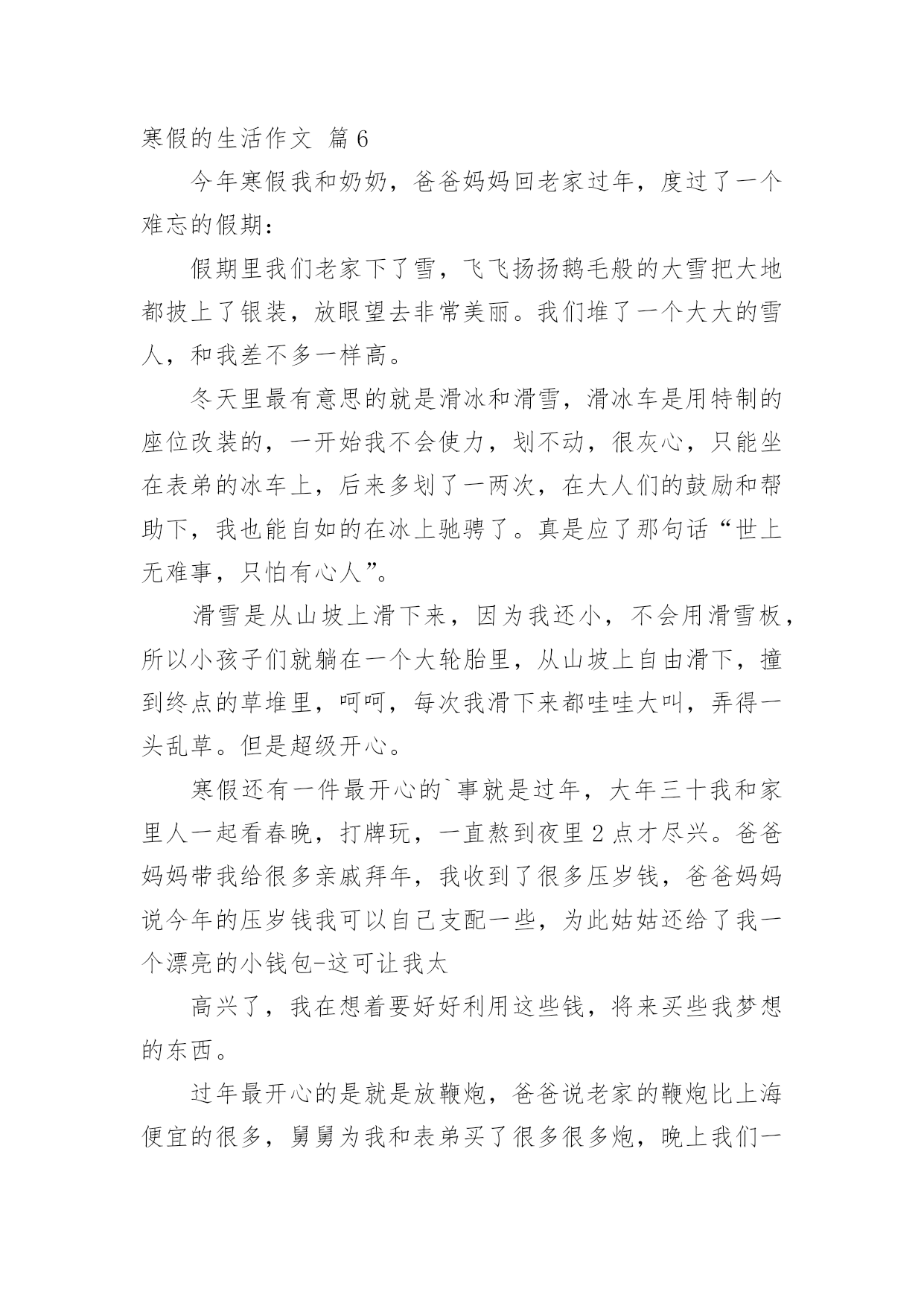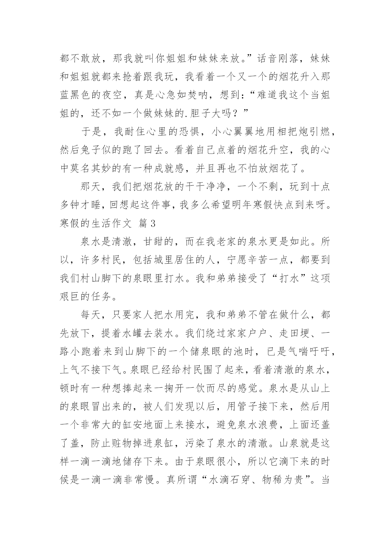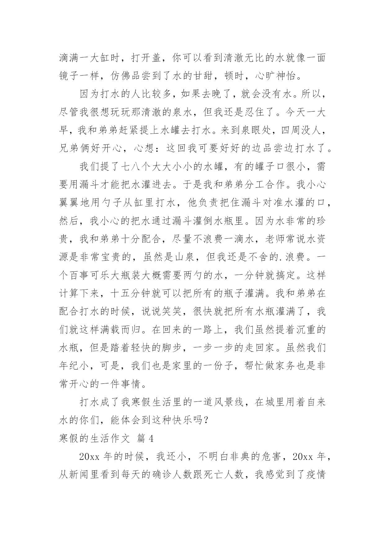 寒假的生活作文【精华】寒假的生活作文合集10篇在平平淡淡的日常中,大家都跟作文打过交道吧,作文是从内部言语向外部言语的过渡,即从经过压缩的简要的、自己能明白的语言,向开展的、具有规范语法结构的、能为他人所理解的外部语言形式的转化。相信写作文是一个让许多人都头痛的问题,下面是小编精心整理的寒假的生活作文10篇,欢迎大家借鉴与参考,希望对大家有所帮助。寒假的生活作文篇1一个月的寒假生活即将结束。回顾这一个月以来感觉自己的收获还是挺多的。在寒假期间,我利用好每一天的时间来充实自己,通过看书,看杂志,上网等多种途径来度过自己的寒假生活。当然最有意义的事情还是去了解中国的年文化。我们中国是一个文明之国,历史悠久,以前过年从没想过要去深入的了解它。在我们那边以往只是在走亲访友中度过了,但是今年的形式却有了很大的改变,人们不只是呆在家里,而是邀上几个好友外出游玩。说起这个来我印象特别深,因为今年我也和几个好朋友一起出去游玩了一番,那感觉真的是很舒服,比起以前一过年就走亲访友的好多了,而且这样也很简单,方便。寒假生活的结束,自己也必须尽快调整好心态去准备自己来年的工作。一年结束了,在除夕夜是团圆夜,家家户户都张灯结彩的,庆祝一年平安结束,新的一年好的开始。在除夕这天,家家都忙着贴春联,我们家也不例外,而且每年家里的对联还是由我来贴的。其实这贴对联的学问也蛮大的`,你去年时只要一看这对联你就会知道这一家人在新的一年里的希望和打算,也会知道在过去一年里这家人家里发生了什么喜事,你看这对联神不神呀。在这一天最高兴的还是小朋友们,他们早早地就叫着让大人接年了,因为接完年之后就可以放烟花了。放烟花时,几个小孩子在旁边叫着,跳着,那高兴劲就甭提了,就连大人也都被他们感染了跟着叫起来。放完烟花一家人围在桌前吃团圆饭,最有趣的就是吃饺子了,而且这吃饺子还能吃到钱,谁吃到钱了那谁在新的一年里的运气将是最好的,所以大家都争着吃,看谁也抢到那个有钱的饺子,但是不管吃到的也好,没吃到的也好,这种抢着吃饺子的气氛是最难忘的寒假的生活作文篇2光阴如梭,一眨眼寒假过去,新的一年已经到来,新的学期正向我们招手,一切都是新的。回忆着那多姿多彩的寒假生活,我突然想起了一件非常有趣的事情,猜猜是什么事?其实,这件有趣的事情就是放烟花。大年初一那天,我在老家。爷爷为了满足我的心愿,给我买了一大包烟花。起初,我只敢玩电光花和摔炮,不敢玩儿那些看上去怪模怪样的炮,还有能飞上天的炮。爷爷见我不敢放就开始刺激我:“给你买这么多炮,你都不敢放,那我就叫你姐姐和妹妹来放。”话音刚落,妹妹和姐姐就都来抢着跟我玩,我看着一个又一个的烟花升入那蓝黑色的夜空,真是心急如焚呐,想到:“难道我这个当姐姐的,还不如一个做妹妹的.胆子大吗?”于是,我耐住心里的恐惧,小心翼翼地用相把炮引燃,然后兔子似的跑了回去。看着自己点着的烟花升空,我的心中莫名其妙的有一种成就感,并且再也不怕放烟花了。那天,我们把烟花放的干干净净,一个不剩,玩到十点多钟才睡,回想起这件事,我多么希望明年寒假快点到来呀。寒假的生活作文篇3泉水是清澈,甘甜的,而在我老家的泉水更是如此。所以,许多村民,包括城里居住的人,宁愿辛苦一点,都要到我们村山脚下的泉眼里打水。我和弟弟接受了“打水”这项艰巨的任务。每天,只要家人把水用完,我和弟弟不管在做什么,都先放下,提着水罐去装水。我们绕过家家户户、走田埂、一路小跑着来到山脚下的一个储泉眼的池时,已是气喘吁吁,上气不接下气。泉眼已经给村民围了起来,看着清澈的泉水,顿时有一种想捧起来一掬开一饮而尽的感觉。泉水是从山上的泉眼冒出来的,被人们发现以后,用管子接下来,然后用一个非常大的缸安地面上来接水,避免泉水浪费,上面还盖了盖,防止赃物掉进泉缸,污染了泉水的清澈。山泉就是这样一滴一滴地储存下来。由于泉眼很小,所以它滴下来的时候是一滴一滴非常慢。真所谓“水滴石穿、物稀为贵”。当滴满一大缸时,打开盖,你可以看到清澈无比的水就像一面镜子一样,仿佛品尝到了水的甘甜,顿时,心旷神怡。因为打水的人比较多,如果去晚了,就会没有水。所以,尽管我很想玩玩那清澈的泉水,但我还是忍住了。今天一大早,我和弟弟赶紧提上水罐去打水。来到泉眼处,四周没人,兄弟俩好开心,心想:这回我可要好好的边品尝边打水了。我们提了七八个大大小小的水罐,有的罐子口很小,需要用漏斗才能把水灌进去。于是我和弟弟分工合作。我小心翼翼地用勺子从缸里打水,他负责把住漏斗对准水灌的口,然后,我小心的把水通过漏斗灌倒水瓶里。因为水非常的珍贵,我和弟弟十分配合,尽量不浪费一滴水,老师常说水资源是非常宝贵的,虽然是山泉,但我还是不舍的.浪费。一个百事可乐大瓶装大概需要两勺的水,一分钟就搞定。这样计算下来,十五分钟就可以把所有的瓶子灌满。我和弟弟在配合打水的时候,说说笑笑,