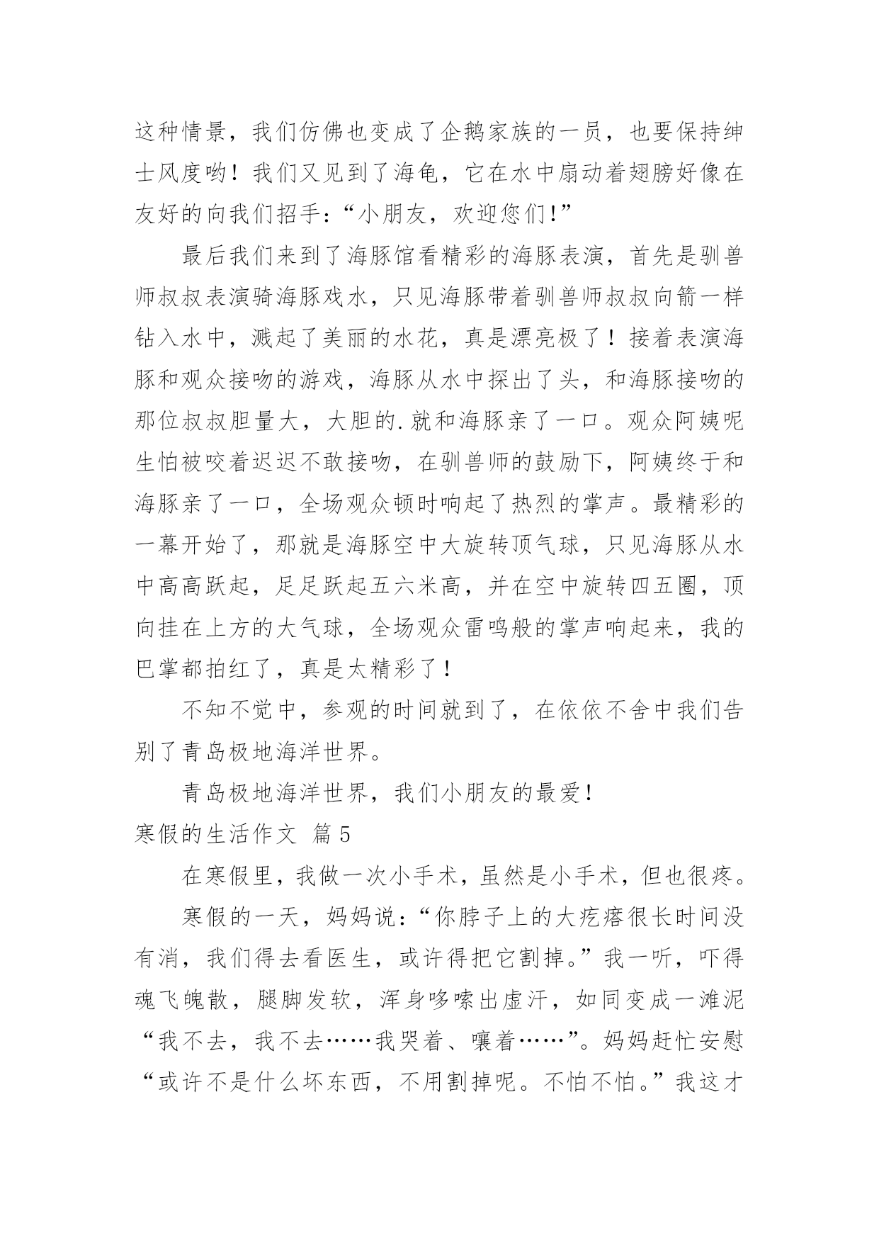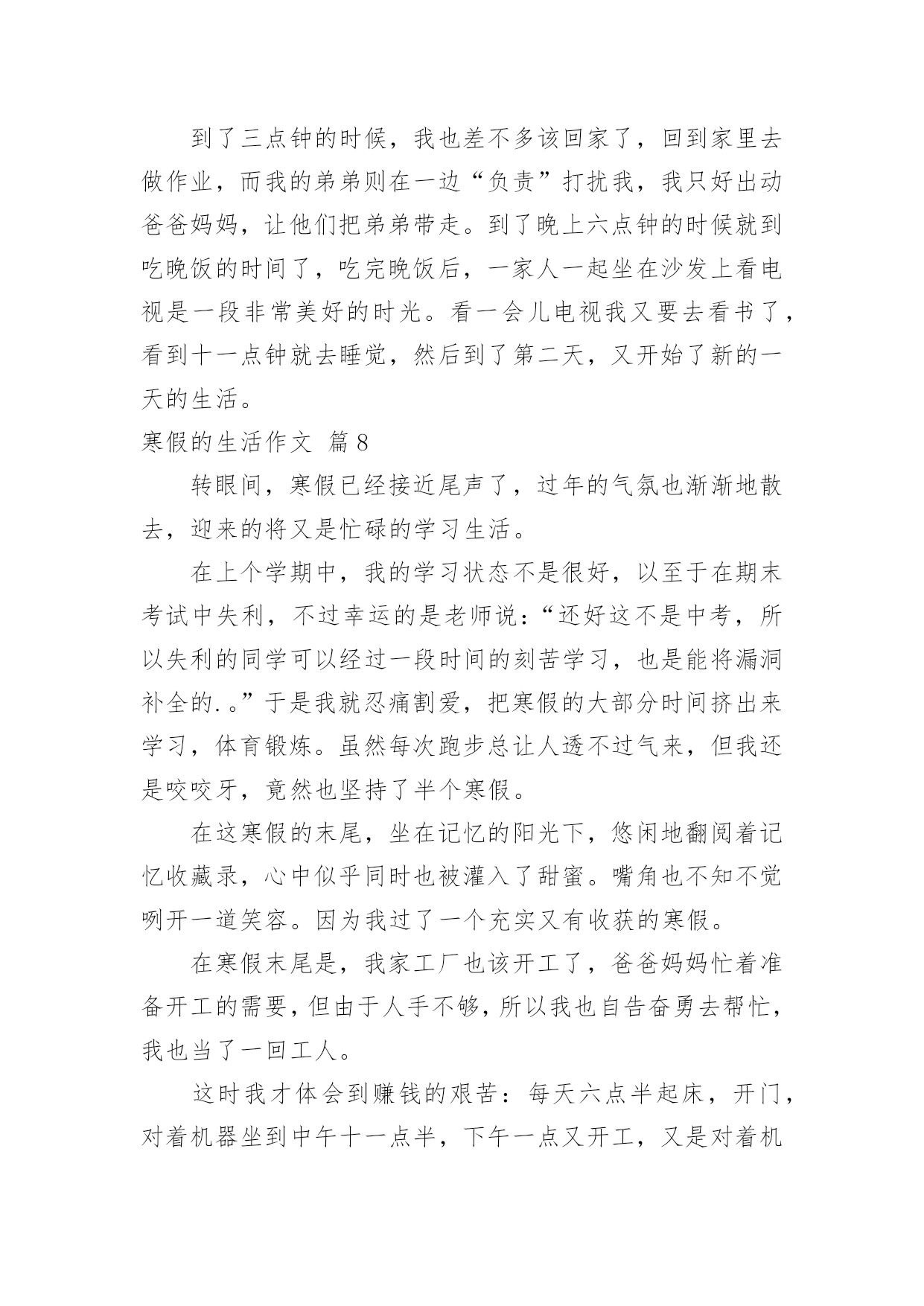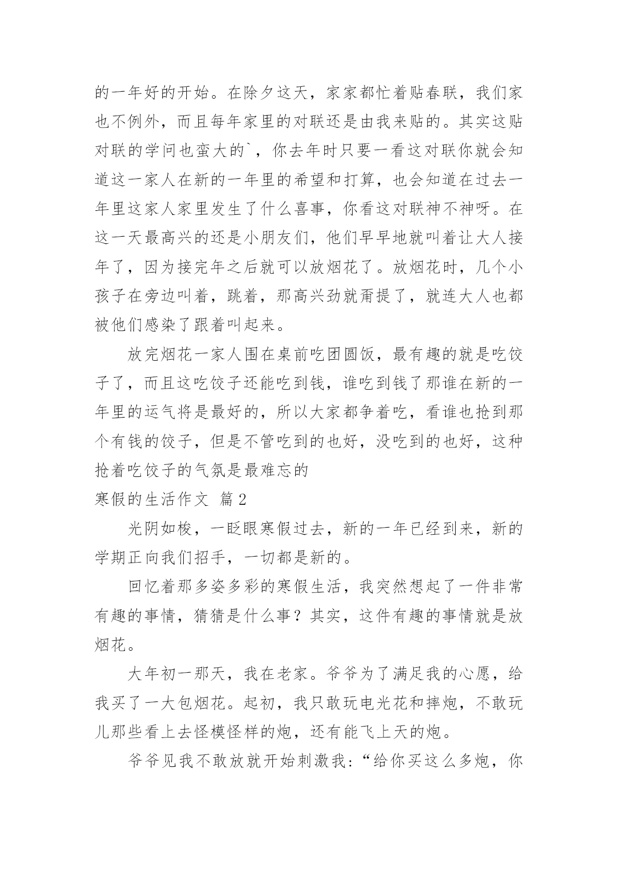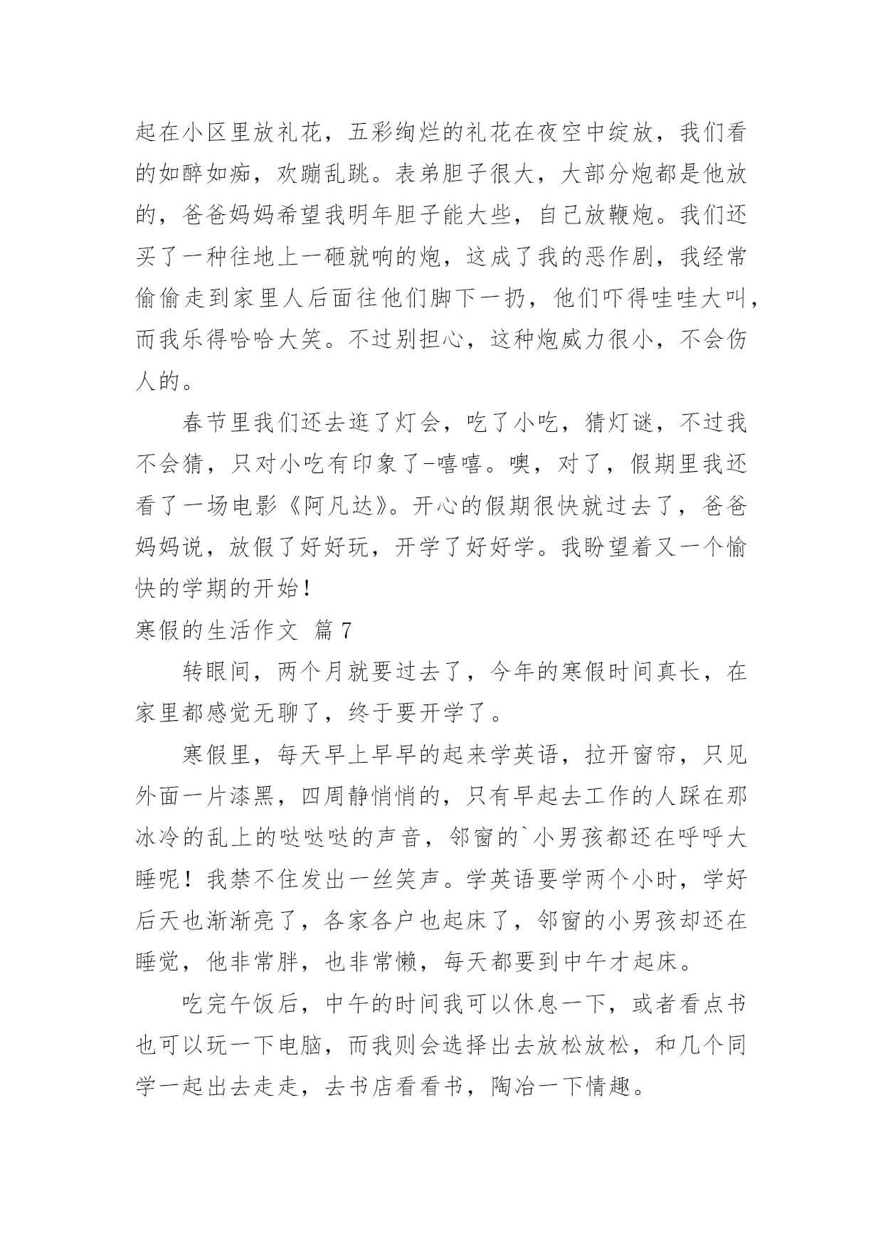 寒假的生活作文【精华】寒假的生活作文合集10篇在平平淡淡的日常中,大家都跟作文打过交道吧,作文是从内部言语向外部言语的过渡,即从经过压缩的简要的、自己能明白的语言,向开展的、具有规范语法结构的、能为他人所理解的外部语言形式的转化。相信写作文是一个让许多人都头痛的问题,下面是小编精心整理的寒假的生活作文10篇,欢迎大家借鉴与参考,希望对大家有所帮助。寒假的生活作文篇1一个月的寒假生活即将结束。回顾这一个月以来感觉自己的收获还是挺多的。在寒假期间,我利用好每一天的时间来充实自己,通过看书,看杂志,上网等多种途径来度过自己的寒假生活。当然最有意义的事情还是去了解中国的年文化。我们中国是一个文明之国,历史悠久,以前过年从没想过要去深入的了解它。在我们那边以往只是在走亲访友中度过了,但是今年的形式却有了很大的改变,人们不只是呆在家里,而是邀上几个好友外出游玩。说起这个来我印象特别深,因为今年我也和几个好朋友一起出去游玩了一番,那感觉真的是很舒服,比起以前一过年就走亲访友的好多了,而且这样也很简单,方便。寒假生活的结束,自己也必须尽快调整好心态去准备自己来年的工作。一年结束了,在除夕夜是团圆夜,家家户户都张灯结彩的,庆祝一年平安结束,新的一年好的开始。在除夕这天,家家都忙着贴春联,我们家也不例外,而且每年家里的对联还是由我来贴的。其实这贴对联的学问也蛮大的`,你去年时只要一看这对联你就会知道这一家人在新的一年里的希望和打算,也会知道在过去一年里这家人家里发生了什么喜事,你看这对联神不神呀。在这一天最高兴的还是小朋友们,他们早早地就叫着让大人接年了,因为接完年之后就可以放烟花了。放烟花时,几个小孩子在旁边叫着,跳着,那高兴劲就甭提了,就连大人也都被他们感染了跟着叫起来。放完烟花一家人围在桌前吃团圆饭,最有趣的就是吃饺子了,而且这吃饺子还能吃到钱,谁吃到钱了那谁在新的一年里的运气将是最好的,所以大家都争着吃,看谁也抢到那个有钱的饺子,但是不管吃到的也好,没吃到的也好,这种抢着吃饺子的气氛是最难忘的寒假的生活作文篇2光阴如梭,一眨眼寒假过去,新的一年已经到来,新的学期正向我们招手,一切都是新的。回忆着那多姿多彩的寒假生活,我突然想起了一件非常有趣的事情,猜猜是什么事?其实,这件有趣的事情就是放烟花。大年初一那天,我在老家。爷爷为了满足我的心愿,给我买了一大包烟花。起初,我只敢玩电光花和摔炮,不敢玩儿那些看上去怪模怪样的炮,还有能飞上天的炮。爷爷见我不敢放就开始刺激我:“给你买这么多炮,你都不敢放,那我就叫你姐姐和妹妹来放。”话音刚落,妹妹和姐姐就都来抢着跟我玩,我看着一个又一个的烟花升入那蓝黑色的夜空,真是心急如焚呐,想到:“难道我这个当姐姐的,还不如一个做妹妹的.胆子大吗?”于是,我耐住心里的恐惧,小心翼翼地用相把炮引燃,然后兔子似的跑了回去。看着自己点着的烟花升空,我的心中莫名其妙的有一种成就感,并且再也不怕放烟花了。那天,我们把烟花放的干干净净,一个不剩,玩到十点多钟才睡,回想起这件事,我多么希望明年寒假快点到来呀。寒假的生活作文篇3泉水是清澈,甘甜的,而在我老家的泉水更是如此。所以,许多村民,包括城里居住的人,宁愿辛苦一点,都要到我们村山脚下的泉眼里打水。我和弟弟接受了“打水”这项艰巨的任务。每天,只要家人把水用完,我和弟弟不管在做什么,都先放下,提着水罐去装水。我们绕过家家户户、走田埂、一路小跑着来到山脚下的一个储泉眼的池时,已是气喘吁吁,上气不接下气。泉眼已经给村民围了起来,看着清澈的泉水,顿时有一种想捧起来一掬开一饮而尽的感觉。泉水是从山上的泉眼冒出来的,被人们发现以后,用管子接下来,然后用一个非常大的缸安地面上来接水,避免泉水浪费,上面还盖了盖,防止赃物掉进泉缸,污染了泉水的清澈。山泉就是这样一滴一滴地储存下来。由于泉眼很小,所以它滴下来的时候是一滴一滴非常慢。真所谓“水滴石穿、物稀为贵”。当滴满一大缸时,打开盖,你可以看到清澈无比的水就像一面镜子一样,仿佛品尝到了水的甘甜,顿时,心旷神怡。因为打水的人比较多,如果去晚了,就会没有水。所以,尽管我很想玩玩那清澈的泉水,但我还是忍住了。今天一大早,我和弟弟赶紧提上水罐去打水。来到泉眼处,四周没人,兄弟俩好开心,心想:这回我可要好好的边品尝边打水了。我们提了七八个大大小小的水罐,有的罐子口很小,需要用漏斗才能把水灌进去。于是我和弟弟分工合作。我小心翼翼地用勺子从缸里打水,他负责把住漏斗对准水灌的口,然后,我小心的把水通过漏斗灌倒水瓶里。因为水非常的珍贵,我和弟弟十分配合,尽量不浪费一滴水,老师常说水资源是非常宝贵的,虽然是山泉,但我还是不舍的.浪费。一个百事可乐大瓶装大概需要两勺的水,一分钟就搞定。这样计算下来,十五分钟就可以把所有的瓶子灌满。我和弟弟在配合打水的时候,说说笑笑,