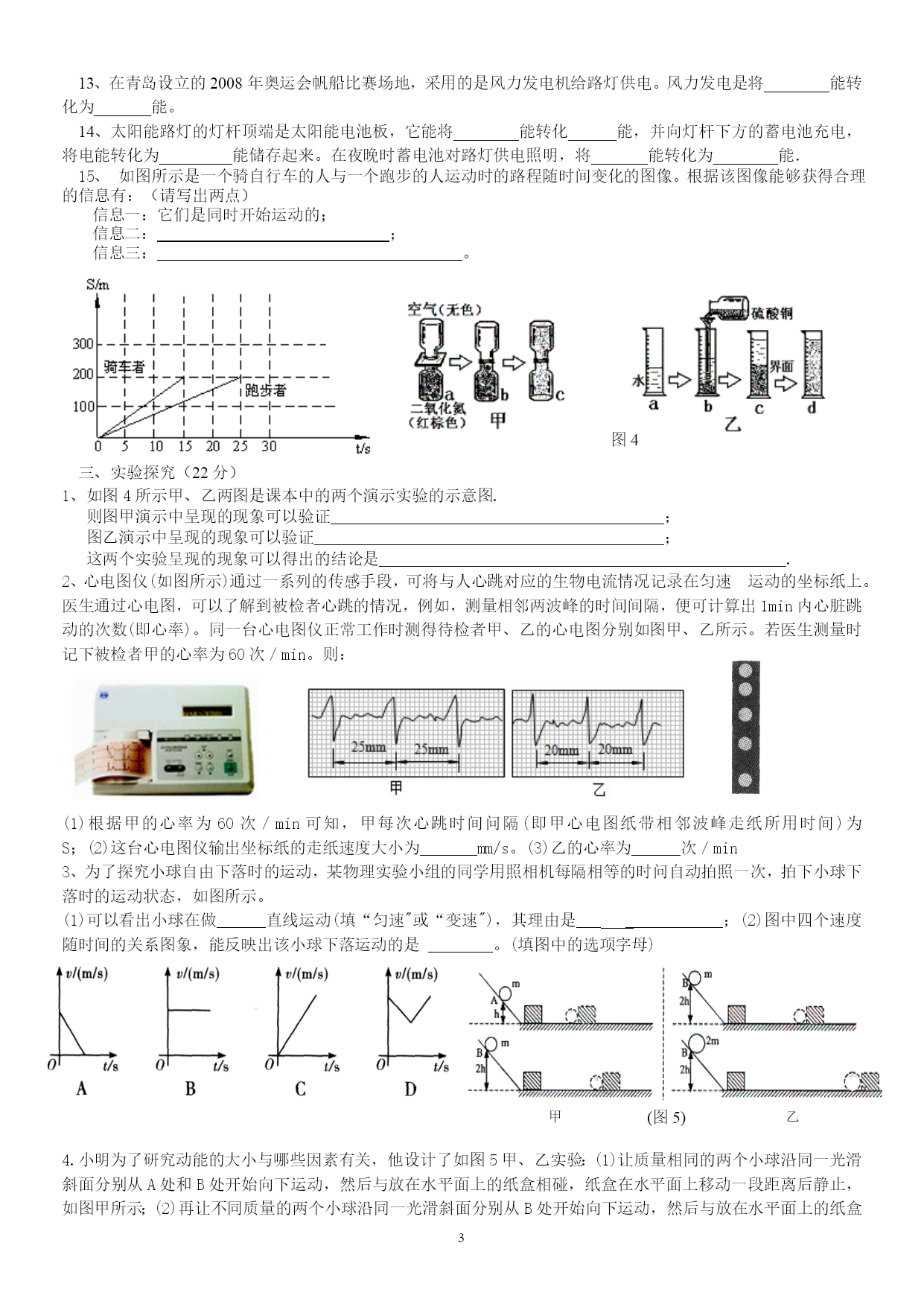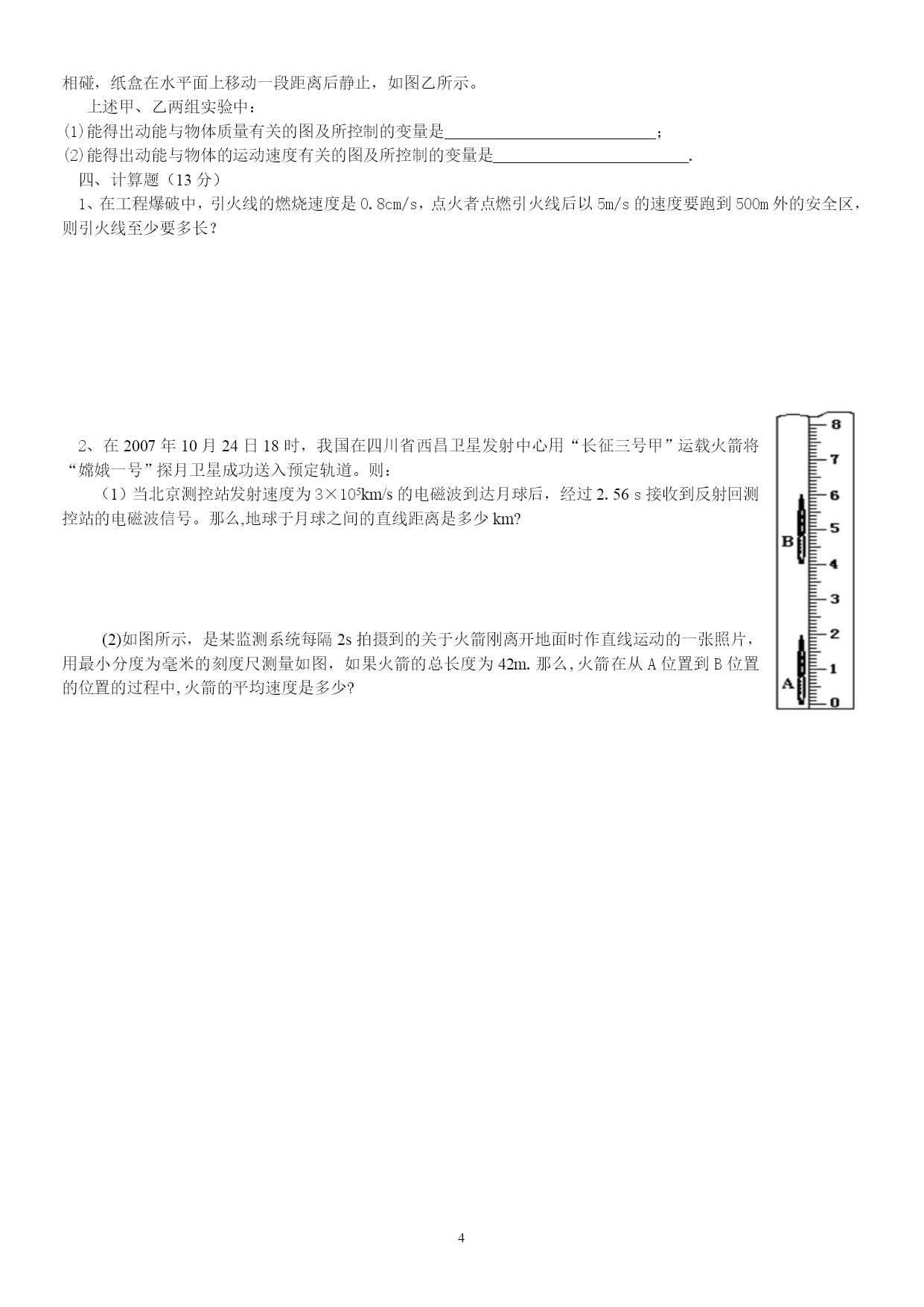 第二章运动与能量测试(2012-7-28)姓名分数一、选择题(36分)1、中国是掌握空中加油技术的少数国家之一。如图是我国自行研制的第三代战斗机“歼—10”在空中加油的情景,在加油过程中()A.加油机相对于“歼—l0”战斗机是运动的B.加油机相对于“歼—l0”战斗机是静止的加油机战斗机C.“歼—l0”战斗机没有速度D.加油机和“歼—l0”战斗机都静止在空中2、如图所示,是中国第五代隐形歼击机—歼20。2011年4月17日下午4时25分,歼20在成都第2次试飞,历时90分钟。下列与歼20有关的估测中,合理的是()A.飞机质量大约为100kgB.飞机长度大约为1.5mC.飞机飞行速度大约为1.5×108m/sD.飞机最大飞行高度大约为18.5km3、在2008北京奥运圣火传递活动中,现场某记者同时拍下了固定在地面上随风飘动的旗帜和附近的甲、乙两火炬照片,如图所示。根据它们的飘动方向,可以判断下列说法正确的是()A.甲火炬一定静止B.甲火炬一定向右运动C.乙火炬一定静止D.乙火炬一定向左运动4、甲、乙、丙三个升降机同时向上运动,且V甲>V乙>V丙,如果以乙为参照物,下列说法正确的是()A.甲和丙都向下运动B.甲和丙都向上运动C.甲向上运动,丙向下运动D.甲向下运动,丙向上运动5、P、Q是同一直线上相距10m的两点,甲、乙两小车从P点出发向Q运动,它们运动的s-t图像如图所示,由图像可知()A.甲车速度小于乙车速度B.经过6s,乙车离P点10mC.甲车比乙车早3s通过Q点D.经过3s,甲、乙两车相距6m6、甲、乙两小车运动的s-t图像如图所示,由图像可知()A、甲、乙两车都做匀速直线运动。B、甲车的速度为10米/秒,乙车的速度为2米/秒。C、经过6秒,甲、乙两车相距2米。D、经过5秒,甲、乙两车通过的路程均为10米。7、一个做匀速直线运动的物体,4s内通过20m的距离,那么,它在前2s内速度一定是()A.80m/sB.10m/sC.5m/sD.无法确定8、某物体用V1的速度运行了t秒钟,接下来又用V2的速度运动了t秒钟。那么该物体在这两段时间内的平均速度是()A.B.C.D.9、某小车从甲地到乙地,前半段路程的速度为V1,后半段路程的速度为V2。那么该小车在整过路程内的平均速度是()A.B.C.D.10、如图所示,汽车上的速度计,一辆汽车以此速度通过一座长1600m的大桥,则()A.该汽车的行驶速度是80m/sC.该汽车通过大桥的时间为20sB.该汽车通过大桥的时间为2minD.该汽车通过大桥的时间为72s11、利用焚烧垃圾来发电,此过程中的能量如何转化()A.化学能→内能→电能B.太阳能→内能→电能C.核能→内能→电能D.电能→太阳能→内能12、某同学的爸爸携全家驾车去海边码头游玩,在途经西港路时,路边蹿出一只小猫,他紧急刹车才没撞到它。如图为紧急刹车前后汽车行驶的时间――速度图像,根据图像分析不正确的是()A.紧急刹车发生在8:27B.在8:23~8:27时间段内他驾车匀速前进C.在8:20~8:30时间段内他驾车的最大速度为60千米/时D.在8:20~8:30时间段内他驾车的平均速度为60千米/时。二、填空题(29分)1、放在传送带上的货物,与传送带一起向右运动,如图所示,那么货物相对于传送带是________的,相对于地面是________的。2、五一假期,小明与父母乘长途汽车外出旅游,小明看见前面的小车与他的距离保持不变,后面的卡车离他越来越远.如果以长途汽车为参照物,小车是____的(选填“静止”或“运动”),卡车是__的(选填“静止”或“运动”).小明爸爸说小明没有动,他所选的参照物是______.3、在平直的公路上,有三辆汽车正同向顺风行使,此时甲车上的感觉顺风,乙车上的人感觉逆风,丙车上的人感觉无风,由此可以初步判断三辆汽车中行驶速度最大的是___车。若以丙车为参照物,风与丙车处于相对_____状态;若以甲车为参照物,乙车是_____的。4、中国“子弹头”列车的科学名称是“动车组”。这种新型列车在动力、材料和内部结构上都使用了最新的机车技术,投入使用的CRH—Z型电力动车组,最高时速可达250km/h,以南京—苏州为例,从南京9:30发车,11:06到达苏州,全程218km,则此动车组的平均速度为_km/h。5、一艘轮船以20km/h的速度顺流而下由甲地到达乙地,又以12km/h的速度逆流而上由乙地返回甲地,求轮般在甲、乙两地往返中的平均速度是____________.6、一列火车以54km/h的速度完全通过一个山洞,耗时40s,已知这列火车长100m,则山洞的长为m。7、在学校运动会男子10
