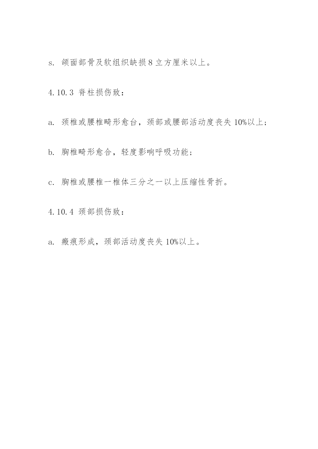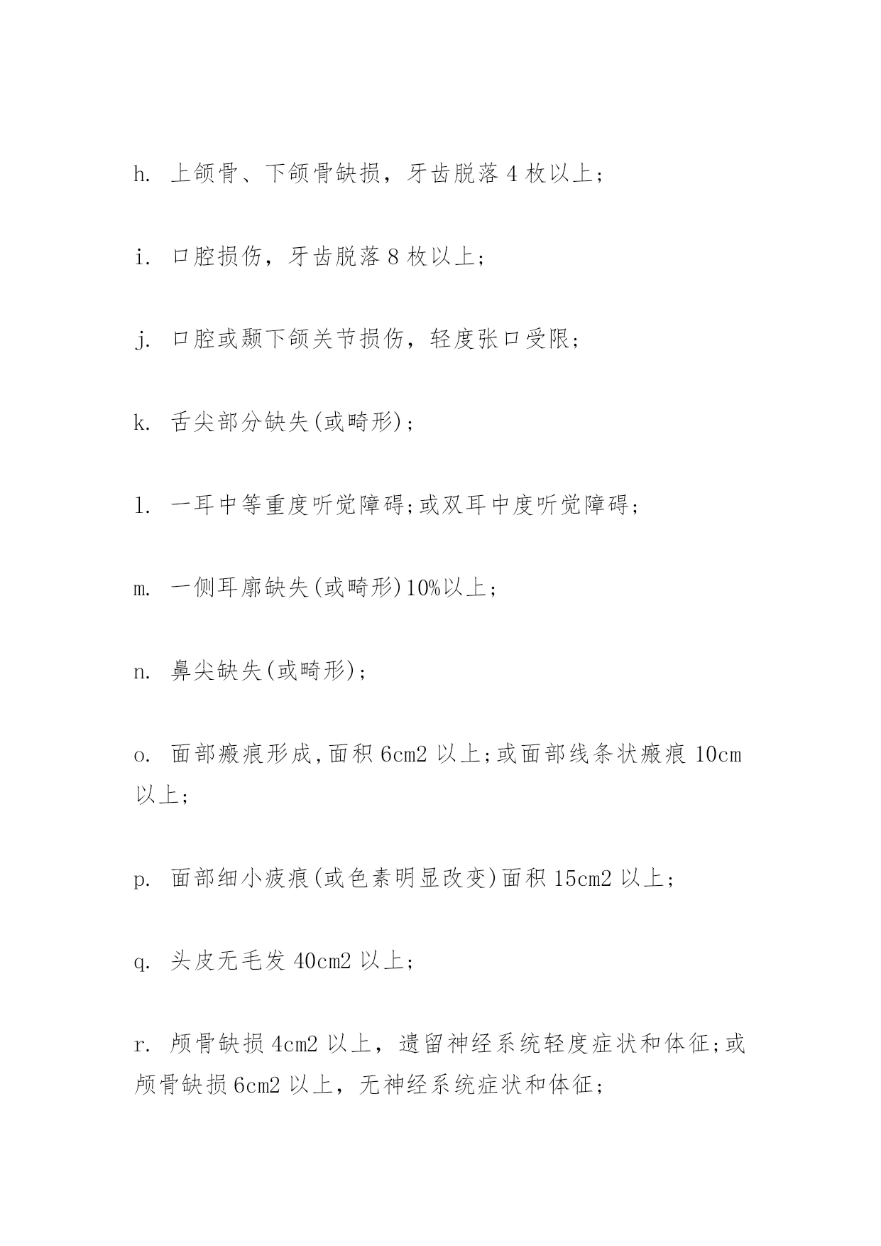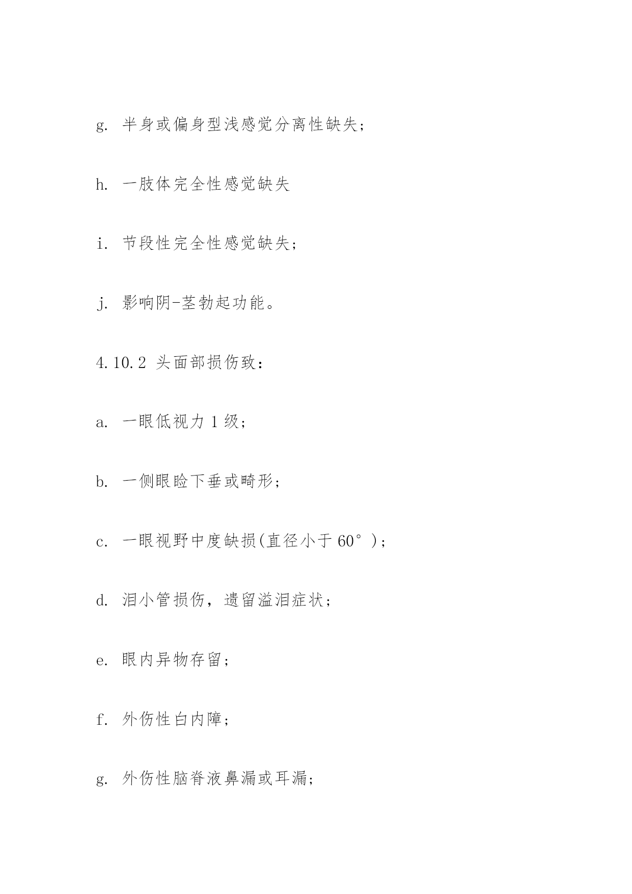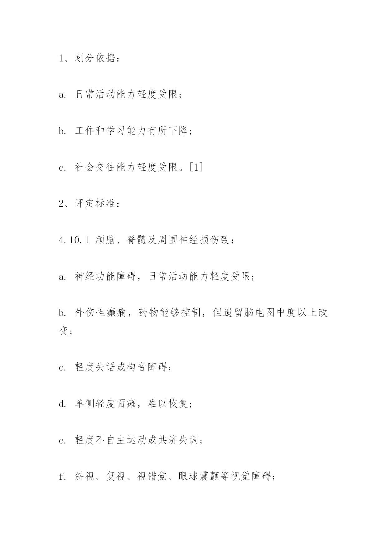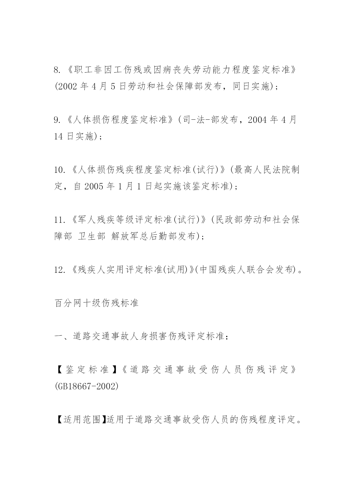交通事故伤残鉴定交通事故伤残鉴定交通事故伤残鉴定1.《人体轻微伤的鉴定标准》(1996年7月25日公安部发布,1997年1月1日实施);2.《人体轻伤鉴定标准(试行)》(1990年6月20日最高法、最高检公安部司-法-部发布,1990年7月1日起实施);3.《人体重伤鉴定标准》(1990年3月29日司-法-部最高法、最高检公安部发布,1990年7月1日实施);4.《道路交通事故受伤人员伤残评定》(公安部发布,2002年12月1日实施);5.《医疗事故分级标准(试行)》(2002年7月31日卫生部发布,2002年9月1日实施);6.《事故伤害损失工作日标准》(国家标准GB/T15499-1995)7.《职工工伤与职业病致残程度鉴定》(GB/T16180-2006国家技术监督局2006年5月1日实施);8.《职工非因工伤残或因病丧失劳动能力程度鉴定标准》(2002年4月5日劳动和社会保障部发布,同日实施);9.《人体损伤程度鉴定标准》(司-法-部发布,2004年4月14日实施);10.《人体损伤残疾程度鉴定标准(试行)》(最高人民法院制定,自2005年1月1日起实施该鉴定标准);11.《军人残疾等级评定标准(试行)》(民政部劳动和社会保障部卫生部解放军总后勤部发布);12.《残疾人实用评定标准(试用)》(中国残疾人联合会发布)。百分网十级伤残标准一、道路交通事故人身损害伤残评定标准:【鉴定标准】《道路交通事故受伤人员伤残评定》(GB18667-2002)【适用范围】适用于道路交通事故受伤人员的伤残程度评定。1、划分依据:a.日常活动能力轻度受限;b.工作和学习能力有所下降;c.社会交往能力轻度受限。[1]2、评定标准:4.10.1颅脑、脊髓及周围神经损伤致:a.神经功能障碍,日常活动能力轻度受限;b.外伤性癫痫,药物能够控制,但遗留脑电图中度以上改变;c.轻度失语或构音障碍;d.单侧轻度面瘫,难以恢复;e.轻度不自主运动或共济失调;f.斜视、复视、视错觉、眼球震颤等视觉障碍;g.半身或偏身型浅感觉分离性缺失;h.一肢体完全性感觉缺失i.节段性完全性感觉缺失;j.影响阴-茎勃起功能。4.10.2头面部损伤致:a.一眼低视力1级;b.一侧眼睑下垂或畸形;c.一眼视野中度缺损(直径小于60°);d.泪小管损伤,遗留溢泪症状;e.眼内异物存留;f.外伤性白内障;g.外伤性脑脊液鼻漏或耳漏;h.上颌骨、下颌骨缺损,牙齿脱落4枚以上;i.口腔损伤,牙齿脱落8枚以上;j.口腔或颞下颌关节损伤,轻度张口受限;k.舌尖部分缺失(或畸形);l.一耳中等重度听觉障碍;或双耳中度听觉障碍;m.一侧耳廓缺失(或畸形)10%以上;n.鼻尖缺失(或畸形);o.面部瘢痕形成,面积6cm2以上;或面部线条状瘢痕10cm以上;p.面部细小疲痕(或色素明显改变)面积15cm2以上;q.头皮无毛发40cm2以上;r.颅骨缺损4cm2以上,遗留神经系统轻度症状和体征;或颅骨缺损6cm2以上,无神经系统症状和体征;s.颌面部骨及软组织缺损8立方厘米以上。4.10.3脊柱损伤致:a.颈椎或腰椎畸形愈台,颈部或腰部活动度丧失10%以上;b.胸椎畸形愈合,轻度影响呼吸功能;c.胸椎或腰椎一椎体三分之一以上压缩性骨折。4.10.4颈部损伤致:a.瘢痕形成,颈部活动度丧失10%以上。