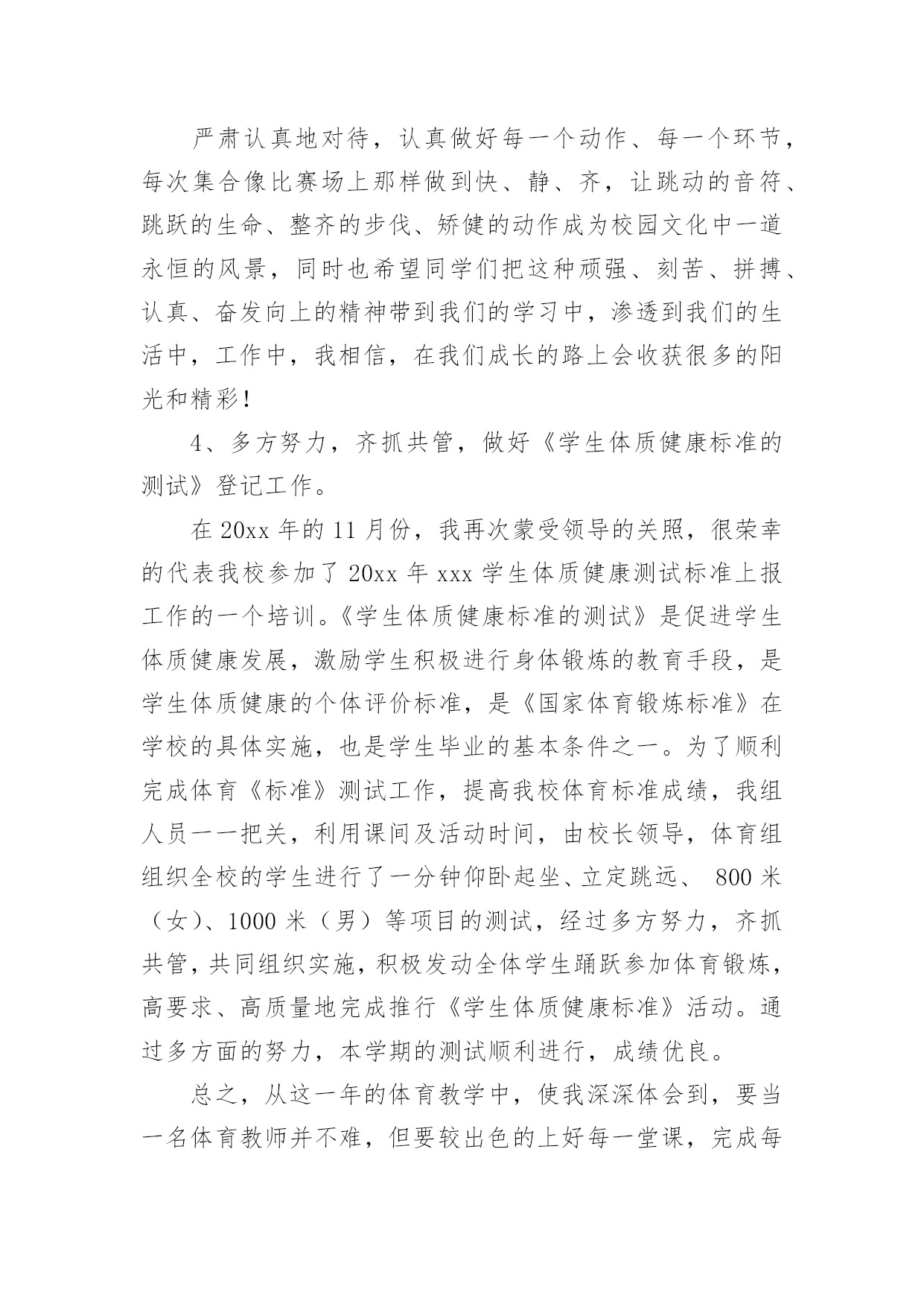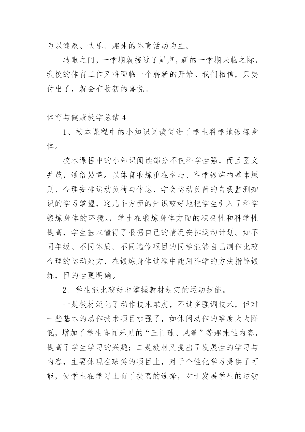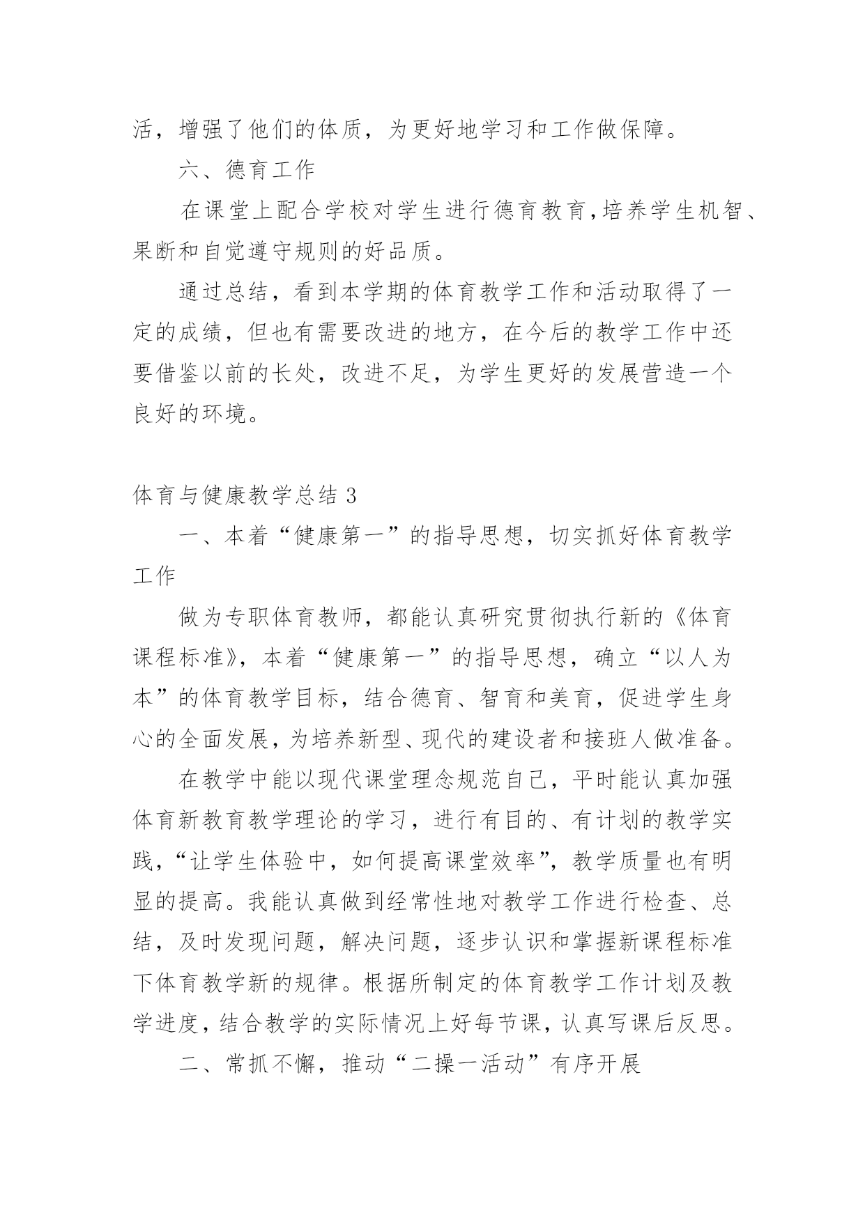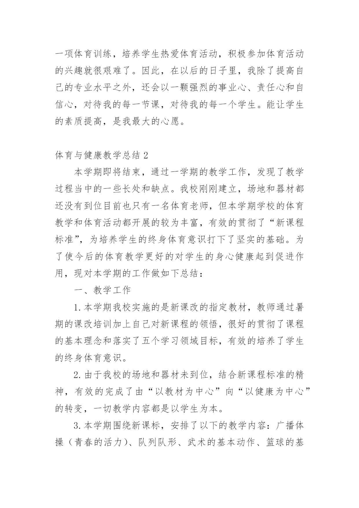 体育与健康教学总结总结就是对一个时期的学习、工作或其完成情况进行一次全面系统的回顾和分析的书面材料,写总结有利于我们学习和工作能力的提高,因此我们要做好归纳,写好总结。那么总结要注意有什么内容呢?下面是小编精心整理的体育与健康教学总结,仅供参考,大家一起来看看吧。体育与健康教学总结1本学期,我担任七年级的体育与健康教学工作,在教学工作过程中,基本上能够全面贯彻教育方针和新的教学理念,一丝不苟,认真备课,努力上好每一堂课。在这学期伊始,我很荣幸的参加了三亚市教育局组织的三亚市义务教育课程改革中中学体育与健康课程新课标的培训,此次培训让我出去长了很多见识,觉得那些新的理念、丰富的内容和花样的课堂,很是值得像刚踏上工作岗位的我们去学习,我从中受益匪浅。参加完培训后心里有点儿底了,知道今后的教学工作该怎么做了,貌似培训给了我一个方向。下面我将对我本学期的工作进行一个总结。一、基本做法1、按《体育与健康课程标准》和学生实际情况,在开学初我制定了学期体育教学工作计划,单元教学计划,备好课,写好教材,做到课前布置和检查场地器材。2、准备部分和结束部分,以及每个教学环节前后,都要求学生做准备或放松活动练习。3、每一堂课教材合理安排,使学生得到全面的身体锻炼,发展学生各方面的素质。4、讲解动作要领和保护方法,突出重点、难点,示范动作正确,每堂课分组练习,让学生真正的成为学习的主人,注重学生的主体地位。5、教材由易到难,由简到繁。循序渐进,新旧难易程度和不同性质的教材,搭配好,备课之间的教材衔接好,每次课的教材注意多样化,使学生的身体得到较全面的锻炼。6、注意每堂课运动量曲线的预计,防止身体过渡疲劳。7、积极虚心请教有经验的领导和老师,使自己在理论和实践相结合,钻研教学大纲,认真搞好了实习生的实习工作,努力地培养体育尖子,辅导差生,提高学生整体素质。二、主要问题由于受家庭环境、名族习俗、地域环境的影响,大部分学生的学习习惯、穿着习惯、课堂听讲、思维习惯、语言理解、书面表达与口语表达能力与城市学生有一定的差距。学生绝大多数穿拖鞋上课,学习积极性、主动性不够,注意力不集中,懒散毫无组织纪律,对教师的教学不能主动配合,自信心严重不足。再者因为在过往的体育教学中,只片面地对学生体质的练习,忽视了学生能力的培养;单一的教学方法、模型化的教学模式,使整堂体育课处于一个枯燥无味的情境当中,造成学生对体育课产生厌倦、逃避的心理,这也是传统的教学所带来的后果。为了激发学生的体育学习兴趣,课后与学生谈心,从与他们的交谈中得知他们想学什么,为了满足他们对体育运动项目的需求,依照我校的环境我个人买了羽毛球拍,课后学生就多了一项供娱乐的项目。在条件有限的校园我发觉快乐体育则需要体育教师充分发挥主导作用,利用一切有益于改善学生对体育课的手段,才能使学校体育更好地实施,以达到其目的。三、奋斗目标1、高度重视,全员参与如广播操我的理想是做到:整齐、划一、优美。为了确保广播操的规范性,课余时间我上网查看相关视频,通过多次观看和实践,就轻而易举的教会了学生。为了迎合学生对各种体育运动项目的兴趣,课后我大量查找资料,通过我自身的努力,不断丰富自我,这样给学生不仅带来了躯体的运动享受而且还给他们精神上带来了运动的享受,如周末我会带学生看一些精彩的体育赛事。我相信,在这样一种青春、健康、积极向上、而又充满活力的校园氛围中,我要做的事还很多!2、过程比结果更重要追求一种过程,体验一种经历,享受一种喜悦。我们体验了奋斗的艰辛;通过耐久跑、接力跑等这些项目我们培养了学生顽强、刻苦、拼搏、认真、奋发向上的精神;通过队列对行的练习,树立了学生们的爱我班级的集体主义荣誉感,这就是我这段时间的最大收获。3、继承和发扬比赛精神严肃认真地对待,认真做好每一个动作、每一个环节,每次集合像比赛场上那样做到快、静、齐,让跳动的音符、跳跃的生命、整齐的步伐、矫健的动作成为校园文化中一道永恒的风景,同时也希望同学们把这种顽强、刻苦、拼搏、认真、奋发向上的精神带到我们的学习中,渗透到我们的生活中,工作中,我相信,在我们成长的路上会收获很多的阳光和精彩!4、多方努力,齐抓共管,做好《学生体质健康标准的测试》登记工作。在20xx年的11月份,我再次蒙受领导的关照,很荣幸的代表我校参加了20xx年xxx学生体质健康测试标准上报工作的一个培训。《学生体质健康标准的测试》是促进学生体质健康发展,激励学生积极进行身体锻炼的教育手段,是学生体质健康的个体评价标准,是《国家体育锻炼标准》在学校的具体实施,也是学生毕业的基本条件之一。为了顺利完成体育《标准》测试工作,提高我校体育标准成绩,我组人员一一把关,利用课间及活动时间,由校长领导,体育组组织全校的学生进行了一分钟仰卧起坐、立定跳远、800米(女)、1000米(男)等项目的测