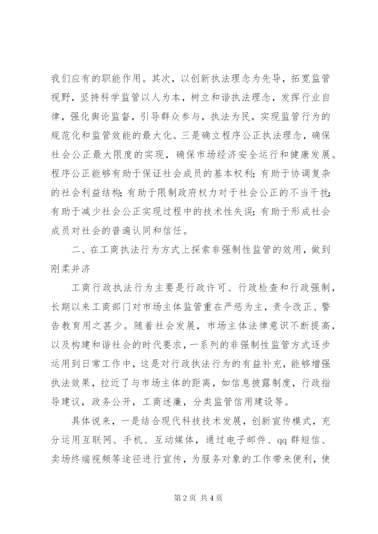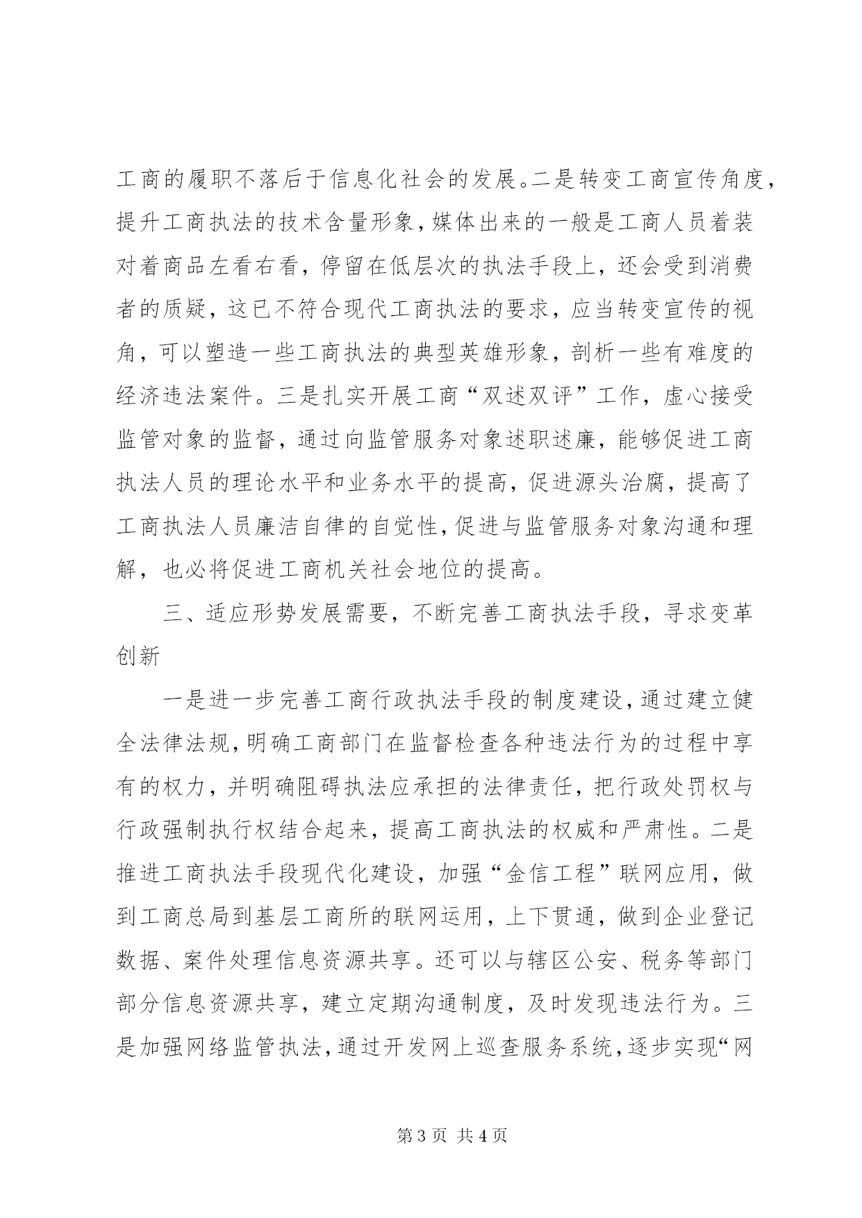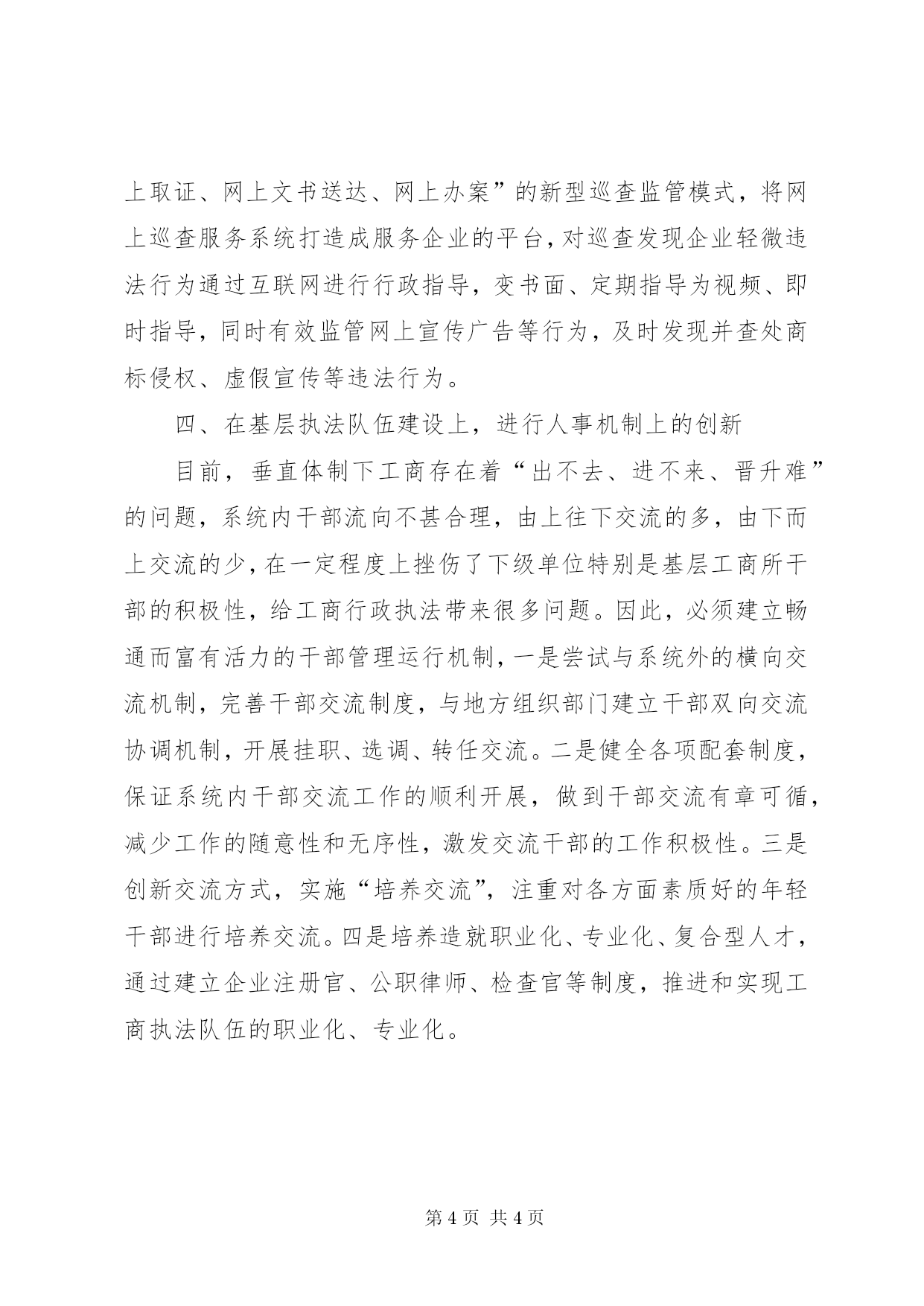 第PAGE\*Arabic\*MERGEFORMAT4页共NUMPAGES\*MERGEFORMAT4页基层工商所的执法创新调研报告所谓创新,就是对旧的思想观念、组织结构、机制制度、方式方法的扬弃和突破。没有创新,就没有发展,要发展就必须创新。国务院关于国家工商总局新“三定”方案已经出台,对基层工商所的职能定位和执法创新提出了新的要求;国家工商总局提出的“四个统一”是全面落实科学发展观的具体体现,其所包含的价值取向就是工商执法创新所追求的价值要义;基层工商所作为服务群众、企业的重要窗口和落实市场监管、维护公平竞争秩序的前沿阵地,是体现工商职能作用的基础环节,是构建工商“大厦”的基石,由于基层工商所建设面广点多,其生存和可持续发展必然要求各方面工作创新。一、以创新执法理念为先导首先,在垂直管理体制下,基层工商所必须确立纵横兼顾的大局理念,既理智地、自觉地接受纵向的垂直管理,又认真接受地方党委政府的领导监督,密切与地方党委政府的联系。在与地方党委政府的关系处理上,一定要紧紧抓住纵横兼顾的结合点,强化融合力,上级机关更要带着调和矛盾,解决问题的思想,通过沟通协调机制,使当地党委政府在工作部署上能充分考虑工商行政执法的特点与实际情况,吸纳工商部门的工作,提升我们的工作职能。这样,基层工商所就能做到既服从垂直管理的总目标,又善于接受地方党委政府的领导,牢牢把握工作的主动权,发挥我们应有的职能作用。其次,以创新执法理念为先导,拓宽监管视野,坚持科学监管以人为本,树立和谐执法理念,发挥行业自律,强化舆论监督,引导群众参与,执法为民,实现监管行为的规范化和监管效能的最大化。三是确立程序公正执法理念,确保社会公正最大限度的实现,确保市场经济安全运行和健康发展。程序公正能够有助于保证社会成员的基本权利;有助于协调复杂的社会利益结构;有助于限制政府权力对于社会公正的不当干扰;有助于减少社会公正实现过程中的技术性失误;有助于形成社会成员对社会的普遍认同和信任。二、在工商执法行为方式上探索非强制性监管的效用,做到刚柔并济工商行政执法行为主要是行政许可、行政检查和行政强制,长期以来工商部门对市场主体监管重在严惩为主,责令改正、警告教育用之甚少。随着社会发展,市场主体法律意识不断提高,以及构建和谐社会的时代要求,一系列的非强制性监管方式逐步运用到日常工作中,这是对行政执法行为的有益补充,能够增强执法效果,拉近了与市场主体的距离,如信息披露制度,行政指导建议,政务公开,工商述廉,分类监管信用建设等。具体说来,一是结合现代科技技术发展,创新宣传模式,充分运用互联网、手机、互动媒体,通过电子邮件、qq群短信、卖场终端视频等途径进行宣传,为服务对象的工作带来便利,使工商的履职不落后于信息化社会的发展。二是转变工商宣传角度,提升工商执法的技术含量形象,媒体出来的一般是工商人员着装对着商品左看右看,停留在低层次的执法手段上,还会受到消费者的质疑,这已不符合现代工商执法的要求,应当转变宣传的视角,可以塑造一些工商执法的典型英雄形象,剖析一些有难度的经济违法案件。三是扎实开展工商“双述双评”工作,虚心接受监管对象的监督,通过向监管服务对象述职述廉,能够促进工商执法人员的理论水平和业务水平的提高,促进源头治腐,提高了工商执法人员廉洁自律的自觉性,促进与监管服务对象沟通和理解,也必将促进工商机关社会地位的提高。三、适应形势发展需要,不断完善工商执法手段,寻求变革创新一是进一步完善工商行政执法手段的制度建设,通过建立健全法律法规,明确工商部门在监督检查各种违法行为的过程中享有的权力,并明确阻碍执法应承担的法律责任,把行政处罚权与行政强制执行权结合起来,提高工商执法的权威和严肃性。二是推进工商执法手段现代化建设,加强“金信工程”联网应用,做到工商总局到基层工商所的联网运用,上下贯通,做到企业登记数据、案件处理信息资源共享。还可以与辖区公安、税务等部门部分信息资源共享,建立定期沟通制度,及时发现违法行为。三是加强网络监管执法,通过开发网上巡查服务系统,逐步实现“网上取证、网上文书送达、网上办案”的新型巡查监管模式,将网上巡查服务系统打造成服务企业的平台,对巡查发现企业轻微违法行为通过互联网进行行政指导,变书面、定期指导为视频、即时指导,同时有效监管网上宣传广告等行为,及时发现并查处商标侵权、虚假宣传等违法行为。四、在基层执法队伍建设上,进行人事机制上的创新目前,垂直体制下工商存在着“出不去、进不来、晋升难”的问题,系统内干部流向不甚合理,由上往下交流的多,由下而上交流的少,在一定程度上挫伤了下级单位特别是基层工商所干部的积极性,给工商行政执法带来很多问题。因此,必须建立畅通而富有活力的干部管理运行机制,一是尝试与系统外的横向交流机制,完善干部交流制度,与地