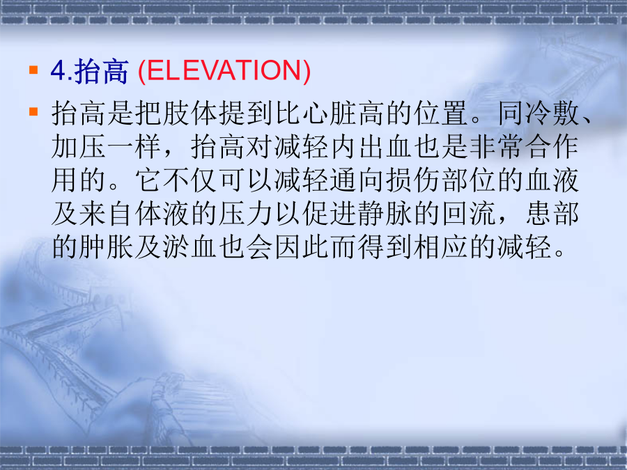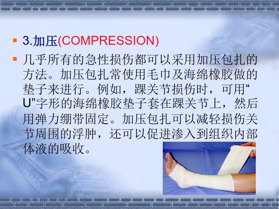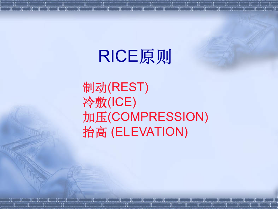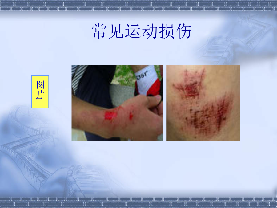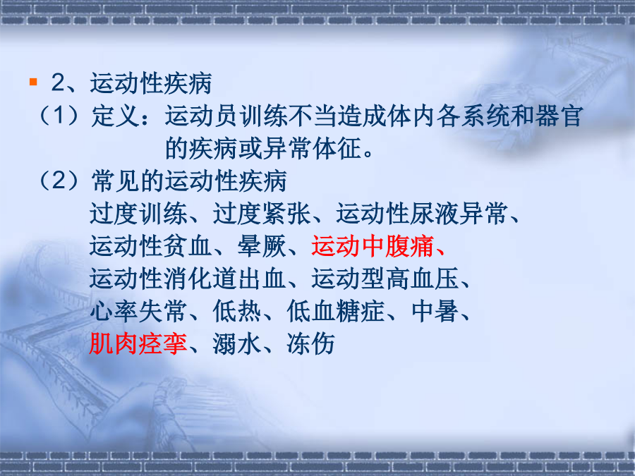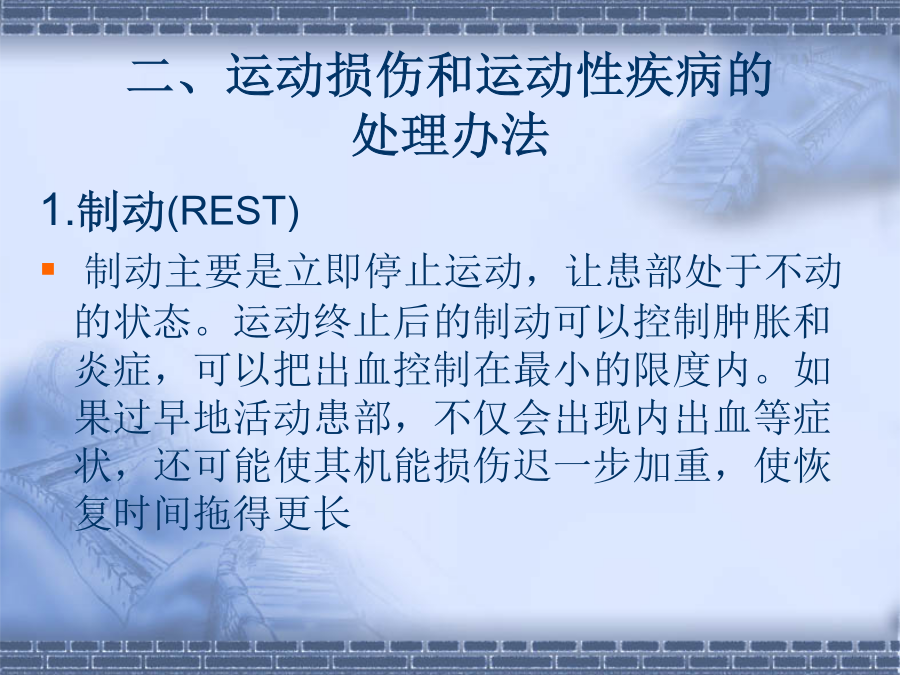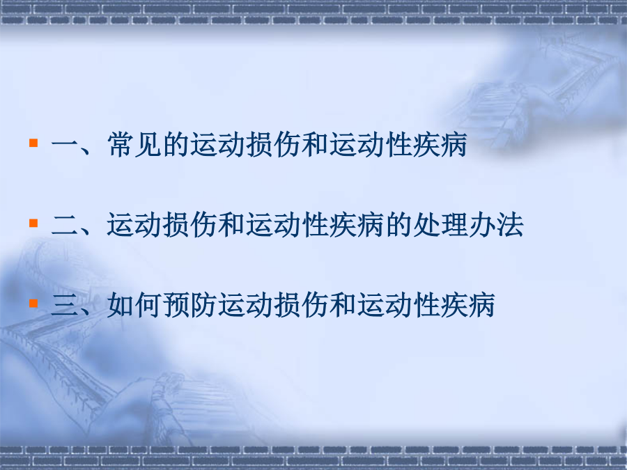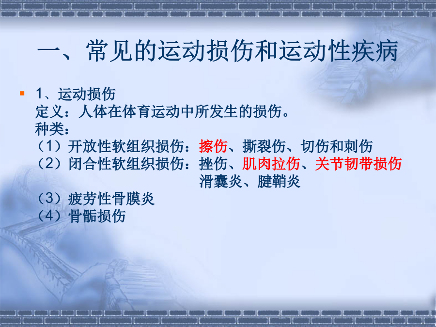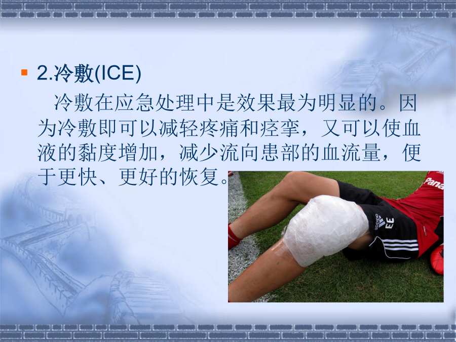 体育运动中常见运动损伤和运动性疾病的预防与处理一、常见的运动损伤和运动性疾病二、运动损伤和运动性疾病的处理办法三、如何预防运动损伤和运动性疾病一、常见的运动损伤和运动性疾病2、运动性疾病(1)定义:运动员训练不当造成体内各系统和器官的疾病或异常体征。(2)常见的运动性疾病过度训练、过度紧张、运动性尿液异常、运动性贫血、晕厥、运动中腹痛、运动性消化道出血、运动型高血压、心率失常、低热、低血糖症、中暑、肌肉痉挛、溺水、冻伤二、运动损伤和运动性疾病的处理办法2.冷敷(ICE)冷敷在应急处理中是效果最为明显的。因为冷敷即可以减轻疼痛和痉挛,又可以使血液的黏度增加,减少流向患部的血流量,便于更快、更好的恢复。3.加压(COMPRESSION)几乎所有的急性损伤都可以采用加压包扎的方法。加压包扎常使用毛巾及海绵橡胶做的垫子来进行。例如,踝关节损伤时,可用“U”字形的海绵橡胶垫子套在踝关节上,然后用弹力绷带固定。加压包扎可以减轻损伤关节周围的浮肿,还可以促进渗入到组织内部体液的吸收。4.抬高(ELEVATION)抬高是把肢体提到比心脏高的位置。同冷敷、加压一样,抬高对减轻内出血也是非常合作用的。它不仅可以减轻通向损伤部位的血液及来自体液的压力以促进静脉的回流,患部的肿胀及淤血也会因此而得到相应的减轻。RICE原则常见运动损伤擦伤知识常见运动损伤扭伤知识常见运动性疾病(抽筋)肌肉痉挛运动中腹痛徒手搬运徒手搬运巩固练习是、否是答案返回答案返回答案返回三、如何预防运动损伤和运动性疾病三、如何预防运动损伤和运动性疾病聂耳