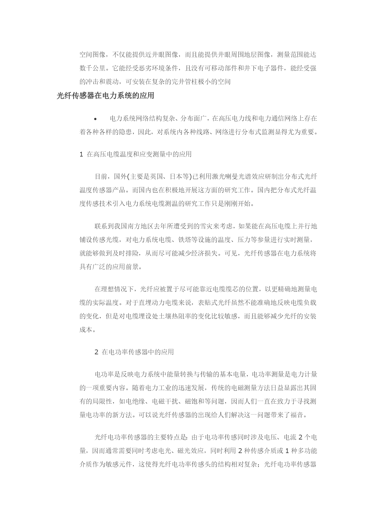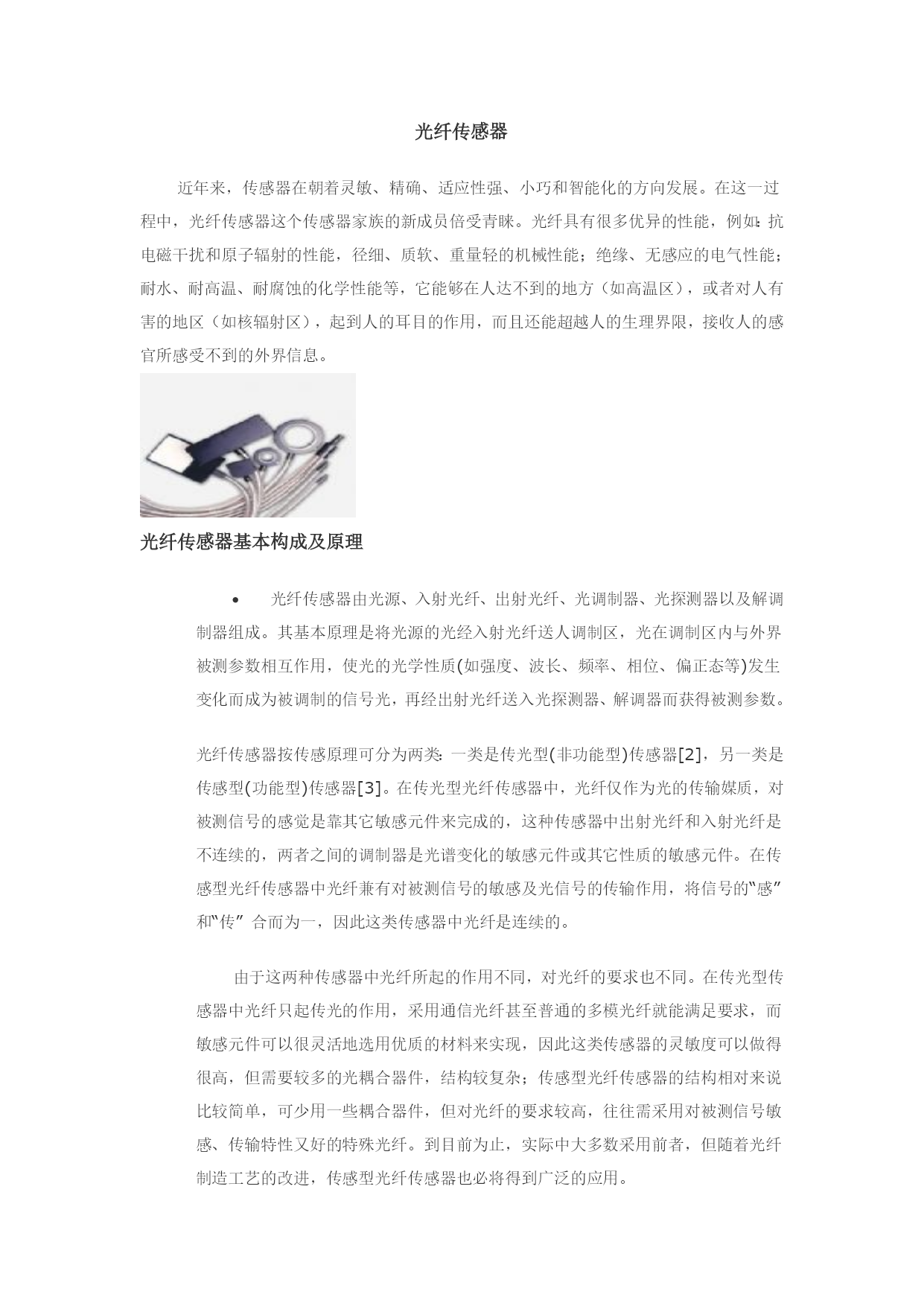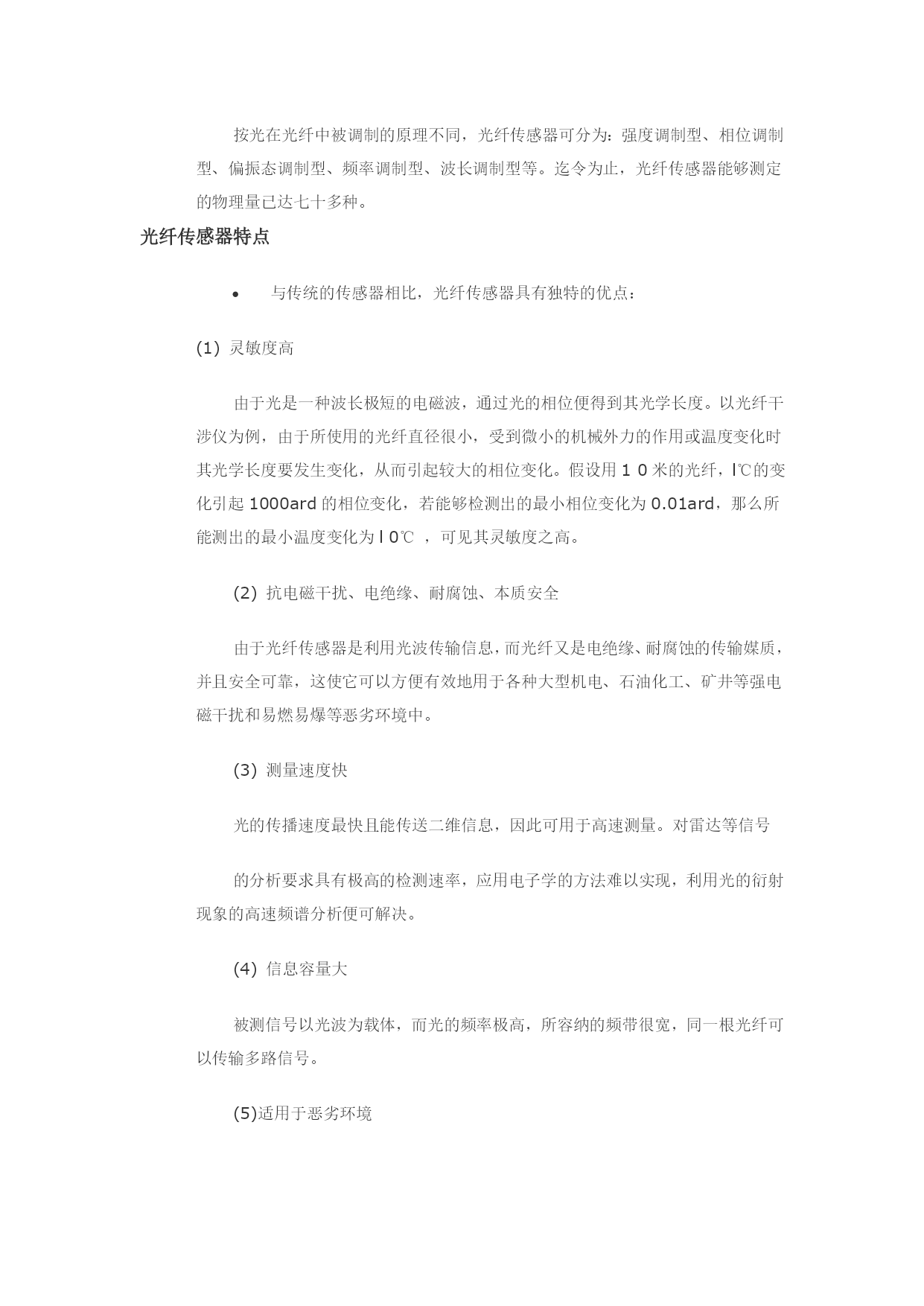 光纤传感器近年来,传感器在朝着灵敏、精确、适应性强、小巧和智能化的方向发展。在这一过程中,光纤传感器这个传感器家族的新成员倍受青睐。光纤具有很多优异的性能,例如:抗电磁干扰和原子辐射的性能,径细、质软、重量轻的机械性能;绝缘、无感应的电气性能;耐水、耐高温、耐腐蚀的化学性能等,它能够在人达不到的地方(如高温区),或者对人有害的地区(如核辐射区),起到人的耳目的作用,而且还能超越人的生理界限,接收人的感官所感受不到的外界信息。光纤传感器基本构成及原理光纤传感器由光源、入射光纤、出射光纤、光调制器、光探测器以及解调制器组成。其基本原理是将光源的光经入射光纤送人调制区,光在调制区内与外界被测参数相互作用,使光的光学性质(如强度、波长、频率、相位、偏正态等)发生变化而成为被调制的信号光,再经出射光纤送入光探测器、解调器而获得被测参数。光纤传感器按传感原理可分为两类:一类是传光型(非功能型)传感器[2],另一类是传感型(功能型)传感器[3]。在传光型光纤传感器中,光纤仅作为光的传输媒质,对被测信号的感觉是靠其它敏感元件来完成的,这种传感器中出射光纤和入射光纤是不连续的,两者之间的调制器是光谱变化的敏感元件或其它性质的敏感元件。在传感型光纤传感器中光纤兼有对被测信号的敏感及光信号的传输作用,将信号的“感”和“传”合而为一,因此这类传感器中光纤是连续的。由于这两种传感器中光纤所起的作用不同,对光纤的要求也不同。在传光型传感器中光纤只起传光的作用,采用通信光纤甚至普通的多模光纤就能满足要求,而敏感元件可以很灵活地选用优质的材料来实现,因此这类传感器的灵敏度可以做得很高,但需要较多的光耦合器件,结构较复杂;传感型光纤传感器的结构相对来说比较简单,可少用一些耦合器件,但对光纤的要求较高,往往需采用对被测信号敏感、传输特性又好的特殊光纤。到目前为止,实际中大多数采用前者,但随着光纤制造工艺的改进,传感型光纤传感器也必将得到广泛的应用。按光在光纤中被调制的原理不同,光纤传感器可分为:强度调制型、相位调制型、偏振态调制型、频率调制型、波长调制型等。迄令为止,光纤传感器能够测定的物理量已达七十多种。光纤传感器特点与传统的传感器相比,光纤传感器具有独特的优点:(1)灵敏度高由于光是一种波长极短的电磁波,通过光的相位便得到其光学长度。以光纤干涉仪为例,由于所使用的光纤直径很小,受到微小的机械外力的作用或温度变化时其光学长度要发生变化,从而引起较大的相位变化。假设用10米的光纤,l℃的变化引起1000ard的相位变化,若能够检测出的最小相位变化为0.01ard,那么所能测出的最小温度变化为l0℃,可见其灵敏度之高。(2)抗电磁干扰、电绝缘、耐腐蚀、本质安全由于光纤传感器是利用光波传输信息,而光纤又是电绝缘、耐腐蚀的传输媒质,并且安全可靠,这使它可以方便有效地用于各种大型机电、石油化工、矿井等强电磁干扰和易燃易爆等恶劣环境中。(3)测量速度快光的传播速度最快且能传送二维信息,因此可用于高速测量。对雷达等信号的分析要求具有极高的检测速率,应用电子学的方法难以实现,利用光的衍射现象的高速频谱分析便可解决。(4)信息容量大被测信号以光波为载体,而光的频率极高,所容纳的频带很宽,同一根光纤可以传输多路信号。(5)适用于恶劣环境光纤是一种电介质,耐高压、耐腐蚀、抗电磁干扰,可用于其它传感器所不适应的恶劣环境中。此外,光纤传感器还具有质量轻、体积小、可绕曲、测量对象广泛、复用性好、成本低等特点。光纤传感器的应用正是由于光纤传感器拥有如此之多的优点,使得其应用领域非常广泛,涉及石油化工、电力、医学、土木工程等诸多领域。1光纤传感器在石油化工系统的应用在石油化工系统中,由于井下环境具有高温、高压、化学腐蚀以及电磁干扰强等特点,使得常规传感器难以在井下很好地发挥作用。然而光纤本身不带电,体小质轻,易弯曲,抗电磁干扰、抗辐射性能好。特别适合于易燃易爆、空间受严格限制及强电磁干扰等恶劣环境下使用,因此光纤传感器在油井参数测量中发挥着不可替代的作用,它将成为可应用于油气勘探及石油测井等领域的一项具有广阔市场前景的新技术。1.1光纤传感器在油气勘探[4]中的应用光纤传感器由于其抗高温能力、多通络、分布式的感应能力,以及只需要较小的空间即可满足其使用条件的特点,使得在勘探钻井方面尤其独特的优势。应用光纤传感器可以制成井下分光计,分布式温度传感器及光纤压力传感器等适用于这种特殊作业要求的产品。(1)井下分光计流体分析仪如图1所示,可用于了解初期开发过程中的原油组成成分。它由两个传感器合成:一个是吸收光谱分光纤,另一个是荧光和气体探测器。井下流体通过地层探针被引入出油管,光学传感器用于分析出油管内的流体。流体分析分光计则提供了原位井下
