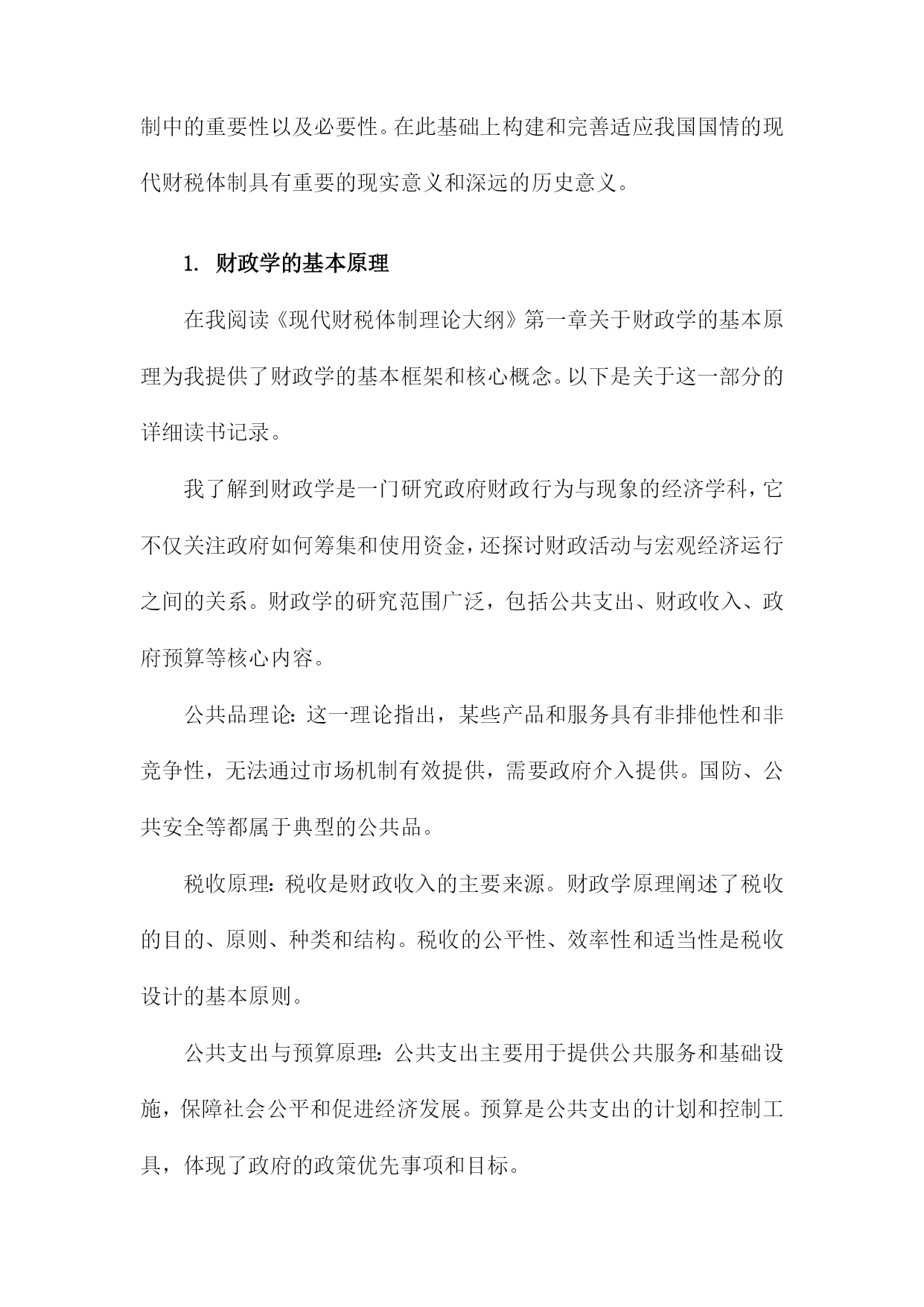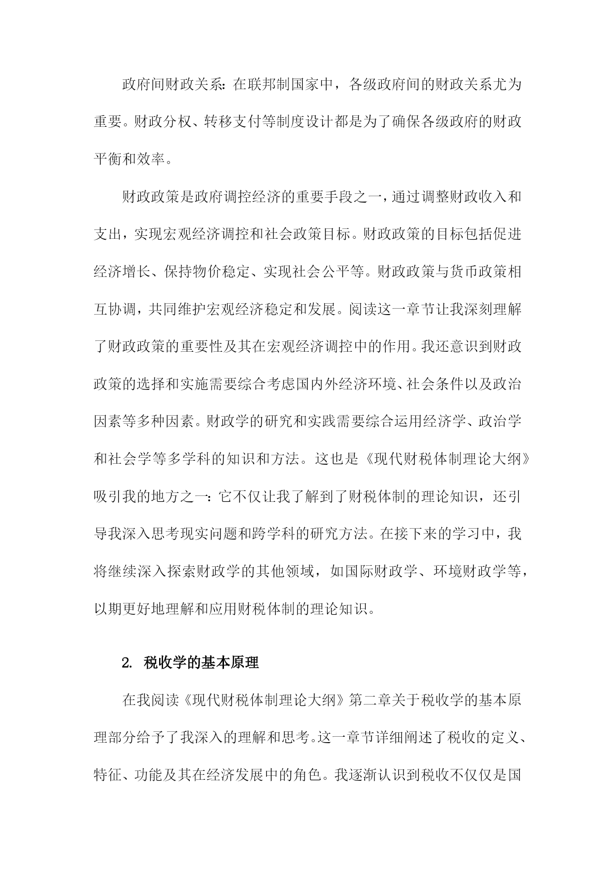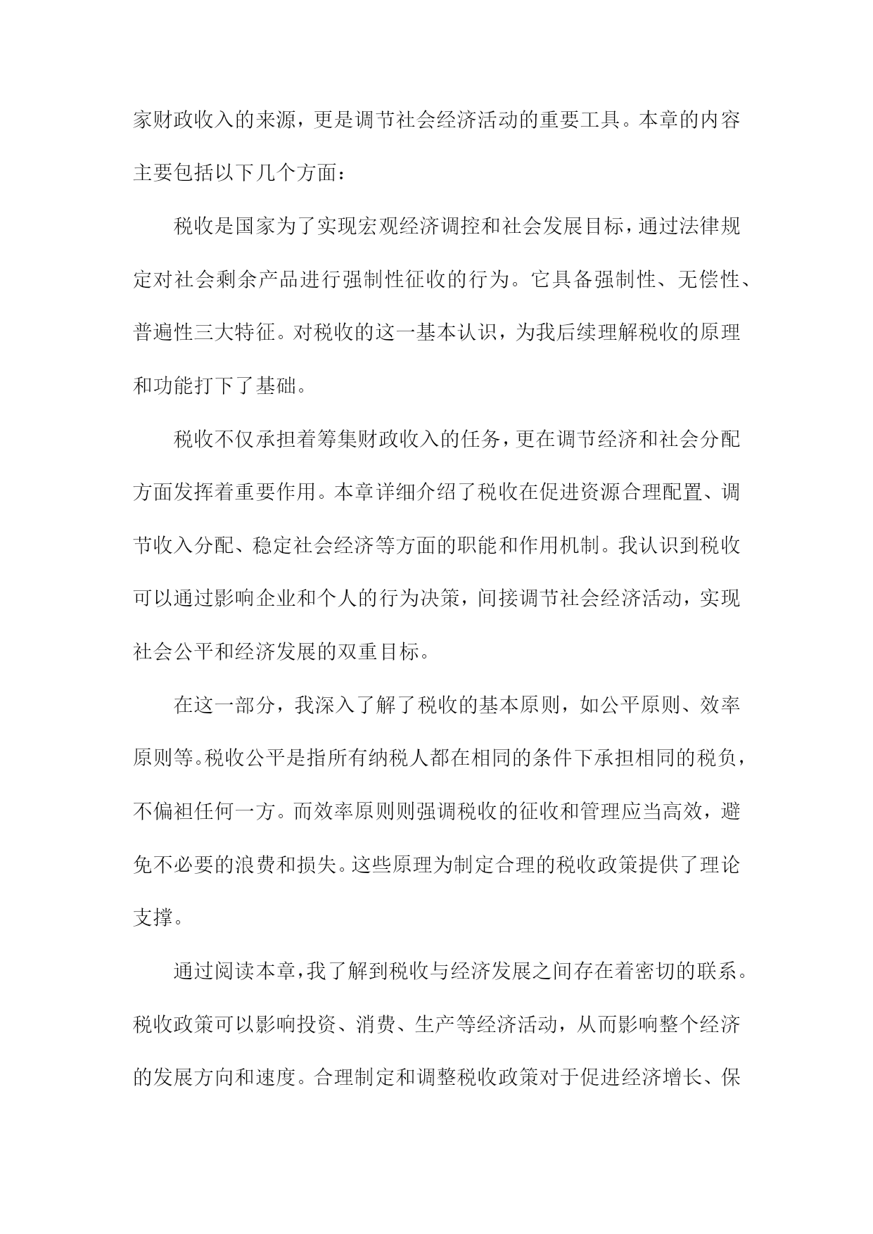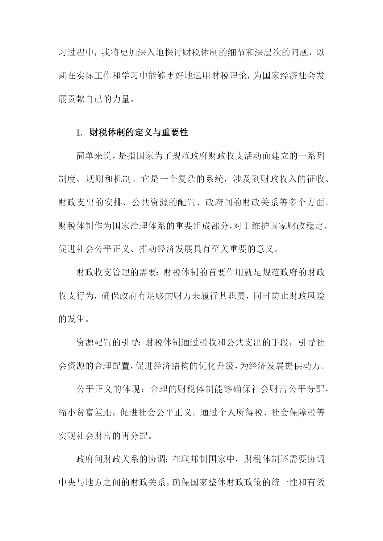 《现代财税体制理论大纲》读书记录一、财税体制概述在我研读《现代财税体制理论大纲》对于财税体制的概念及其重要性有了更为深入的理解。简而言之,是指国家财政税收的制度安排,涉及财政权力分配、税收管理、财政收支结构等多个方面。它是国家治理体系和治理能力现代化的重要组成部分,对于促进国家经济发展、保障社会公平正义、维护国家长治久安具有重大意义。在现代经济社会中,财税体制的作用愈发凸显。合理的财税体制能够优化资源配置,促进经济持续健康发展;能够有效地调节收入分配,减少社会不平等现象;还能够为国家重大决策提供资金支持,保障国家职能的充分发挥。学习和研究现代财税体制理论,对于我们理解国家经济运行规律,提高社会管理效率,具有十分重要的意义。通过阅读《现代财税体制理论大纲》,我对财税体制的演变历程、当前的发展趋势以及未来的改革方向有了更加清晰的认识。书中详细介绍了我国财税体制的发展历程,从计划经济时代的统收统支,到改革开放后的财政包干制,再到分税制改革,以及当前我正在深入学习的现代财税体制理论,书中内容既全面又深入,为我打开了一个全新的视角,使我对财税体制有了更加系统、全面的认识。在接下来的学习过程中,我将更加深入地探讨财税体制的细节和深层次的问题,以期在实际工作和学习中能够更好地运用财税理论,为国家经济社会发展贡献自己的力量。1.财税体制的定义与重要性简单来说,是指国家为了规范政府财政收支活动而建立的一系列制度、规则和机制。它是一个复杂的系统,涉及到财政收入的征收、财政支出的安排、公共资源的配置、政府间的财政关系等多个方面。财税体制作为国家治理体系的重要组成部分,对于维护国家财政稳定、促进社会公平正义、推动经济发展具有至关重要的意义。财政收支管理的需要:财税体制的首要作用就是规范政府的财政收支行为,确保政府有足够的财力来履行其职责,同时防止财政风险的发生。资源配置的引导:财税体制通过税收和公共支出的手段,引导社会资源的合理配置,促进经济结构的优化升级,为经济发展提供动力。公平正义的体现:合理的财税体制能够确保社会财富公平分配,缩小贫富差距,促进社会公平正义。通过个人所得税、社会保障税等实现社会财富的再分配。政府间财政关系的协调:在联邦制国家中,财税体制还需要协调中央与地方之间的财政关系,确保国家整体财政政策的统一性和有效性。宏观经济调控的工具:财税体制作为政府宏观经济调控的重要工具之一,可以通过调整税收政策、财政支出政策等手段,影响总需求与总供给,实现宏观经济的稳定与发展。财税体制不仅关系到国家财政的稳健运行,还对社会公平正义、经济发展以及政府间关系的协调产生深远影响。对财税体制的研究与改革具有极其重要的现实意义和长远意义。2.现代财税体制的发展历程阅读到本书的第二部分时,我对于现代财税体制的发展历程有了更加全面而深入的了解。本部分主要探讨了现代财税体制从诞生到逐渐成熟的全过程,特别是在经济、社会和政治变迁背景下的财税体制改革和创新。这一部分内容既涉及到了财税体制的理论基础,也涵盖了一些实践案例,既有宏观的概述,也有微观的分析。我对此深感兴趣,因为它不仅让我理解了财税体制的重要性,也让我看到了其适应时代变化的灵活性。现代财税体制的起源可以追溯到工业革命时期,当时的经济快速发展和政府职能的扩大使得传统的财税体制无法满足需求。在这一阶段,财税体制开始逐渐从封建社会的税制向现代社会的税制转变。初期的现代财税体制主要特点是税制简化、税收公平和财政透明。这些特点为后来的财税体制改革奠定了基础。各国的经济发展和社会状况都需要对财税体制进行相应的调整。为了适应经济重建和民生改善的需要,许多国家都进行了一系列的财税体制改革。这些改革旨在恢复经济活力,促进经济发展和社会公平。财政政策和税收政策在促进经济增长、调节收入分配等方面发挥了重要作用。进入当代社会以来,经济全球化、技术革命和人口结构变化等因素对财税体制提出了新的挑战。为了适应这些变化,各国纷纷进行财税体制改革和创新。这一阶段的财税体制转型主要体现在以下几个方面:一是税制结构的优化和调整;二是税收管理的现代化和智能化;三是财政政策的协调和创新。许多新兴经济体的财税体制改革也在推动着现代财税体制的转型和发展。在此背景下,许多国家和地区都对税收政策进行了大幅度调整和完善,以适应全球化和市场化的需求。比如我国在财税体制改革上的举措便十分具有代表性,随着经济社会的发展和市场化的推进,我国在税制优化、预算管理、公共服务市场化等方面进行了大胆探索和尝试。这不仅提高了财政资金的使用效率,也促进了经济的持续健康发展。我也了解到一些发达国家在财税体制改革上的经验和做法,如美国的联邦与地方税收协调制度以及欧洲的公共服务税收制度等,它们都具有很高的借鉴意义和应用价值。这一部分的学习让我对现代财税