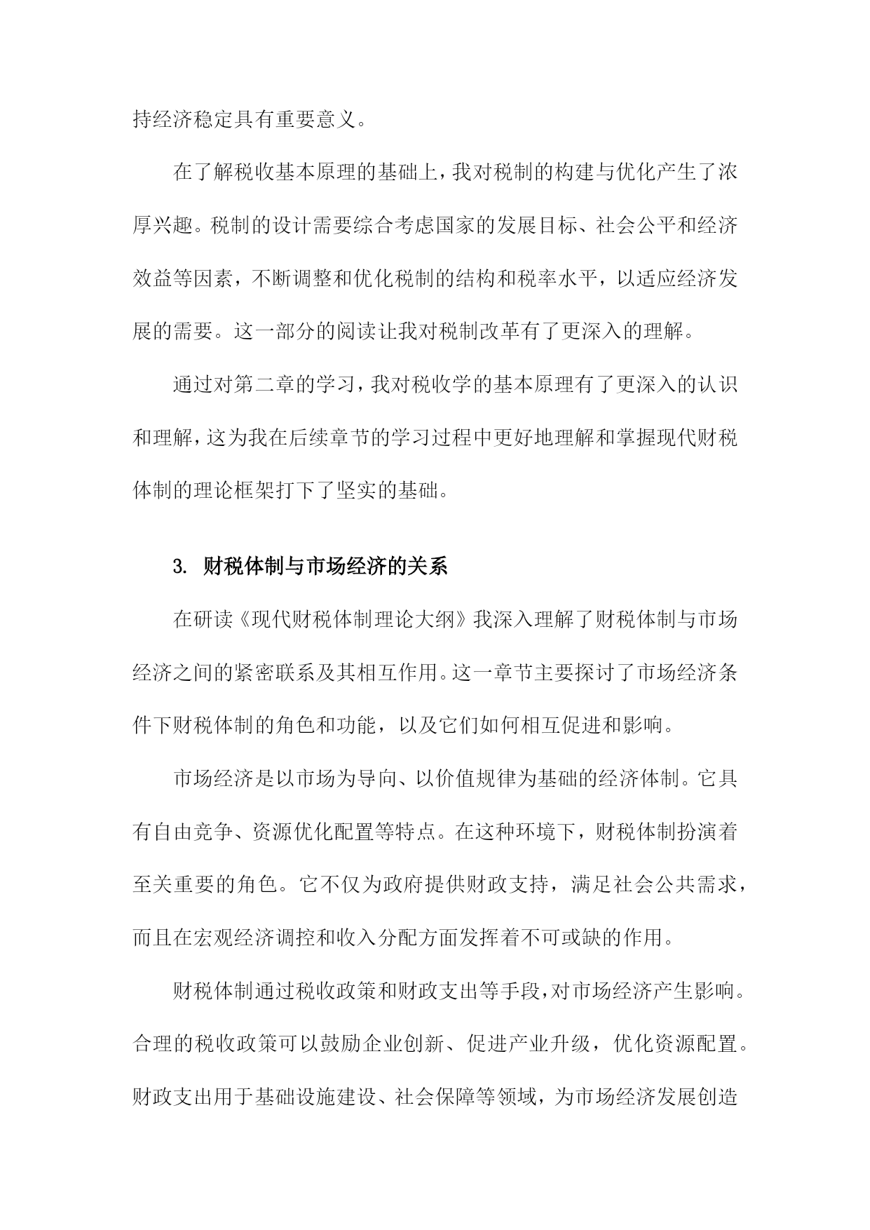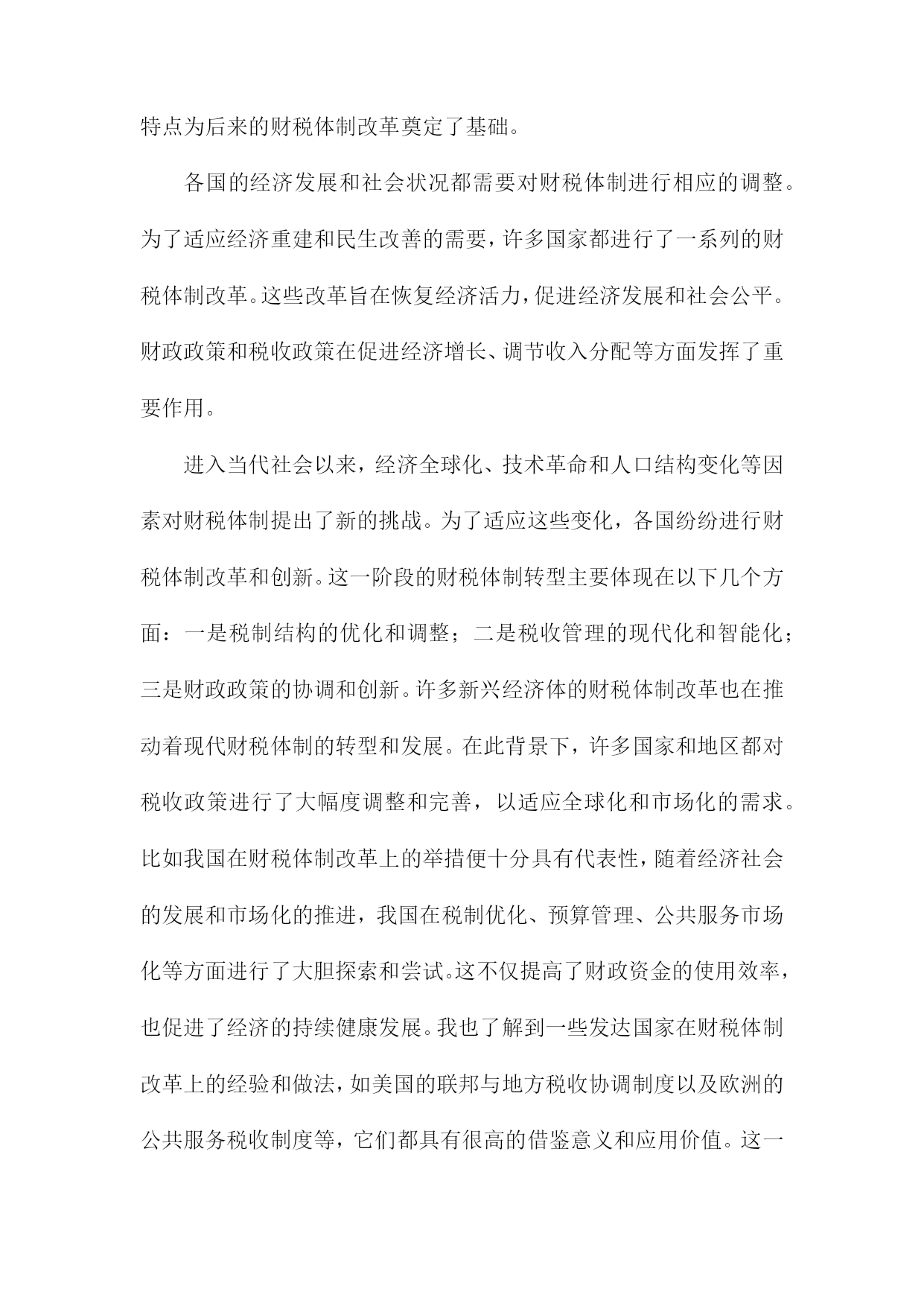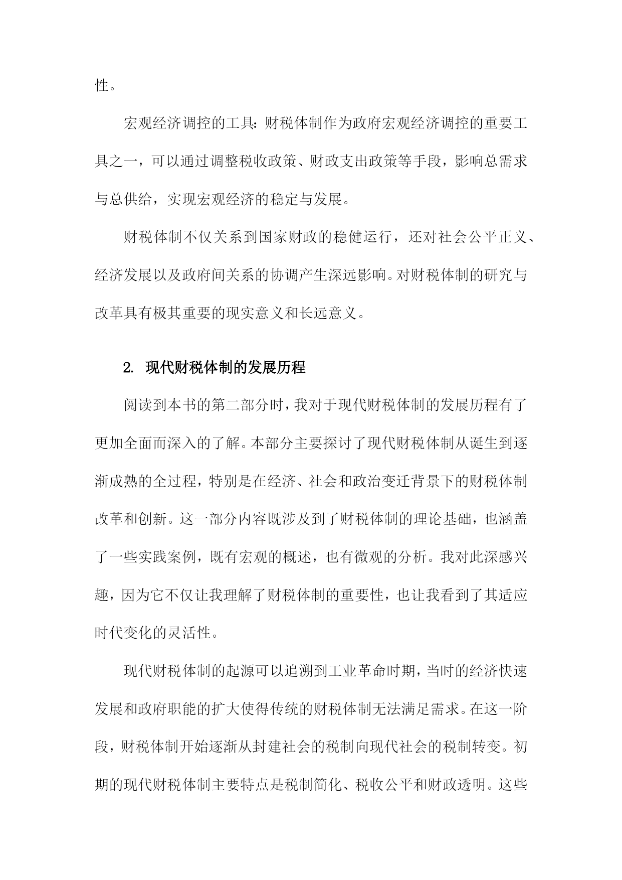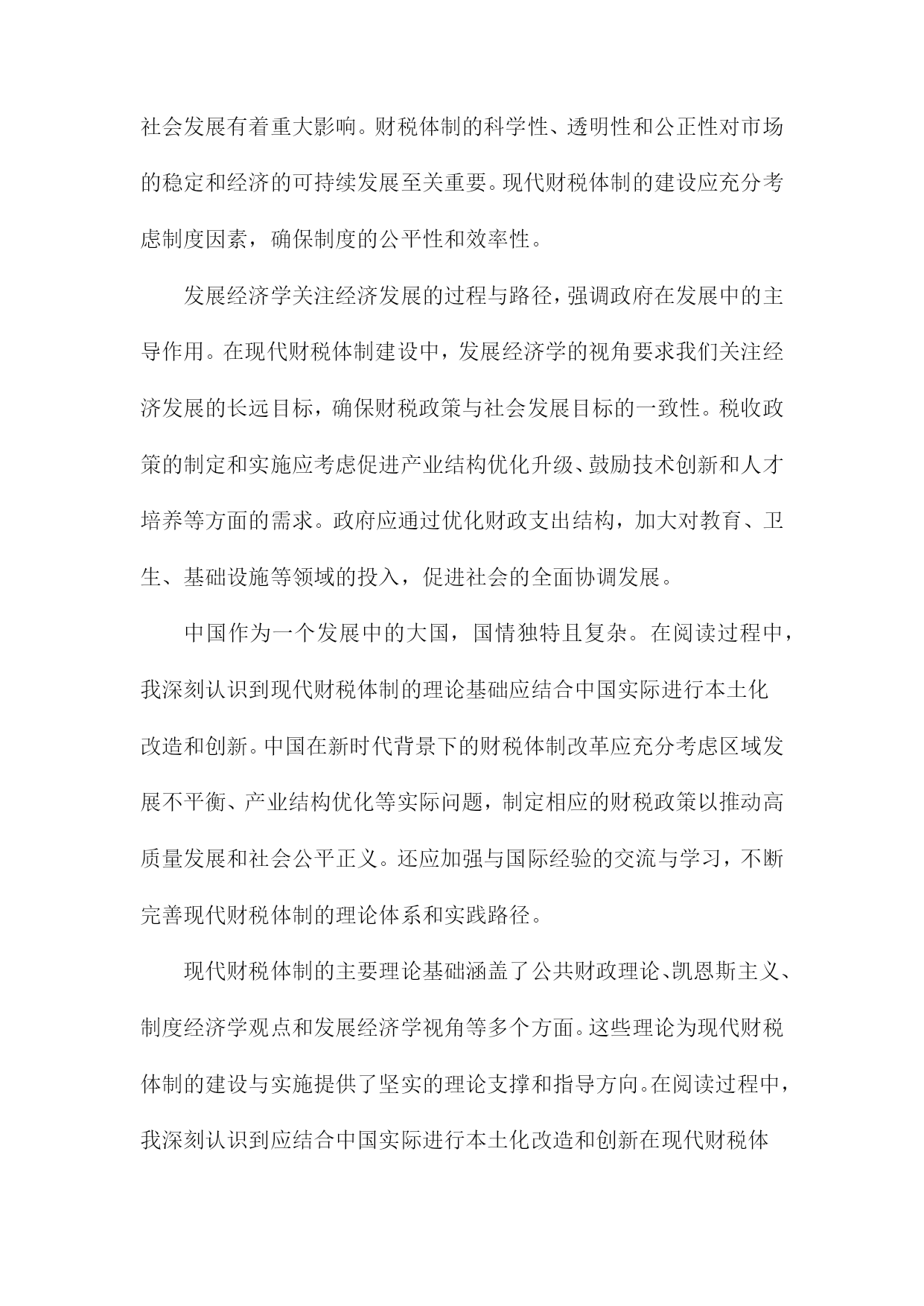 《现代财税体制理论大纲》读书记录一、财税体制概述在我研读《现代财税体制理论大纲》对于财税体制的概念及其重要性有了更为深入的理解。简而言之,是指国家财政税收的制度安排,涉及财政权力分配、税收管理、财政收支结构等多个方面。它是国家治理体系和治理能力现代化的重要组成部分,对于促进国家经济发展、保障社会公平正义、维护国家长治久安具有重大意义。在现代经济社会中,财税体制的作用愈发凸显。合理的财税体制能够优化资源配置,促进经济持续健康发展;能够有效地调节收入分配,减少社会不平等现象;还能够为国家重大决策提供资金支持,保障国家职能的充分发挥。学习和研究现代财税体制理论,对于我们理解国家经济运行规律,提高社会管理效率,具有十分重要的意义。通过阅读《现代财税体制理论大纲》,我对财税体制的演变历程、当前的发展趋势以及未来的改革方向有了更加清晰的认识。书中详细介绍了我国财税体制的发展历程,从计划经济时代的统收统支,到改革开放后的财政包干制,再到分税制改革,以及当前我正在深入学习的现代财税体制理论,书中内容既全面又深入,为我打开了一个全新的视角,使我对财税体制有了更加系统、全面的认识。在接下来的学习过程中,我将更加深入地探讨财税体制的细节和深层次的问题,以期在实际工作和学习中能够更好地运用财税理论,为国家经济社会发展贡献自己的力量。1.财税体制的定义与重要性简单来说,是指国家为了规范政府财政收支活动而建立的一系列制度、规则和机制。它是一个复杂的系统,涉及到财政收入的征收、财政支出的安排、公共资源的配置、政府间的财政关系等多个方面。财税体制作为国家治理体系的重要组成部分,对于维护国家财政稳定、促进社会公平正义、推动经济发展具有至关重要的意义。财政收支管理的需要:财税体制的首要作用就是规范政府的财政收支行为,确保政府有足够的财力来履行其职责,同时防止财政风险的发生。资源配置的引导:财税体制通过税收和公共支出的手段,引导社会资源的合理配置,促进经济结构的优化升级,为经济发展提供动力。公平正义的体现:合理的财税体制能够确保社会财富公平分配,缩小贫富差距,促进社会公平正义。通过个人所得税、社会保障税等实现社会财富的再分配。政府间财政关系的协调:在联邦制国家中,财税体制还需要协调中央与地方之间的财政关系,确保国家整体财政政策的统一性和有效性。宏观经济调控的工具:财税体制作为政府宏观经济调控的重要工具之一,可以通过调整税收政策、财政支出政策等手段,影响总需求与总供给,实现宏观经济的稳定与发展。财税体制不仅关系到国家财政的稳健运行,还对社会公平正义、经济发展以及政府间关系的协调产生深远影响。对财税体制的研究与改革具有极其重要的现实意义和长远意义。2.现代财税体制的发展历程阅读到本书的第二部分时,我对于现代财税体制的发展历程有了更加全面而深入的了解。本部分主要探讨了现代财税体制从诞生到逐渐成熟的全过程,特别是在经济、社会和政治变迁背景下的财税体制改革和创新。这一部分内容既涉及到了财税体制的理论基础,也涵盖了一些实践案例,既有宏观的概述,也有微观的分析。我对此深感兴趣,因为它不仅让我理解了财税体制的重要性,也让我看到了其适应时代变化的灵活性。现代财税体制的起源可以追溯到工业革命时期,当时的经济快速发展和政府职能的扩大使得传统的财税体制无法满足需求。在这一阶段,财税体制开始逐渐从封建社会的税制向现代社会的税制转变。初期的现代财税体制主要特点是税制简化、税收公平和财政透明。这些特点为后来的财税体制改革奠定了基础。各国的经济发展和社会状况都需要对财税体制进行相应的调整。为了适应经济重建和民生改善的需要,许多国家都进行了一系列的财税体制改革。这些改革旨在恢复经济活力,促进经济发展和社会公平。财政政策和税收政策在促进经济增长、调节收入分配等方面发挥了重要作用。进入当代社会以来,经济全球化、技术革命和人口结构变化等因素对财税体制提出了新的挑战。为了适应这些变化,各国纷纷进行财税体制改革和创新。这一阶段的财税体制转型主要体现在以下几个方面:一是税制结构的优化和调整;二是税收管理的现代化和智能化;三是财政政策的协调和创新。许多新兴经济体的财税体制改革也在推动着现代财税体制的转型和发展。在此背景下,许多国家和地区都对税收政策进行了大幅度调整和完善,以适应全球化和市场化的需求。比如我国在财税体制改革上的举措便十分具有代表性,随着经济社会的发展和市场化的推进,我国在税制优化、预算管理、公共服务市场化等方面进行了大胆探索和尝试。这不仅提高了财政资金的使用效率,也促进了经济的持续健康发展。我也了解到一些发达国家在财税体制改革上的经验和做法,如美国的联邦与地方税收协调制度以及欧洲的公共服务税收制度等,它们都具有很高的借鉴意义和应用价值。这一部分的学习让我对现代财税