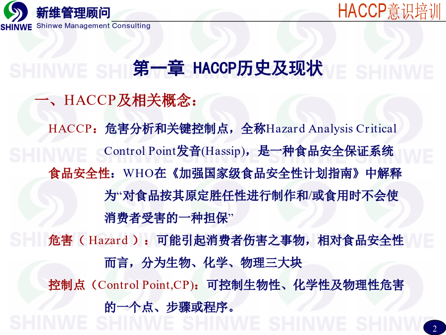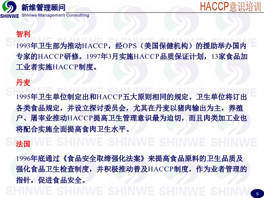 HACCPHACCP:危害分析和关键控制点,全称HazardAnalysisCriticalControlPoint发音(Hassip),是一种食品安全保证系统食品安全性:WHO在《加强国家级食品安全性计划指南》中解释为“对食品按其原定胜任性进行制作和/或食用时不会使消费者受害的一种担保”危害(Hazard):可能引起消费者伤害之事物,相对食品安全性而言,分为生物、化学、物理三大块控制点(ControlPoint,CP):可控制生物性、化学性及物理性危害的一个点、步骤或程序。关键控制点(CriticalControlPoint,CCP):针对一个点、步骤或程序,若施予控制,则可预防、去除或减低食品中安全危害至可接受之程度。GMP(GoodManufacturingPractice):称为良好操作(制造)规范,GMP体制是美国所创的一种保障产品质量的管理方法。SSOP——卫生标准操作程序(SanitationStandardOperatingProcedure),简称卫生操作规程.ISO9000系列标准——国际标准化组织(ISO)通过的涉及质量管理和质量保证的有关系列标准。1、60年代20世纪60年代美国Pillsbury公司与美国宇航局用“零缺陷”方法控制宇航员食物的卫生质量开发航天食品时,所形成的HACCP食品质量管理体系,并证实了其可靠性。最初的目的是为了制造百分之百安全的太空食品。2、70年代HACCP的概念是1971年由美国国家食品保护会议上首次被提出,1973年美国药物管理局(FoodandDrugAdministration)FDA首次将HACCP食品加工控制概念应用于罐头食品加工中,以防止腊肠毒菌感染。3、80年代在1985年,美国国家科学院(NationalAcademyofSciences,NAS)建议与食品相关之各政府机构应使用较具科学依据之HACCP方法于稽核工作上,并鉴于HACCP实施于罐头食品成功例子之经验,建议所有执法机构均应采用HACCP方法,对食品加工业应予强制执行。4、90年代由于在水产品上执行HACCP成绩显著,FDA决定将对国内及进口之水产品业者强制要求实施HACCP。同时,FDA也考虑将HACCP之应用更扩展到其他食品上(禽畜产品例外)。1995年12月,FDA根据“危害分析和关键控制点(HACCP)”的基本原则提出了水产品法规,这些法规强调水产品加工过程中的某些关键特性工作,要由经过HACCP培训的人来完成,该人负责制定和修改HACCP计划,并审查各项记录。现状美国FDA、WHO、联合国法典理事会(CAC)、欧共体理事会(EEC)、美国国家科学院(NAS)等皆极力推荐HACCP为最有效的的食品危害控制方法。HACCP已广泛被加拿大、日本、泰国、冰岛等国采纳。我国刚加入WTO,因此中国食品标准与国际接轨是必然趋势,并极有可能在某些特种食品领域将强制执行HACCP。加拿大加拿大的渔业海洋部1992年2月推行水产食品的登录制度,规定申请登录的必备条件为水产品工厂应施行以HACCP为基础的品质管理计划。关于乳品卫生方面,农业部依据强化食品安全计划,自1996年起推动屠宰场、食肉制品、乳制品等的HACCP管理制度。秘鲁秘鲁的最大输出国为美国,美国于1997年12月18日实施水产品的HACCP管理制度,因此输出业者部得部对美国的食品安全规定给予高度重视。输出业者协会ADEX得到USAID(美国国际开发局)及德国的GTZ(德国国际协力组织)的协助,制定各种专业培训计划来推动HACCP制度。1996年初有28家,1996年底已达72家(冷冻33家、罐头4家鱼粉等35家)实施HACCP制度。智利1993年卫生部为推动HACCP,经OPS(美国保健机构)的援助举办国内专家的HACCP研修。1997年3月实施HACCP品质保证计划,13家食品加工业者实施HACCP制度。丹麦1995年卫生单位制定出和HACCP五大原则相同的规定。卫生单位将订出各类食品规定,并设立探讨委员会,尤其在丹麦以猪肉输出为主,养殖户、屠宰业推动HACCP提高卫生管理意识最为迫切,而且肉类加工业也将配合实施全面提高食肉卫生水平。法国1996年底通过《食品安全取缔强化法案》来提高食品原料的卫生品质及强化食品卫生检查制度,并积极推动普及HACCP制度,作为业者管理的指针,促进食品安全。一、近几年来震惊中外食品安全事件:1987年上海发生的因食用不洁毛蚶引起甲肝大流行1996年起欧洲、日本等国家疯牛病1999年比利时,二垩英1999年中国香港禽流感2000年日本牛奶,葡萄球菌肠毒素2000年英国、法国等口蹄疫2001年中国广