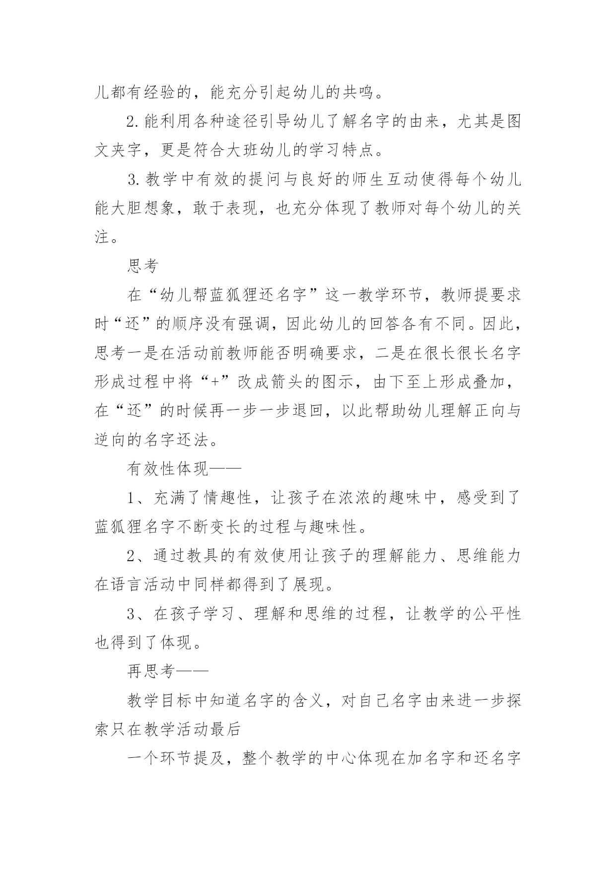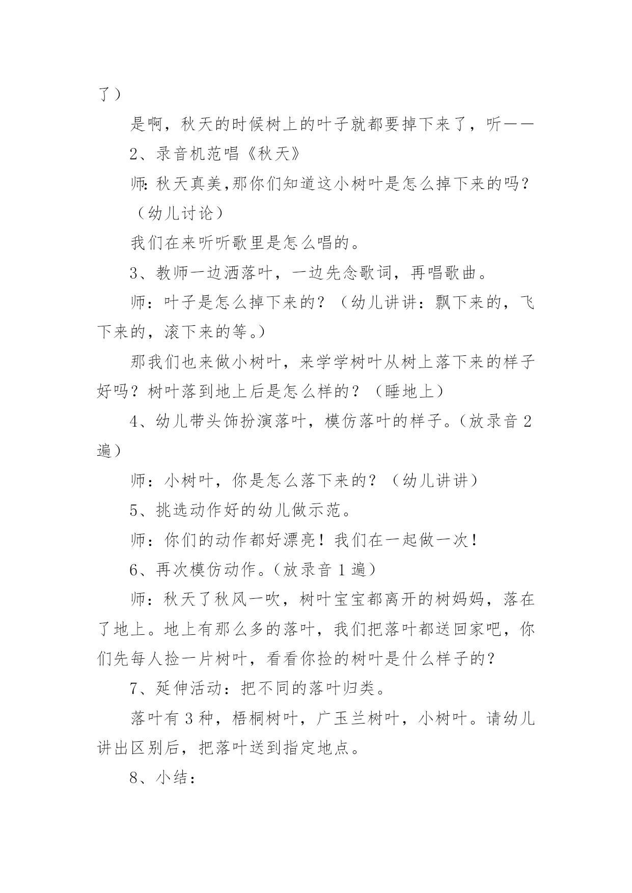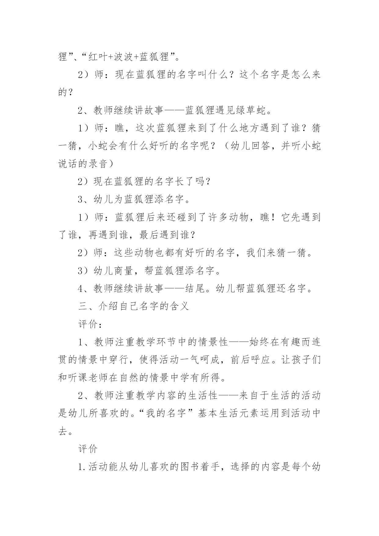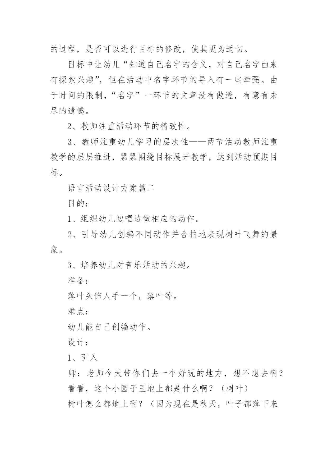 语言活动设计方案语言活动设计方案教师注重幼儿学习的层次性——两节活动教师注重教学的层层推进,紧紧围绕目标展开教学,达到活动预期目标。下面就是小编分享的关于语言活动设计方案,一起来看一下吧。语言活动设计方案篇一【活动目标】1、在听听、说说、猜猜中了解蓝狐狸长长名字的由来,感受故事的有趣。2、借助作品知道名字都有含义,并对名字的由来有进一步探索的兴趣。【活动准备】材料准备:PPT课件、动物的名字符号卡片。经验准备:幼儿已初步了解自己名字的由来。【活动过程】一、由蓝狐狸引出故事1)师:瞧!这是谁?这只狐狸长得很特别哦!2)小结:长着一身蓝蓝的毛就是这只狐狸特别的地方,所以狐狸妈妈给他取了一个好听的名字叫“蓝狐狸”。二、分段欣赏理解故事1、教师讲故事——蓝狐狸遇见波波蛙和红叶鼠。1)教师边讲故事边在操作板上出现符号“波波+蓝狐狸”、“红叶+波波+蓝狐狸”。2)师:现在蓝狐狸的名字叫什么?这个名字是怎么来的?2、教师继续讲故事——蓝狐狸遇见绿草蛇。1)师:瞧,这次蓝狐狸来到了什么地方遇到了谁?猜一猜,小蛇会有什么好听的名字呢?(幼儿回答,并听小蛇说话的录音)2)现在蓝狐狸的名字长了吗?3、幼儿为蓝狐狸添名字。1)师:蓝狐狸后来还碰到了许多动物,瞧!它先遇到了谁,再遇到谁,最后遇到谁?2)师:这些动物也都有好听的名字,我们来猜一猜。3)幼儿商量,帮蓝狐狸添名字。4、教师继续讲故事——结尾。幼儿帮蓝狐狸还名字。三、介绍自己名字的含义评价:1、教师注重教学环节中的情景性——始终在有趣而连贯的情景中穿行,使得活动一气呵成,前后呼应。让孩子们和听课老师在自然的情景中学有所得。2、教师注重教学内容的生活性——来自于生活的活动是幼儿所喜欢的。“我的名字”基本生活元素运用到活动中去。评价1.活动能从幼儿喜欢的图书着手,选择的内容是每个幼儿都有经验的,能充分引起幼儿的共鸣。2.能利用各种途径引导幼儿了解名字的由来,尤其是图文夹字,更是符合大班幼儿的学习特点。3.教学中有效的提问与良好的师生互动使得每个幼儿能大胆想象,敢于表现,也充分体现了教师对每个幼儿的关注。思考在“幼儿帮蓝狐狸还名字”这一教学环节,教师提要求时“还”的顺序没有强调,因此幼儿的回答各有不同。因此,思考一是在活动前教师能否明确要求,二是在很长很长名字形成过程中将“+”改成箭头的图示,由下至上形成叠加,在“还”的时候再一步一步退回,以此帮助幼儿理解正向与逆向的名字还法。有效性体现——1、充满了情趣性,让孩子在浓浓的趣味中,感受到了蓝狐狸名字不断变长的过程与趣味性。2、通过教具的有效使用让孩子的理解能力、思维能力在语言活动中同样都得到了展现。3、在孩子学习、理解和思维的过程,让教学的公平性也得到了体现。再思考——教学目标中知道名字的含义,对自己名字由来进一步探索只在教学活动最后一个环节提及,整个教学的中心体现在加名字和还名字的过程,是否可以进行目标的修改,使其更为适切。目标中让幼儿“知道自己名字的含义,对自己名字由来有探索兴趣”,但在活动中名字环节的导入有一些牵强。由于时间的限制,“名字”一环节的文章没有做透,有意有未尽的遗憾。2、教师注重活动环节的精致性。3、教师注重幼儿学习的层次性——两节活动教师注重教学的层层推进,紧紧围绕目标展开教学,达到活动预期目标。语言活动设计方案篇二目的:1、组织幼儿边唱边做相应的动作。2、引导幼儿创编不同动作并合拍地表现树叶飞舞的景象。3、培养幼儿对音乐活动的兴趣。准备:落叶头饰人手一个,落叶等。难点:幼儿能自己创编动作。设计:1、引入师:老师今天带你们去一个好玩的地方,想不想去啊?看看,这个小园子里地上都是什么啊?(树叶)树叶怎么都地上啊?(因为现在是秋天,叶子都落下来了)是啊,秋天的时候树上的叶子就都要掉下来了,听――2、录音机范唱《秋天》师:秋天真美,那你们知道这小树叶是怎么掉下来的吗?(幼儿讨论)我们在来听听歌里是怎么唱的。3、教师一边洒落叶,一边先念歌词,再唱歌曲。师:叶子是怎么掉下来的?(幼儿讲讲:飘下来的,飞下来的,滚下来的等。)那我们也来做小树叶,来学学树叶从树上落下来的样子好吗?树叶落到地上后是怎么样的?(睡地上)4、幼儿带头饰扮演落叶,模仿落叶的样子。(放录音2遍)师:小树叶,你是怎么落下来的?(幼儿讲讲)5、挑选动作好的幼儿做示范。师:你们的动作都好漂亮!我们在一起做一次!6、再次模仿动作。(放录音1遍)师:秋天了秋风一吹,树叶宝宝都离开的树妈妈,落在了地上。地上有那么多的落叶,我们把落叶都送回家吧,你们先每人捡一片树叶,看看你捡的树叶是什么样子的?7、延伸活动:把不同的落叶归类。落叶有3种,梧桐树叶,广玉兰树叶,小树叶。请幼儿讲出区别后,把落叶送到指定地点。8、小结:师:现在这个园子里,又干净,又整洁,小落叶都找到了新家,我们宝宝也回