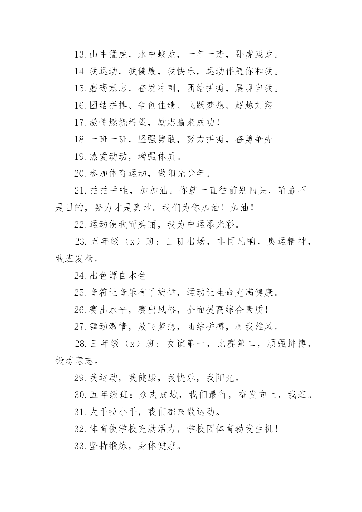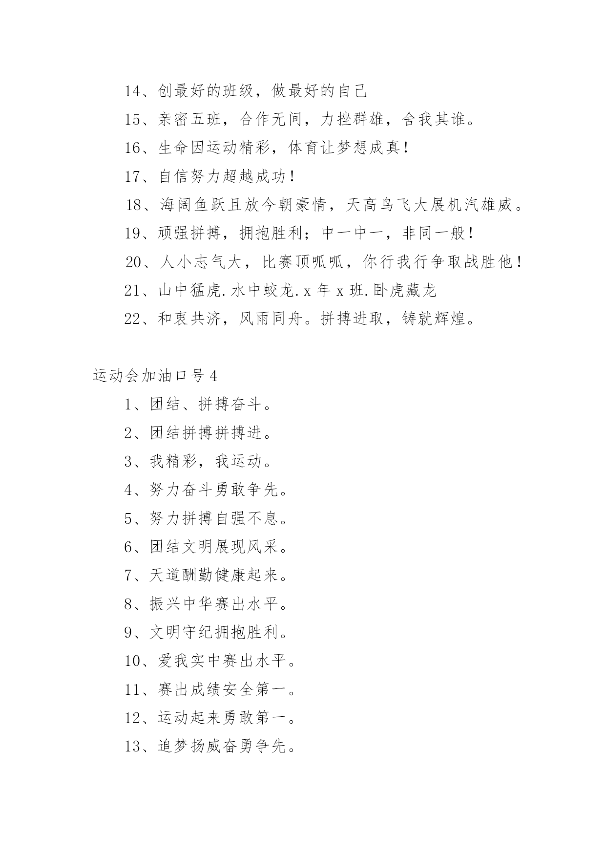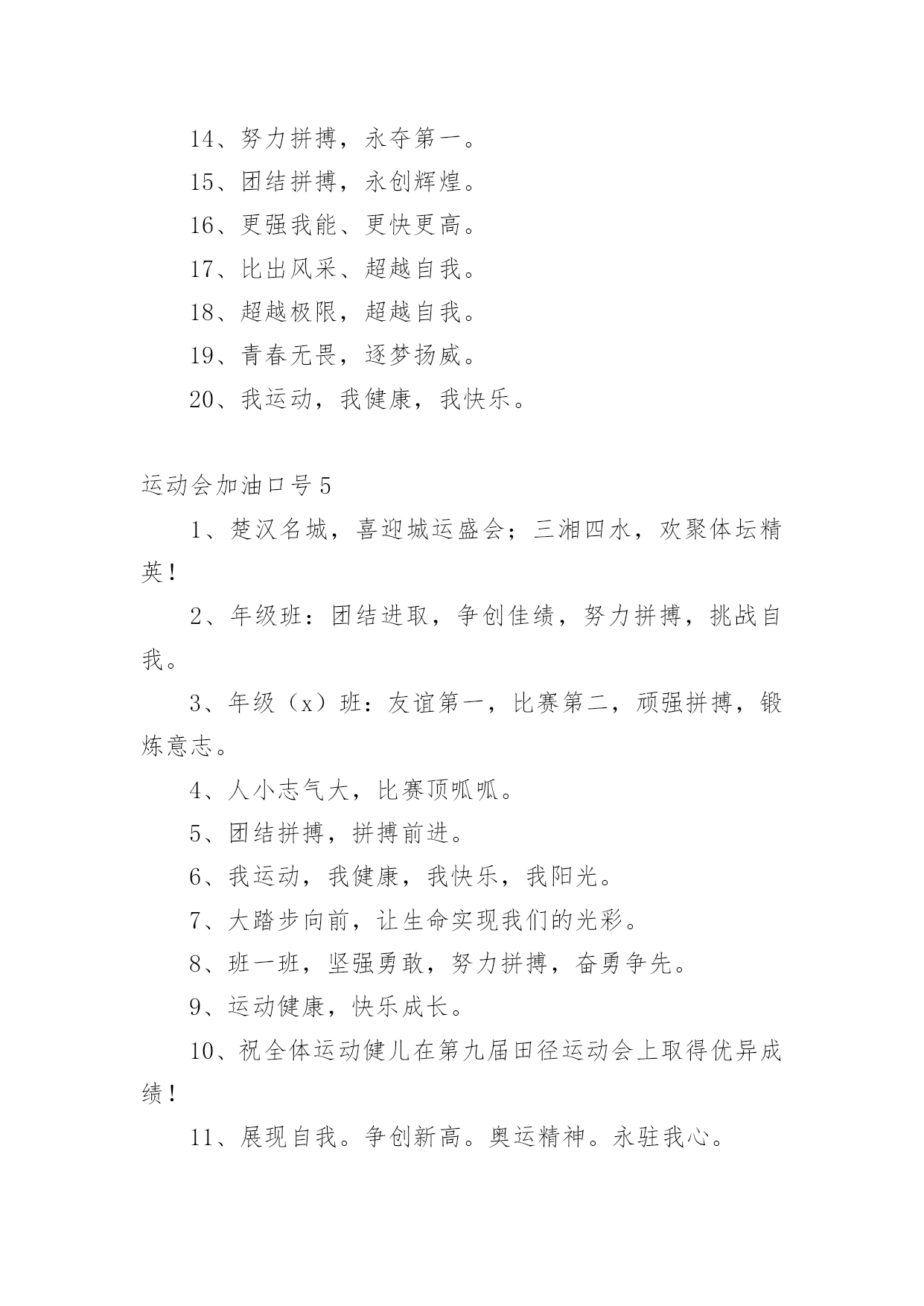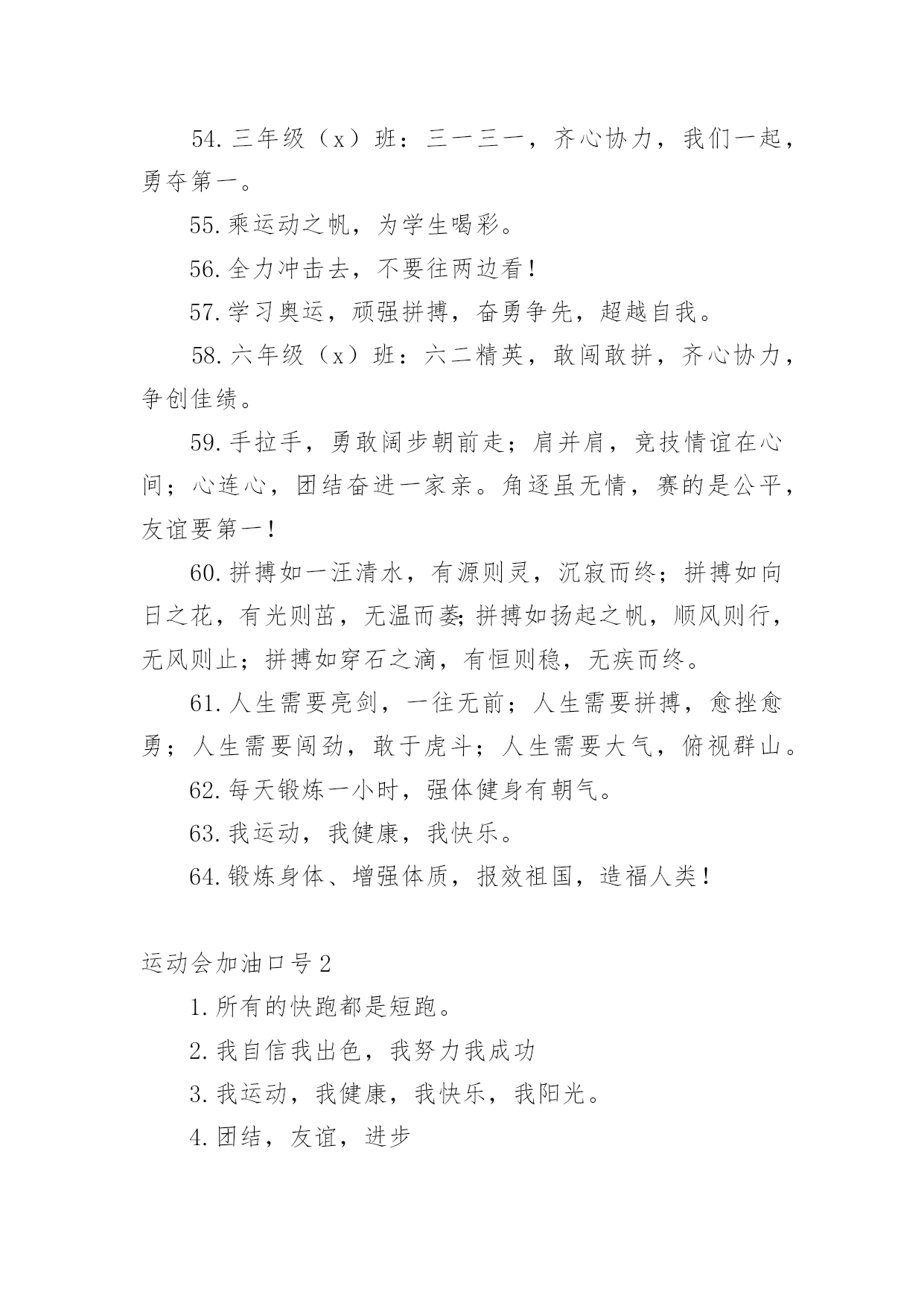 运动会加油口号运动会加油口号汇编15篇在平平淡淡的日常中,大家一定都接触过一些使用较为普遍的口号吧,口号具有非常明显的时代特征和行业特色。那什么样的口号才算得上是经典呢?以下是小编精心整理的运动会加油口号,欢迎大家借鉴与参考,希望对大家有所帮助。运动会加油口号11.爱我一班,立志成材,奋勇冲击,永争第一。2.让我们吹起希望的号角,鼓起生活的勇气,背起信念的行囊,踏上梦想的征程,到达成功的终点。3.努力拼搏,挑战自我。4.飞跃梦想,敢拼敢闯,乘风破浪,奋勇激昂。5.团结拼搏,拼搏前进。6.奋力拼搏,勇于攀登。7.强身健体、立志成材。8.奋勇拼搏,勇夺第一。9.科学锻炼,有益健康;快乐健身,精彩人生。10.热爱生命,珍视运动。11.发扬体育精神,提高师生素质!12.青春似火,激情无限13.山中猛虎,水中蛟龙,一年一班,卧虎藏龙。14.我运动,我健康,我快乐,运动伴随你和我。15.磨砺意志,奋发冲刺,团结拼搏,展现自我。16.团结拼搏、争创佳绩、飞跃梦想、超越刘翔17.激情燃烧希望,励志赢来成功!18.一班一班,坚强勇敢,努力拼搏,奋勇争先19.热爱动动,增强体质。20.参加体育运动,做阳光少年。21.拍拍手哇,加加油。你就一直往前别回头,输赢不是目的,努力才是真地。我们为你加油!加油!22.运动使我而美丽,我为中运添光彩。23.五年级(x)班:三班出场,非同凡响,奥运精神,我班发杨。24.出色源自本色25.音符让音乐有了旋律,运动让生命充满健康。26.赛出水平,赛出风格,全面提高综合素质!27.舞动激情,放飞梦想,团结拼搏,树我雄风。28.三年级(x)班:友谊第一,比赛第二,顽强拼搏,锻炼意志。29.我运动,我健康,我快乐,我阳光。30.五年级班:众志成城,我们最行,奋发向上,我班。31.大手拉小手,我们都来做运动。32.体育使学校充满活力,学校因体育勃发生机!33.坚持锻炼,身体健康。34.眼睛你要擦亮,记住我的摸样,运动场上我们最棒。35.扬帆起航,噼波斩浪,再创辉煌36.超越极限,展现自我。37.六年级班:顽强拼搏,超越自我,不鸣则已,一鸣惊人。38.自信努力超越成功!39.六年级(x)班:顽强拼搏,超越自我,不鸣则已,一鸣惊人。40.生命不息,运动不止。41.大班大班,属我最强。42.所有的快跑都是短跑。43.团结团结,奋进奋进,四(x)四(x),我们爱你。44.青春运动,友谊健康。45.顽强拼搏、勇夺第一、挑战自我、突破极限46.锻炼身体,报效祖国,奋力拼搏,超越自我,相信自己我能行。47.团结拼搏,争创伟绩。48.放心去飞,勇敢去追,追一切我们为完成的梦。49.五年级(x)班:燃烧激情,沸腾理想,超越自我,再创辉煌。50.团结,友谊,进步51.爸妈齐支援,看我争第一。52.亲子有方,运动有益,宝宝班最棒。53.天天健身,天天快乐。54.三年级(x)班:三一三一,齐心协力,我们一起,勇夺第一。55.乘运动之帆,为学生喝彩。56.全力冲击去,不要往两边看!57.学习奥运,顽强拼搏,奋勇争先,超越自我。58.六年级(x)班:六二精英,敢闯敢拼,齐心协力,争创佳绩。59.手拉手,勇敢阔步朝前走;肩并肩,竞技情谊在心间;心连心,团结奋进一家亲。角逐虽无情,赛的是公平,友谊要第一!60.拼搏如一汪清水,有源则灵,沉寂而终;拼搏如向日之花,有光则茁,无温而萎;拼搏如扬起之帆,顺风则行,无风则止;拼搏如穿石之滴,有恒则稳,无疾而终。61.人生需要亮剑,一往无前;人生需要拼搏,愈挫愈勇;人生需要闯劲,敢于虎斗;人生需要大气,俯视群山。62.每天锻炼一小时,强体健身有朝气。63.我运动,我健康,我快乐。64.锻炼身体、增强体质,报效祖国,造福人类!运动会加油口号21.所有的快跑都是短跑。2.我自信我出色,我努力我成功3.我运动,我健康,我快乐,我阳光。4.团结,友谊,进步5.热爱生命,珍视运动。6.三年级:花束队花海如潮,健儿拼搏,挥动激情,为你赞歌。7.百米冲刺如猛虎。8.魅力永久,充满自信,赢得胜利。9.相信自己战胜自己10.团结拼搏、争创佳绩、飞跃梦想、超越刘翔11.六年级(x)班:扬帆起航,劈波斩浪,扬我班风,再创辉煌。12.楚汉名城,喜迎城运盛会;三湘四水,欢聚体坛精英!13.团结团结,奋进奋进,四(x)四(x),我们爱你。14.顽强拼搏、勇夺第一、挑战自我、突破极限15.五年级(x)班:扬帆把舵,奋勇拼搏,看我一班,锐不可当。16.锻炼享健康,快乐伴人生。17.团结拼搏向上。18.秀出自信、展现自我、非比寻常、x班!19.奋力拼搏,勇于攀登。20.心系三班,合作无间,力斩群敌,舍我其谁。21.拼搏创造奇迹,奋斗书写辉煌22.舞动激情,放飞梦想,团结拼搏,树我雄风。23.九班九班,勇夺桂冠。24.四年级班:班班决不一般坚定豪