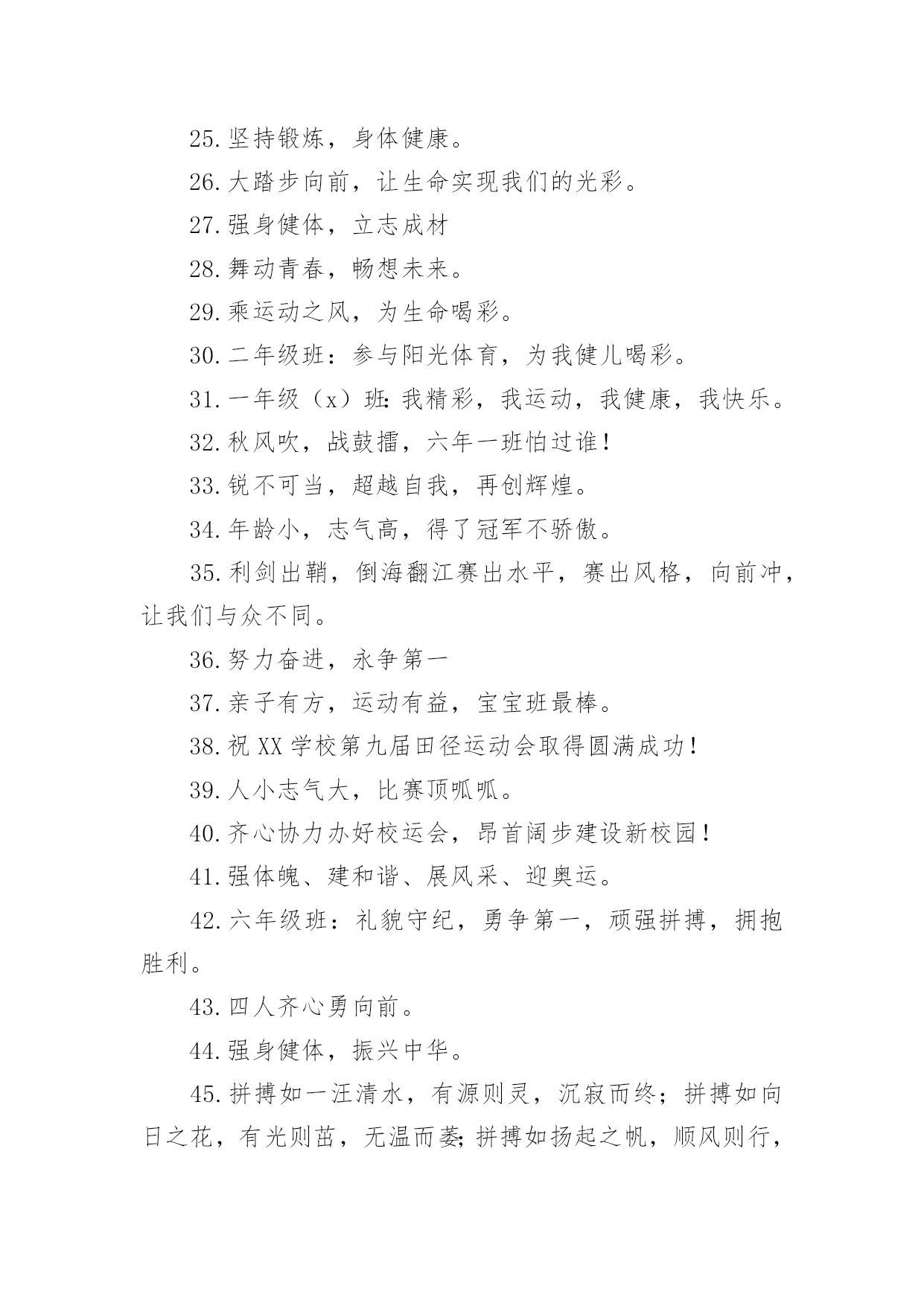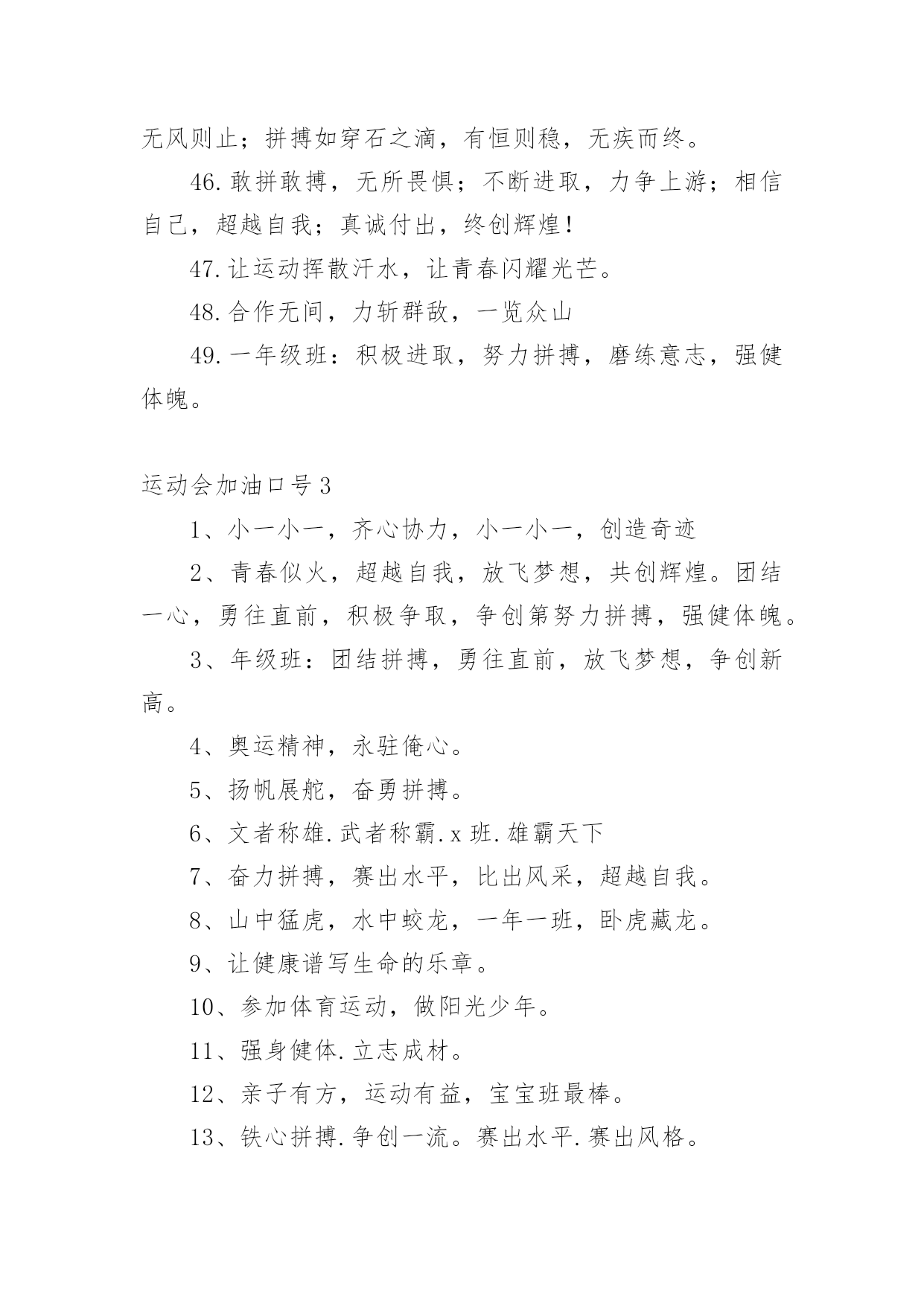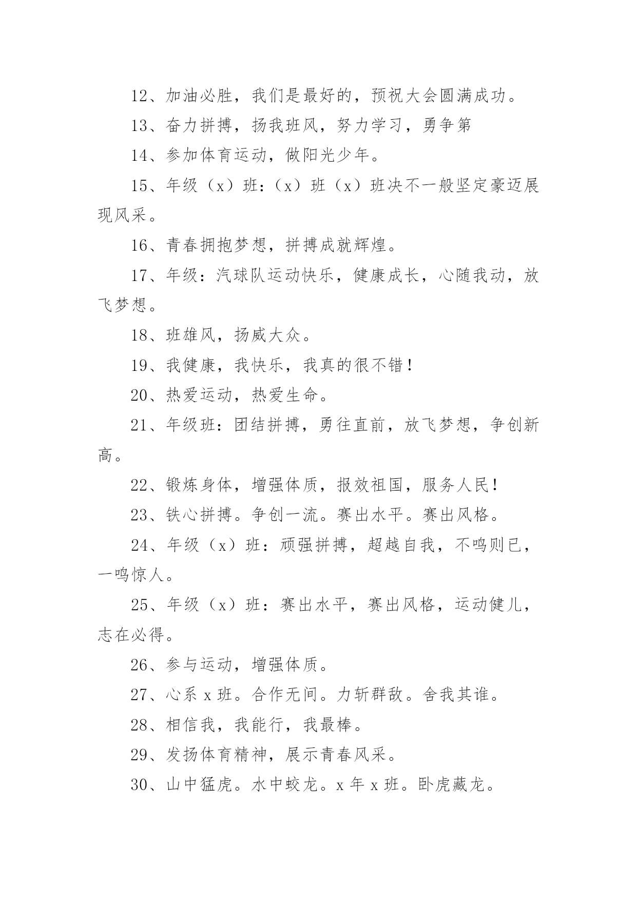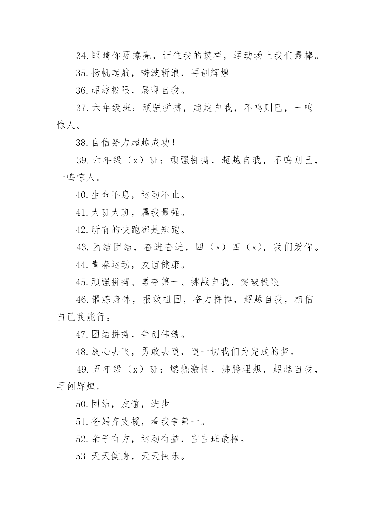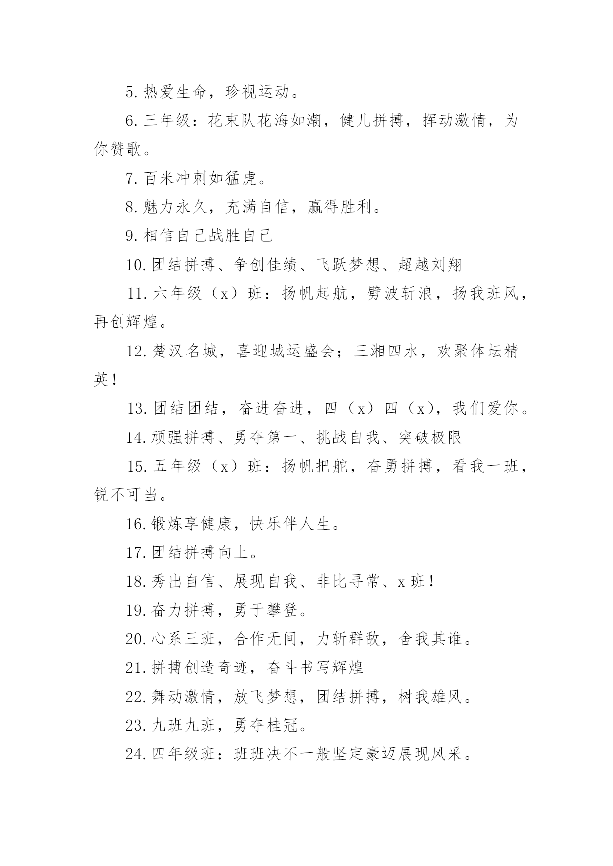 运动会加油口号运动会加油口号汇编15篇在平平淡淡的日常中,大家一定都接触过一些使用较为普遍的口号吧,口号具有非常明显的时代特征和行业特色。那什么样的口号才算得上是经典呢?以下是小编精心整理的运动会加油口号,欢迎大家借鉴与参考,希望对大家有所帮助。运动会加油口号11.爱我一班,立志成材,奋勇冲击,永争第一。2.让我们吹起希望的号角,鼓起生活的勇气,背起信念的行囊,踏上梦想的征程,到达成功的终点。3.努力拼搏,挑战自我。4.飞跃梦想,敢拼敢闯,乘风破浪,奋勇激昂。5.团结拼搏,拼搏前进。6.奋力拼搏,勇于攀登。7.强身健体、立志成材。8.奋勇拼搏,勇夺第一。9.科学锻炼,有益健康;快乐健身,精彩人生。10.热爱生命,珍视运动。11.发扬体育精神,提高师生素质!12.青春似火,激情无限13.山中猛虎,水中蛟龙,一年一班,卧虎藏龙。14.我运动,我健康,我快乐,运动伴随你和我。15.磨砺意志,奋发冲刺,团结拼搏,展现自我。16.团结拼搏、争创佳绩、飞跃梦想、超越刘翔17.激情燃烧希望,励志赢来成功!18.一班一班,坚强勇敢,努力拼搏,奋勇争先19.热爱动动,增强体质。20.参加体育运动,做阳光少年。21.拍拍手哇,加加油。你就一直往前别回头,输赢不是目的,努力才是真地。我们为你加油!加油!22.运动使我而美丽,我为中运添光彩。23.五年级(x)班:三班出场,非同凡响,奥运精神,我班发杨。24.出色源自本色25.音符让音乐有了旋律,运动让生命充满健康。26.赛出水平,赛出风格,全面提高综合素质!27.舞动激情,放飞梦想,团结拼搏,树我雄风。28.三年级(x)班:友谊第一,比赛第二,顽强拼搏,锻炼意志。29.我运动,我健康,我快乐,我阳光。30.五年级班:众志成城,我们最行,奋发向上,我班。31.大手拉小手,我们都来做运动。32.体育使学校充满活力,学校因体育勃发生机!33.坚持锻炼,身体健康。34.眼睛你要擦亮,记住我的摸样,运动场上我们最棒。35.扬帆起航,噼波斩浪,再创辉煌36.超越极限,展现自我。37.六年级班:顽强拼搏,超越自我,不鸣则已,一鸣惊人。38.自信努力超越成功!39.六年级(x)班:顽强拼搏,超越自我,不鸣则已,一鸣惊人。40.生命不息,运动不止。41.大班大班,属我最强。42.所有的快跑都是短跑。43.团结团结,奋进奋进,四(x)四(x),我们爱你。44.青春运动,友谊健康。45.顽强拼搏、勇夺第一、挑战自我、突破极限46.锻炼身体,报效祖国,奋力拼搏,超越自我,相信自己我能行。47.团结拼搏,争创伟绩。48.放心去飞,勇敢去追,追一切我们为完成的梦。49.五年级(x)班:燃烧激情,沸腾理想,超越自我,再创辉煌。50.团结,友谊,进步51.爸妈齐支援,看我争第一。52.亲子有方,运动有益,宝宝班最棒。53.天天健身,天天快乐。54.三年级(x)班:三一三一,齐心协力,我们一起,勇夺第一。55.乘运动之帆,为学生喝彩。56.全力冲击去,不要往两边看!57.学习奥运,顽强拼搏,奋勇争先,超越自我。58.六年级(x)班:六二精英,敢闯敢拼,齐心协力,争创佳绩。59.手拉手,勇敢阔步朝前走;肩并肩,竞技情谊在心间;心连心,团结奋进一家亲。角逐虽无情,赛的是公平,友谊要第一!60.拼搏如一汪清水,有源则灵,沉寂而终;拼搏如向日之花,有光则茁,无温而萎;拼搏如扬起之帆,顺风则行,无风则止;拼搏如穿石之滴,有恒则稳,无疾而终。61.人生需要亮剑,一往无前;人生需要拼搏,愈挫愈勇;人生需要闯劲,敢于虎斗;人生需要大气,俯视群山。62.每天锻炼一小时,强体健身有朝气。63.我运动,我健康,我快乐。64.锻炼身体、增强体质,报效祖国,造福人类!运动会加油口号21.所有的快跑都是短跑。2.我自信我出色,我努力我成功3.我运动,我健康,我快乐,我阳光。4.团结,友谊,进步5.热爱生命,珍视运动。6.三年级:花束队花海如潮,健儿拼搏,挥动激情,为你赞歌。7.百米冲刺如猛虎。8.魅力永久,充满自信,赢得胜利。9.相信自己战胜自己10.团结拼搏、争创佳绩、飞跃梦想、超越刘翔11.六年级(x)班:扬帆起航,劈波斩浪,扬我班风,再创辉煌。12.楚汉名城,喜迎城运盛会;三湘四水,欢聚体坛精英!13.团结团结,奋进奋进,四(x)四(x),我们爱你。14.顽强拼搏、勇夺第一、挑战自我、突破极限15.五年级(x)班:扬帆把舵,奋勇拼搏,看我一班,锐不可当。16.锻炼享健康,快乐伴人生。17.团结拼搏向上。18.秀出自信、展现自我、非比寻常、x班!19.奋力拼搏,勇于攀登。20.心系三班,合作无间,力斩群敌,舍我其谁。21.拼搏创造奇迹,奋斗书写辉煌22.舞动激情,放飞梦想,团结拼搏,树我雄风。23.九班九班,勇夺桂冠。24.四年级班:班班决不一般坚定豪