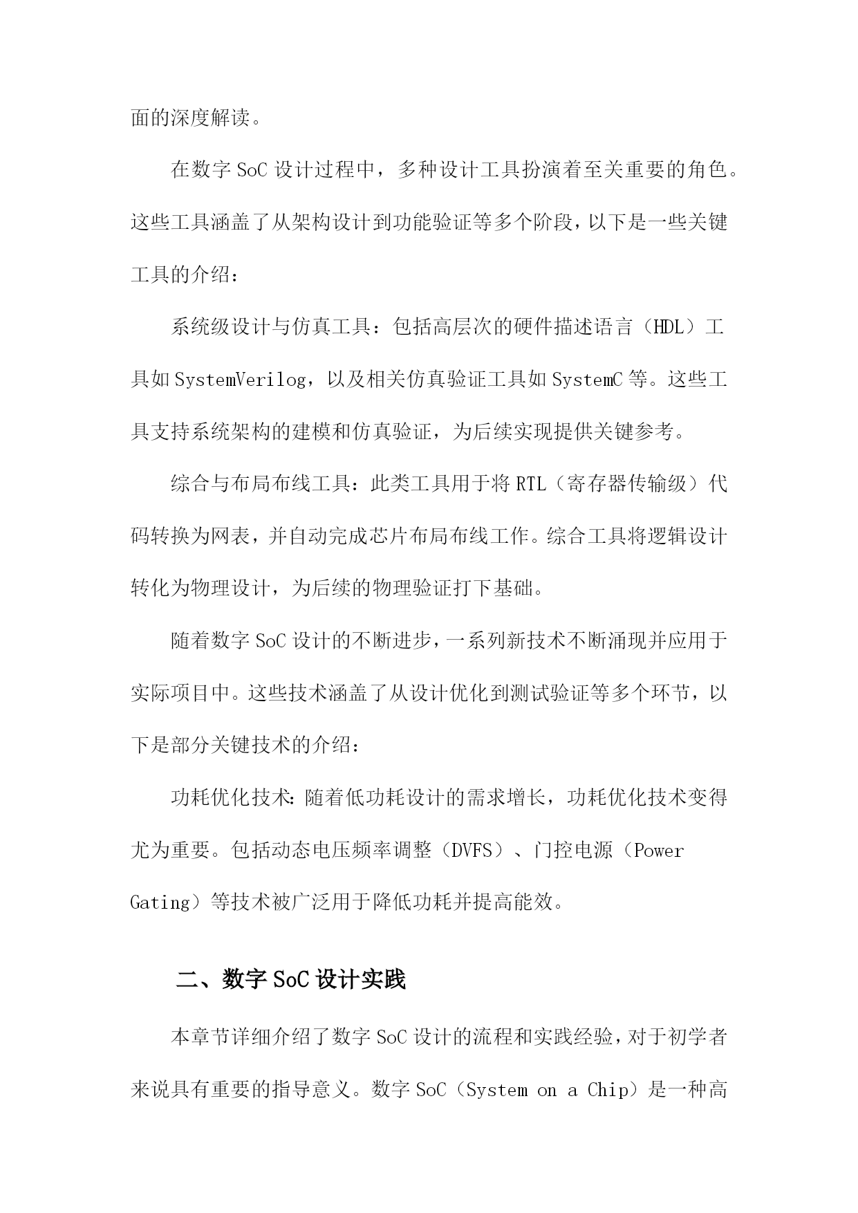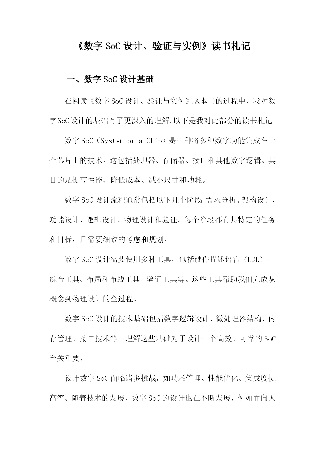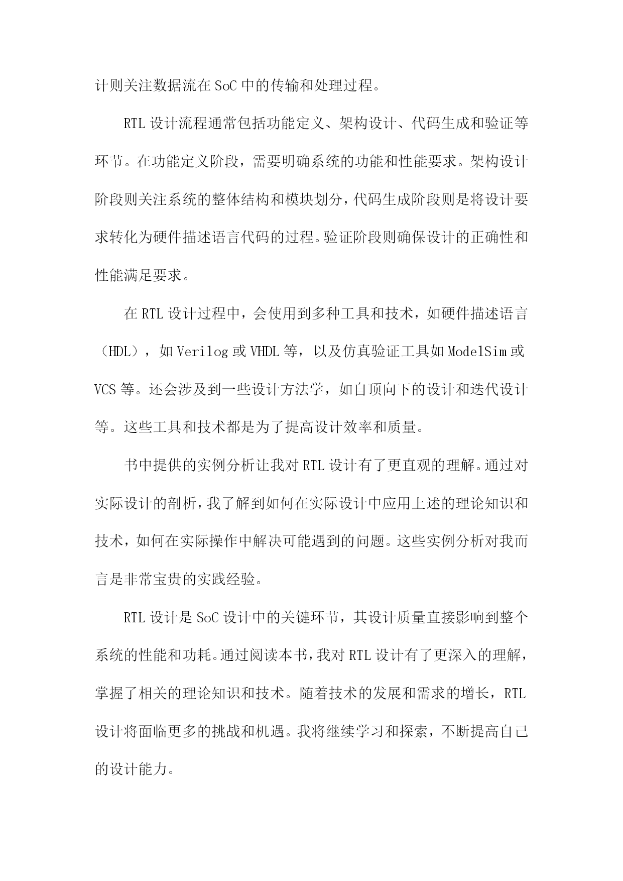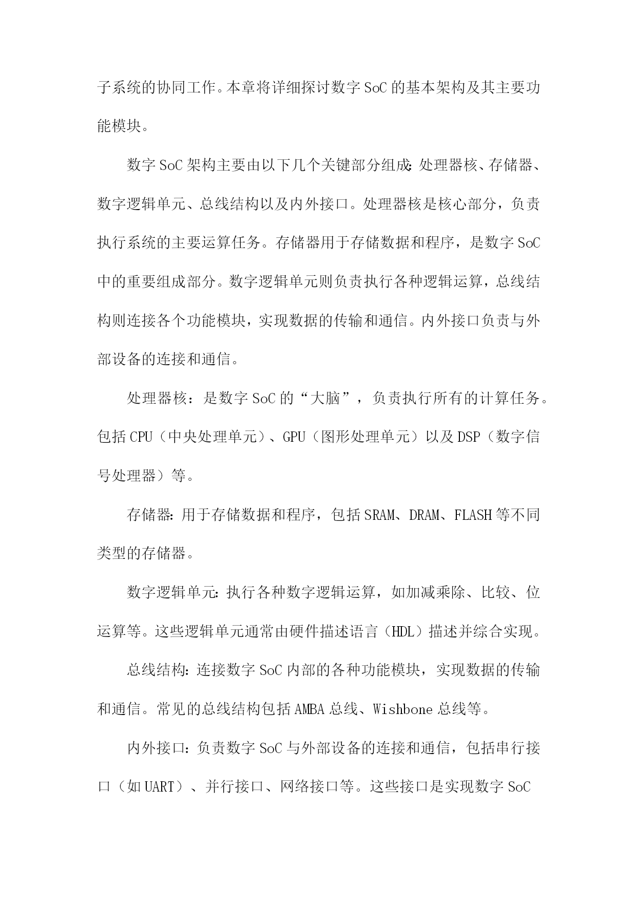 《数字SoC设计、验证与实例》读书札记一、数字SoC设计基础在阅读《数字SoC设计、验证与实例》这本书的过程中,我对数字SoC设计的基础有了更深入的理解。以下是我对此部分的读书札记。数字SoC(SystemonaChip)是一种将多种数字功能集成在一个芯片上的技术。这包括处理器、存储器、接口和其他数字逻辑。其目的是提高性能、降低成本、减小尺寸和功耗。数字SoC设计流程通常包括以下几个阶段:需求分析、架构设计、功能设计、逻辑设计、物理设计和验证。每个阶段都有其特定的任务和目标,且需要细致的考虑和规划。数字SoC设计需要使用多种工具,包括硬件描述语言(HDL)、综合工具、布局和布线工具、验证工具等。这些工具帮助我们完成从概念到物理设计的全过程。数字SoC设计的技术基础包括数字逻辑设计、微处理器结构、内存管理、接口技术等。理解这些基础对于设计一个高效、可靠的SoC至关重要。设计数字SoC面临诸多挑战,如功耗管理、性能优化、集成度提高等。随着技术的发展,数字SoC的设计也在不断发展,例如面向人工智能的SoC设计正变得越来越重要。书中通过一些实例介绍了数字SoC的设计过程,这些实例包括处理器设计、内存管理、接口设计等。这些实例使我更直观地理解了数字SoC设计的实际过程。数字SoC设计是一个复杂且需要多方面知识的领域。通过阅读这本书,我对数字SoC设计的基础有了更深入的理解,也对此领域的发展有了更清晰的认知。1.数字SoC概念及发展历程段落一:数字SoC概念。它涵盖了处理器、存储器、接口控制器和其他必要的硬件模块,以及嵌入式软件。数字SoC的出现极大地提高了系统的集成度,减小了系统的体积和功耗,并提高了系统的性能和可靠性。数字SoC广泛应用于无线通信、汽车电子、消费电子、医疗电子等领域。数字SoC的发展历程可以追溯到上世纪80年代初期,那时的集成电路设计和制造技术已经非常成熟。随着设计工具和技术的不断进步,尤其是嵌入式处理器的性能提升,使得在一个芯片上集成越来越多的功能模块成为可能。从早期的简单集成到现在的高度复杂的系统集成,数字SoC的发展经历了以下几个重要阶段:初始阶段:这个阶段主要是将微处理器和其他必要的控制逻辑集成在一个芯片上。此时的功能模块相对简单,主要用于特定的应用。功能模块集成阶段:在这个阶段,除了处理器外,更多的功能模块如存储器、接口控制器等也被集成到芯片上。这使得芯片的功能越来越强大,应用领域也越来越广泛。系统级集成阶段:在这个阶段,数字SoC开始实现系统级的高度集成。除了硬件模块外,嵌入式软件也开始集成到芯片上。为了满足复杂系统的需求,数字SoC开始采用多核处理器设计。异构集成阶段:随着技术的发展,数字SoC开始实现异构集成,即将不同类型的处理器和加速器集成在一起,以满足各种复杂应用的性能需求。随着智能制造、物联网等新兴技术的出现,数字SoC的发展也面临更多的挑战和机遇。数字SoC将继续朝着更高性能、更低功耗、更小体积的方向发展。随着新技术和新应用的出现,数字SoC的设计方法和工具也将不断更新和发展。学习和掌握数字SoC设计技术对于未来的工程师来说是非常重要的。2.数字SoC设计流程与方法数字SoC(SystemonaChip)设计是一种高度集成化的设计方法,它将各种不同的功能模块集成在一个芯片上,如处理器、存储器等。这种设计方法需要复杂的流程和技术来保证性能和功能的完整性。数字SoC设计的主要流程与方法可以大致分为以下几个阶段:需求分析与系统架构设计:这是设计的初始阶段,主要任务是明确产品的功能需求,确定系统的整体架构和各个模块的功能划分。这一阶段对整个设计的成败有着决定性的影响,设计阶段需要注意优化芯片性能与功耗的权衡。这一步主要关注的是软件层面的设计,例如使用高级语言描述算法和功能需求。这一阶段也涉及关键的技术选择和第三方IP(知识产权)的评估与选择。这一阶段的主要目标是确定设计的顶层架构和关键参数。硬件描述语言设计:这一阶段是对设计的硬件实现进行描述,使用硬件描述语言(HDL)如Verilog或VHDL来完成寄存器传输级(RTL)设计。在这个阶段需要保证设计具有足够的高层次抽象能力以适应快速变化的软件设计。设计阶段应注意信号完整性和时序问题,同时要评估物理设计中的可行性和可实现性。这个阶段需要对设计进行详细的仿真验证,以确保其功能和性能满足需求。在这个阶段也会进行功耗优化等设计工作。3.数字SoC架构与功能模块数字SoC(SystemonaChip)是现代电子技术中的核心组成部分,它将多种功能集成在一个芯片上,从而提高了系统的集成度和性能。数字SoC架构是设计这种复杂系统的基石,涉及多个功能模块和子系统的协同工作。本章将详细探讨数字SoC的基本架构及其主要功能模块。