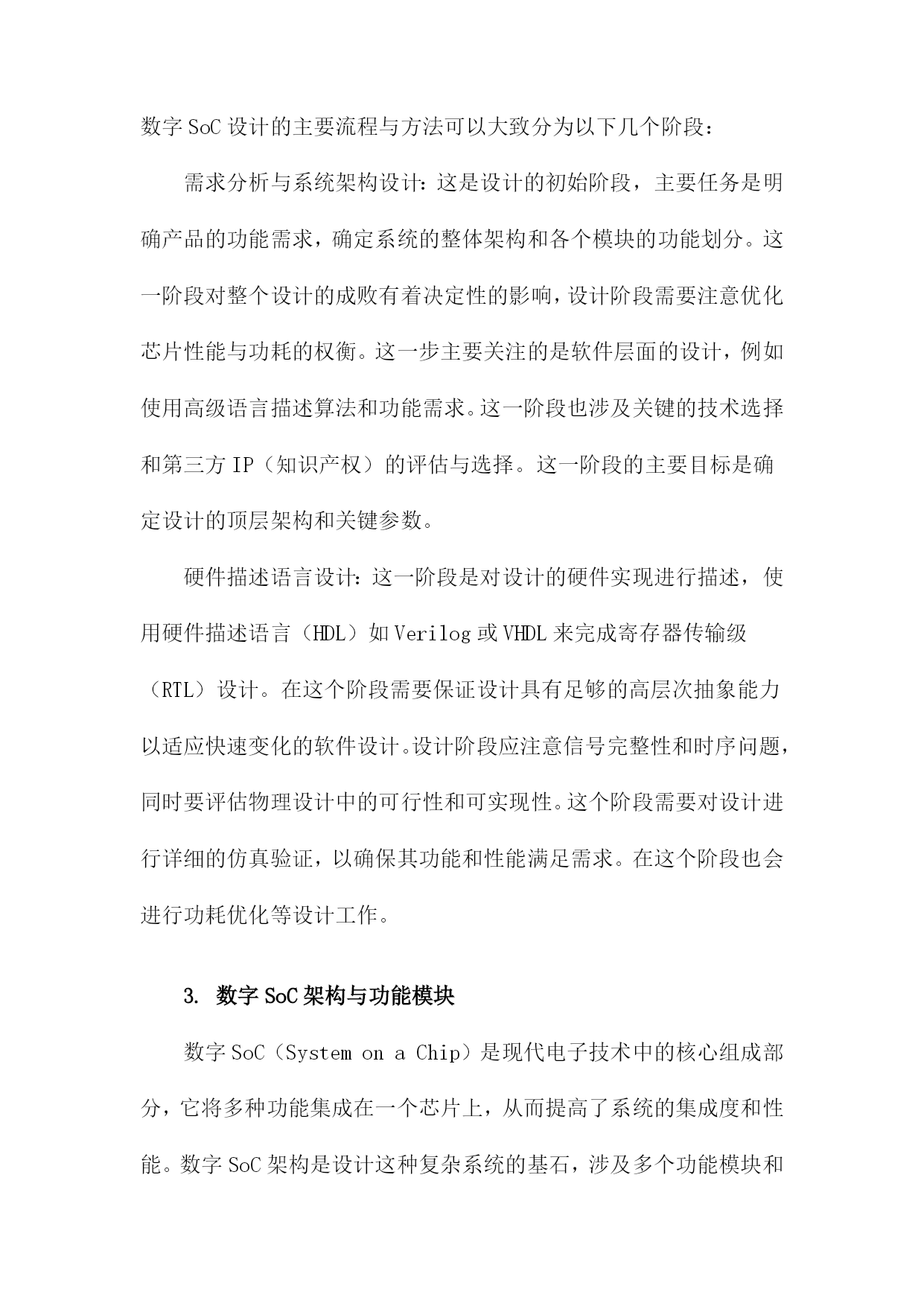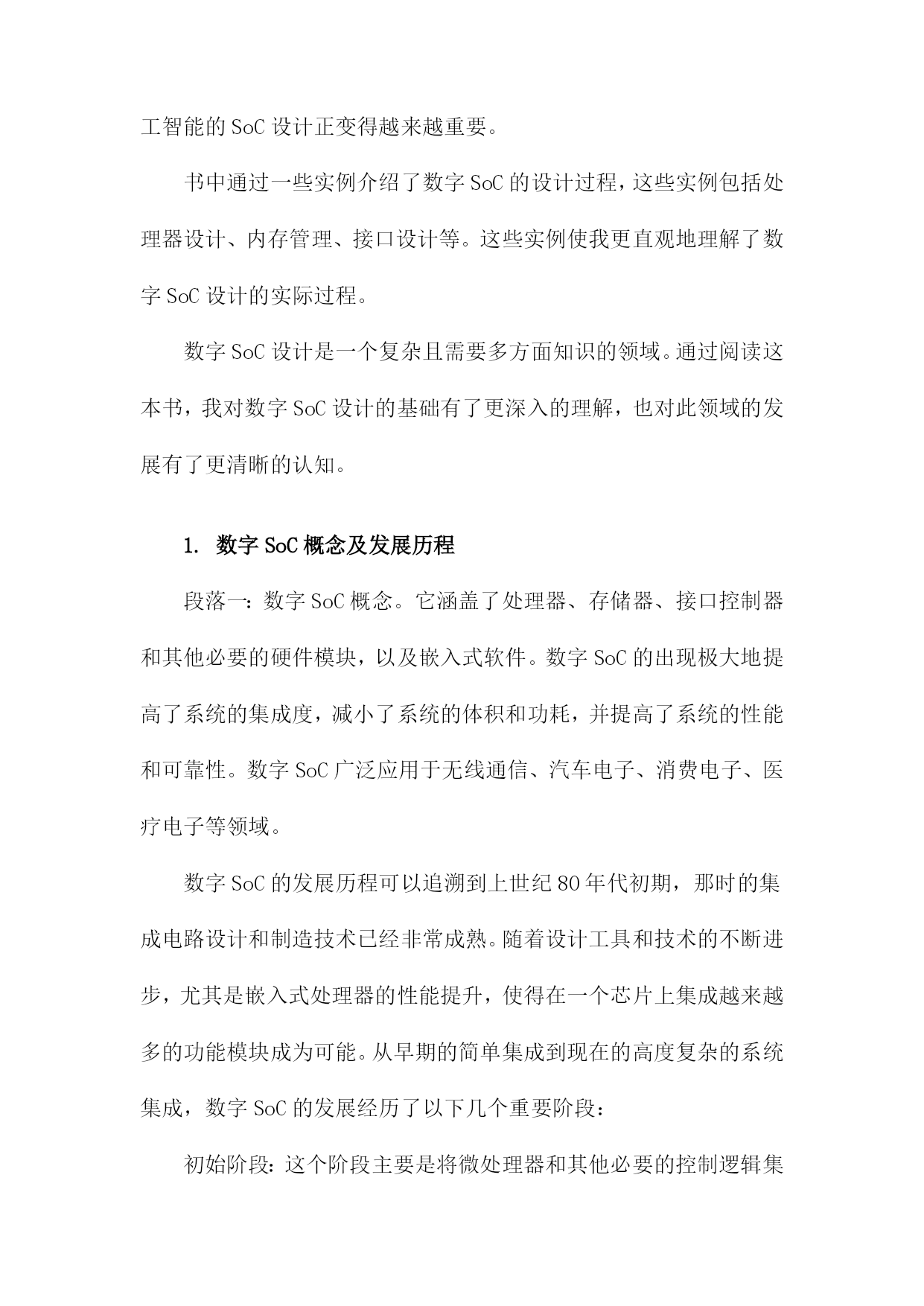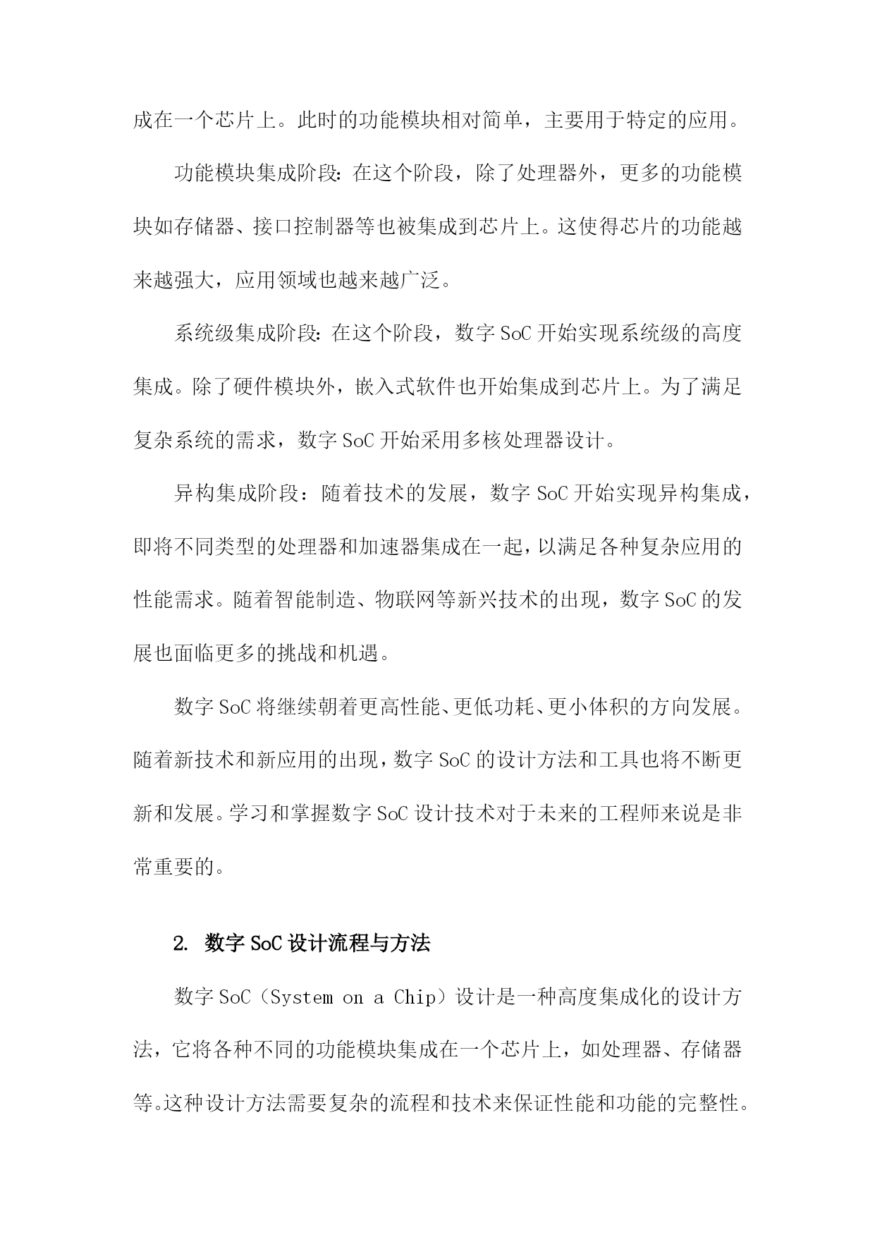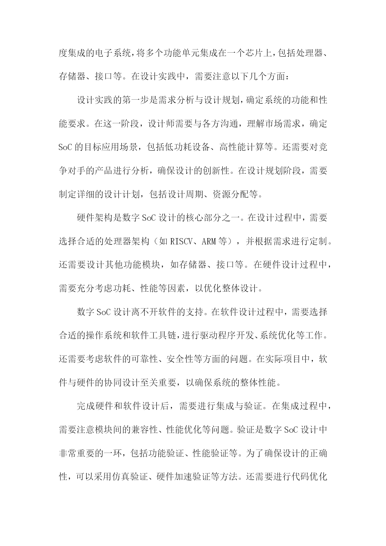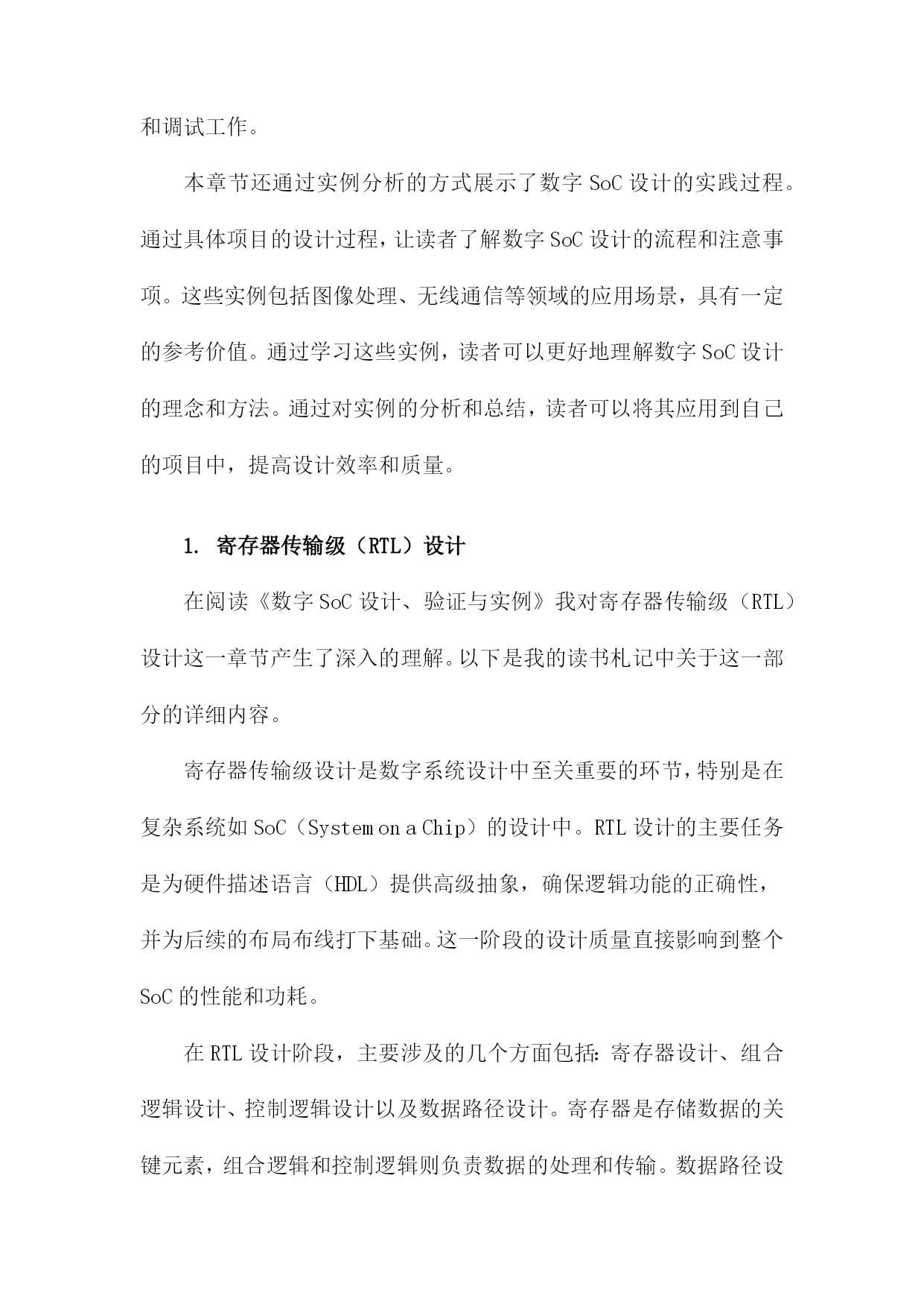 《数字SoC设计、验证与实例》读书札记一、数字SoC设计基础在阅读《数字SoC设计、验证与实例》这本书的过程中,我对数字SoC设计的基础有了更深入的理解。以下是我对此部分的读书札记。数字SoC(SystemonaChip)是一种将多种数字功能集成在一个芯片上的技术。这包括处理器、存储器、接口和其他数字逻辑。其目的是提高性能、降低成本、减小尺寸和功耗。数字SoC设计流程通常包括以下几个阶段:需求分析、架构设计、功能设计、逻辑设计、物理设计和验证。每个阶段都有其特定的任务和目标,且需要细致的考虑和规划。数字SoC设计需要使用多种工具,包括硬件描述语言(HDL)、综合工具、布局和布线工具、验证工具等。这些工具帮助我们完成从概念到物理设计的全过程。数字SoC设计的技术基础包括数字逻辑设计、微处理器结构、内存管理、接口技术等。理解这些基础对于设计一个高效、可靠的SoC至关重要。设计数字SoC面临诸多挑战,如功耗管理、性能优化、集成度提高等。随着技术的发展,数字SoC的设计也在不断发展,例如面向人工智能的SoC设计正变得越来越重要。书中通过一些实例介绍了数字SoC的设计过程,这些实例包括处理器设计、内存管理、接口设计等。这些实例使我更直观地理解了数字SoC设计的实际过程。数字SoC设计是一个复杂且需要多方面知识的领域。通过阅读这本书,我对数字SoC设计的基础有了更深入的理解,也对此领域的发展有了更清晰的认知。1.数字SoC概念及发展历程段落一:数字SoC概念。它涵盖了处理器、存储器、接口控制器和其他必要的硬件模块,以及嵌入式软件。数字SoC的出现极大地提高了系统的集成度,减小了系统的体积和功耗,并提高了系统的性能和可靠性。数字SoC广泛应用于无线通信、汽车电子、消费电子、医疗电子等领域。数字SoC的发展历程可以追溯到上世纪80年代初期,那时的集成电路设计和制造技术已经非常成熟。随着设计工具和技术的不断进步,尤其是嵌入式处理器的性能提升,使得在一个芯片上集成越来越多的功能模块成为可能。从早期的简单集成到现在的高度复杂的系统集成,数字SoC的发展经历了以下几个重要阶段:初始阶段:这个阶段主要是将微处理器和其他必要的控制逻辑集成在一个芯片上。此时的功能模块相对简单,主要用于特定的应用。功能模块集成阶段:在这个阶段,除了处理器外,更多的功能模块如存储器、接口控制器等也被集成到芯片上。这使得芯片的功能越来越强大,应用领域也越来越广泛。系统级集成阶段:在这个阶段,数字SoC开始实现系统级的高度集成。除了硬件模块外,嵌入式软件也开始集成到芯片上。为了满足复杂系统的需求,数字SoC开始采用多核处理器设计。异构集成阶段:随着技术的发展,数字SoC开始实现异构集成,即将不同类型的处理器和加速器集成在一起,以满足各种复杂应用的性能需求。随着智能制造、物联网等新兴技术的出现,数字SoC的发展也面临更多的挑战和机遇。数字SoC将继续朝着更高性能、更低功耗、更小体积的方向发展。随着新技术和新应用的出现,数字SoC的设计方法和工具也将不断更新和发展。学习和掌握数字SoC设计技术对于未来的工程师来说是非常重要的。2.数字SoC设计流程与方法数字SoC(SystemonaChip)设计是一种高度集成化的设计方法,它将各种不同的功能模块集成在一个芯片上,如处理器、存储器等。这种设计方法需要复杂的流程和技术来保证性能和功能的完整性。数字SoC设计的主要流程与方法可以大致分为以下几个阶段:需求分析与系统架构设计:这是设计的初始阶段,主要任务是明确产品的功能需求,确定系统的整体架构和各个模块的功能划分。这一阶段对整个设计的成败有着决定性的影响,设计阶段需要注意优化芯片性能与功耗的权衡。这一步主要关注的是软件层面的设计,例如使用高级语言描述算法和功能需求。这一阶段也涉及关键的技术选择和第三方IP(知识产权)的评估与选择。这一阶段的主要目标是确定设计的顶层架构和关键参数。硬件描述语言设计:这一阶段是对设计的硬件实现进行描述,使用硬件描述语言(HDL)如Verilog或VHDL来完成寄存器传输级(RTL)设计。在这个阶段需要保证设计具有足够的高层次抽象能力以适应快速变化的软件设计。设计阶段应注意信号完整性和时序问题,同时要评估物理设计中的可行性和可实现性。这个阶段需要对设计进行详细的仿真验证,以确保其功能和性能满足需求。在这个阶段也会进行功耗优化等设计工作。3.数字SoC架构与功能模块数字SoC(SystemonaChip)是现代电子技术中的核心组成部分,它将多种功能集成在一个芯片上,从而提高了系统的集成度和性能。数字SoC架构是设计这种复杂系统的基石,涉及多个功能模块和子系统的协同工作。本章将详细探讨数字SoC的基本架构及其主要功能模块。