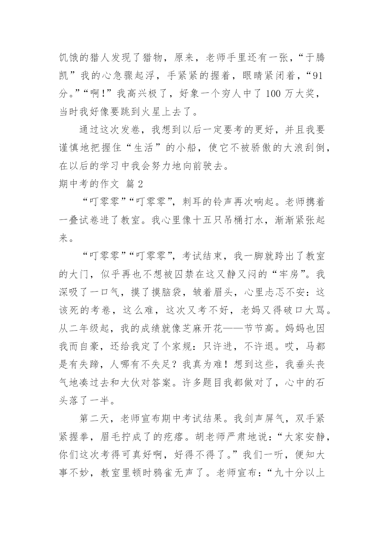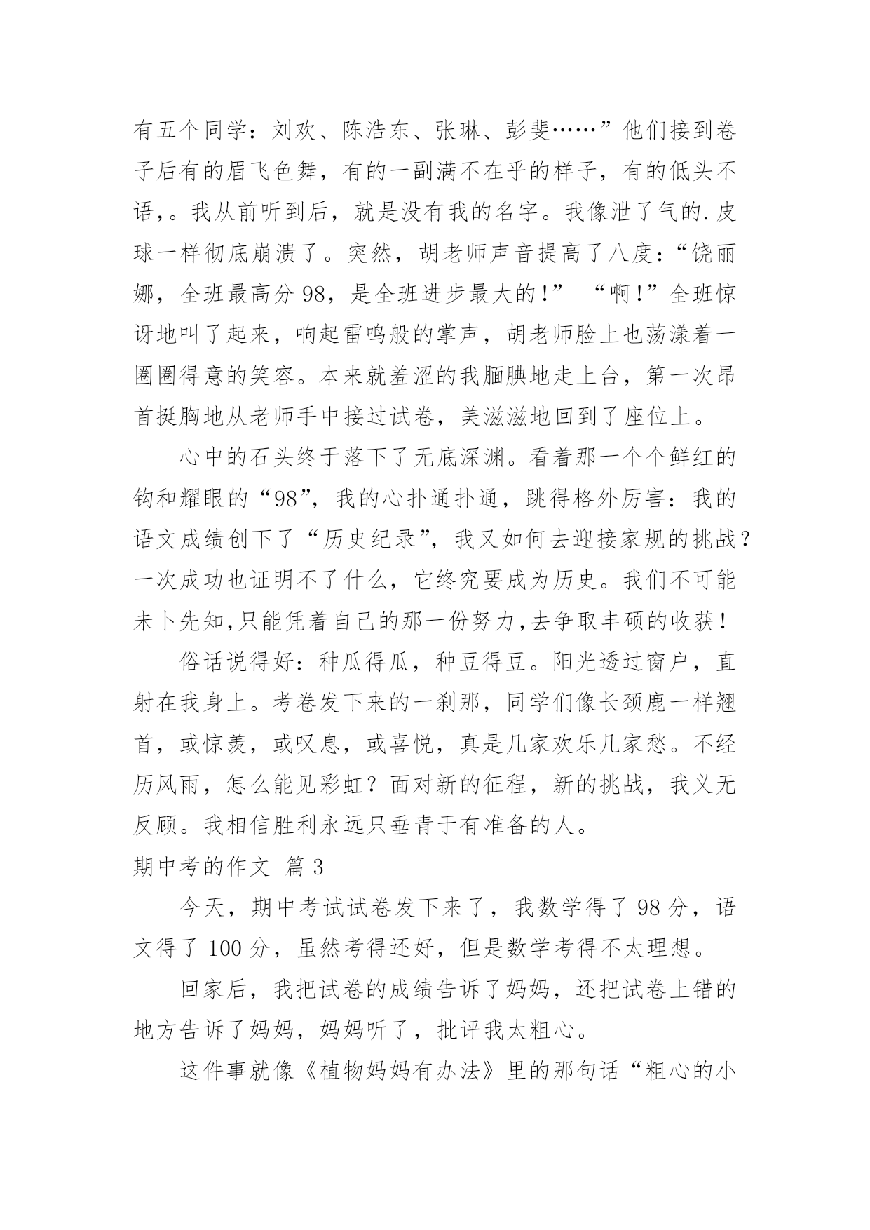 期中考的作文【推荐】期中考的作文三篇在我们平凡的日常里,大家对作文都再熟悉不过了吧,作文是一种言语活动,具有高度的综合性和创造性。写起作文来就毫无头绪?以下是小编为大家收集的期中考的作文3篇,仅供参考,大家一起来看看吧。期中考的作文篇1前不久,刚刚考完期中试,我的心忐忑不安,因为数学有一道题忘了约分,语文也有许多拿不准的题,所以我才会提心吊胆。不久成绩便下来了,开始发的是语文,语文老师神情严肃地走进班级,所有人在一瞬间好像被冰冻了一样,一动也不动了,一言也不发了,这一回老师采用分类念分法,刚开始我的心不停地跳着,当老师念完了80分以下的时候,我的心慢慢的平静了下来,幸好没有我,接着老师又开始念90分以下的,我的心快跳到嗓子眼了,耳朵竖得象小白兔一样,目不转睛地盯着老师,当老师念完90分以下时,我有点沾沾自喜,心想,这回语文可算考到了90分以上,老师开始念了,王冠博越92分,赵鑫姝96分,……“疑”奇怪,怎么没有我?难道老师忘念我的了……唉,这个不幸的孩子!我暗暗想到,眼里透出极大的悲伤。向四周探望有的在细细品味卷子,有的在为考的不好而发愁,突然我睛睛一亮,有点“山重水复疑无路,柳暗花明又一春”的感觉,又有点像饥饿的猎人发现了猎物,原来,老师手里还有一张,“于腾凯”我的心急骤起浮,手紧紧的握着,眼睛紧闭着,“91分。”“啊!”我高兴极了,好象一个穷人中了100万大奖,当时我好像要跳到火星上去了。通过这次发卷,我想到以后一定要考的更好,并且我要谨慎地把握住“生活”的小船,使它不被骄傲的大浪刮倒,在以后的学习中我会努力地向前驶去。期中考的作文篇2“叮零零”“叮零零”,刺耳的铃声再次响起。老师携着一叠试卷进了教室。我心里像十五只吊桶打水,渐渐紧张起来。“叮零零”“叮零零”,考试结束,我一脚就跨出了教室的大门,似乎再也不想被囚禁在这又静又闷的“牢房”。我深吸了一口气,摸了摸脑袋,皱着眉头,心里忐忑不安:这该死的考卷,这么难,这次又考不好,老妈又得破口大骂。从二年级起,我的成绩就像芝麻开花——节节高。妈妈也因我而自豪,还给我定了个家规:只许进,不许退。哎,马都是有失蹄,人哪有不失足?我真为难!想到这些,我垂头丧气地凑过去和大伙对答案。许多题目我都做对了,心中的石头落了一半。第二天,老师宣布期中考试结果。我剑声屏气,双手紧紧握拳,眉毛拧成了的疙瘩。胡老师严肃地说:“大家安静,你们这次考得可真好啊,好得不得了。”我们一听,便知大事不妙,教室里顿时鸦雀无声了。老师宣布:“九十分以上有五个同学:刘欢、陈浩东、张琳、彭斐……”他们接到卷子后有的眉飞色舞,有的一副满不在乎的样子,有的低头不语,。我从前听到后,就是没有我的名字。我像泄了气的.皮球一样彻底崩溃了。突然,胡老师声音提高了八度:“饶丽娜,全班最高分98,是全班进步最大的!”“啊!”全班惊讶地叫了起来,响起雷鸣般的掌声,胡老师脸上也荡漾着一圈圈得意的笑容。本来就羞涩的我腼腆地走上台,第一次昂首挺胸地从老师手中接过试卷,美滋滋地回到了座位上。心中的石头终于落下了无底深渊。看着那一个个鲜红的钩和耀眼的“98”,我的心扑通扑通,跳得格外厉害:我的语文成绩创下了“历史纪录”,我又如何去迎接家规的挑战?一次成功也证明不了什么,它终究要成为历史。我们不可能未卜先知,只能凭着自己的那一份努力,去争取丰硕的收获!俗话说得好:种瓜得瓜,种豆得豆。阳光透过窗户,直射在我身上。考卷发下来的一刹那,同学们像长颈鹿一样翘首,或惊羡,或叹息,或喜悦,真是几家欢乐几家愁。不经历风雨,怎么能见彩虹?面对新的征程,新的挑战,我义无反顾。我相信胜利永远只垂青于有准备的人。期中考的作文篇3今天,期中考试试卷发下来了,我数学得了98分,语文得了100分,虽然考得还好,但是数学考得不太理想。回家后,我把试卷的成绩告诉了妈妈,还把试卷上错的地方告诉了妈妈,妈妈听了,批评我太粗心。这件事就像《植物妈妈有办法》里的那句话“粗心的小朋友却得不到它。”一样,我就是粗心了,要不然期中考试就能得双百。