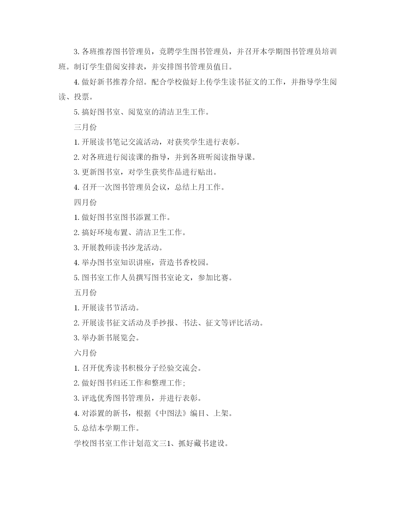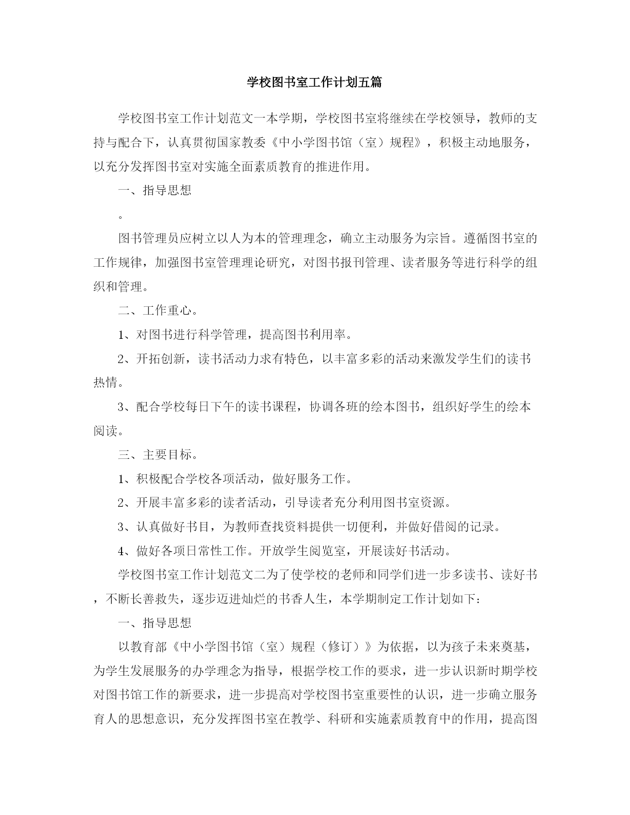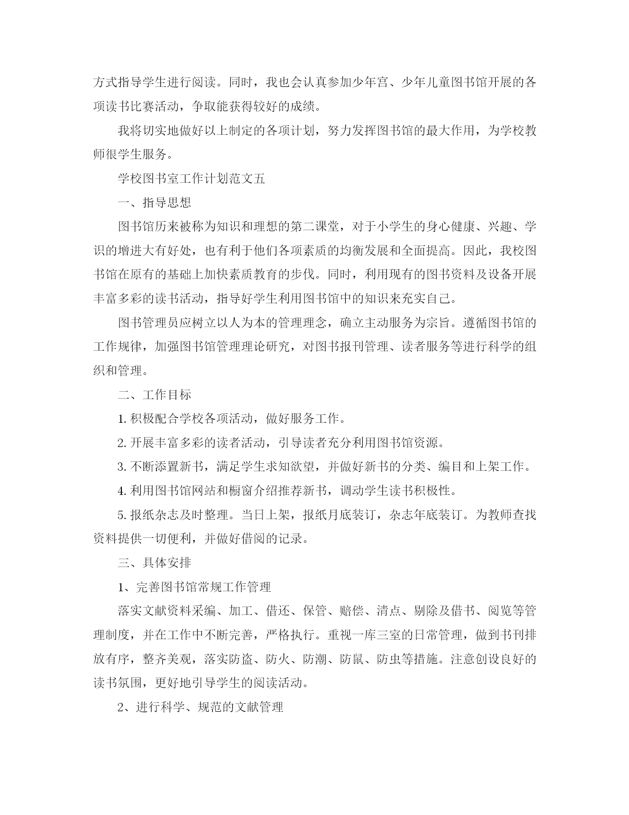 学校图书室工作计划模板(完整版)文档资料可直接使用,可编辑,欢迎下载学校图书室工作计划五篇学校图书室工作计划范文一本学期,学校图书室将继续在学校领导,教师的支持与配合下,认真贯彻国家教委《中小学图书馆(室)规程》,积极主动地服务,以充分发挥图书室对实施全面素质教育的推进作用。一、指导思想。图书管理员应树立以人为本的管理理念,确立主动服务为宗旨。遵循图书室的工作规律,加强图书室管理理论研究,对图书报刊管理、读者服务等进行科学的组织和管理。二、工作重心。1、对图书进行科学管理,提高图书利用率。2、开拓创新,读书活动力求有特色,以丰富多彩的活动来激发学生们的读书热情。3、配合学校每日下午的读书课程,协调各班的绘本图书,组织好学生的绘本阅读。三、主要目标。1、积极配合学校各项活动,做好服务工作。2、开展丰富多彩的读者活动,引导读者充分利用图书室资源。3、认真做好书目,为教师查找资料提供一切便利,并做好借阅的记录。4、做好各项日常性工作。开放学生阅览室,开展读好书活动。学校图书室工作计划范文二为了使学校的老师和同学们进一步多读书、读好书,不断长善救失,逐步迈进灿烂的书香人生,本学期制定工作计划如下:一、指导思想以教育部《中小学图书馆(室)规程(修订)》为依据,以为孩子未来奠基,为学生发展服务的办学理念为指导,根据学校工作的要求,进一步认识新时期学校对图书馆工作的新要求,进一步提高对学校图书室重要性的认识,进一步确立服务育人的思想意识,充分发挥图书室在教学、科研和实施素质教育中的作用,提高图书资源的使用价值,以学生快乐成长为宗旨,树立为师生服务的意识,全面开展师生的读书、阅览活动,形成书香校园的读书氛围,从而提高学生的识别能力、活动能力和写作能力,以知识守护生命,使图书馆的管理工作进一步科学化、规范化。本学期,图书室将紧紧围绕学校工作计划,不断提高图书室的育人功能。二、工作目标1、添购新书,调整藏书结构,使藏书在品种和数量上日趋合理。2、通过宣传橱窗、讲座及丰富多彩的读书活动,更好地创设浓郁的读书氛围,促使老师、同学,甚至家长形成多读书、读好书、爱护书、多藏书的意识和习惯。3、改进图书室开放和借阅制度,进一步提高图书的利用率,充分发挥图书室的教辅功能和服务效能。三、工作措施1、调整藏书结构,争取为我们的教师和学生在学习每一门课程时,提供详细的参考书目。只有尊重并满足学生学习的需求,图书室为学生的学习服务的效能才能真正地发挥出来。首先,从采购图书起,就要围绕对学生进行思想政治教育及学校教学的需要。学生图书应着重于能丰富课余生活、拓展学科知识、普及美育和德育方面的图书。教师用书方面,首先就增加新的教育思想、教育心理方面的图书;其次是配合学校有关活动,熟悉各学科教学发展和变化,结合书刊发行选择新书,使之既与学校教育教学内容相衔接,又是它们内容的延伸和辐射,然后是教师进行继续教育深造的学科专著。学校的教育对象是学生,人数最多的读者也是学生,所以购书要坚持学生为主、师生兼顾的原则,使学校图书室的藏书在品种和数量上日趋合理。2、全开架的借阅方式。图书室的借阅方式越方便,读者越多,图书和图书室发挥的作用也就越大。我校图书馆开架借阅,让室藏图书直接与学生见面。做到借阅合一,即在图书室里布置书库区和阅览区。在这个空间里,可以借书,可以在馆内阅读,这样就方便了学生,提高了馆藏文献的利用率,真正体现了以读者为本,以学生为本的办馆思想。3、制度化的学生管理员队伍。学校图书管理员除了图书的采编上架,还要对近二百多位师生借阅,如果没有一支学生图书管理员队伍当助手,单凭一个专职人员,对学生大流量借阅的开放是不能持之以恒的。学校对一部分学生经过选拔、培训,形成一支相对固定的学生管理员队伍,建立一定的学生管理员的制度,在这些小管理员的协助下,更好地发挥学校图书馆的作用。4、形式多样的图书宣传工作。以黑板报、橱窗的形式向师生进行图书宣传和推荐图书。并组织专题讲座、讨论会、故事会、演讲比赛和征文活动。在开展这些活动前,图书室先做好资料配备,活动中配合做好组织宣传工作,事后尽量整理成室藏文献及学生征文精品集,或横向交流,或投诸报刊。5、掌握读者心理,提供优质服务。小学生年龄一般是从七岁到十二岁,正由形象思维阶段逐步向形象思维与抽象思维并存的阶段发展。这个年龄段的男生往往爱看历史、军事、科技、科幻科普读书及故事书。女生爱看童话、散文、民间故事、儿童小说、中短篇小说。(当然,这范围也不是孤立的,有时也相互渗透。)孩子们不满足于课堂上所学知识,需要到图书馆寻找自己喜爱的图书。怎样让孩子们选择适合的图书,就需要管理员的指导与教育。管理员必须扮演好教育工作者、忠厚长者、知心朋友、公仆的角色。此外,我们的老师担负着比较繁重的教学