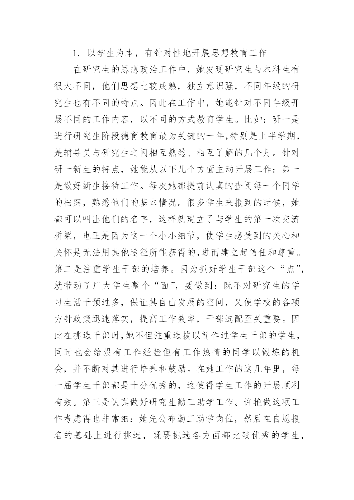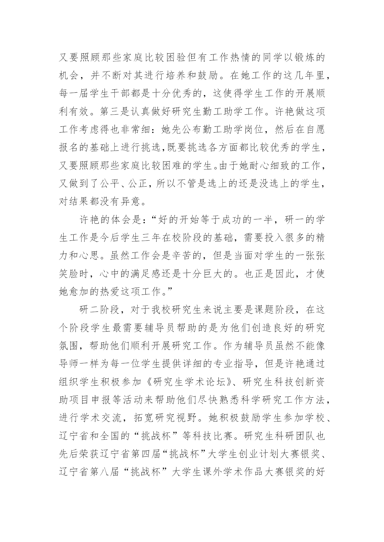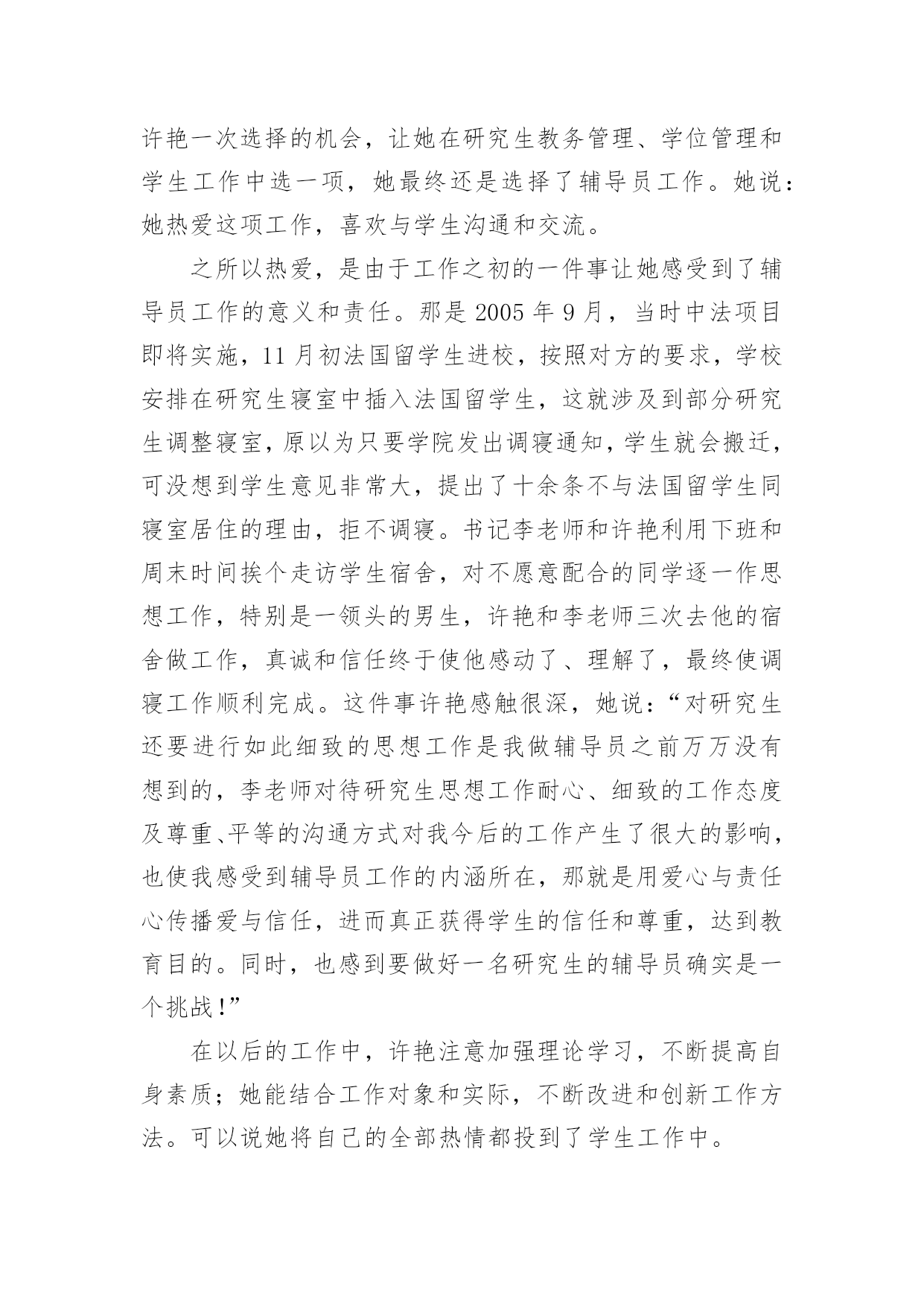 研究生学院许艳“管理育人”事迹材料研究生学院许艳“管理育人”事迹材料在学习、工作乃至生活中,大家都写过事迹材料吧,事迹材料可以起到宣扬特定的时代精神、引导读者认识先进,学习先进的作用。到底应如何拟定事迹材料呢?下面是小编收集整理的研究生学院许艳“管理育人”事迹材料,欢迎阅读,希望大家能够喜欢。一、简历许艳,女,1978年出生,中共党员;2001年毕业于本校工业分析专业,获学士学位,2002年考取本校化学工艺专业硕士研究生,2005年4月毕业并获得硕士学位,同年留校担任研究生辅导员;2007年4月聘为研究生学院团委书记,主要从事研究生日常管理、思想政治教育、学生干部培养与管理、研究生校园文化活动、社会实践活动和科技创新活动的开展、研究生就业派遣等工作。二、主要事迹时光荏苒,岁月如梭,转眼间许艳在研究生辅导员这个岗位工作已经四年多了。四年中,她在忙碌的工作里体会着什么是责任意识,在身边领导和同事的言行中感悟着什么是敬业精神。四年中,先后带了4届学生,共约800余人。由于许艳虚心好学,善于专研,不断思考,因此她的工作成效显著,个人感悟也很深。记得2007年聘任时,学院领导给许艳一次选择的机会,让她在研究生教务管理、学位管理和学生工作中选一项,她最终还是选择了辅导员工作。她说:她热爱这项工作,喜欢与学生沟通和交流。之所以热爱,是由于工作之初的一件事让她感受到了辅导员工作的意义和责任。那是2005年9月,当时中法项目即将实施,11月初法国留学生进校,按照对方的要求,学校安排在研究生寝室中插入法国留学生,这就涉及到部分研究生调整寝室,原以为只要学院发出调寝通知,学生就会搬迁,可没想到学生意见非常大,提出了十余条不与法国留学生同寝室居住的理由,拒不调寝。书记李老师和许艳利用下班和周末时间挨个走访学生宿舍,对不愿意配合的同学逐一作思想工作,特别是一领头的男生,许艳和李老师三次去他的宿舍做工作,真诚和信任终于使他感动了、理解了,最终使调寝工作顺利完成。这件事许艳感触很深,她说:“对研究生还要进行如此细致的思想工作是我做辅导员之前万万没有想到的,李老师对待研究生思想工作耐心、细致的工作态度及尊重、平等的沟通方式对我今后的工作产生了很大的影响,也使我感受到辅导员工作的内涵所在,那就是用爱心与责任心传播爱与信任,进而真正获得学生的信任和尊重,达到教育目的。同时,也感到要做好一名研究生的辅导员确实是一个挑战!”在以后的工作中,许艳注意加强理论学习,不断提高自身素质;她能结合工作对象和实际,不断改进和创新工作方法。可以说她将自己的全部热情都投到了学生工作中。1.以学生为本,有针对性地开展思想教育工作在研究生的思想政治工作中,她发现研究生与本科生有很大不同,他们思想比较成熟,独立意识强,不同年级的研究生也有不同的特点。因此在工作中,她能针对不同年级开展不同的工作内容,以不同的方式教育学生。比如:研一是进行研究生阶段德育教育最为关键的一年,特别是上半学期,是辅导员与研究生之间相互熟悉、相互了解的几个月。针对研一新生的特点,她能从以下几个方面主动开展工作:第一是做好新生接待工作。每次她都提前认真的查阅每一个同学的档案,熟悉他们的基本情况。很多学生来报到的时候,她都可以叫出他们的名字,这样就建立了与学生的第一次交流桥梁,也正是因为这一个小小细节,使学生感受到的关心和关怀是无法用其他途径所能获得的,进而建立起信任和尊重。第二是注重学生干部的培养。因为抓好学生干部这个“点”,就带动了广大学生整个“面”,要做到:既不对研究生的学习生活干预过多,保证其自由发展的空间,又使学校的各项方针政策迅速落实,提高工作效率,干部选配至关重要。因此在挑选干部时,她不但注重选拔以前作过学生干部的学生,同时也会给没有工作经验但有工作热情的同学以锻炼的机会,并不断对其进行培养和鼓励。在她工作的这几年里,每一届学生干部都是十分优秀的,这使得学生工作的开展顺利有效。第三是认真做好研究生勤工助学工作。许艳做这项工作考虑得也非常细:她先公布勤工助学岗位,然后在自愿报名的基础上进行挑选,既要挑选各方面都比较优秀的学生,又要照顾那些家庭比较困验但有工作热情的同学以锻炼的机会,并不断对其进行培养和鼓励。在她工作的这几年里,每一届学生干部都是十分优秀的,这使得学生工作的开展顺利有效。第三是认真做好研究生勤工助学工作。许艳做这项工作考虑得也非常细:她先公布勤工助学岗位,然后在自愿报名的基础上进行挑选,既要挑选各方面都比较优秀的学生,又要照顾那些家庭比较困难的学生。由于她耐心细致的工作,又做到了公平、公正,所以不管是选上的还是没选上的学生,对结果都没有异意。许艳的体会是:“好的开始等于成功的一半,研一的学生工作是今后学生三年在校阶段的基础,需要投入很多的精力和心思。虽然工作会是辛苦的,但是当面对学生的一张