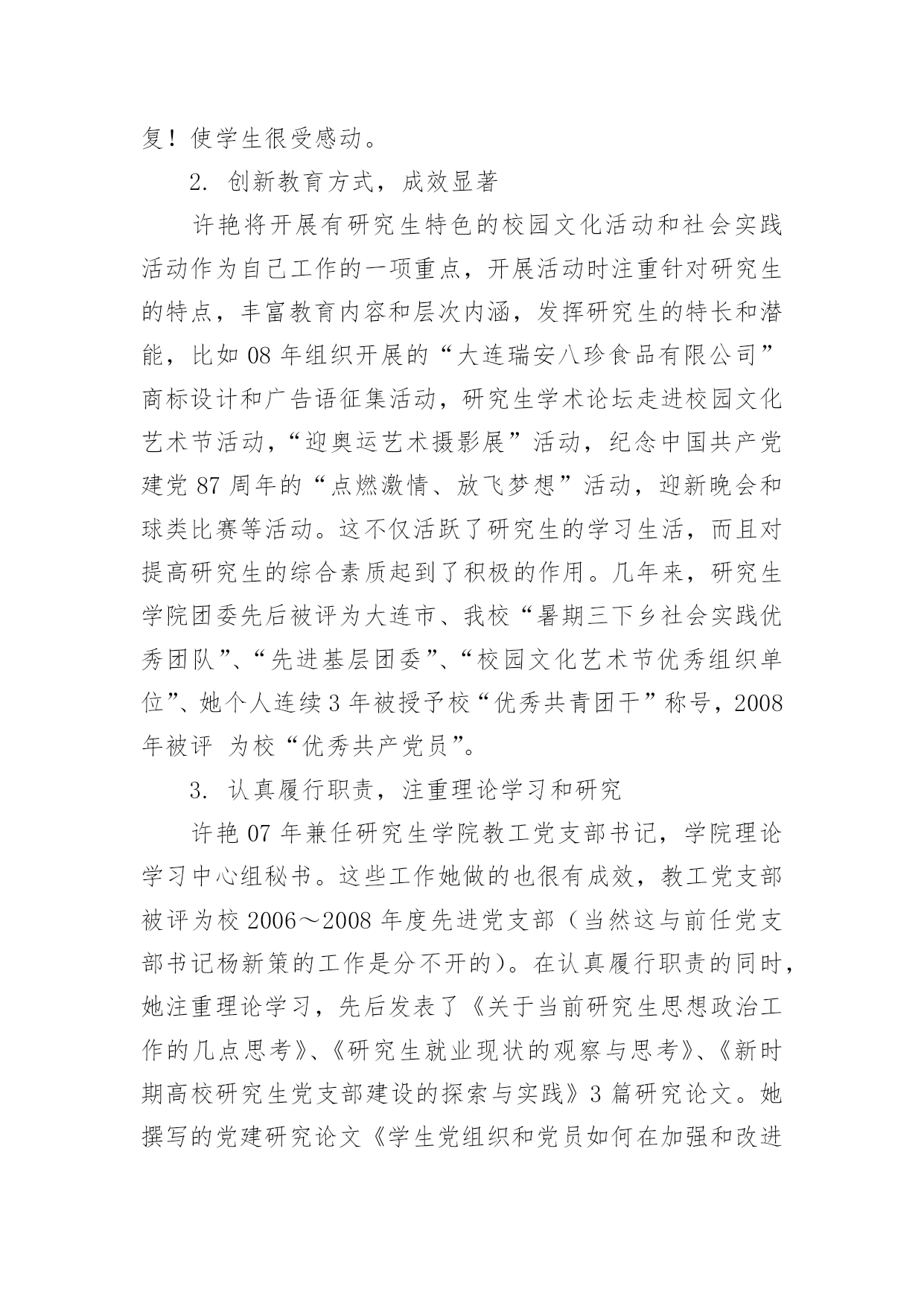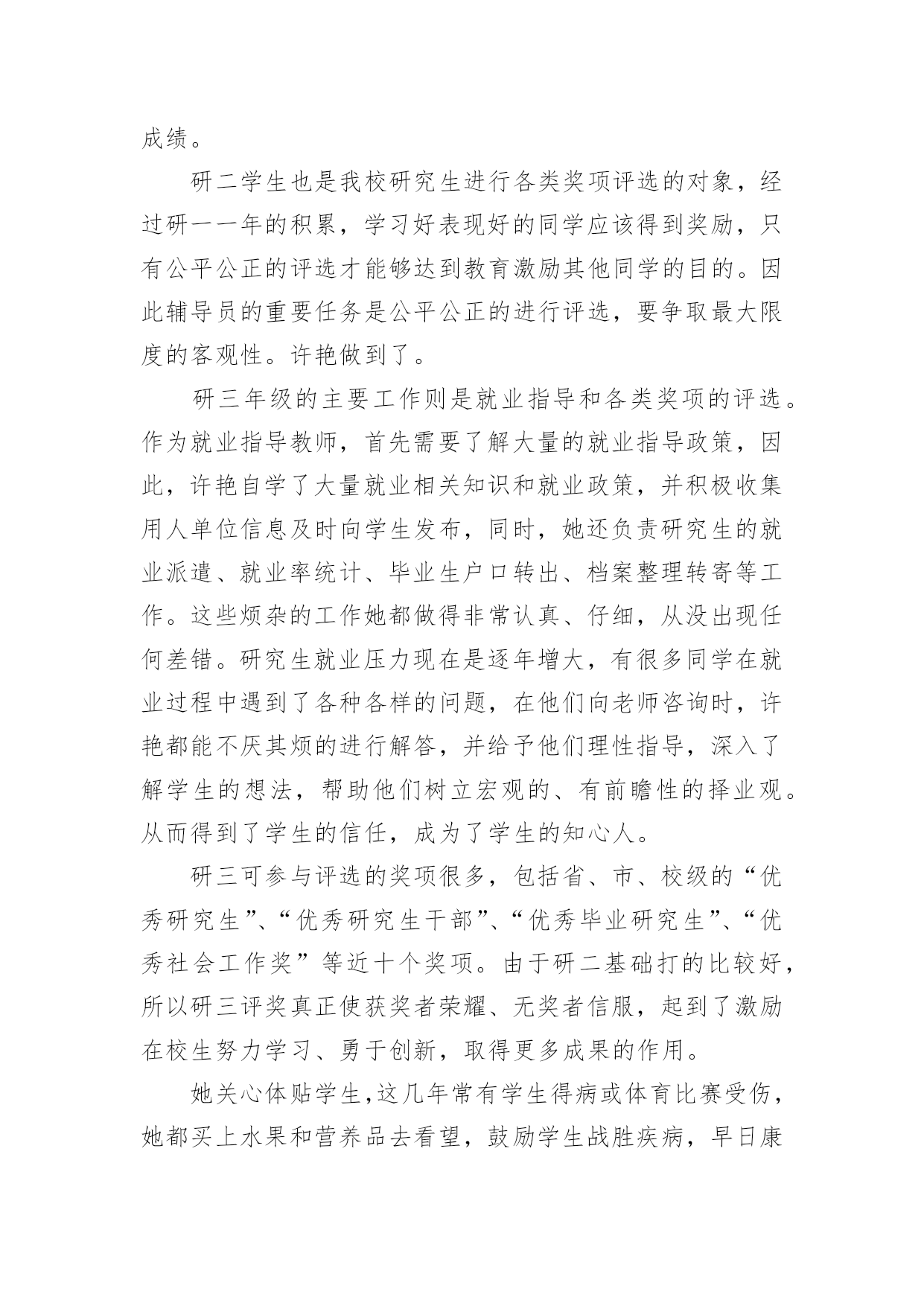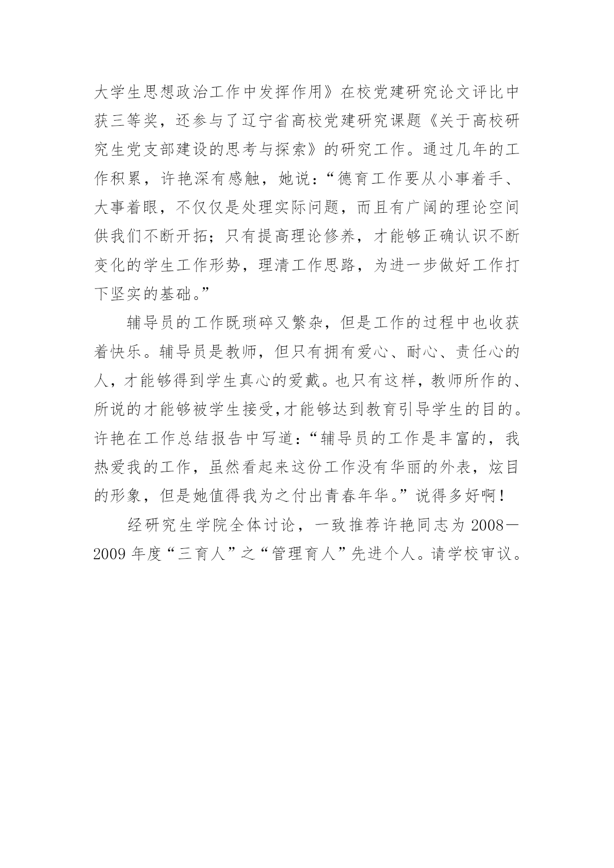 研究生学院许艳“管理育人”事迹材料研究生学院许艳“管理育人”事迹材料在学习、工作乃至生活中,大家都写过事迹材料吧,事迹材料可以起到宣扬特定的时代精神、引导读者认识先进,学习先进的作用。到底应如何拟定事迹材料呢?下面是小编收集整理的研究生学院许艳“管理育人”事迹材料,欢迎阅读,希望大家能够喜欢。一、简历许艳,女,1978年出生,中共党员;2001年毕业于本校工业分析专业,获学士学位,2002年考取本校化学工艺专业硕士研究生,2005年4月毕业并获得硕士学位,同年留校担任研究生辅导员;2007年4月聘为研究生学院团委书记,主要从事研究生日常管理、思想政治教育、学生干部培养与管理、研究生校园文化活动、社会实践活动和科技创新活动的开展、研究生就业派遣等工作。二、主要事迹时光荏苒,岁月如梭,转眼间许艳在研究生辅导员这个岗位工作已经四年多了。四年中,她在忙碌的工作里体会着什么是责任意识,在身边领导和同事的言行中感悟着什么是敬业精神。四年中,先后带了4届学生,共约800余人。由于许艳虚心好学,善于专研,不断思考,因此她的工作成效显著,个人感悟也很深。记得2007年聘任时,学院领导给许艳一次选择的机会,让她在研究生教务管理、学位管理和学生工作中选一项,她最终还是选择了辅导员工作。她说:她热爱这项工作,喜欢与学生沟通和交流。之所以热爱,是由于工作之初的一件事让她感受到了辅导员工作的意义和责任。那是2005年9月,当时中法项目即将实施,11月初法国留学生进校,按照对方的要求,学校安排在研究生寝室中插入法国留学生,这就涉及到部分研究生调整寝室,原以为只要学院发出调寝通知,学生就会搬迁,可没想到学生意见非常大,提出了十余条不与法国留学生同寝室居住的理由,拒不调寝。书记李老师和许艳利用下班和周末时间挨个走访学生宿舍,对不愿意配合的同学逐一作思想工作,特别是一领头的男生,许艳和李老师三次去他的宿舍做工作,真诚和信任终于使他感动了、理解了,最终使调寝工作顺利完成。这件事许艳感触很深,她说:“对研究生还要进行如此细致的思想工作是我做辅导员之前万万没有想到的,李老师对待研究生思想工作耐心、细致的工作态度及尊重、平等的沟通方式对我今后的工作产生了很大的影响,也使我感受到辅导员工作的内涵所在,那就是用爱心与责任心传播爱与信任,进而真正获得学生的信任和尊重,达到教育目的。同时,也感到要做好一名研究生的辅导员确实是一个挑战!”在以后的工作中,许艳注意加强理论学习,不断提高自身素质;她能结合工作对象和实际,不断改进和创新工作方法。可以说她将自己的全部热情都投到了学生工作中。1.以学生为本,有针对性地开展思想教育工作在研究生的思想政治工作中,她发现研究生与本科生有很大不同,他们思想比较成熟,独立意识强,不同年级的研究生也有不同的特点。因此在工作中,她能针对不同年级开展不同的工作内容,以不同的方式教育学生。比如:研一是进行研究生阶段德育教育最为关键的一年,特别是上半学期,是辅导员与研究生之间相互熟悉、相互了解的几个月。针对研一新生的特点,她能从以下几个方面主动开展工作:第一是做好新生接待工作。每次她都提前认真的查阅每一个同学的档案,熟悉他们的基本情况。很多学生来报到的时候,她都可以叫出他们的名字,这样就建立了与学生的第一次交流桥梁,也正是因为这一个小小细节,使学生感受到的关心和关怀是无法用其他途径所能获得的,进而建立起信任和尊重。第二是注重学生干部的培养。因为抓好学生干部这个“点”,就带动了广大学生整个“面”,要做到:既不对研究生的学习生活干预过多,保证其自由发展的空间,又使学校的各项方针政策迅速落实,提高工作效率,干部选配至关重要。因此在挑选干部时,她不但注重选拔以前作过学生干部的学生,同时也会给没有工作经验但有工作热情的同学以锻炼的机会,并不断对其进行培养和鼓励。在她工作的这几年里,每一届学生干部都是十分优秀的,这使得学生工作的开展顺利有效。第三是认真做好研究生勤工助学工作。许艳做这项工作考虑得也非常细:她先公布勤工助学岗位,然后在自愿报名的基础上进行挑选,既要挑选各方面都比较优秀的学生,又要照顾那些家庭比较困验但有工作热情的同学以锻炼的机会,并不断对其进行培养和鼓励。在她工作的这几年里,每一届学生干部都是十分优秀的,这使得学生工作的开展顺利有效。第三是认真做好研究生勤工助学工作。许艳做这项工作考虑得也非常细:她先公布勤工助学岗位,然后在自愿报名的基础上进行挑选,既要挑选各方面都比较优秀的学生,又要照顾那些家庭比较困难的学生。由于她耐心细致的工作,又做到了公平、公正,所以不管是选上的还是没选上的学生,对结果都没有异意。许艳的体会是:“好的开始等于成功的一半,研一的学生工作是今后学生三年在校阶段的基础,需要投入很多的精力和心思。虽然工作会是辛苦的,但是当面对学生的一张