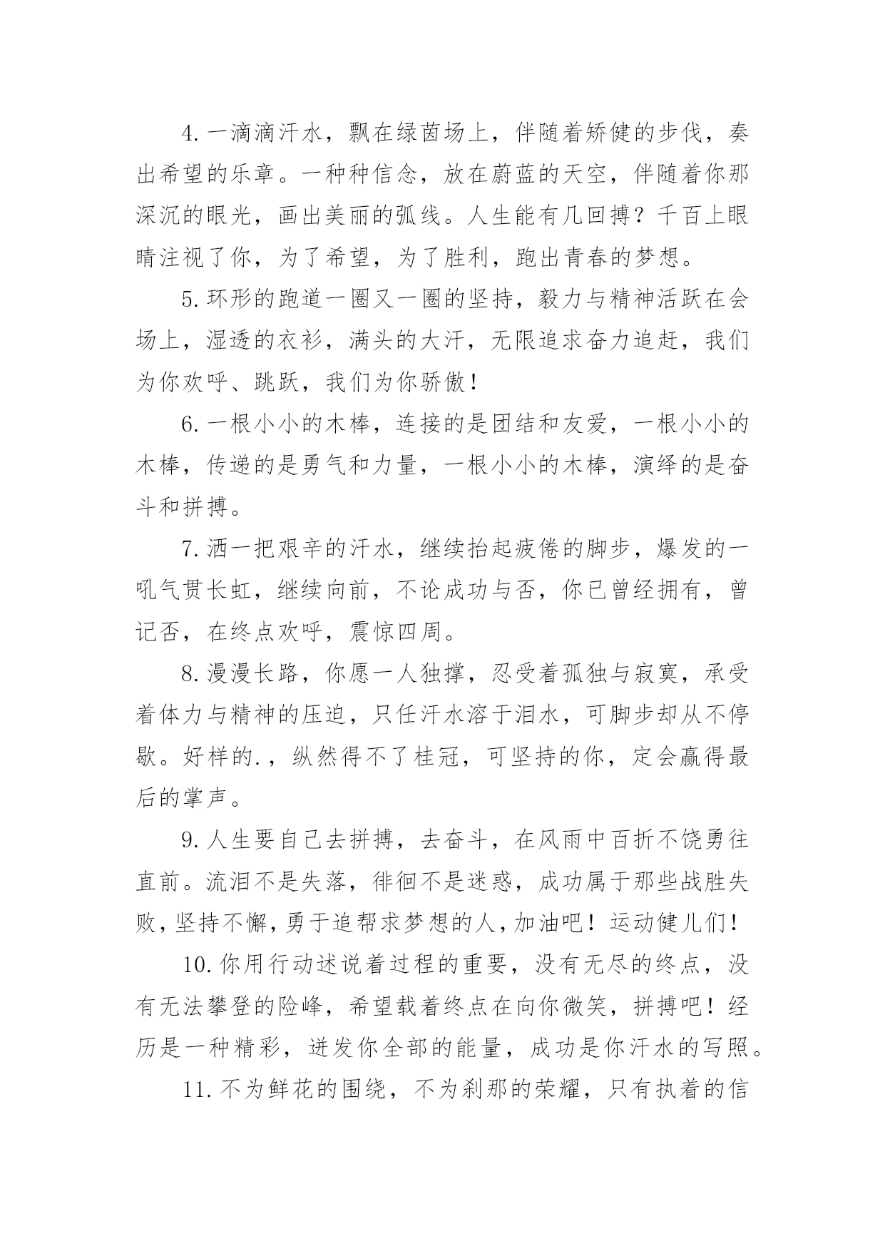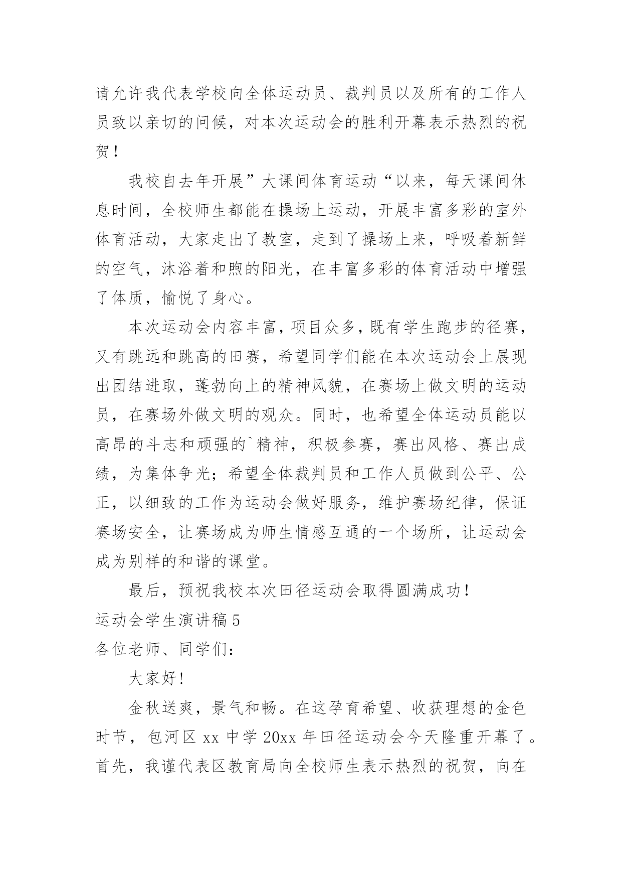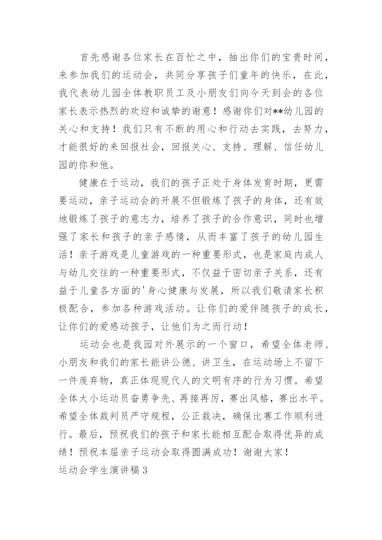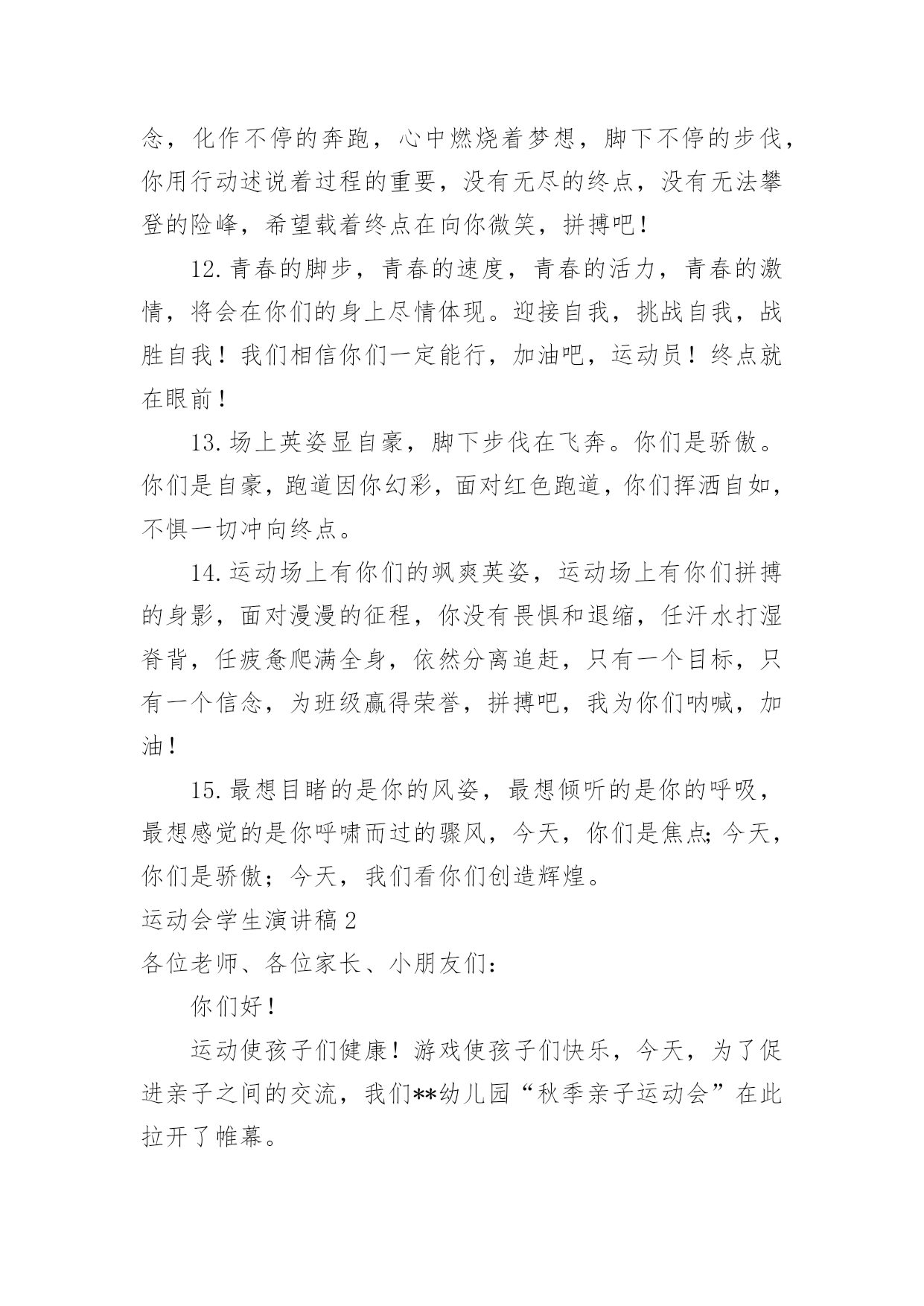 运动会学生演讲稿运动会学生演讲稿演讲稿可以起到整理演讲者的思路、提示演讲的内容、限定演讲的速度的作用。在充满活力,日益开放的今天,演讲稿应用范围愈来愈广泛,如何写一份恰当的演讲稿呢?以下是小编帮大家整理的运动会学生演讲稿,供大家参考借鉴,希望可以帮助到有需要的朋友。运动会学生演讲稿11.你是跑道上划过的流星,燃烧自己,洒下光辉,也许你并没有看到成功像你挥手,但你已奋斗拼搏过,相信自己,力量就在心中。2.也许流星并不少见,但它燃烧的刹那,留给人间最美丽的回忆!也许笑脸并不少见,但胜利的喜悦,总会留给世界精彩的一瞬!是的,那些曾经美妙的东西只有短短的一瞬间,但那却把最辉煌的一刻留给了人间。胜利,是每个人所追求的,胜利的喜悦,是胜利与重新开始的转折,胜利是新的开始!3.年轻的我们自信飞扬,青春的气息如同出生的朝阳,蓬勃的力量如同阳光的挥洒。此时此刻,跑道便是我们精彩的舞台,声声加油便是我们的奖项!论何成功,谈何荣辱,心中的信念只有一个:拼搏!4.一滴滴汗水,飘在绿茵场上,伴随着矫健的步伐,奏出希望的乐章。一种种信念,放在蔚蓝的天空,伴随着你那深沉的眼光,画出美丽的弧线。人生能有几回搏?千百上眼睛注视了你,为了希望,为了胜利,跑出青春的梦想。5.环形的跑道一圈又一圈的坚持,毅力与精神活跃在会场上,湿透的衣衫,满头的大汗,无限追求奋力追赶,我们为你欢呼、跳跃,我们为你骄傲!6.一根小小的木棒,连接的是团结和友爱,一根小小的木棒,传递的是勇气和力量,一根小小的木棒,演绎的是奋斗和拼搏。7.洒一把艰辛的汗水,继续抬起疲倦的脚步,爆发的一吼气贯长虹,继续向前,不论成功与否,你已曾经拥有,曾记否,在终点欢呼,震惊四周。8.漫漫长路,你愿一人独撑,忍受着孤独与寂寞,承受着体力与精神的压迫,只任汗水溶于泪水,可脚步却从不停歇。好样的.,纵然得不了桂冠,可坚持的你,定会赢得最后的掌声。9.人生要自己去拼搏,去奋斗,在风雨中百折不饶勇往直前。流泪不是失落,徘徊不是迷惑,成功属于那些战胜失败,坚持不懈,勇于追帮求梦想的人,加油吧!运动健儿们!10.你用行动述说着过程的重要,没有无尽的终点,没有无法攀登的险峰,希望载着终点在向你微笑,拼搏吧!经历是一种精彩,迸发你全部的能量,成功是你汗水的写照。11.不为鲜花的围绕,不为刹那的荣耀,只有执着的信念,化作不停的奔跑,心中燃烧着梦想,脚下不停的步伐,你用行动述说着过程的重要,没有无尽的终点,没有无法攀登的险峰,希望载着终点在向你微笑,拼搏吧!12.青春的脚步,青春的速度,青春的活力,青春的激情,将会在你们的身上尽情体现。迎接自我,挑战自我,战胜自我!我们相信你们一定能行,加油吧,运动员!终点就在眼前!13.场上英姿显自豪,脚下步伐在飞奔。你们是骄傲。你们是自豪,跑道因你幻彩,面对红色跑道,你们挥洒自如,不惧一切冲向终点。14.运动场上有你们的飒爽英姿,运动场上有你们拼搏的身影,面对漫漫的征程,你没有畏惧和退缩,任汗水打湿脊背,任疲惫爬满全身,依然分离追赶,只有一个目标,只有一个信念,为班级赢得荣誉,拼搏吧,我为你们呐喊,加油!15.最想目睹的是你的风姿,最想倾听的是你的呼吸,最想感觉的是你呼啸而过的骤风,今天,你们是焦点;今天,你们是骄傲;今天,我们看你们创造辉煌。运动会学生演讲稿2各位老师、各位家长、小朋友们:你们好!运动使孩子们健康!游戏使孩子们快乐,今天,为了促进亲子之间的交流,我们**幼儿园“秋季亲子运动会”在此拉开了帷幕。首先感谢各位家长在百忙之中,抽出你们的宝贵时间,来参加我们的运动会,共同分享孩子们童年的快乐,在此,我代表幼儿园全体教职员工及小朋友们向今天到会的各位家长表示热烈的欢迎和诚挚的谢意!感谢你们对**幼儿园的关心和支持!我们只有不断的用心和行动去实践,去努力,才能很好的来回报社会,回报关心、支持、理解、信任幼儿园的你和他。健康在于运动,我们的孩子正处于身体发育时期,更需要运动,亲子运动会的开展不但锻炼了孩子的身体,还有效地锻炼了孩子的意志力,培养了孩子的合作意识,同时也增强了家长和孩子的亲子感情,从而丰富了孩子的幼儿园生活!亲子游戏是儿童游戏的一种重要形式,也是家庭内成人与幼儿交往的一种重要形式,不仅益于密切亲子关系,还有益于儿童各方面的'身心健康与发展,所以我们敬请家长积极配合,参加各种游戏活动。让你们的爱伴随孩子的成长,让你们的爱感动孩子,让他们为之而行动!运动会也是我园对外展示的一个窗口,希望全体老师、小朋友和我们的家长能讲公德、讲卫生,在运动场上不留下一件废弃物,真正体现现代人的文明有序的行为习惯。希望全体大小运动员奋勇争先、再接再厉,赛出风格,赛出水平。希望全体裁判员严守规程,公正裁决,确保比赛工作顺利进行。最后,预祝我们的孩子和家长能相互配合取得优异的成绩!预祝本届亲子运