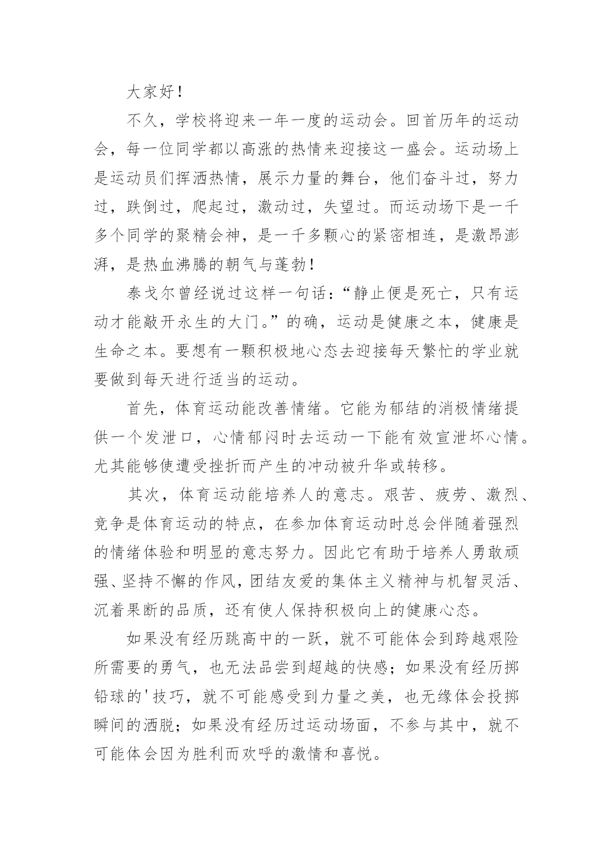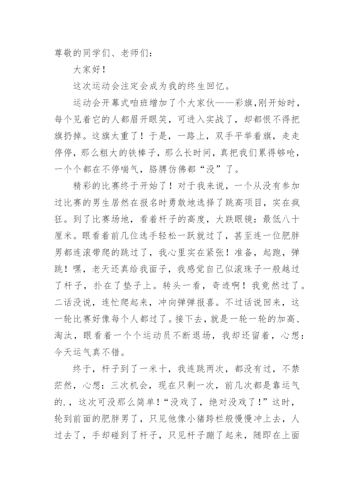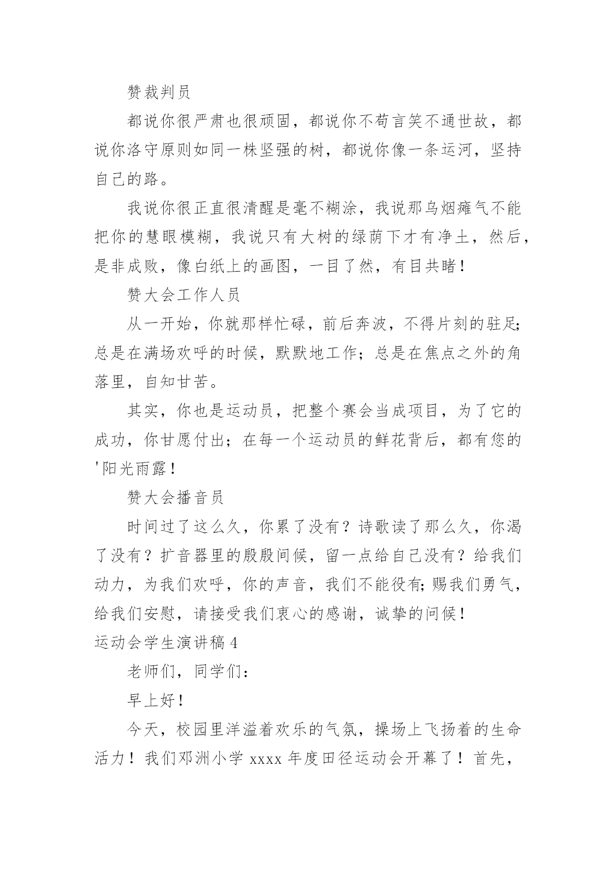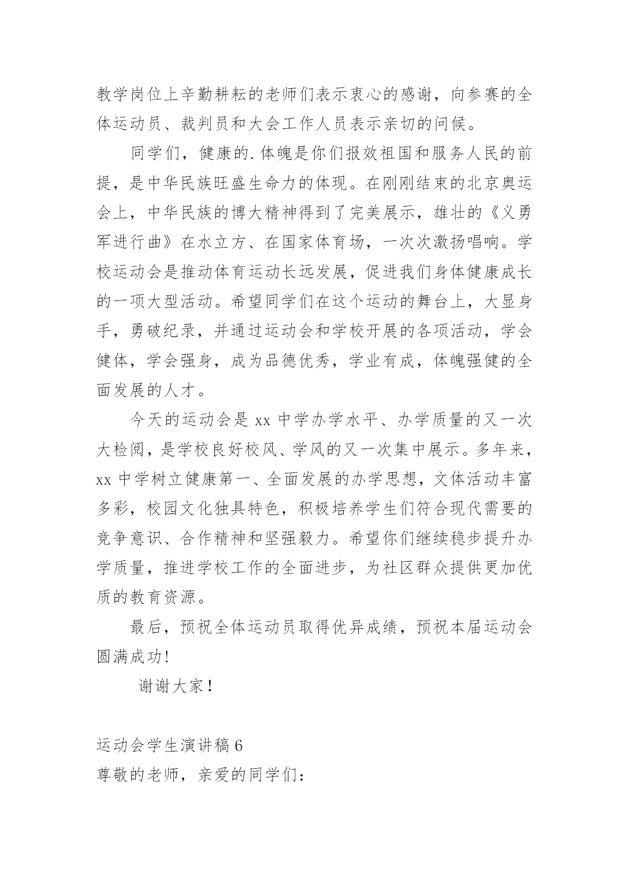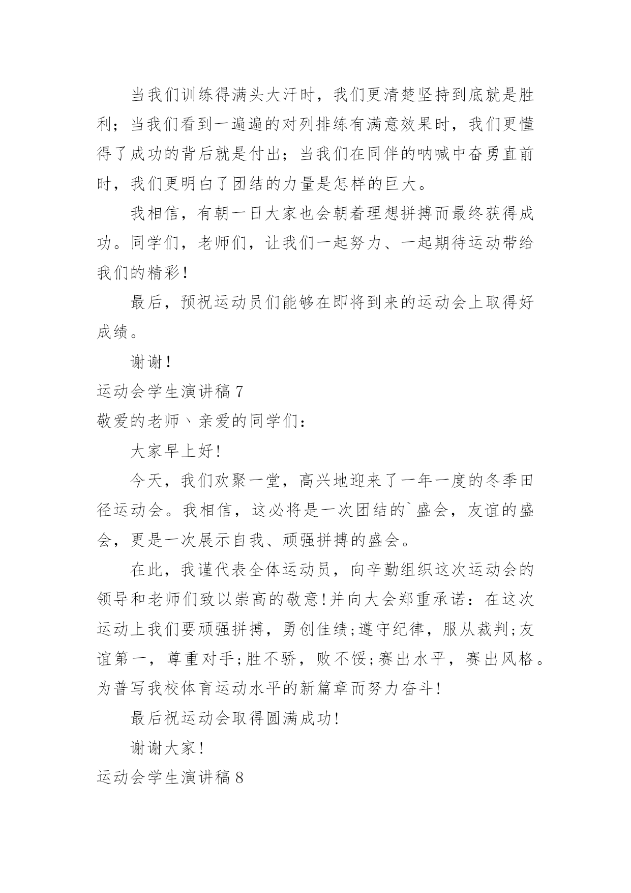 运动会学生演讲稿运动会学生演讲稿演讲稿可以起到整理演讲者的思路、提示演讲的内容、限定演讲的速度的作用。在充满活力,日益开放的今天,演讲稿应用范围愈来愈广泛,如何写一份恰当的演讲稿呢?以下是小编帮大家整理的运动会学生演讲稿,供大家参考借鉴,希望可以帮助到有需要的朋友。运动会学生演讲稿11.你是跑道上划过的流星,燃烧自己,洒下光辉,也许你并没有看到成功像你挥手,但你已奋斗拼搏过,相信自己,力量就在心中。2.也许流星并不少见,但它燃烧的刹那,留给人间最美丽的回忆!也许笑脸并不少见,但胜利的喜悦,总会留给世界精彩的一瞬!是的,那些曾经美妙的东西只有短短的一瞬间,但那却把最辉煌的一刻留给了人间。胜利,是每个人所追求的,胜利的喜悦,是胜利与重新开始的转折,胜利是新的开始!3.年轻的我们自信飞扬,青春的气息如同出生的朝阳,蓬勃的力量如同阳光的挥洒。此时此刻,跑道便是我们精彩的舞台,声声加油便是我们的奖项!论何成功,谈何荣辱,心中的信念只有一个:拼搏!4.一滴滴汗水,飘在绿茵场上,伴随着矫健的步伐,奏出希望的乐章。一种种信念,放在蔚蓝的天空,伴随着你那深沉的眼光,画出美丽的弧线。人生能有几回搏?千百上眼睛注视了你,为了希望,为了胜利,跑出青春的梦想。5.环形的跑道一圈又一圈的坚持,毅力与精神活跃在会场上,湿透的衣衫,满头的大汗,无限追求奋力追赶,我们为你欢呼、跳跃,我们为你骄傲!6.一根小小的木棒,连接的是团结和友爱,一根小小的木棒,传递的是勇气和力量,一根小小的木棒,演绎的是奋斗和拼搏。7.洒一把艰辛的汗水,继续抬起疲倦的脚步,爆发的一吼气贯长虹,继续向前,不论成功与否,你已曾经拥有,曾记否,在终点欢呼,震惊四周。8.漫漫长路,你愿一人独撑,忍受着孤独与寂寞,承受着体力与精神的压迫,只任汗水溶于泪水,可脚步却从不停歇。好样的.,纵然得不了桂冠,可坚持的你,定会赢得最后的掌声。9.人生要自己去拼搏,去奋斗,在风雨中百折不饶勇往直前。流泪不是失落,徘徊不是迷惑,成功属于那些战胜失败,坚持不懈,勇于追帮求梦想的人,加油吧!运动健儿们!10.你用行动述说着过程的重要,没有无尽的终点,没有无法攀登的险峰,希望载着终点在向你微笑,拼搏吧!经历是一种精彩,迸发你全部的能量,成功是你汗水的写照。11.不为鲜花的围绕,不为刹那的荣耀,只有执着的信念,化作不停的奔跑,心中燃烧着梦想,脚下不停的步伐,你用行动述说着过程的重要,没有无尽的终点,没有无法攀登的险峰,希望载着终点在向你微笑,拼搏吧!12.青春的脚步,青春的速度,青春的活力,青春的激情,将会在你们的身上尽情体现。迎接自我,挑战自我,战胜自我!我们相信你们一定能行,加油吧,运动员!终点就在眼前!13.场上英姿显自豪,脚下步伐在飞奔。你们是骄傲。你们是自豪,跑道因你幻彩,面对红色跑道,你们挥洒自如,不惧一切冲向终点。14.运动场上有你们的飒爽英姿,运动场上有你们拼搏的身影,面对漫漫的征程,你没有畏惧和退缩,任汗水打湿脊背,任疲惫爬满全身,依然分离追赶,只有一个目标,只有一个信念,为班级赢得荣誉,拼搏吧,我为你们呐喊,加油!15.最想目睹的是你的风姿,最想倾听的是你的呼吸,最想感觉的是你呼啸而过的骤风,今天,你们是焦点;今天,你们是骄傲;今天,我们看你们创造辉煌。运动会学生演讲稿2各位老师、各位家长、小朋友们:你们好!运动使孩子们健康!游戏使孩子们快乐,今天,为了促进亲子之间的交流,我们**幼儿园“秋季亲子运动会”在此拉开了帷幕。首先感谢各位家长在百忙之中,抽出你们的宝贵时间,来参加我们的运动会,共同分享孩子们童年的快乐,在此,我代表幼儿园全体教职员工及小朋友们向今天到会的各位家长表示热烈的欢迎和诚挚的谢意!感谢你们对**幼儿园的关心和支持!我们只有不断的用心和行动去实践,去努力,才能很好的来回报社会,回报关心、支持、理解、信任幼儿园的你和他。健康在于运动,我们的孩子正处于身体发育时期,更需要运动,亲子运动会的开展不但锻炼了孩子的身体,还有效地锻炼了孩子的意志力,培养了孩子的合作意识,同时也增强了家长和孩子的亲子感情,从而丰富了孩子的幼儿园生活!亲子游戏是儿童游戏的一种重要形式,也是家庭内成人与幼儿交往的一种重要形式,不仅益于密切亲子关系,还有益于儿童各方面的'身心健康与发展,所以我们敬请家长积极配合,参加各种游戏活动。让你们的爱伴随孩子的成长,让你们的爱感动孩子,让他们为之而行动!运动会也是我园对外展示的一个窗口,希望全体老师、小朋友和我们的家长能讲公德、讲卫生,在运动场上不留下一件废弃物,真正体现现代人的文明有序的行为习惯。希望全体大小运动员奋勇争先、再接再厉,赛出风格,赛出水平。希望全体裁判员严守规程,公正裁决,确保比赛工作顺利进行。最后,预祝我们的孩子和家长能相互配合取得优异的成绩!预祝本届亲子运