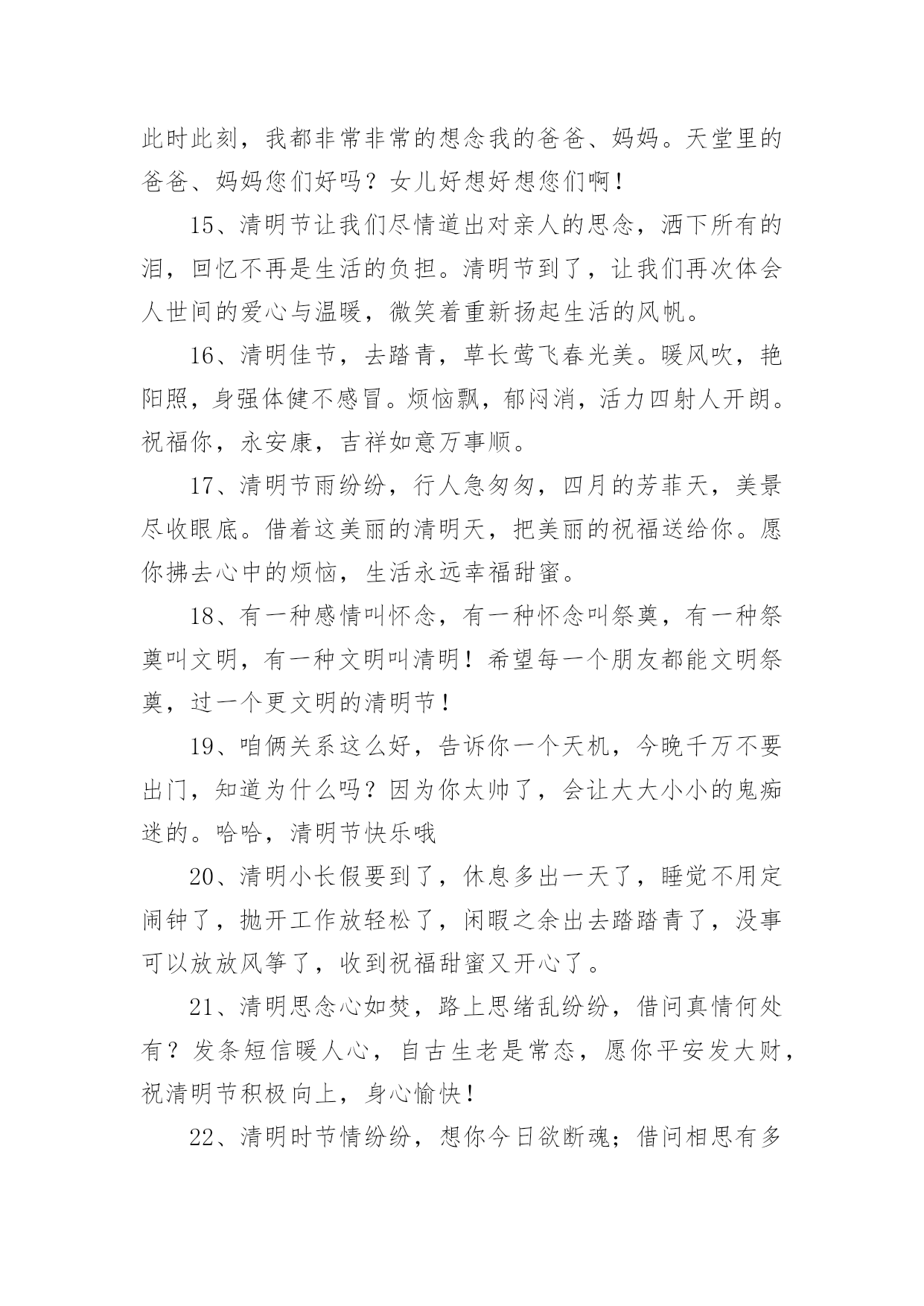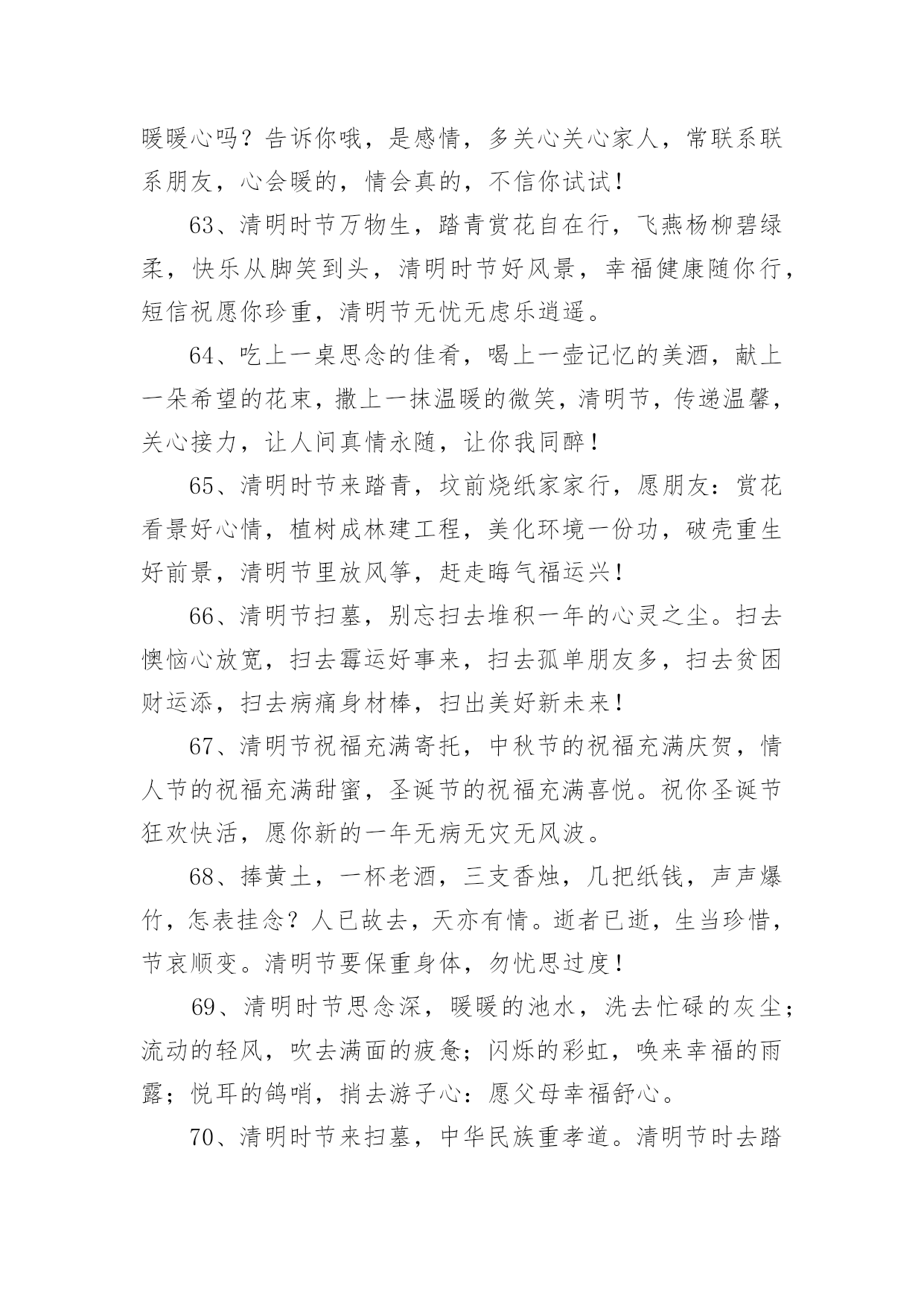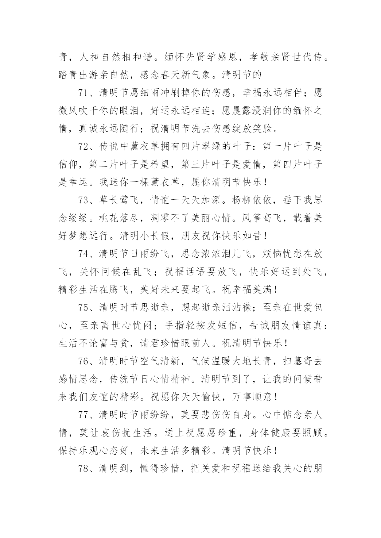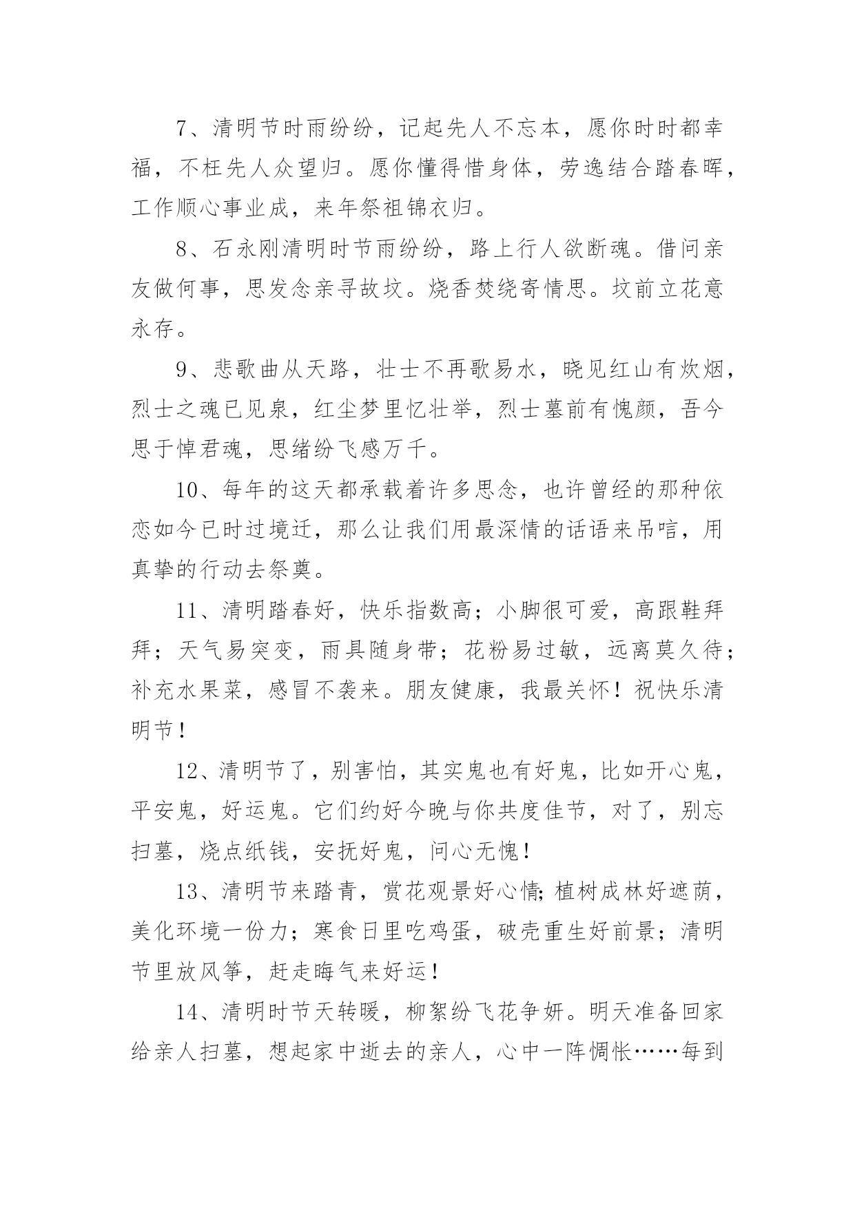 清明节主题文案清明节主题文案(精选320句)随着社交网络的兴起和普及,越来越多人会在朋友圈发布文案,文案用于记录和分享生活中有意义的事。那什么样的文案才是新颖独特的呢?下面是小编收集整理的清明节主题文案(精选320句),仅供参考,希望能够帮助到大家。1、花垂泪,燕低飞,清明雨声碎;游子归,轻烟堆,祭祖莫言悲;忆旧容,诉往昔,薄酒敬一杯;生者醉,逝者寐,心愿付纸灰;敬先贤,思遥寄,此情长相随。2、我们无法忘记那些先烈的事迹,在清明节这天,我们要祭奠那拥有浩然正气的灵魂,我们由衷的向他们致敬。3、清明时节来踏青,心情舒畅笑盈盈,植树成林好遮阴,美化环境一条心,悲欢离合已过去,快乐幸福来做陪,清明节里放风筝,赶走烦恼来好运,带来一帆风顺。4、清明时节来踏青,桃红柳绿真清新;山青水清脚步轻,眼明心明前途明;十里桃花百里杏,幸福伴你一年行。清明节快乐!5、清明节,踏青节,愿你背上安全的行囊,顺着快乐的导航;带上健康的行装,朝着幸福的前方;心里装满喜悦,手里握住希望;踏上绚丽多彩的征程。6、清明节,思亲念友,心结左右,人生在世,思量许久,遵循规律,放开心胸,容得忧愁,多开笑口,感情固守,多些问候,温暖亲朋,宽心你我!7、清明节时雨纷纷,记起先人不忘本,愿你时时都幸福,不枉先人众望归。愿你懂得惜身体,劳逸结合踏春晖,工作顺心事业成,来年祭祖锦衣归。8、石永刚清明时节雨纷纷,路上行人欲断魂。借问亲友做何事,思发念亲寻故坟。烧香焚绕寄情思。坟前立花意永存。9、悲歌曲从天路,壮士不再歌易水,晓见红山有炊烟,烈士之魂已见泉,红尘梦里忆壮举,烈士墓前有愧颜,吾今思于悼君魂,思绪纷飞感万千。10、每年的这天都承载着许多思念,也许曾经的那种依恋如今已时过境迁,那么让我们用最深情的话语来吊唁,用真挚的行动去祭奠。11、清明踏春好,快乐指数高;小脚很可爱,高跟鞋拜拜;天气易突变,雨具随身带;花粉易过敏,远离莫久待;补充水果菜,感冒不袭来。朋友健康,我最关怀!祝快乐清明节!12、清明节了,别害怕,其实鬼也有好鬼,比如开心鬼,平安鬼,好运鬼。它们约好今晚与你共度佳节,对了,别忘扫墓,烧点纸钱,安抚好鬼,问心无愧!13、清明节来踏青,赏花观景好心情;植树成林好遮荫,美化环境一份力;寒食日里吃鸡蛋,破壳重生好前景;清明节里放风筝,赶走晦气来好运!14、清明时节天转暖,柳絮纷飞花争妍。明天准备回家给亲人扫墓,想起家中逝去的亲人,心中一阵惆怅……每到此时此刻,我都非常非常的想念我的爸爸、妈妈。天堂里的爸爸、妈妈您们好吗?女儿好想好想您们啊!15、清明节让我们尽情道出对亲人的思念,洒下所有的泪,回忆不再是生活的负担。清明节到了,让我们再次体会人世间的爱心与温暖,微笑着重新扬起生活的风帆。16、清明佳节,去踏青,草长莺飞春光美。暖风吹,艳阳照,身强体健不感冒。烦恼飘,郁闷消,活力四射人开朗。祝福你,永安康,吉祥如意万事顺。17、清明节雨纷纷,行人急匆匆,四月的芳菲天,美景尽收眼底。借着这美丽的清明天,把美丽的祝福送给你。愿你拂去心中的烦恼,生活永远幸福甜蜜。18、有一种感情叫怀念,有一种怀念叫祭奠,有一种祭奠叫文明,有一种文明叫清明!希望每一个朋友都能文明祭奠,过一个更文明的清明节!19、咱俩关系这么好,告诉你一个天机,今晚千万不要出门,知道为什么吗?因为你太帅了,会让大大小小的鬼痴迷的。哈哈,清明节快乐哦20、清明小长假要到了,休息多出一天了,睡觉不用定闹钟了,抛开工作放轻松了,闲暇之余出去踏踏青了,没事可以放放风筝了,收到祝福甜蜜又开心了。21、清明思念心如焚,路上思绪乱纷纷,借问真情何处有?发条短信暖人心,自古生老是常态,愿你平安发大财,祝清明节积极向上,身心愉快!22、清明时节情纷纷,想你今日欲断魂;借问相思有多重,此情堪比海更深。繁华烂漫春意浓,祝福今日也升温,祝你吉祥如意总光临,清明假期多开心!23、清明小长假,给你惊喜无限:让你的烦恼遍寻不见,让你的快乐伸手可及;让你的困苦眨眼消散,让你的幸福难以淹没。清明小长假,想不开心,很难。24、一毛钱的短信,内含一心一意的祝福,一心一意的爱意,一心一意的真诚,清明节到来之际,送给你最诚挚的祝福,祝你幸福健康每一天。25、梨花风起正清明,祭祖扫墓万家忙。一束鲜花敬先烈,用心对话真英雄。一年一度的清明节,祝福祈愿世界清明和平,家家安享清明太平。26、清明节地位得到提升了,放假时间大增了,抛开工作能放松了,睡觉不用定闹钟了,闲暇之余去踏青了,节后又能神气清了!提前祝清明快乐!27、清明节到了,思亲念友,心结左右,人生在世,思量许久,遵循规律,放开心胸,容得忧愁,多开笑口,感情固守,多些问候,温暖亲朋,宽心你我!28、清明时节来扫墓,中华民族重孝道;清明节时去踏青,人和自然相和谐;缅怀先贤学感恩,孝敬亲贤世代传;踏青出游亲
