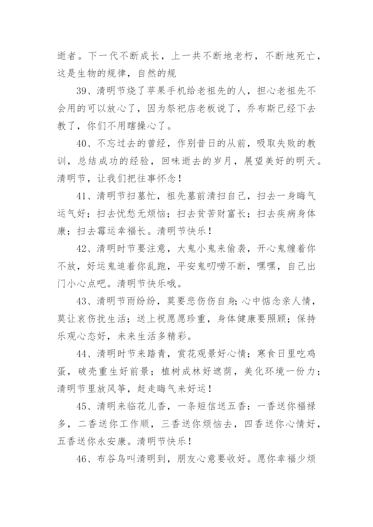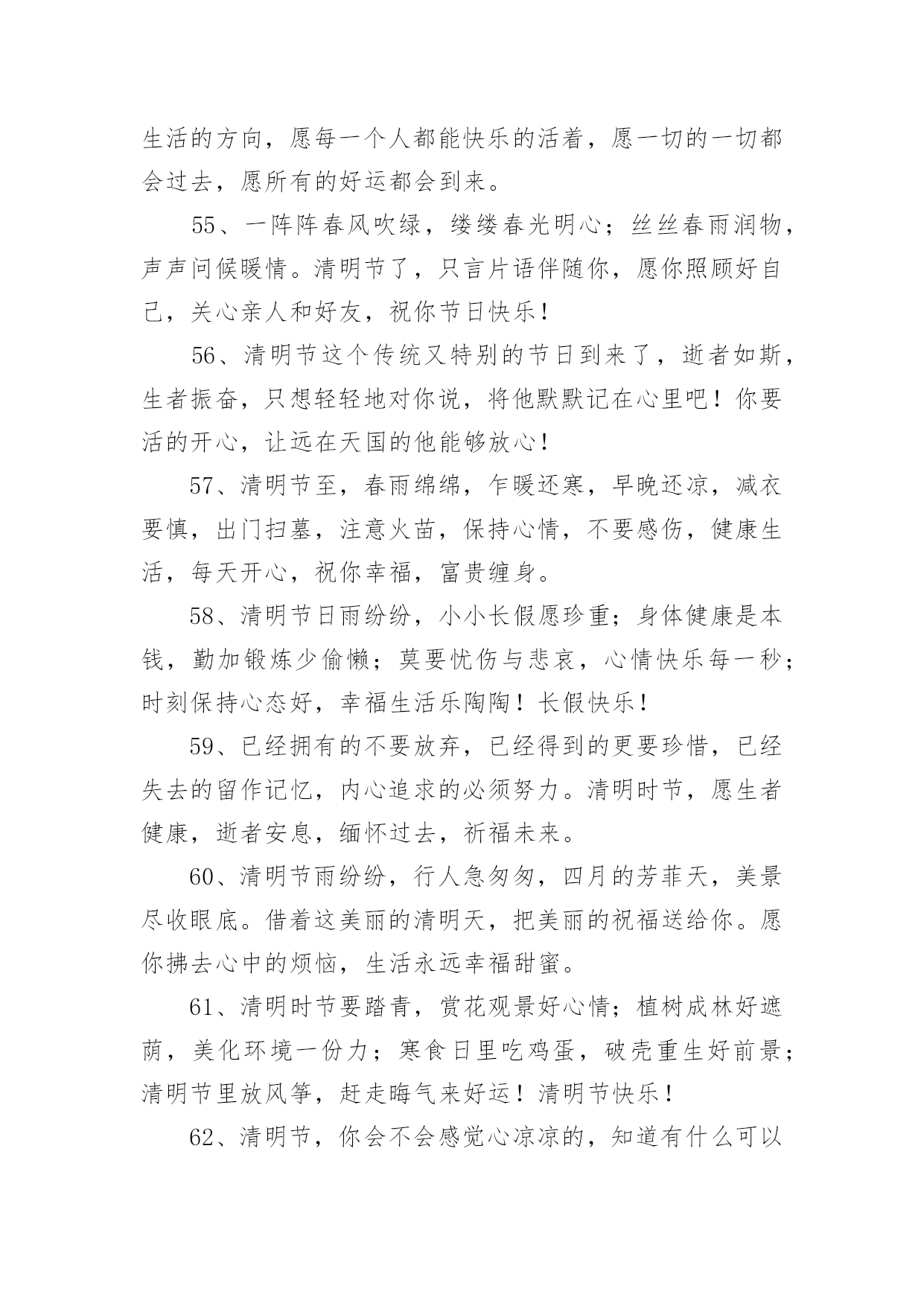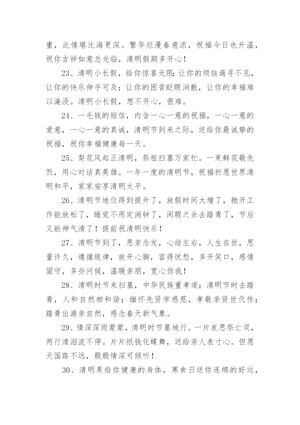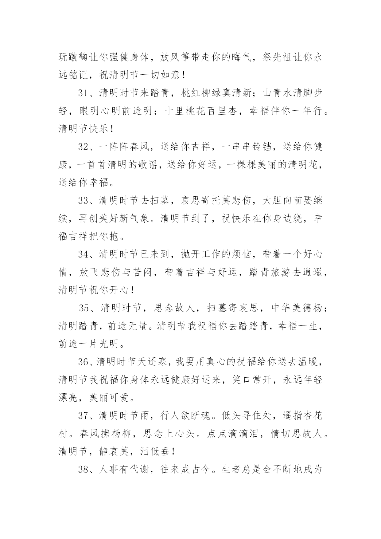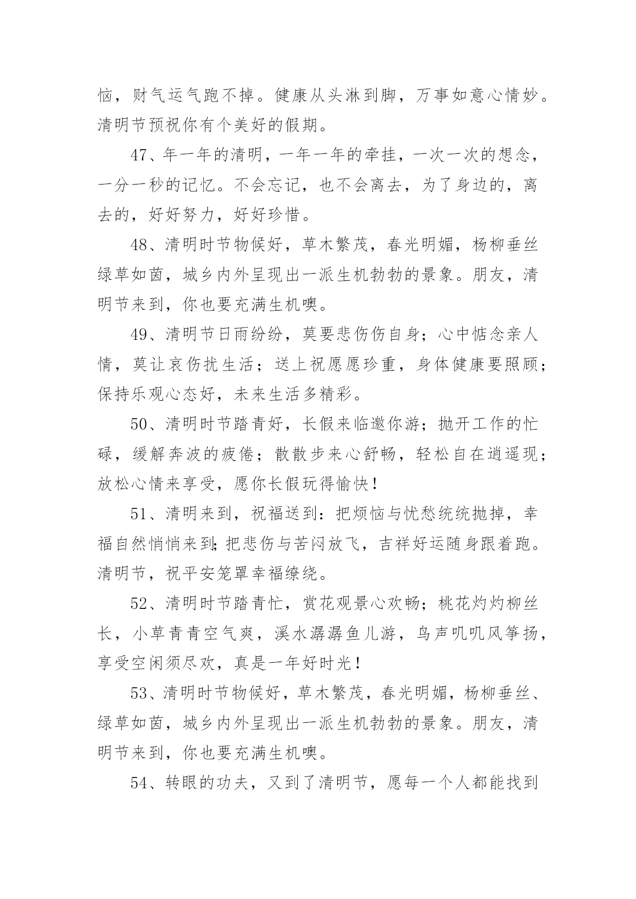 清明节主题文案清明节主题文案(精选320句)随着社交网络的兴起和普及,越来越多人会在朋友圈发布文案,文案用于记录和分享生活中有意义的事。那什么样的文案才是新颖独特的呢?下面是小编收集整理的清明节主题文案(精选320句),仅供参考,希望能够帮助到大家。1、花垂泪,燕低飞,清明雨声碎;游子归,轻烟堆,祭祖莫言悲;忆旧容,诉往昔,薄酒敬一杯;生者醉,逝者寐,心愿付纸灰;敬先贤,思遥寄,此情长相随。2、我们无法忘记那些先烈的事迹,在清明节这天,我们要祭奠那拥有浩然正气的灵魂,我们由衷的向他们致敬。3、清明时节来踏青,心情舒畅笑盈盈,植树成林好遮阴,美化环境一条心,悲欢离合已过去,快乐幸福来做陪,清明节里放风筝,赶走烦恼来好运,带来一帆风顺。4、清明时节来踏青,桃红柳绿真清新;山青水清脚步轻,眼明心明前途明;十里桃花百里杏,幸福伴你一年行。清明节快乐!5、清明节,踏青节,愿你背上安全的行囊,顺着快乐的导航;带上健康的行装,朝着幸福的前方;心里装满喜悦,手里握住希望;踏上绚丽多彩的征程。6、清明节,思亲念友,心结左右,人生在世,思量许久,遵循规律,放开心胸,容得忧愁,多开笑口,感情固守,多些问候,温暖亲朋,宽心你我!7、清明节时雨纷纷,记起先人不忘本,愿你时时都幸福,不枉先人众望归。愿你懂得惜身体,劳逸结合踏春晖,工作顺心事业成,来年祭祖锦衣归。8、石永刚清明时节雨纷纷,路上行人欲断魂。借问亲友做何事,思发念亲寻故坟。烧香焚绕寄情思。坟前立花意永存。9、悲歌曲从天路,壮士不再歌易水,晓见红山有炊烟,烈士之魂已见泉,红尘梦里忆壮举,烈士墓前有愧颜,吾今思于悼君魂,思绪纷飞感万千。10、每年的这天都承载着许多思念,也许曾经的那种依恋如今已时过境迁,那么让我们用最深情的话语来吊唁,用真挚的行动去祭奠。11、清明踏春好,快乐指数高;小脚很可爱,高跟鞋拜拜;天气易突变,雨具随身带;花粉易过敏,远离莫久待;补充水果菜,感冒不袭来。朋友健康,我最关怀!祝快乐清明节!12、清明节了,别害怕,其实鬼也有好鬼,比如开心鬼,平安鬼,好运鬼。它们约好今晚与你共度佳节,对了,别忘扫墓,烧点纸钱,安抚好鬼,问心无愧!13、清明节来踏青,赏花观景好心情;植树成林好遮荫,美化环境一份力;寒食日里吃鸡蛋,破壳重生好前景;清明节里放风筝,赶走晦气来好运!14、清明时节天转暖,柳絮纷飞花争妍。明天准备回家给亲人扫墓,想起家中逝去的亲人,心中一阵惆怅……每到此时此刻,我都非常非常的想念我的爸爸、妈妈。天堂里的爸爸、妈妈您们好吗?女儿好想好想您们啊!15、清明节让我们尽情道出对亲人的思念,洒下所有的泪,回忆不再是生活的负担。清明节到了,让我们再次体会人世间的爱心与温暖,微笑着重新扬起生活的风帆。16、清明佳节,去踏青,草长莺飞春光美。暖风吹,艳阳照,身强体健不感冒。烦恼飘,郁闷消,活力四射人开朗。祝福你,永安康,吉祥如意万事顺。17、清明节雨纷纷,行人急匆匆,四月的芳菲天,美景尽收眼底。借着这美丽的清明天,把美丽的祝福送给你。愿你拂去心中的烦恼,生活永远幸福甜蜜。18、有一种感情叫怀念,有一种怀念叫祭奠,有一种祭奠叫文明,有一种文明叫清明!希望每一个朋友都能文明祭奠,过一个更文明的清明节!19、咱俩关系这么好,告诉你一个天机,今晚千万不要出门,知道为什么吗?因为你太帅了,会让大大小小的鬼痴迷的。哈哈,清明节快乐哦20、清明小长假要到了,休息多出一天了,睡觉不用定闹钟了,抛开工作放轻松了,闲暇之余出去踏踏青了,没事可以放放风筝了,收到祝福甜蜜又开心了。21、清明思念心如焚,路上思绪乱纷纷,借问真情何处有?发条短信暖人心,自古生老是常态,愿你平安发大财,祝清明节积极向上,身心愉快!22、清明时节情纷纷,想你今日欲断魂;借问相思有多重,此情堪比海更深。繁华烂漫春意浓,祝福今日也升温,祝你吉祥如意总光临,清明假期多开心!23、清明小长假,给你惊喜无限:让你的烦恼遍寻不见,让你的快乐伸手可及;让你的困苦眨眼消散,让你的幸福难以淹没。清明小长假,想不开心,很难。24、一毛钱的短信,内含一心一意的祝福,一心一意的爱意,一心一意的真诚,清明节到来之际,送给你最诚挚的祝福,祝你幸福健康每一天。25、梨花风起正清明,祭祖扫墓万家忙。一束鲜花敬先烈,用心对话真英雄。一年一度的清明节,祝福祈愿世界清明和平,家家安享清明太平。26、清明节地位得到提升了,放假时间大增了,抛开工作能放松了,睡觉不用定闹钟了,闲暇之余去踏青了,节后又能神气清了!提前祝清明快乐!27、清明节到了,思亲念友,心结左右,人生在世,思量许久,遵循规律,放开心胸,容得忧愁,多开笑口,感情固守,多些问候,温暖亲朋,宽心你我!28、清明时节来扫墓,中华民族重孝道;清明节时去踏青,人和自然相和谐;缅怀先贤学感恩,孝敬亲贤世代传;踏青出游亲