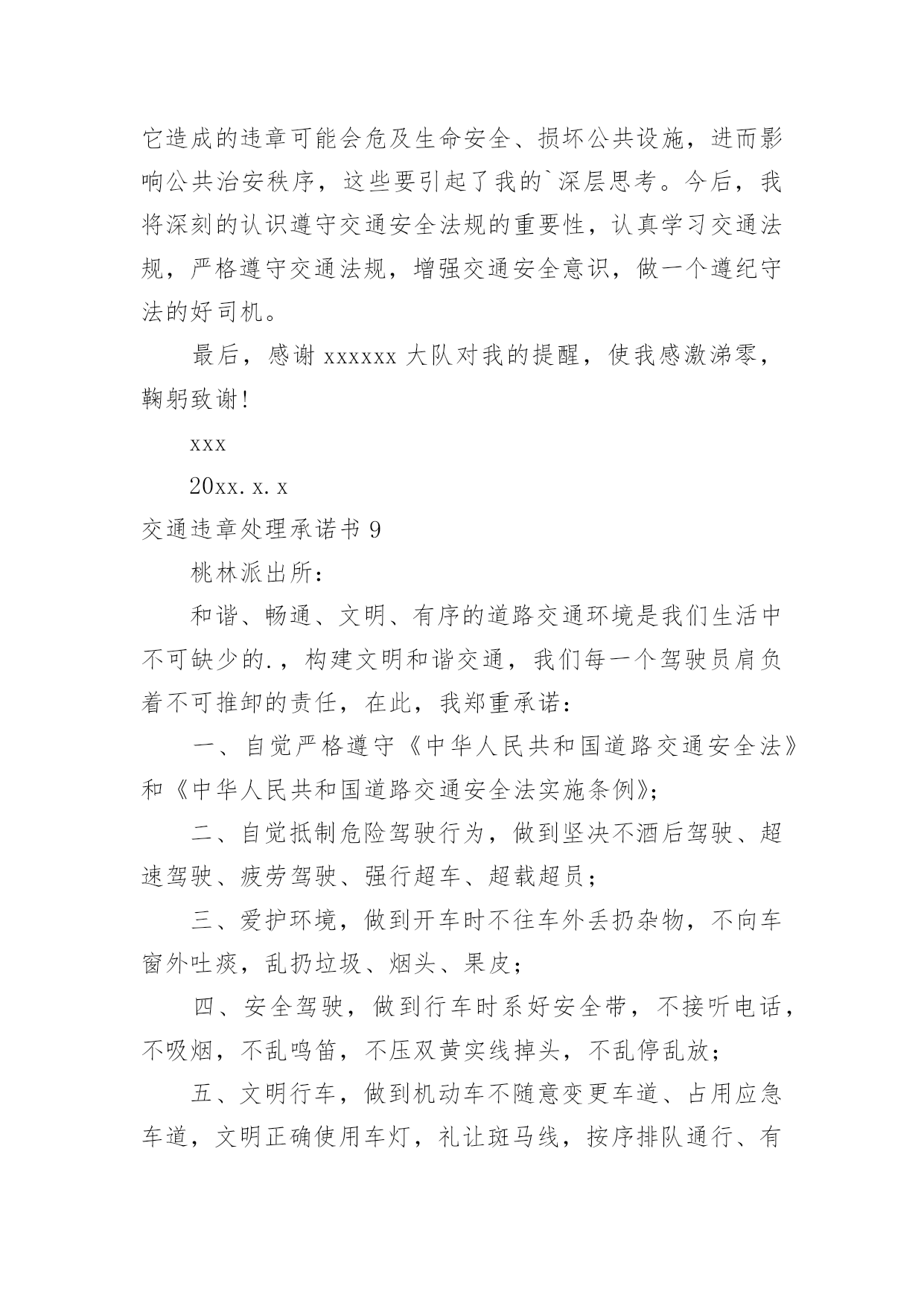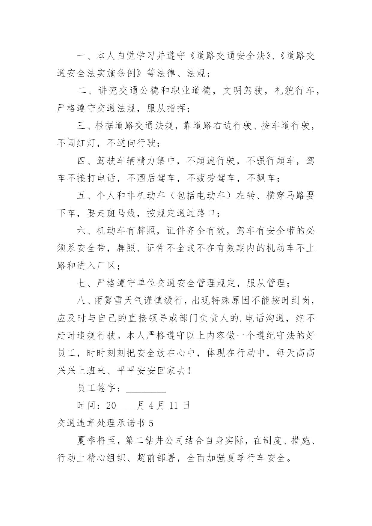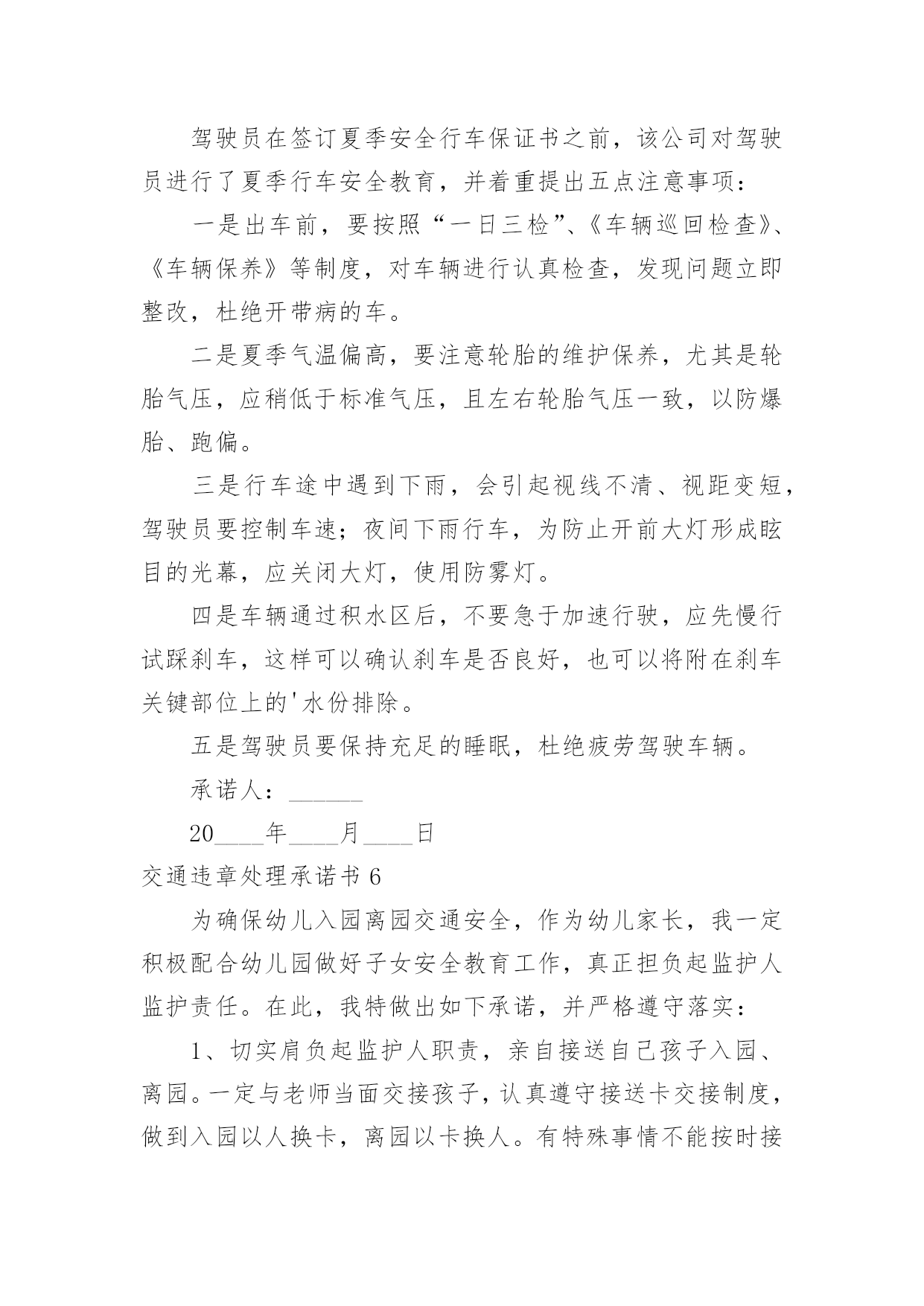 交通违章处理承诺书交通违章处理承诺书在不断进步的社会中,在很多情况下我们需要用到承诺书,承诺书必须在要约的有效期作出。还是对承诺书一筹莫展吗?以下是小编为大家收集的交通违章处理承诺书,供大家参考借鉴,希望可以帮助到有需要的朋友。交通违章处理承诺书1xxxx道路运输管理所:今天,我怀着愧疚和懊悔写下这份保证书书,以表示我对运输管理部门的批评,意识到自己的错误深刻认识改正错误的决心。我这种行为在运管里造成了极其坏的.影响,我真正意识到了这件事情的严重性,所以我今后要听从指挥,充分领会理解运输管理所部门的.要求,并保证不会(有类似)的事情发生.希望运输管理所给我改过自新的机会,对于这一切我还将进一步深入总结,深刻反省,恳请运输管理部门相信我能够吸取教训、改正错误!XXXXXX年XX月XX日交通违章处理承诺书2为预防和减少道路交通事故,作为一名烟台打捞局的驾驶员,为维护我局安全、有序良好的交通安全形势,保护我局广大职工的'生命和财产安全,本着“对生命负责、对家庭负责、对打捞事业负责”的态度,现承诺如下:一、遵章守纪。严格遵守国家的道路交通安全法和相关法律法规,认真执行我局的各项规章制度,尽最大努力避免一切交通事故的发生。不断学习新颁布的交通法规,增强安全意识,提高驾驶素质。二、服从安全管理。自觉接受社会各界监督,不论在任何情况下,都要把安全工作放在第一位,发挥驾驶员的先锋模范作用和表率作用。三、服从调度。严格执行派车程序,不私自出车办私事,按指定地点存车,按规定线路行车。四、不违法行车。不违章行驶,不违规操作,不酒后驾车,不疲劳驾驶,不超速行驶,不乱停乱放等。五、爱护车辆。要按规定进行保养,发现故障及时报告,及时排除,及时维修。车辆外表不私自乱贴标志广告。车内不乱扔乱挂东西,不吸烟,不吐痰,经常清扫整理,保持卫生清洁。六、如在职责范围内发生交通事故、车辆损坏或造成其它工作中的失误,本人愿接受交通管理部门和单位相关规一定的处罚。承诺人:______20____年____月____日交通违章处理承诺书3为积极落实《致全县广大机关干部职工和公职人员的一封信》的指示精神,进一步增强交通安全意识,我郑重承诺:1、以身作则,自觉遵守《道路交通安全法》等法律法规。2、做好全体干部职工特别是司机的宣传教育工作,提高干部职工的交通安全意识,制定切实可行的措施和奖罚制度规范交通安全行为。3、教育引导身边的`亲属、朋友,自觉遵守机动车礼让斑马线、机动车按序排队通行、机动车有序停放、文明使用车灯、行人/非机动车各行其道、行人/非机动车过街遵守信号等文明交通行为等“六大文明交通行为”。4、自觉摒弃机动车随意变更车道、占用应急车道、开车打手机、不系安全带、驾乘摩托车不戴头盔、行人过街跨越隔离设施等“六大交通陋习”。5、自觉抵制酒后驾驶、超速行驶、疲劳驾驶、闯红灯、强行超车、超员/超载等“六大危险驾驶行为”,维护正常的交通秩序和良好的城市形象。6、对他人不文明的交通陋习和交通违法行为要敢于当面批评教育,及时纠正制止。承诺人:______20____年____月____日交通违章处理承诺书4为了提高自身道路交通中的安全意识,保证自身上下班途中的人身安全,更好地防止意外交通事故给个人、家庭及企业带来伤害或损失,特签订本安全承诺书。一、本人自觉学习并遵守《道路交通安全法》、《道路交通安全法实施条例》等法律、法规;二、讲究交通公德和职业道德,文明驾驶,礼貌行车,严格遵守交通法规,服从指挥;三、根据道路交通法规,靠道路右边行驶、按车道行驶,不闯红灯,不逆向行驶;四、驾驶车辆精力集中,不超速行驶,不强行超车,驾车不接打电话,不酒后驾车,不疲劳驾车,不飙车;五、个人和非机动车(包括电动车)左转、横穿马路要下车,要走斑马线,按规定通过路口;六、机动车有牌照,证件齐全有效,驾车有安全带的必须系安全带,牌照、证件不全或不在有效期内的机动车不上路和进入厂区;七、严格遵守单位交通安全管理规定,服从管理;八、雨雾雪天气谨慎缓行,出现特殊原因不能按时到岗,应及时与自己的直接领导或部门负责人的.电话沟通,绝不赶时违规行驶。本人严格遵守以上内容做一个遵纪守法的好员工,时时刻刻把安全放在心中,体现在行动中,每天高高兴兴上班来、平平安安回家去!员工签字:________时间:20____月4月11日交通违章处理承诺书5夏季将至,第二钻井公司结合自身实际,在制度、措施、行动上精心组织、超前部署,全面加强夏季行车安全。驾驶员在签订夏季安全行车保证书之前,该公司对驾驶员进行了夏季行车安全教育,并着重提出五点注意事项:一是出车前,要按照“一日三检”、《车辆巡回检查》、《车辆保养》等制度,对车辆进行认真检查,发现问题立即整改,杜绝开带病的车。二是夏季气温偏高,要注意轮胎的维护保养,尤其是轮胎气压,应稍低于