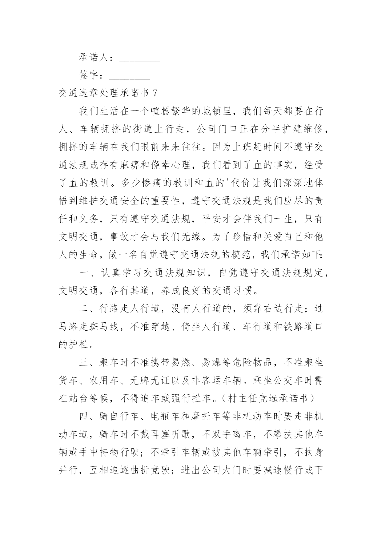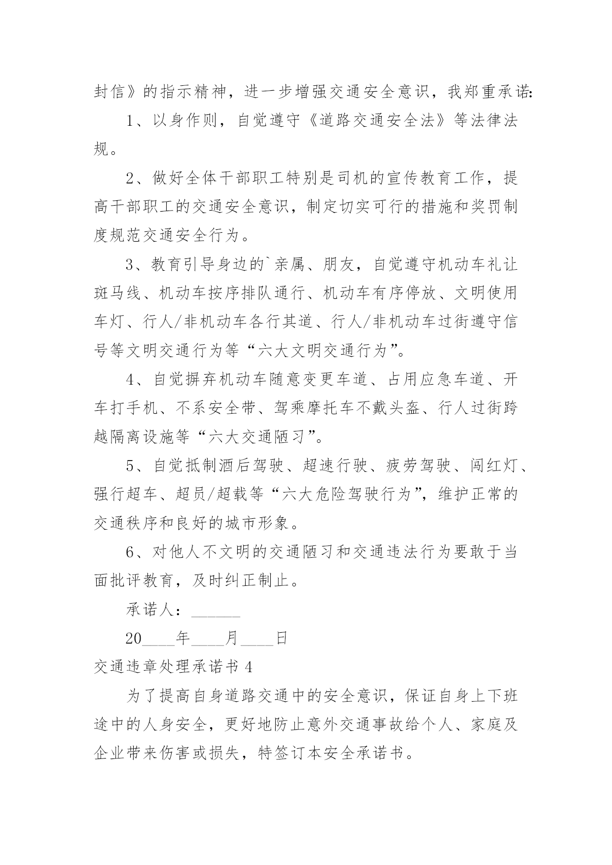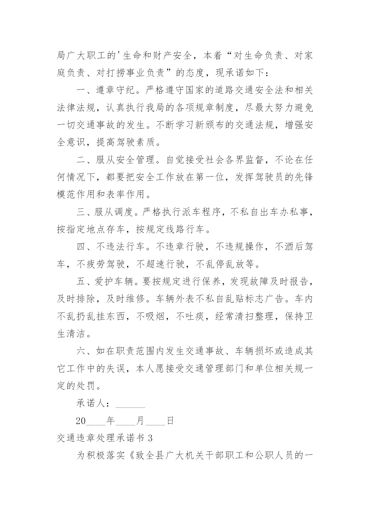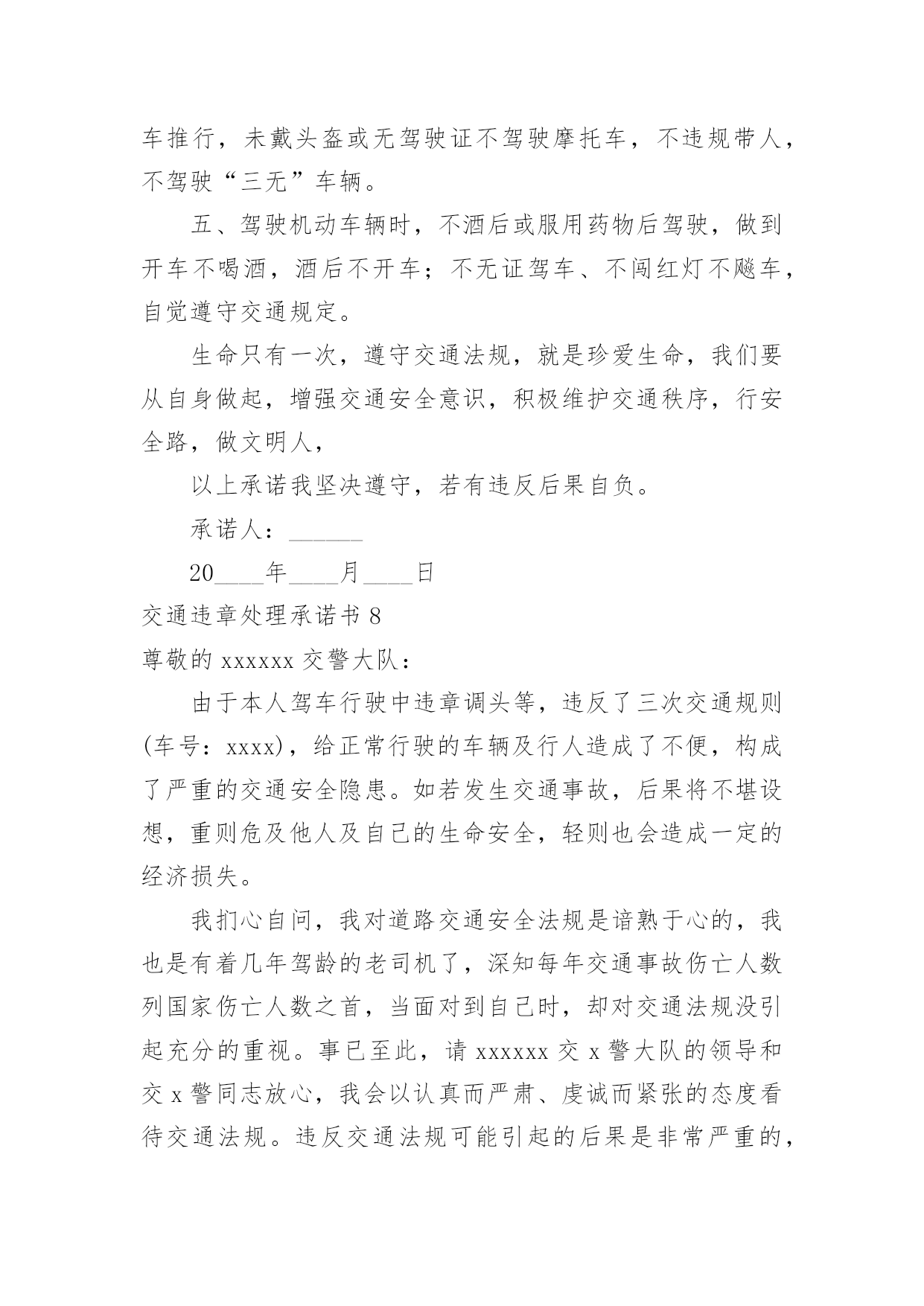 交通违章处理承诺书交通违章处理承诺书在不断进步的社会中,在很多情况下我们需要用到承诺书,承诺书必须在要约的有效期作出。还是对承诺书一筹莫展吗?以下是小编为大家收集的交通违章处理承诺书,供大家参考借鉴,希望可以帮助到有需要的朋友。交通违章处理承诺书1xxxx道路运输管理所:今天,我怀着愧疚和懊悔写下这份保证书书,以表示我对运输管理部门的批评,意识到自己的错误深刻认识改正错误的决心。我这种行为在运管里造成了极其坏的.影响,我真正意识到了这件事情的严重性,所以我今后要听从指挥,充分领会理解运输管理所部门的.要求,并保证不会(有类似)的事情发生.希望运输管理所给我改过自新的机会,对于这一切我还将进一步深入总结,深刻反省,恳请运输管理部门相信我能够吸取教训、改正错误!XXXXXX年XX月XX日交通违章处理承诺书2为预防和减少道路交通事故,作为一名烟台打捞局的驾驶员,为维护我局安全、有序良好的交通安全形势,保护我局广大职工的'生命和财产安全,本着“对生命负责、对家庭负责、对打捞事业负责”的态度,现承诺如下:一、遵章守纪。严格遵守国家的道路交通安全法和相关法律法规,认真执行我局的各项规章制度,尽最大努力避免一切交通事故的发生。不断学习新颁布的交通法规,增强安全意识,提高驾驶素质。二、服从安全管理。自觉接受社会各界监督,不论在任何情况下,都要把安全工作放在第一位,发挥驾驶员的先锋模范作用和表率作用。三、服从调度。严格执行派车程序,不私自出车办私事,按指定地点存车,按规定线路行车。四、不违法行车。不违章行驶,不违规操作,不酒后驾车,不疲劳驾驶,不超速行驶,不乱停乱放等。五、爱护车辆。要按规定进行保养,发现故障及时报告,及时排除,及时维修。车辆外表不私自乱贴标志广告。车内不乱扔乱挂东西,不吸烟,不吐痰,经常清扫整理,保持卫生清洁。六、如在职责范围内发生交通事故、车辆损坏或造成其它工作中的失误,本人愿接受交通管理部门和单位相关规一定的处罚。承诺人:______20____年____月____日交通违章处理承诺书3为积极落实《致全县广大机关干部职工和公职人员的一封信》的指示精神,进一步增强交通安全意识,我郑重承诺:1、以身作则,自觉遵守《道路交通安全法》等法律法规。2、做好全体干部职工特别是司机的宣传教育工作,提高干部职工的交通安全意识,制定切实可行的措施和奖罚制度规范交通安全行为。3、教育引导身边的`亲属、朋友,自觉遵守机动车礼让斑马线、机动车按序排队通行、机动车有序停放、文明使用车灯、行人/非机动车各行其道、行人/非机动车过街遵守信号等文明交通行为等“六大文明交通行为”。4、自觉摒弃机动车随意变更车道、占用应急车道、开车打手机、不系安全带、驾乘摩托车不戴头盔、行人过街跨越隔离设施等“六大交通陋习”。5、自觉抵制酒后驾驶、超速行驶、疲劳驾驶、闯红灯、强行超车、超员/超载等“六大危险驾驶行为”,维护正常的交通秩序和良好的城市形象。6、对他人不文明的交通陋习和交通违法行为要敢于当面批评教育,及时纠正制止。承诺人:______20____年____月____日交通违章处理承诺书4为了提高自身道路交通中的安全意识,保证自身上下班途中的人身安全,更好地防止意外交通事故给个人、家庭及企业带来伤害或损失,特签订本安全承诺书。一、本人自觉学习并遵守《道路交通安全法》、《道路交通安全法实施条例》等法律、法规;二、讲究交通公德和职业道德,文明驾驶,礼貌行车,严格遵守交通法规,服从指挥;三、根据道路交通法规,靠道路右边行驶、按车道行驶,不闯红灯,不逆向行驶;四、驾驶车辆精力集中,不超速行驶,不强行超车,驾车不接打电话,不酒后驾车,不疲劳驾车,不飙车;五、个人和非机动车(包括电动车)左转、横穿马路要下车,要走斑马线,按规定通过路口;六、机动车有牌照,证件齐全有效,驾车有安全带的必须系安全带,牌照、证件不全或不在有效期内的机动车不上路和进入厂区;七、严格遵守单位交通安全管理规定,服从管理;八、雨雾雪天气谨慎缓行,出现特殊原因不能按时到岗,应及时与自己的直接领导或部门负责人的.电话沟通,绝不赶时违规行驶。本人严格遵守以上内容做一个遵纪守法的好员工,时时刻刻把安全放在心中,体现在行动中,每天高高兴兴上班来、平平安安回家去!员工签字:________时间:20____月4月11日交通违章处理承诺书5夏季将至,第二钻井公司结合自身实际,在制度、措施、行动上精心组织、超前部署,全面加强夏季行车安全。驾驶员在签订夏季安全行车保证书之前,该公司对驾驶员进行了夏季行车安全教育,并着重提出五点注意事项:一是出车前,要按照“一日三检”、《车辆巡回检查》、《车辆保养》等制度,对车辆进行认真检查,发现问题立即整改,杜绝开带病的车。二是夏季气温偏高,要注意轮胎的维护保养,尤其是轮胎气压,应稍低于
