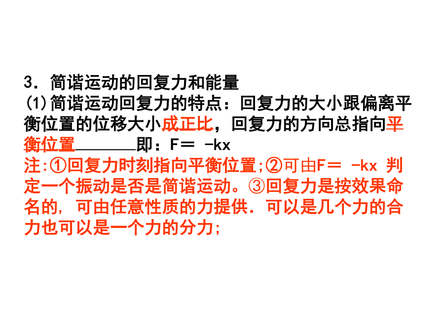 物理选修3-4机械振动与机械波复习课件一、简谐运动1、定义:如果质点的位移与时间的关系遵从正弦函数的规律,即它的振动图象是一条正弦曲线,这样的振动叫简谐运动.F回=-kx2、简谐运动的描述(1)描述简谐运动的物理量①位移x:由平衡位置指向质点所在位置的有向线段,是矢量。注:位移的参考点是平衡位置②振幅A:振动物体离开平衡位置的最大距离,是标量,表示振动的强弱.③周期T和频率f:物体完成一次所需的时间叫周期,而频率则等于单位时间内完成全振动的次数,它们是表示振动快慢的物理量.二者互为倒数关系.注:简谐振动的周期和频率由振动系统自身的性质决定,和振幅无关.(2)简谐运动的表达式x=Asin(ωt+φ).注:ω=______(3)简谐运动的图象①物理意义:表示振子的位移随时间变化的规律,为正弦(或余弦)曲线.(不是轨迹)3.简谐运动的回复力和能量(1)简谐运动回复力的特点:回复力的大小跟偏离平衡位置的位移大小成正比,回复力的方向总指向平衡位置即:F=-kx注:①回复力时刻指向平衡位置;②可由F=-kx判定一个振动是否是简谐运动。③回复力是按效果命名的,可由任意性质的力提供.可以是几个力的合力也可以是一个力的分力;(2)弹簧振子和单摆的回复力水平弹簧振子的回复力为弹簧弹力;竖直悬挂的弹簧振子的回复力是弹力和重力的合力;单摆的回复力是摆球所受重力在圆周切线方向的分力.注:单摆振动的回复力是重力的切向分力,不能说成是重力和拉力的合力。在平衡位置振子所受回复力是零,但合力是向心力,指向悬点,不为零。(3)简谐运动的能量简谐运动过程中动能和势能相互转化,机械能守恒.振动能量与振幅有关,振幅越大,能量越大.4简谐振动的两个模型(1)弹簧振子(2)单摆当摆角很小时(小于10°)时,单摆可以近似看做简谐运动.其周期,与摆球质量m、振幅A都无关。其中l为摆长,表示从悬点到摆球质心的距离,要区分摆长和摆线长。(3)小球在光滑圆弧上的往复滚动,和单摆完全等同。只要摆角足够小,这个振动就是简谐运动。这时周期公式中的l应该是圆弧半径R二、受迫振动和共振1.受迫振动:物体在周期性驱动力作用下的振动.做受迫振动的物体,它的周期或频率等于驱动力的周期或频率,而与物体的固有周期或频率无关.2.共振:做受迫振动的物体,它的固有频率与驱动力的频率越接近,其振幅就越大,当二者相等时,振幅达到最大,这就是共振现象.共振曲线如图1-4所示.三、机械波1.定义:机械振动在介质中的传播形成机械波.2.产生条件:一是要有做机械振动的物体作为波源,二是要有能够传播机械振动的介质.机械波的传播特点(规律):(1)各质点都做受迫振动,起振方向都和波源的起振方向相同;且其振动频率(周期)都等于波源的振动频率(周期),但离波源越远的质点振动越滞后。(2)机械波传播的是波源的振动形式(波形)和波源提供的能量,质点不随波迁移。3.机械波的分类(1)横波:质点的振动方向与波的传播方向垂直,凸起的最高处叫波峰,凹下的最低处叫波谷.(2)纵波:质点的振动方向与波的传播方向在同一直线上,质点分布最密的地方叫密部,质点分布最疏的地方叫疏部.4.描述机械波的物理量(1)波长λ:两个相邻的、在振动过程中对平衡位置的位移总是相等的质点间的距离叫波长.在横波中,两个相邻波峰(或波谷)间的距离等于波长.在纵波中,两个相邻密部(或疏部)间的距离等于波长.(2)频率f:波的频率由波源决定,无论在什么介质中传播,波的频率不变.(3)波速v:单位时间内振动向外传播的距离.波速的大小由介质决定.(1)在同一种均匀介质中机械波的传播是匀速的。波速、波长和频率之间满足公式:v=λf。(2)波由一种介质进入另一种介质,频率不变,波速改变,因此波长改变。5.横波的图象如图1-5所示为一横波的图象.纵坐标表示某一时刻各个质点偏离平衡位置的位移,横坐标表示在波的传播方向上各个质点的平衡位置.它反映了在波传播的过程中,某一时刻介质中各质点的位移在空间的分布.简谐波的图象为正弦曲线.(1)物理意义不同:振动图象表示同一质点在不同时刻的位移(类比录像);波的图象表示介质中的各个质点在同一时刻的位移(类比照片)。(2)图象的横坐标不同:振动图象的横坐标表示时间;波的图象的横坐标表示距离。(3)从振动图象上可以读出振幅和周期;从波的图象上可以读出振幅和波长。6.质点振动方向与波传播方向的互判同侧法:四、波的衍射和干涉1.衍射:波绕过障碍物继续传播的现象.产生明显衍射现象的条件是:障碍物或孔的尺寸比波长小或与波长相差不多.2.波的叠加:几列波相遇时,每列波都能够保持各自的状态继续传播而不互相干扰,只是在重叠的区域里,介质的质点同时参与这几列波引起的振动,质点的位移等于这几列波单独传播时引起的位移的矢量和3.干涉:频率相同的两列波叠加,某些