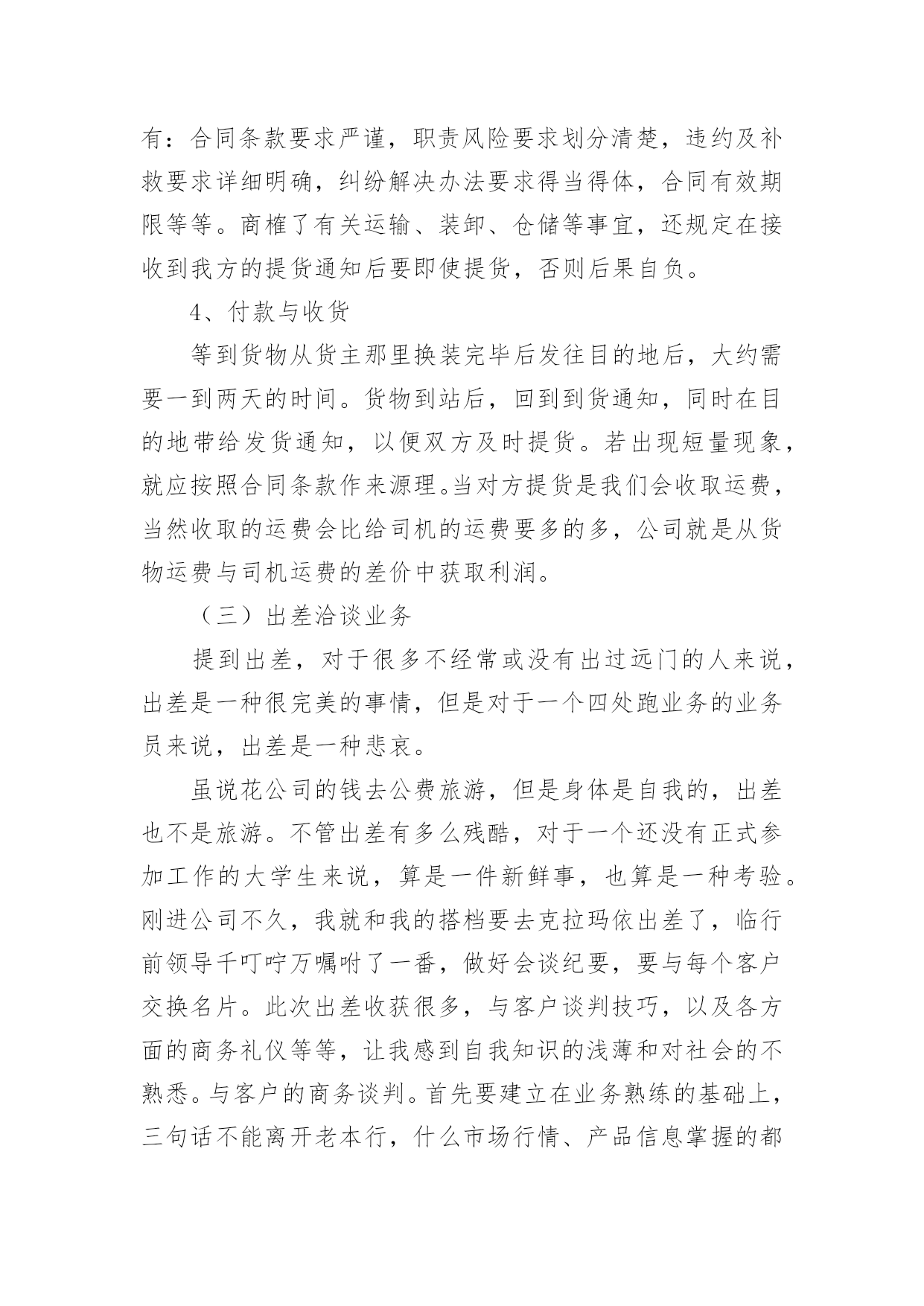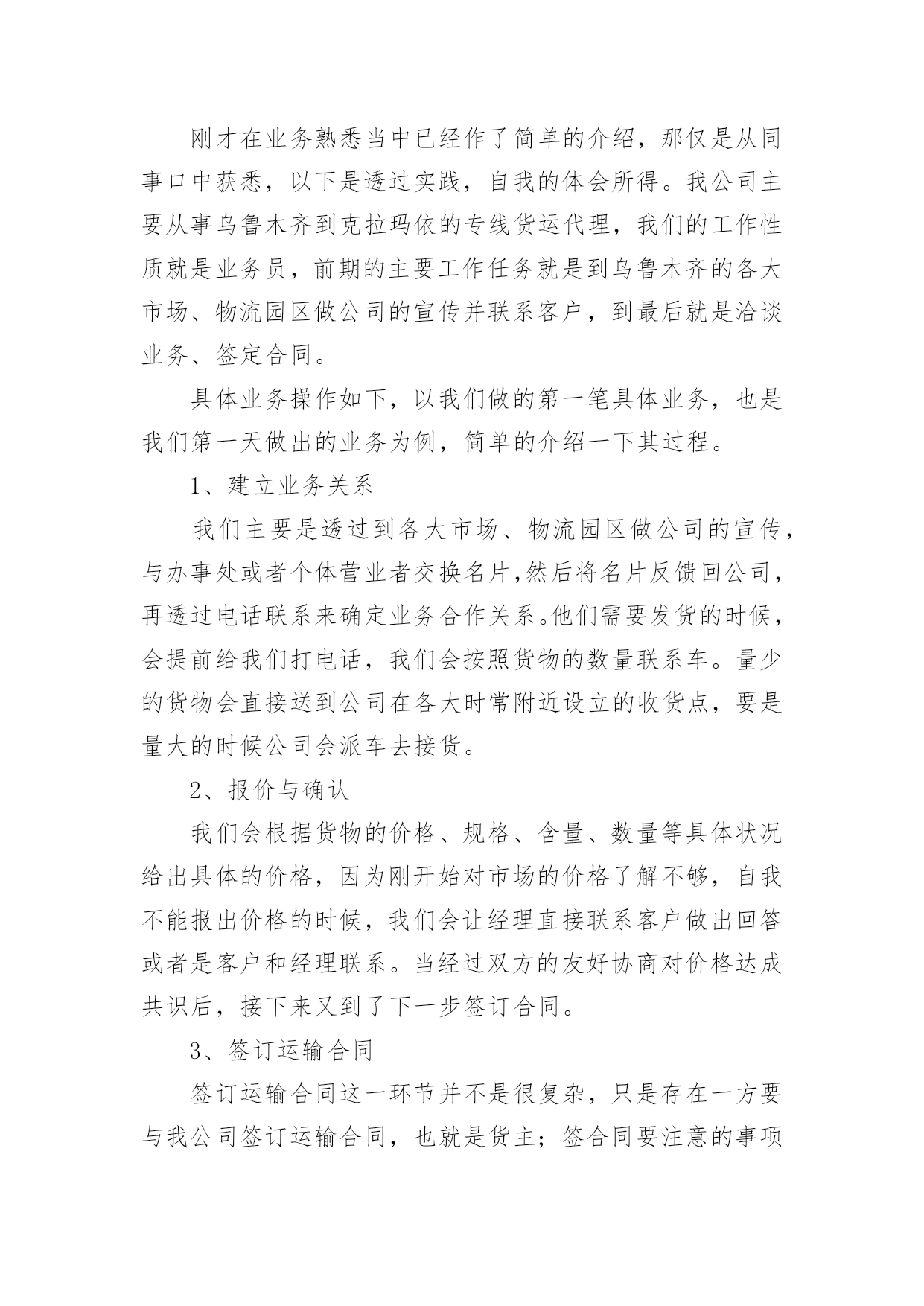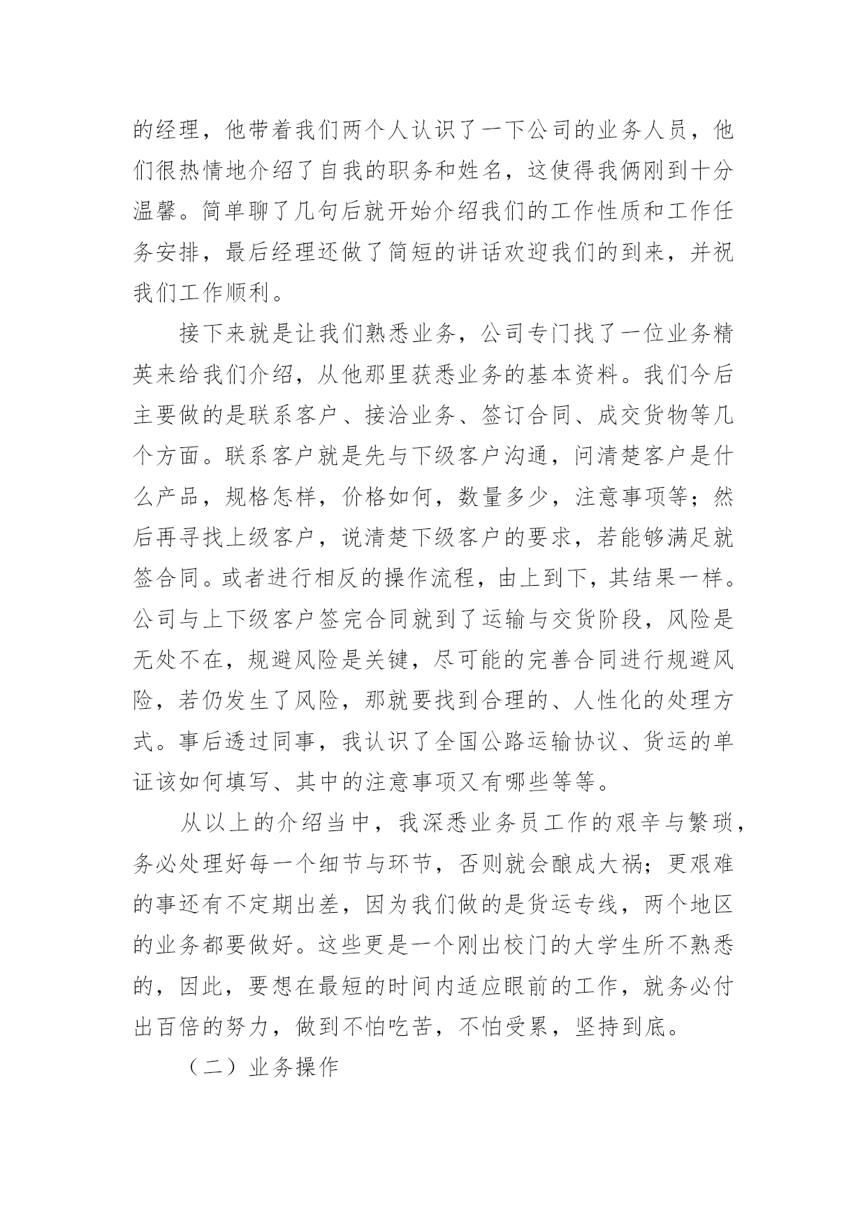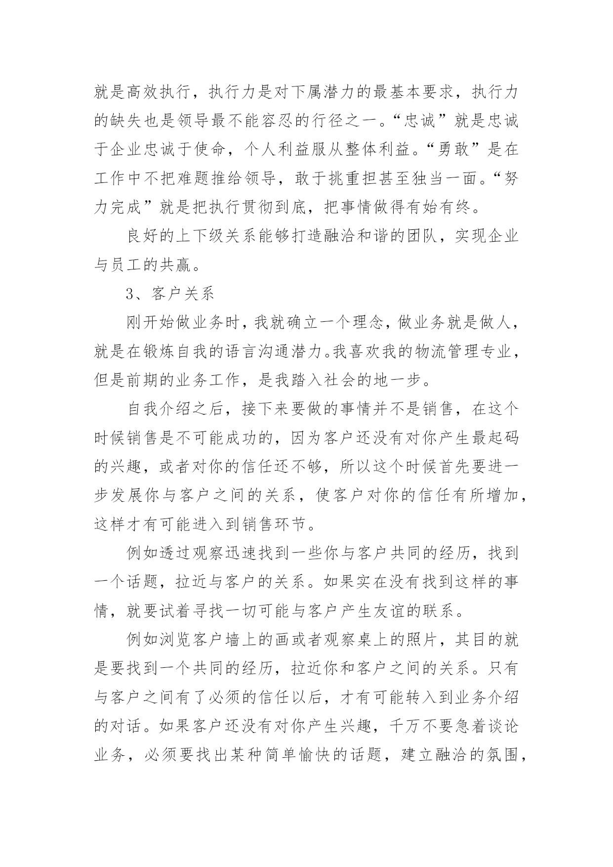 物流实习总结总结是事后对某一阶段的学习或工作情况作加以回顾检查并分析评价的书面材料,它可以提升我们发现问题的能力,让我们来为自己写一份总结吧。那么总结有什么格式呢?下面是小编为大家收集的物流实习总结,希望对大家有所帮助。物流实习总结1一、实习目的初步认识社会,进一步了解货代以及物流运输组织与管理的相关知识,做到学以致用,把从学校学到的理论知识与实际工作中的实践贯穿起来,从社会实践中,逐步完善自我、发展自我,最终完全融入现实生活当中,做一名言出必行、知识与潜力兼备、贴合社会主义发展目标的合格大学生。1、勤学苦练,善于创新,善于思考。2、纸上得来终须浅,绝知此事要躬行。3、灵活处理人际关系。4、严格遵守公司的各项规章制度,切勿感情意气用事。5、要注意安全,做工作要认真。二、实习过程(一)业务熟悉第一天走进宽敞明亮的办公大楼,情绪个性激动,期盼着成为其中的一员。当走进办公室的一刹那,就遇见了当时的经理,他带着我们两个人认识了一下公司的业务人员,他们很热情地介绍了自我的职务和姓名,这使得我俩刚到十分温馨。简单聊了几句后就开始介绍我们的工作性质和工作任务安排,最后经理还做了简短的讲话欢迎我们的到来,并祝我们工作顺利。接下来就是让我们熟悉业务,公司专门找了一位业务精英来给我们介绍,从他那里获悉业务的基本资料。我们今后主要做的是联系客户、接洽业务、签订合同、成交货物等几个方面。联系客户就是先与下级客户沟通,问清楚客户是什么产品,规格怎样,价格如何,数量多少,注意事项等;然后再寻找上级客户,说清楚下级客户的要求,若能够满足就签合同。或者进行相反的操作流程,由上到下,其结果一样。公司与上下级客户签完合同就到了运输与交货阶段,风险是无处不在,规避风险是关键,尽可能的完善合同进行规避风险,若仍发生了风险,那就要找到合理的、人性化的处理方式。事后透过同事,我认识了全国公路运输协议、货运的单证该如何填写、其中的注意事项又有哪些等等。从以上的介绍当中,我深悉业务员工作的艰辛与繁琐,务必处理好每一个细节与环节,否则就会酿成大祸;更艰难的事还有不定期出差,因为我们做的是货运专线,两个地区的业务都要做好。这些更是一个刚出校门的大学生所不熟悉的,因此,要想在最短的时间内适应眼前的工作,就务必付出百倍的努力,做到不怕吃苦,不怕受累,坚持到底。(二)业务操作刚才在业务熟悉当中已经作了简单的介绍,那仅是从同事口中获悉,以下是透过实践,自我的体会所得。我公司主要从事乌鲁木齐到克拉玛依的专线货运代理,我们的工作性质就是业务员,前期的主要工作任务就是到乌鲁木齐的各大市场、物流园区做公司的宣传并联系客户,到最后就是洽谈业务、签定合同。具体业务操作如下,以我们做的第一笔具体业务,也是我们第一天做出的业务为例,简单的介绍一下其过程。1、建立业务关系我们主要是透过到各大市场、物流园区做公司的宣传,与办事处或者个体营业者交换名片,然后将名片反馈回公司,再透过电话联系来确定业务合作关系。他们需要发货的时候,会提前给我们打电话,我们会按照货物的数量联系车。量少的货物会直接送到公司在各大时常附近设立的收货点,要是量大的时候公司会派车去接货。2、报价与确认我们会根据货物的价格、规格、含量、数量等具体状况给出具体的价格,因为刚开始对市场的价格了解不够,自我不能报出价格的时候,我们会让经理直接联系客户做出回答或者是客户和经理联系。当经过双方的友好协商对价格达成共识后,接下来又到了下一步签订合同。3、签订运输合同签订运输合同这一环节并不是很复杂,只是存在一方要与我公司签订运输合同,也就是货主;签合同要注意的事项有:合同条款要求严谨,职责风险要求划分清楚,违约及补救要求详细明确,纠纷解决办法要求得当得体,合同有效期限等等。商榷了有关运输、装卸、仓储等事宜,还规定在接收到我方的提货通知后要即使提货,否则后果自负。4、付款与收货等到货物从货主那里换装完毕后发往目的地后,大约需要一到两天的时间。货物到站后,回到到货通知,同时在目的地带给发货通知,以便双方及时提货。若出现短量现象,就应按照合同条款作来源理。当对方提货是我们会收取运费,当然收取的运费会比给司机的运费要多的多,公司就是从货物运费与司机运费的差价中获取利润。(三)出差洽谈业务提到出差,对于很多不经常或没有出过远门的人来说,出差是一种很完美的事情,但是对于一个四处跑业务的业务员来说,出差是一种悲哀。虽说花公司的钱去公费旅游,但是身体是自我的,出差也不是旅游。不管出差有多么残酷,对于一个还没有正式参加工作的大学生来说,算是一件新鲜事,也算是一种考验。刚进公司不久,我就和我的搭档要去克拉玛依出差了,临行前领导千叮咛万嘱咐了一番,做好会谈纪要,要与每个客户交换名片。此次出差收获很多,与客户谈判技巧,以及各方面的商务礼仪等等,让我感到自我知识的浅薄和对