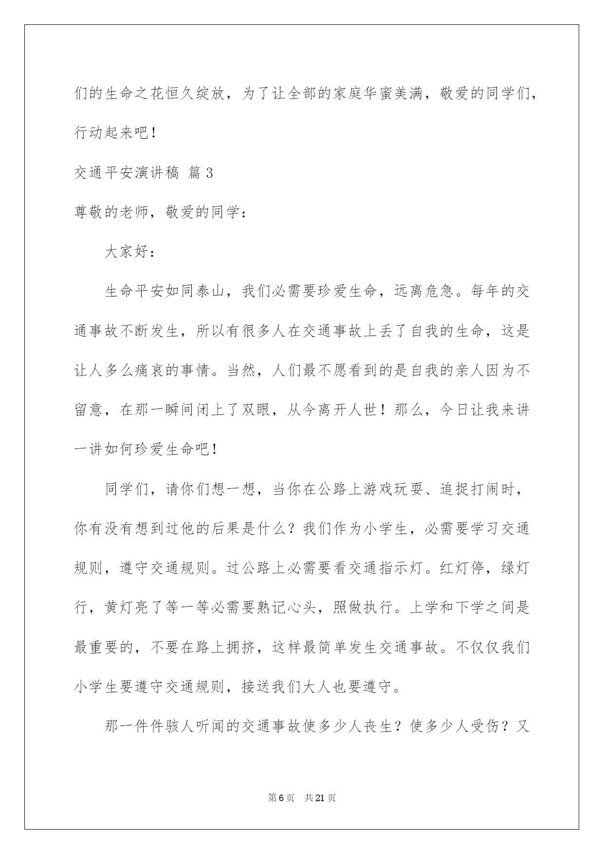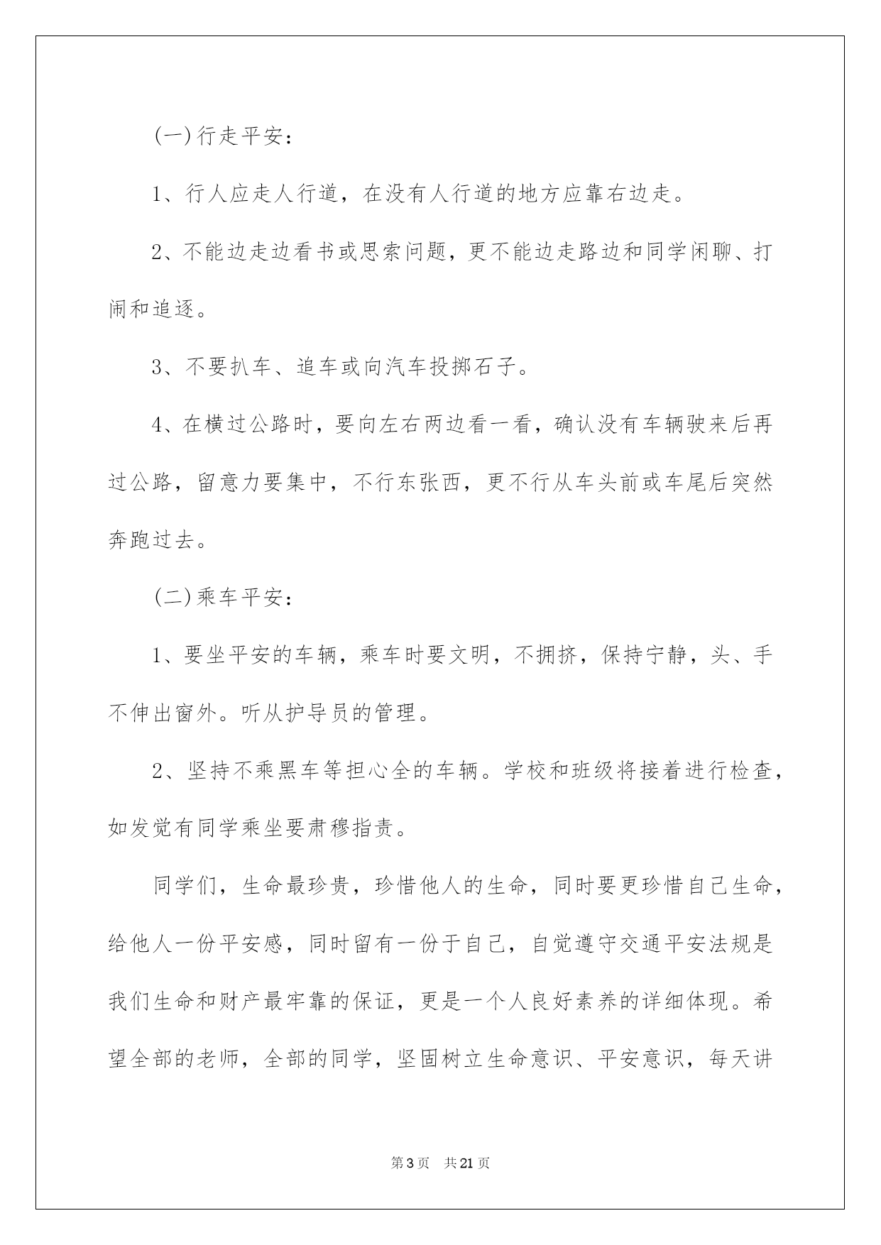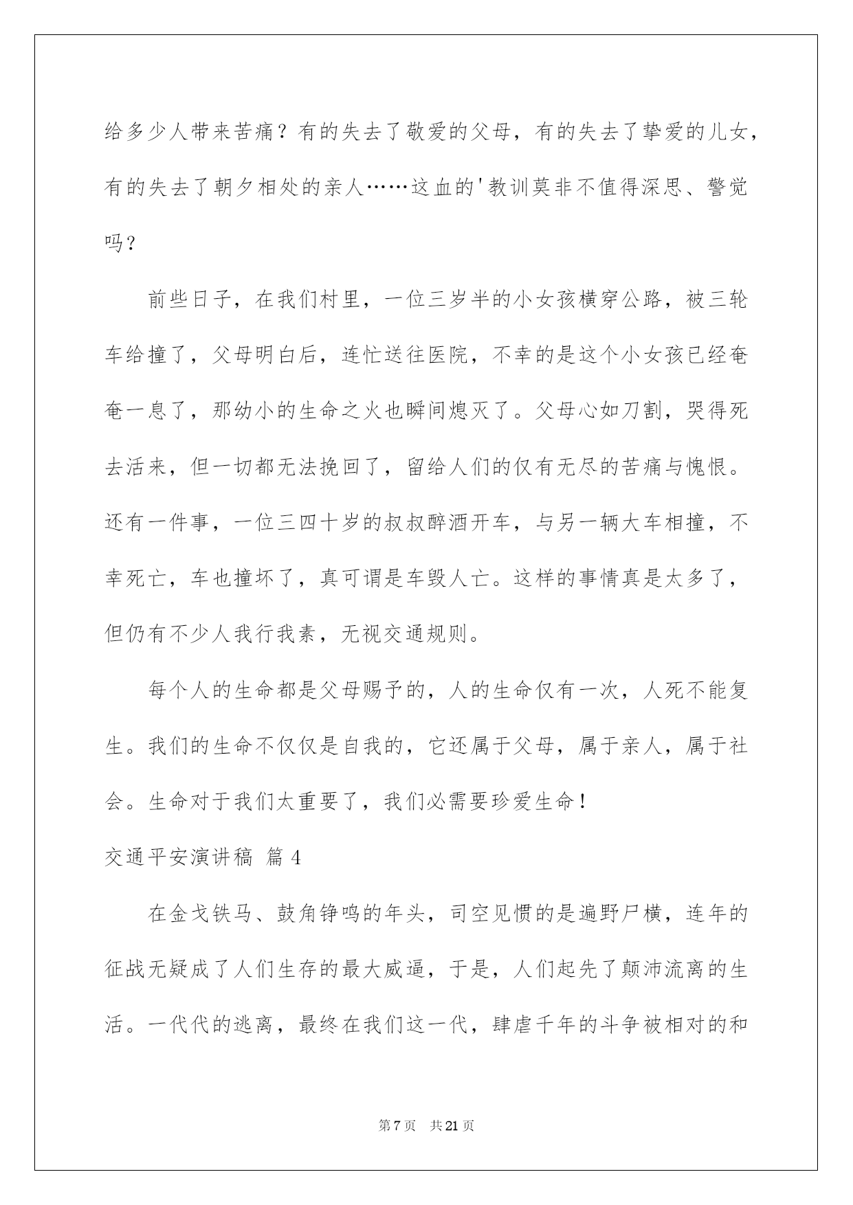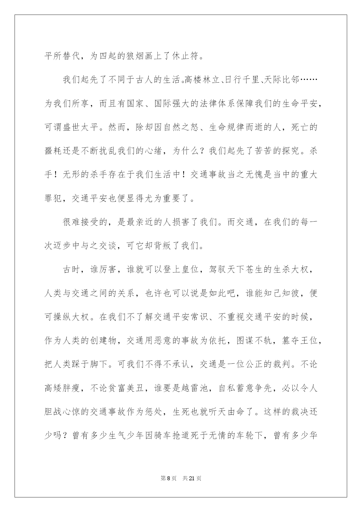 第PAGE\*Arabic\*MERGEFORMAT21页共NUMPAGES\*Arabic\*MERGEFORMAT21页第PAGE\*MERGEFORMAT21页共NUMPAGES\*MERGEFORMAT21页第PAGE\*MERGEFORMAT21页共NUMPAGES\*MERGEFORMAT21页第PAGE\*MERGEFORMAT21页共NUMPAGES\*MERGEFORMAT21页第PAGE\*MERGEFORMAT21页共NUMPAGES\*MERGEFORMAT21页第PAGE\*MERGEFORMAT21页共NUMPAGES\*MERGEFORMAT21页第PAGE\*MERGEFORMAT21页共NUMPAGES\*MERGEFORMAT21页第PAGE\*MERGEFORMAT21页共NUMPAGES\*MERGEFORMAT21页第PAGE\*MERGEFORMAT21页共NUMPAGES\*MERGEFORMAT21页第PAGE\*MERGEFORMAT21页共NUMPAGES\*MERGEFORMAT21页第PAGE\*MERGEFORMAT21页共NUMPAGES\*MERGEFORMAT21页2022交通安全演讲稿交通平安演讲稿范文汇编九篇演讲稿在写作上具有肯定的格式要求。在日新月异的现代社会中,用到演讲稿的地方越来越多,信任很多人会觉得演讲稿很难写吧,以下是我整理的交通平安演讲稿9篇,仅供参考,大家一起来看看吧。交通平安演讲稿篇1老师们、同学们:今日,我们全校上一节平安教化课,重点讲一下交通平安,我想着重讲两方面的内容:一、交通事故猛于虎。从全国来看,依据国家交通部门的统计,每年全国共发生交通事故数十万多起,死亡数万多人;交通事故已成为危及生命平安的“第一杀手”。在我们身边,也存在着很大的平安隐患。昨天放学后,学校对学生乘车、不乘车状况进行了检查,发觉了很多问题:①有很多学生乘坐三轮车、残疾人车和无营运资质的黑车等担心全交通工具,这些车中许多车证照不全,不具备营运资质。同时,乘车的同学不是坐在车厢内,而是相互拥挤在车厢内。一旦发生事故,后果不可思议。依据教化局的文件要求,乘坐黑车的学生不得评比“三好生”及其他各类先进。希望此类同学和家长多沟通尽量不乘坐黑车。②乘车的学生也存在不少问题,比如:有座位不坐,在车上几个人一齐拥挤打闹;不听从护导员管理和护导员打架,谩骂护导员;在车上玩火;车辆行驶中不抓好平安设施,车辆边窗大开;随意不打招呼就不乘车;中途下车等。③行走的部分同学,有的三五成群,有的追追打打,有的不靠右边走,上周我校一位学生在路上玩抖嗡,嗡滚到路中间,他不顾一切去捡,差点出了大事,这些现象都很危急,一不当心,就会出事。所以,学校希望同学们能够珍爱生命,留意平安,让每个家庭和谐华蜜。④学校校长室要求本周起全部不乘车的学生不得从后门离校,一律在班级整好队一同离开学校。你们回家后也要和家长讲清学校的要求,协作支持学校的工作。学校将进行登记检查。二、坚固树立平安意识,切实遵守交通法规。面对上述问题,全体师生都必需增加交通平安意识,严格遵守交通法规。详细要做到:(一)行走平安:1、行人应走人行道,在没有人行道的地方应靠右边走。2、不能边走边看书或思索问题,更不能边走路边和同学闲聊、打闹和追逐。3、不要扒车、追车或向汽车投掷石子。4、在横过公路时,要向左右两边看一看,确认没有车辆驶来后再过公路,留意力要集中,不行东张西,更不行从车头前或车尾后突然奔跑过去。(二)乘车平安:1、要坐平安的车辆,乘车时要文明,不拥挤,保持宁静,头、手不伸出窗外。听从护导员的管理。2、坚持不乘黑车等担心全的车辆。学校和班级将接着进行检查,如发觉有同学乘坐要肃穆指责。同学们,生命最珍贵,珍惜他人的生命,同时要更珍惜自己生命,给他人一份平安感,同时留有一份于自己,自觉遵守交通平安法规是我们生命和财产最牢靠的保证,更是一个人良好素养的详细体现。希望全部的老师,全部的同学,坚固树立生命意识、平安意识,每天讲平安,时时留意平安,到处遵守交通法规,确保每一位师生能高兴奋兴到校,平平安安回家。交通平安演讲稿篇2尊敬的老师、敬爱的同学们:你们好!今日我演讲的题目是《交通平安伴我行》。平安,牵系着每一个人的生活。每当我走在上学、放学的路上,看到“车水马龙”,“人头攒动”的喧闹景象,看到身边疾驰而过的车辆,心里就会产生恐惊感。眼前出现的一幕幕车毁人亡的画面,让我感到胆怯。大家可能看到过这样一个报道:__年__月__日,是个阳光明媚的日子。__县其次中学的几百名师生正在公路边跑操,突