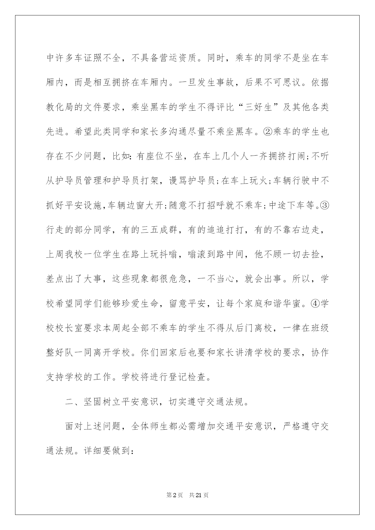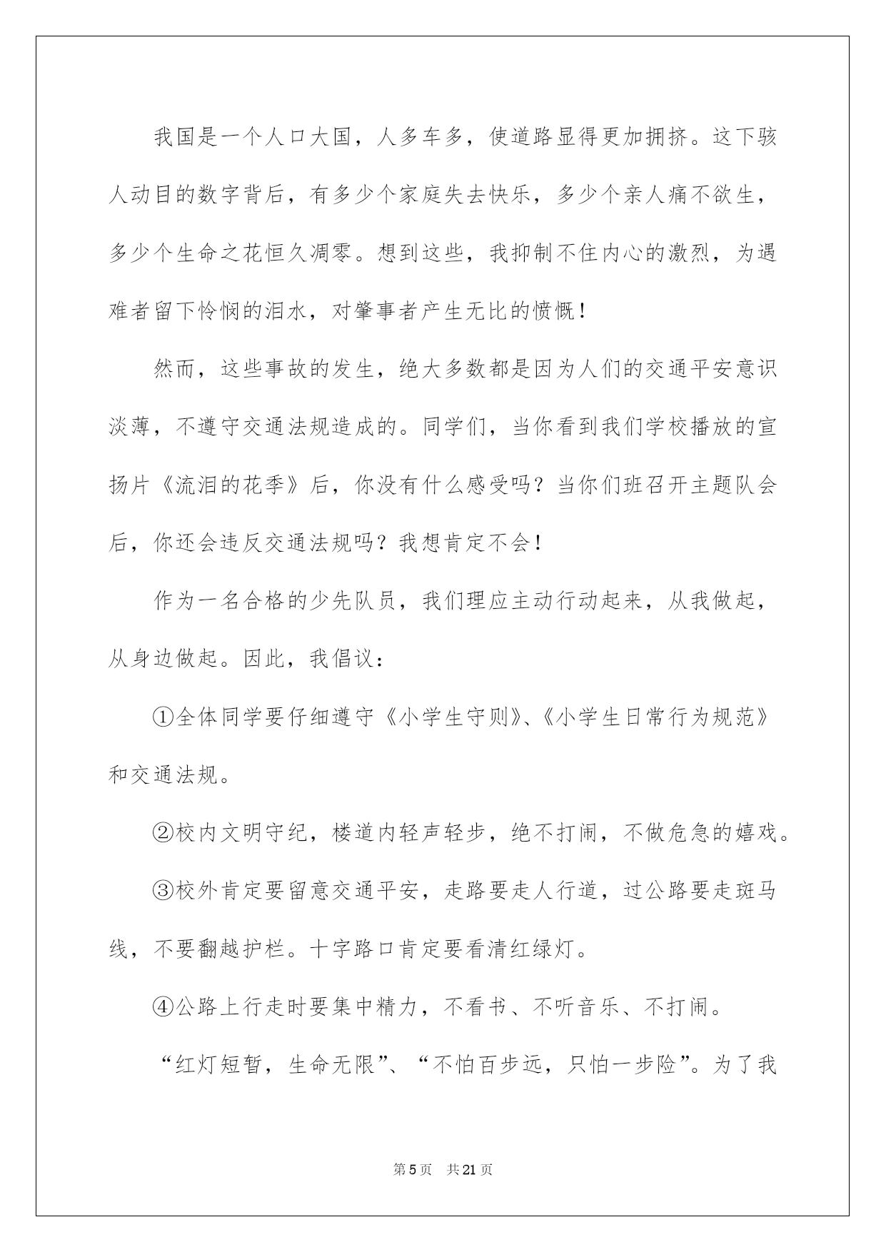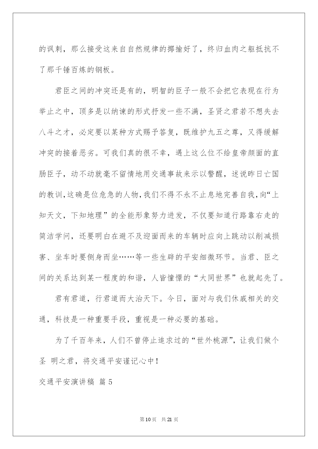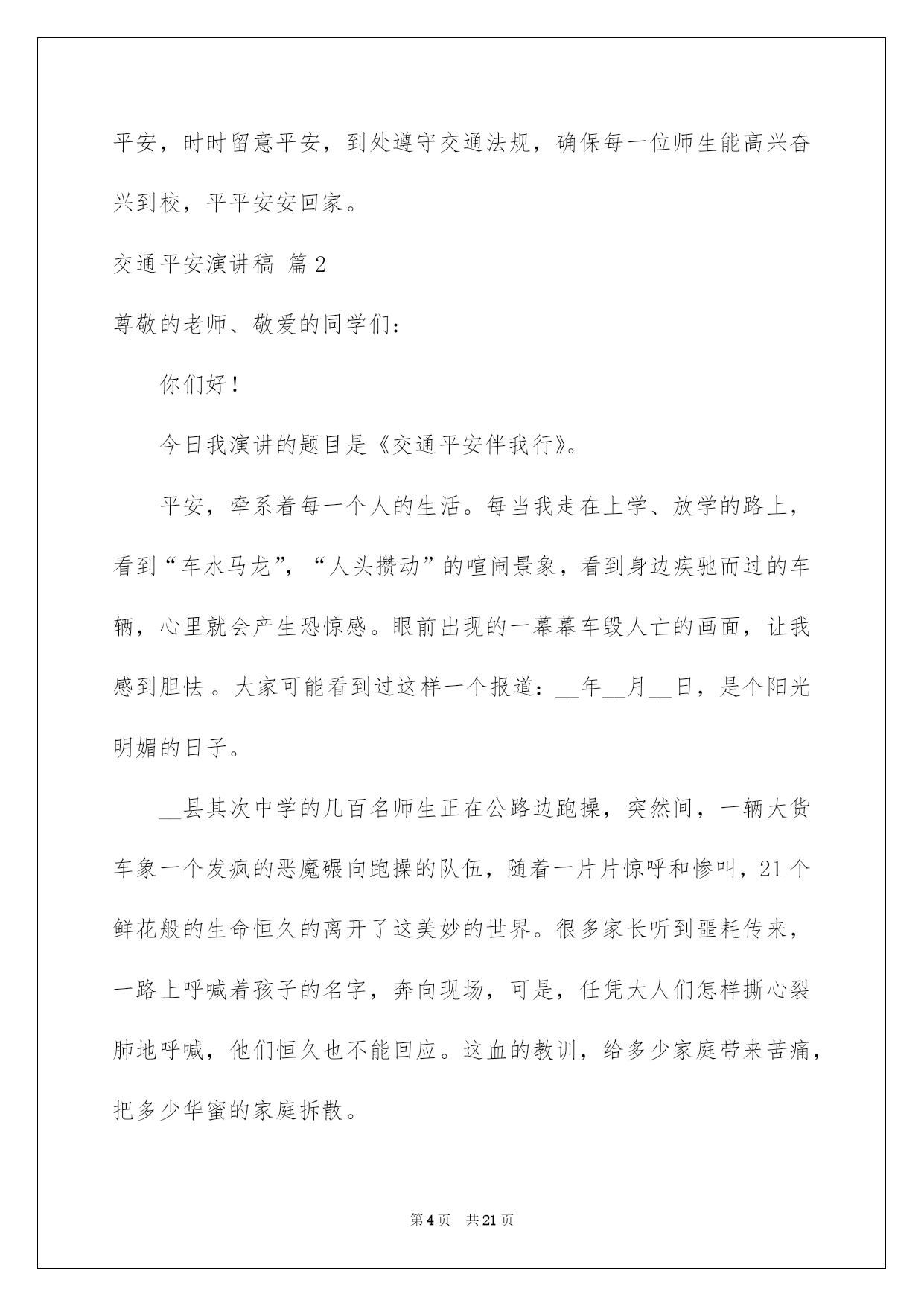 第PAGE\*Arabic\*MERGEFORMAT21页共NUMPAGES\*Arabic\*MERGEFORMAT21页第PAGE\*MERGEFORMAT21页共NUMPAGES\*MERGEFORMAT21页第PAGE\*MERGEFORMAT21页共NUMPAGES\*MERGEFORMAT21页第PAGE\*MERGEFORMAT21页共NUMPAGES\*MERGEFORMAT21页第PAGE\*MERGEFORMAT21页共NUMPAGES\*MERGEFORMAT21页第PAGE\*MERGEFORMAT21页共NUMPAGES\*MERGEFORMAT21页第PAGE\*MERGEFORMAT21页共NUMPAGES\*MERGEFORMAT21页第PAGE\*MERGEFORMAT21页共NUMPAGES\*MERGEFORMAT21页第PAGE\*MERGEFORMAT21页共NUMPAGES\*MERGEFORMAT21页第PAGE\*MERGEFORMAT21页共NUMPAGES\*MERGEFORMAT21页第PAGE\*MERGEFORMAT21页共NUMPAGES\*MERGEFORMAT21页2022交通安全演讲稿交通平安演讲稿范文汇编九篇演讲稿在写作上具有肯定的格式要求。在日新月异的现代社会中,用到演讲稿的地方越来越多,信任很多人会觉得演讲稿很难写吧,以下是我整理的交通平安演讲稿9篇,仅供参考,大家一起来看看吧。交通平安演讲稿篇1老师们、同学们:今日,我们全校上一节平安教化课,重点讲一下交通平安,我想着重讲两方面的内容:一、交通事故猛于虎。从全国来看,依据国家交通部门的统计,每年全国共发生交通事故数十万多起,死亡数万多人;交通事故已成为危及生命平安的“第一杀手”。在我们身边,也存在着很大的平安隐患。昨天放学后,学校对学生乘车、不乘车状况进行了检查,发觉了很多问题:①有很多学生乘坐三轮车、残疾人车和无营运资质的黑车等担心全交通工具,这些车中许多车证照不全,不具备营运资质。同时,乘车的同学不是坐在车厢内,而是相互拥挤在车厢内。一旦发生事故,后果不可思议。依据教化局的文件要求,乘坐黑车的学生不得评比“三好生”及其他各类先进。希望此类同学和家长多沟通尽量不乘坐黑车。②乘车的学生也存在不少问题,比如:有座位不坐,在车上几个人一齐拥挤打闹;不听从护导员管理和护导员打架,谩骂护导员;在车上玩火;车辆行驶中不抓好平安设施,车辆边窗大开;随意不打招呼就不乘车;中途下车等。③行走的部分同学,有的三五成群,有的追追打打,有的不靠右边走,上周我校一位学生在路上玩抖嗡,嗡滚到路中间,他不顾一切去捡,差点出了大事,这些现象都很危急,一不当心,就会出事。所以,学校希望同学们能够珍爱生命,留意平安,让每个家庭和谐华蜜。④学校校长室要求本周起全部不乘车的学生不得从后门离校,一律在班级整好队一同离开学校。你们回家后也要和家长讲清学校的要求,协作支持学校的工作。学校将进行登记检查。二、坚固树立平安意识,切实遵守交通法规。面对上述问题,全体师生都必需增加交通平安意识,严格遵守交通法规。详细要做到:(一)行走平安:1、行人应走人行道,在没有人行道的地方应靠右边走。2、不能边走边看书或思索问题,更不能边走路边和同学闲聊、打闹和追逐。3、不要扒车、追车或向汽车投掷石子。4、在横过公路时,要向左右两边看一看,确认没有车辆驶来后再过公路,留意力要集中,不行东张西,更不行从车头前或车尾后突然奔跑过去。(二)乘车平安:1、要坐平安的车辆,乘车时要文明,不拥挤,保持宁静,头、手不伸出窗外。听从护导员的管理。2、坚持不乘黑车等担心全的车辆。学校和班级将接着进行检查,如发觉有同学乘坐要肃穆指责。同学们,生命最珍贵,珍惜他人的生命,同时要更珍惜自己生命,给他人一份平安感,同时留有一份于自己,自觉遵守交通平安法规是我们生命和财产最牢靠的保证,更是一个人良好素养的详细体现。希望全部的老师,全部的同学,坚固树立生命意识、平安意识,每天讲平安,时时留意平安,到处遵守交通法规,确保每一位师生能高兴奋兴到校,平平安安回家。交通平安演讲稿篇2尊敬的老师、敬爱的同学们:你们好!今日我演讲的题目是《交通平安伴我行》。平安,牵系着每一个人的生活。每当我走在上学、放学的路上,看到“车水马龙”,“人头攒动”的喧闹景象,看到身边疾驰而过的车辆,心里就会产生恐惊感。眼前出现的一幕幕车毁人亡的画面,让我感到胆怯。大家可能看到过这样一个报道:__年__月__日,是个阳光明媚的日子。__县其次中学的几百名师生正在公路边跑操,突