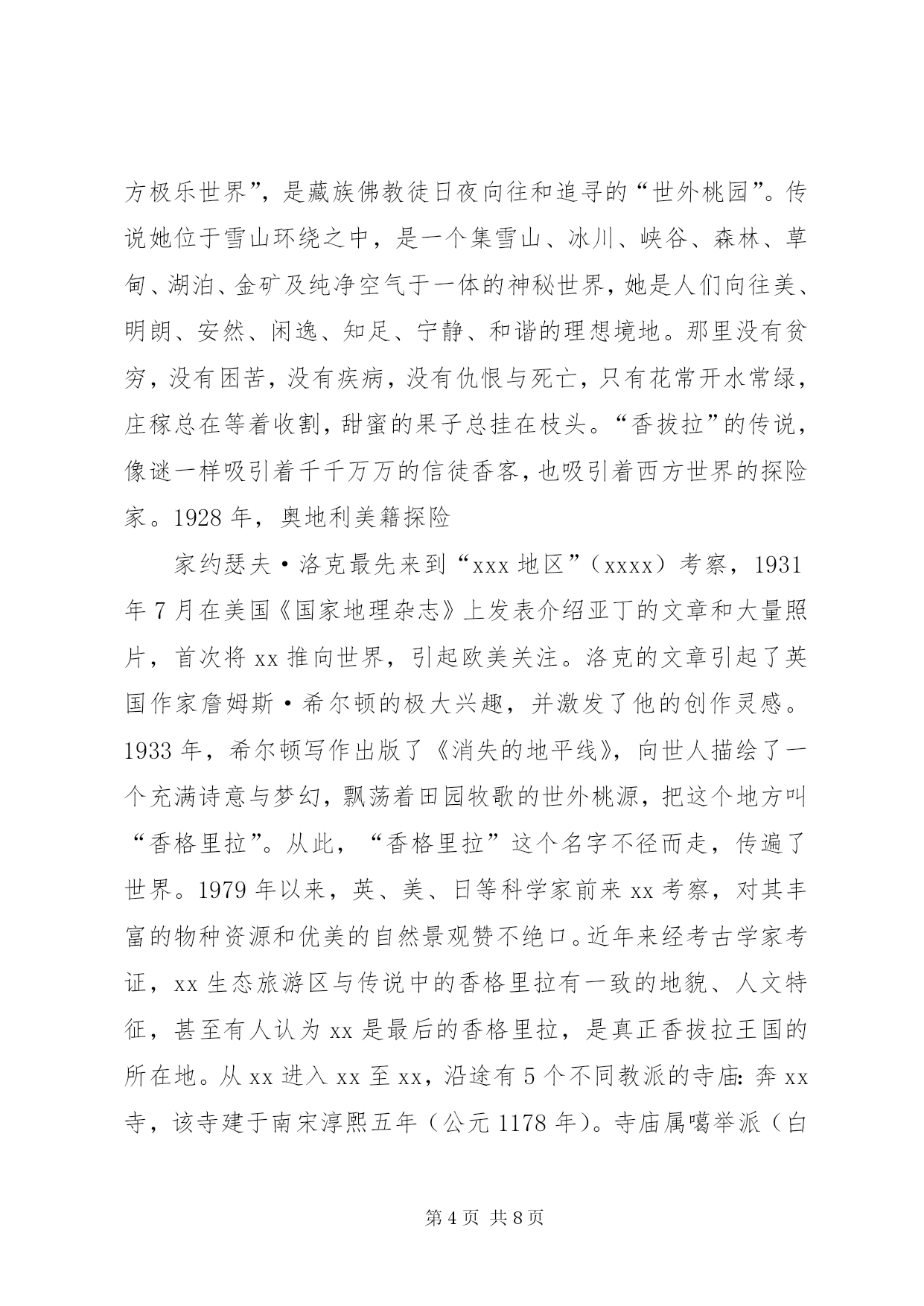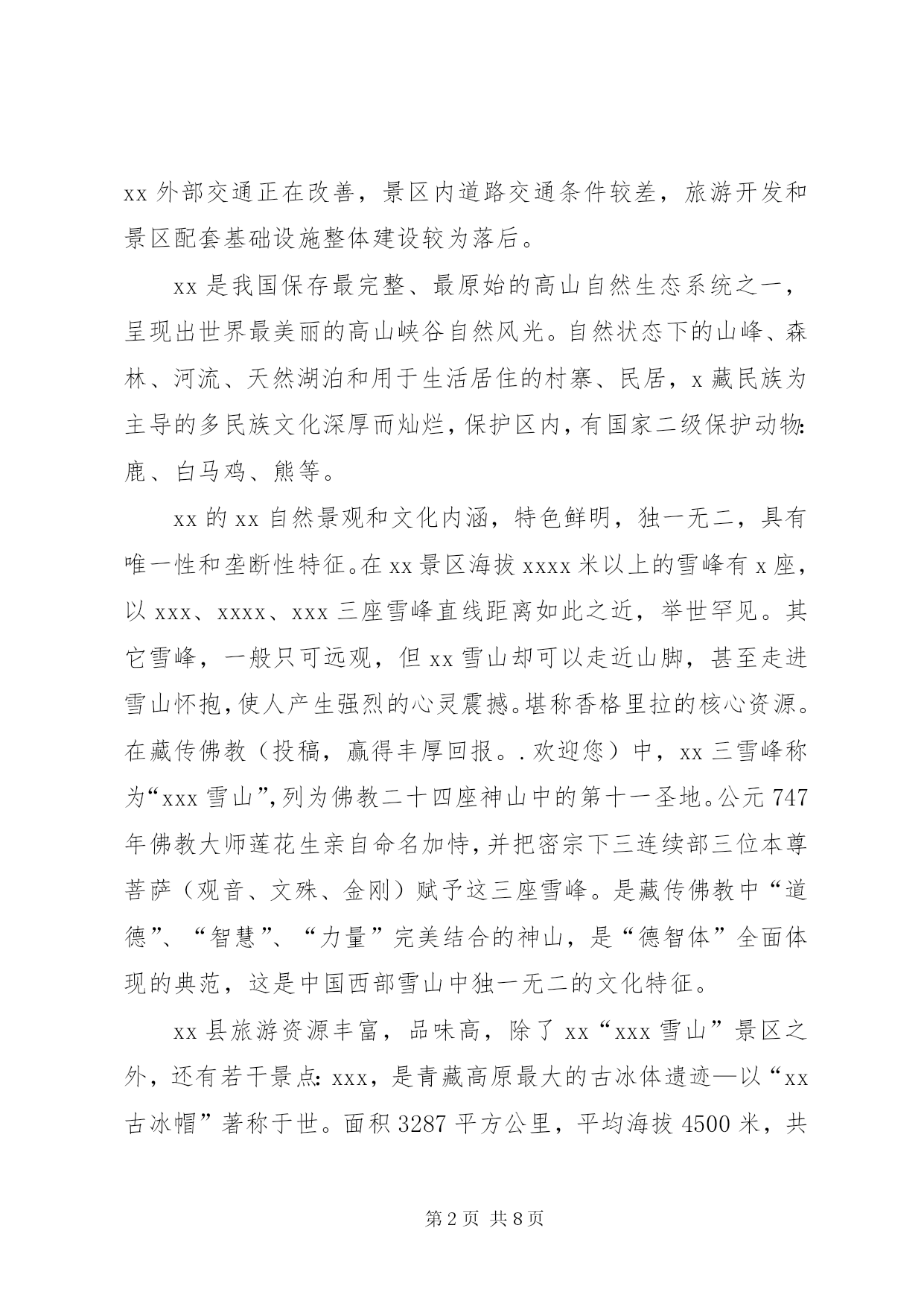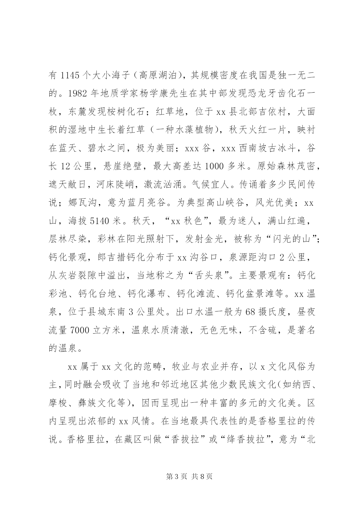 第PAGE\*Arabic\*MERGEFORMAT8页共NUMPAGES\*MERGEFORMAT8页旅游交流发言材料朋友:此次,你们应xx组织的邀请,来到xx县,在此,我谨代表xx县人民向你们表示衷心的祝福。19xx年,贵市与我县相互结识,因相交而相互了解,往来密切,友谊逐步加深。日趋稳固,不断增进,此次考察,必将进一步增进贵我双方的了解和友谊。为增进xx市朋友们对xx县的了解,下面,我把xx县的情况向参会的各位来宾作一简要介绍。一、县情概况xx县,位于中国xx省西南部,全县南北长xxx公里,东西宽xxx公里,幅员面积xxx平方公里。县政府驻地xx,海拔xxx米,总人口xx万,是一个以x民族为主的多民族聚居县。xx县境内旅游资源丰富,南北部各有一个世界级旅游精品,北部的xx具有很高的科考和旅游价值。南部的xx与云南xx县紧邻,这一区域由冰川、湖泊、峡谷、森林、溪流组成的自然景观非常丰富而且极具特色,风光宁静秀丽,民风民俗古朴原始,宗教文化厚重,是中外共认为的“香格里拉”—人与自然完美和谐统一的人间天堂、世外桃源和伊甸园。xx-xx一带是“大香格里拉”景区的核心区域,处于旅游开发初期,旅游开发前景极大,具有后发优势,是xx省政府确定的未来几年内重点开发建设的旅游景区。由于受资金等因素制约,景区建设投入不足,目前亚xx外部交通正在改善,景区内道路交通条件较差,旅游开发和景区配套基础设施整体建设较为落后。xx是我国保存最完整、最原始的高山自然生态系统之一,呈现出世界最美丽的高山峡谷自然风光。自然状态下的山峰、森林、河流、天然湖泊和用于生活居住的村寨、民居,x藏民族为主导的多民族文化深厚而灿烂,保护区内,有国家二级保护动物:鹿、白马鸡、熊等。xx的xx自然景观和文化内涵,特色鲜明,独一无二,具有唯一性和垄断性特征。在xx景区海拔xxxx米以上的雪峰有x座,以xxx、xxxx、xxx三座雪峰直线距离如此之近,举世罕见。其它雪峰,一般只可远观,但xx雪山却可以走近山脚,甚至走进雪山怀抱,使人产生强烈的心灵震撼。堪称香格里拉的核心资源。在藏传佛教(投稿,赢得丰厚回报。.欢迎您)中,xx三雪峰称为“xxx雪山”,列为佛教二十四座神山中的第十一圣地。公元747年佛教大师莲花生亲自命名加恃,并把密宗下三连续部三位本尊菩萨(观音、文殊、金刚)赋予这三座雪峰。是藏传佛教中“道德”、“智慧”、“力量”完美结合的神山,是“德智体”全面体现的典范,这是中国西部雪山中独一无二的文化特征。xx县旅游资源丰富,品味高,除了xx“xxx雪山”景区之外,还有若干景点:xxx,是青藏高原最大的古冰体遗迹—以“xx古冰帽”著称于世。面积3287平方公里,平均海拔4500米,共有1145个大小海子(高原湖泊),其规模密度在我国是独一无二的。1982年地质学家杨学康先生在其中部发现恐龙牙齿化石一枚,东麓发现桉树化石;红草地,位于xx县北部吉依村,大面积的湿地中生长着红草(一种水藻植物),秋天火红一片,映衬在蓝天、碧水之间,极为美丽;xxx谷,xxx西南坡古冰斗,谷长12公里,悬崖绝壁,最大高差达1000多米。原始森林茂密,遮天敝日,河床陡峭,激流汹涌。气候宜人。传诵着多少民间传说;娜瓦沟,意为蓝月亮谷。为典型高山峡谷,风光优美;xx山,海拔5140米。秋天,“xx秋色”,最为迷人,满山红遍,层林尽染,彩林在阳光照射下,发射金光,被称为“闪光的山”;钙化景观,郎吉措钙化分布于xx沟谷口,泉源距沟口2公里,从灰岩裂隙中溢出,当地称之为“舌头泉”。主要景观有:钙化彩池、钙化台地、钙化瀑布、钙化滩流、钙化盆景滩等。xx温泉,位于县城东南3公里处。出口水温一般为68摄氏度,昼夜流量7000立方米,温泉水质清澈,无色无味,不含硫,是著名的温泉。xx属于xx文化的范畴,牧业与农业并存,以x文化风俗为主,同时融会吸收了当地和邻近地区其他少数民族文化(如纳西、摩梭、彝族文化等),因而呈现出一种丰富的多元的文化美。区内呈现出浓郁的xx风情。在当地最具代表性的是香格里拉的传说。香格里拉,在藏区叫做“香拔拉”或“绛香拔拉”,意为“北方极乐世界”,是藏族佛教徒日夜向往和追寻的“世外桃园”。传说她位于雪山环绕之中,是一个集雪山、冰川、峡谷、森林、草甸、湖泊、金矿及纯净空气于一体的神秘世界,她是人们向往美、明朗、安然、闲逸、知足、宁静、和谐的理想境地。那里没有贫穷,没有困苦,没有疾病,没有仇恨与死亡,只有花常开水常绿,庄稼总在等着收割,甜蜜的果子总挂在枝头。“香拔拉”的传说,像谜一样吸引着千千万万的信徒香客,也吸引着西方世界的探险家。1928年,奥地利美籍探险家约瑟夫·洛克最先来到“xxx地区”(xxxx)考察,1931年7月在美国《国家地理杂志》上发表介绍亚丁的文章和大量