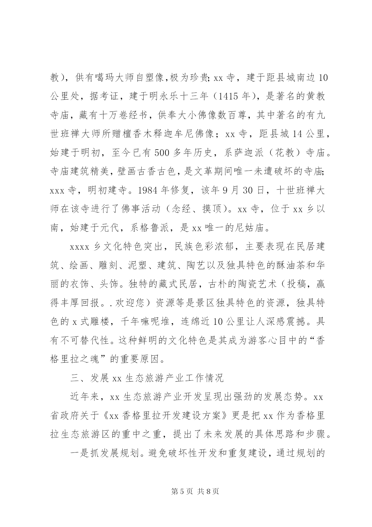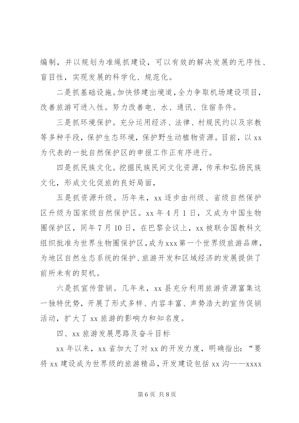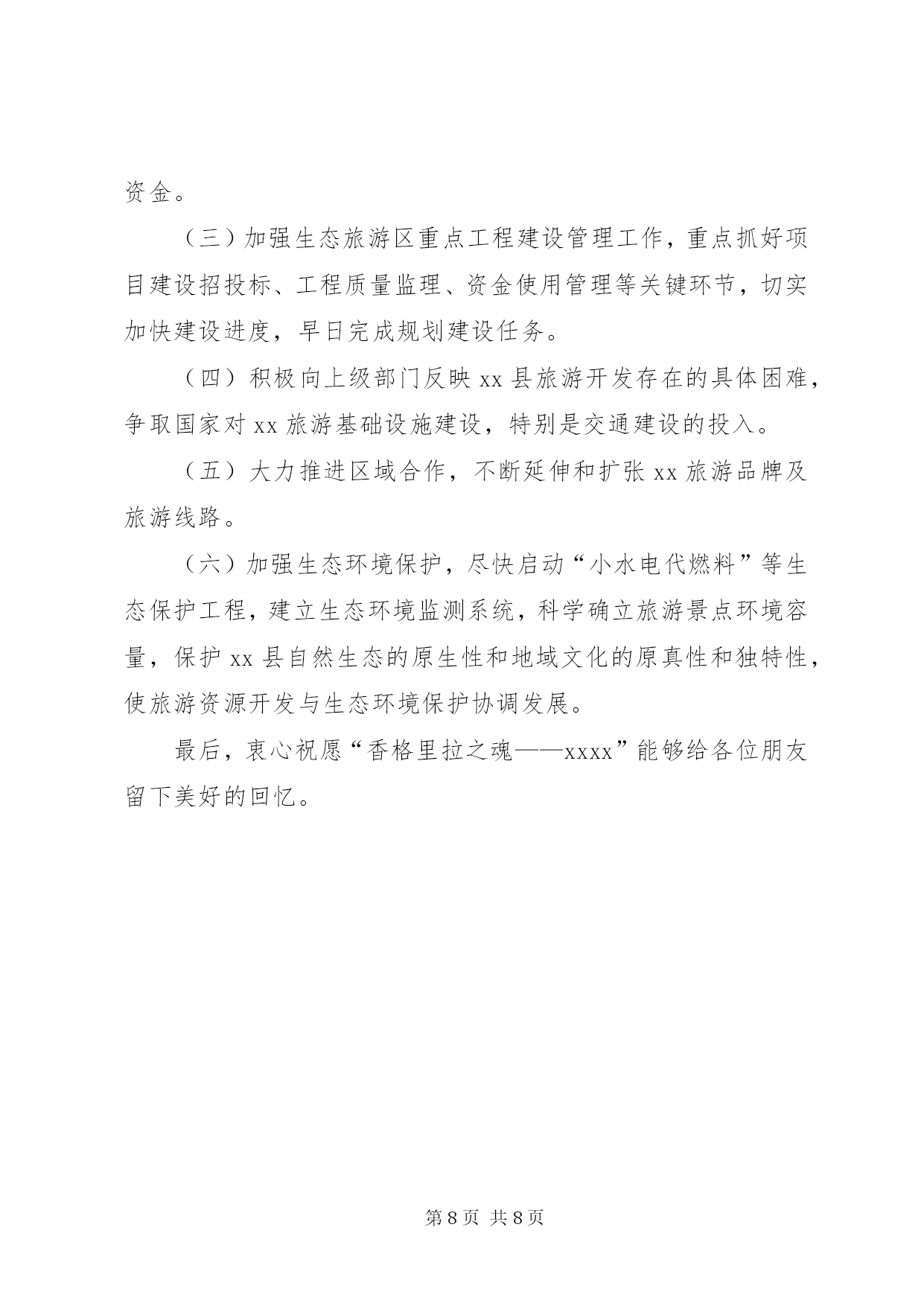 第PAGE\*Arabic\*MERGEFORMAT8页共NUMPAGES\*MERGEFORMAT8页旅游交流发言材料朋友:此次,你们应xx组织的邀请,来到xx县,在此,我谨代表xx县人民向你们表示衷心的祝福。19xx年,贵市与我县相互结识,因相交而相互了解,往来密切,友谊逐步加深。日趋稳固,不断增进,此次考察,必将进一步增进贵我双方的了解和友谊。为增进xx市朋友们对xx县的了解,下面,我把xx县的情况向参会的各位来宾作一简要介绍。一、县情概况xx县,位于中国xx省西南部,全县南北长xxx公里,东西宽xxx公里,幅员面积xxx平方公里。县政府驻地xx,海拔xxx米,总人口xx万,是一个以x民族为主的多民族聚居县。xx县境内旅游资源丰富,南北部各有一个世界级旅游精品,北部的xx具有很高的科考和旅游价值。南部的xx与云南xx县紧邻,这一区域由冰川、湖泊、峡谷、森林、溪流组成的自然景观非常丰富而且极具特色,风光宁静秀丽,民风民俗古朴原始,宗教文化厚重,是中外共认为的“香格里拉”—人与自然完美和谐统一的人间天堂、世外桃源和伊甸园。xx-xx一带是“大香格里拉”景区的核心区域,处于旅游开发初期,旅游开发前景极大,具有后发优势,是xx省政府确定的未来几年内重点开发建设的旅游景区。由于受资金等因素制约,景区建设投入不足,目前亚xx外部交通正在改善,景区内道路交通条件较差,旅游开发和景区配套基础设施整体建设较为落后。xx是我国保存最完整、最原始的高山自然生态系统之一,呈现出世界最美丽的高山峡谷自然风光。自然状态下的山峰、森林、河流、天然湖泊和用于生活居住的村寨、民居,x藏民族为主导的多民族文化深厚而灿烂,保护区内,有国家二级保护动物:鹿、白马鸡、熊等。xx的xx自然景观和文化内涵,特色鲜明,独一无二,具有唯一性和垄断性特征。在xx景区海拔xxxx米以上的雪峰有x座,以xxx、xxxx、xxx三座雪峰直线距离如此之近,举世罕见。其它雪峰,一般只可远观,但xx雪山却可以走近山脚,甚至走进雪山怀抱,使人产生强烈的心灵震撼。堪称香格里拉的核心资源。在藏传佛教(投稿,赢得丰厚回报。.欢迎您)中,xx三雪峰称为“xxx雪山”,列为佛教二十四座神山中的第十一圣地。公元747年佛教大师莲花生亲自命名加恃,并把密宗下三连续部三位本尊菩萨(观音、文殊、金刚)赋予这三座雪峰。是藏传佛教中“道德”、“智慧”、“力量”完美结合的神山,是“德智体”全面体现的典范,这是中国西部雪山中独一无二的文化特征。xx县旅游资源丰富,品味高,除了xx“xxx雪山”景区之外,还有若干景点:xxx,是青藏高原最大的古冰体遗迹—以“xx古冰帽”著称于世。面积3287平方公里,平均海拔4500米,共有1145个大小海子(高原湖泊),其规模密度在我国是独一无二的。1982年地质学家杨学康先生在其中部发现恐龙牙齿化石一枚,东麓发现桉树化石;红草地,位于xx县北部吉依村,大面积的湿地中生长着红草(一种水藻植物),秋天火红一片,映衬在蓝天、碧水之间,极为美丽;xxx谷,xxx西南坡古冰斗,谷长12公里,悬崖绝壁,最大高差达1000多米。原始森林茂密,遮天敝日,河床陡峭,激流汹涌。气候宜人。传诵着多少民间传说;娜瓦沟,意为蓝月亮谷。为典型高山峡谷,风光优美;xx山,海拔5140米。秋天,“xx秋色”,最为迷人,满山红遍,层林尽染,彩林在阳光照射下,发射金光,被称为“闪光的山”;钙化景观,郎吉措钙化分布于xx沟谷口,泉源距沟口2公里,从灰岩裂隙中溢出,当地称之为“舌头泉”。主要景观有:钙化彩池、钙化台地、钙化瀑布、钙化滩流、钙化盆景滩等。xx温泉,位于县城东南3公里处。出口水温一般为68摄氏度,昼夜流量7000立方米,温泉水质清澈,无色无味,不含硫,是著名的温泉。xx属于xx文化的范畴,牧业与农业并存,以x文化风俗为主,同时融会吸收了当地和邻近地区其他少数民族文化(如纳西、摩梭、彝族文化等),因而呈现出一种丰富的多元的文化美。区内呈现出浓郁的xx风情。在当地最具代表性的是香格里拉的传说。香格里拉,在藏区叫做“香拔拉”或“绛香拔拉”,意为“北方极乐世界”,是藏族佛教徒日夜向往和追寻的“世外桃园”。传说她位于雪山环绕之中,是一个集雪山、冰川、峡谷、森林、草甸、湖泊、金矿及纯净空气于一体的神秘世界,她是人们向往美、明朗、安然、闲逸、知足、宁静、和谐的理想境地。那里没有贫穷,没有困苦,没有疾病,没有仇恨与死亡,只有花常开水常绿,庄稼总在等着收割,甜蜜的果子总挂在枝头。“香拔拉”的传说,像谜一样吸引着千千万万的信徒香客,也吸引着西方世界的探险家。1928年,奥地利美籍探险家约瑟夫·洛克最先来到“xxx地区”(xxxx)考察,1931年7月在美国《国家地理杂志》上发表介绍亚丁的文章和大量