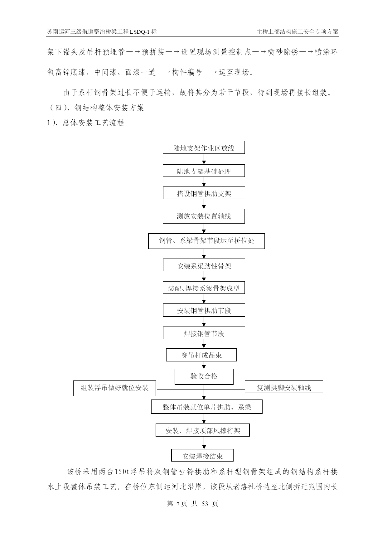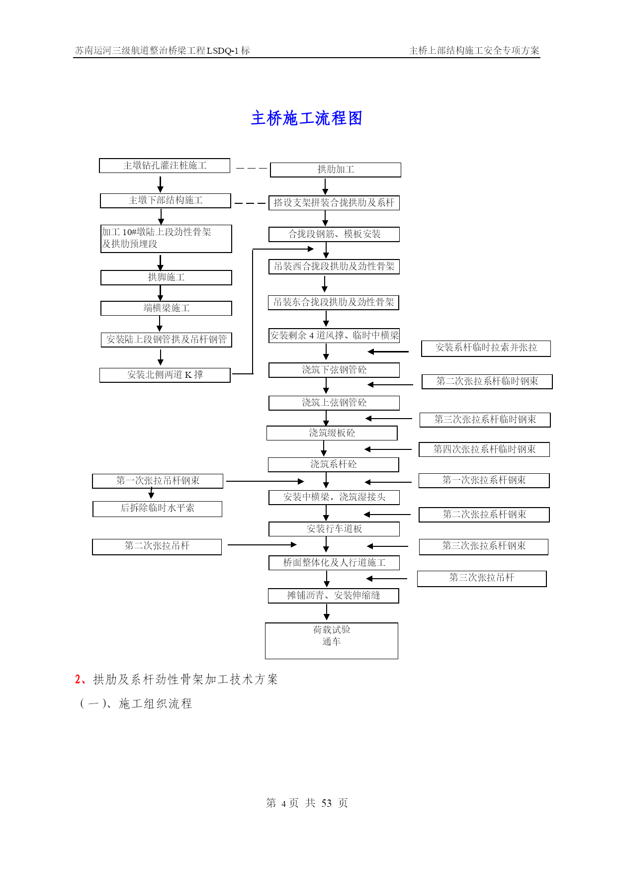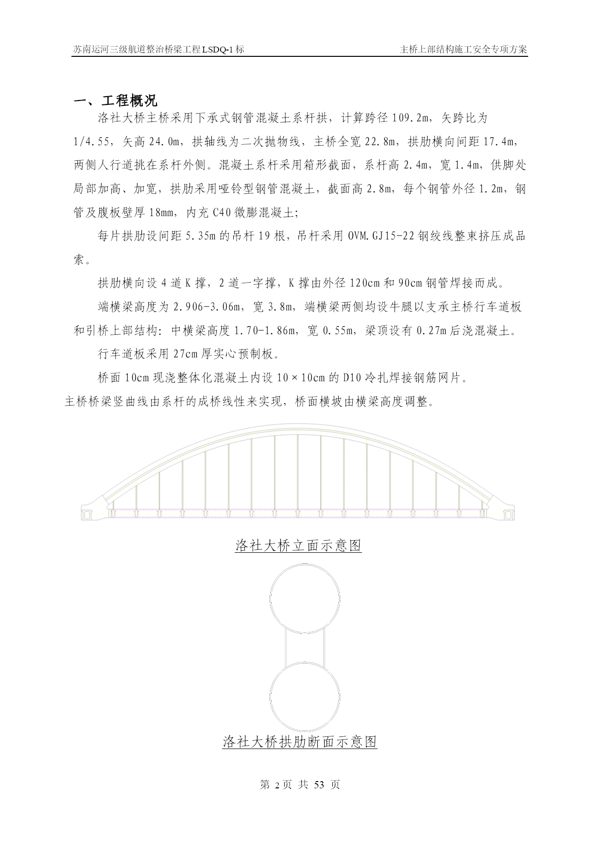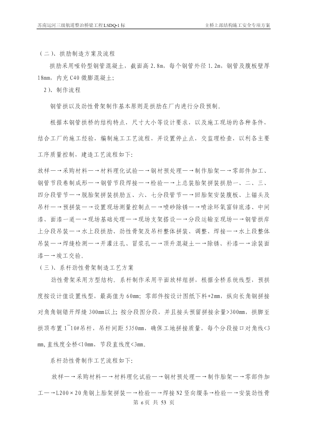 苏南运河三级航道整治桥梁工程LSDQ-1标主桥上部结构施工安全专项方案第PAGE17页共NUMPAGES\*MERGEFORMAT53页苏南运河三级航道整治桥梁工程LSDQ-1标主桥上部结构施工安全专项方案编制:审核:审批:江苏省交通工程集团有限公司苏南运河三级航道整治工程LSDQ-1标项目部二O一一年五月目录一、工程概况…………………………………………………………………4二、编制依据…………………………………………………………………5三、主要施工方案………………………………………………………6四、影响质量、安全的危险分析及相关措施………………………………33五、安全生产管理…………………………………44六、应急救援与预案……………………………………………………59七、附件、计算……………………………………………………59一、工程概况洛社大桥主桥采用下承式钢管混凝土系杆拱,计算跨径109.2m,矢跨比为1/4.55,矢高24.0m,拱轴线为二次抛物线,主桥全宽22.8m,拱肋横向间距17.4m,两侧人行道挑在系杆外侧。混凝土系杆采用箱形截面,系杆高2.4m,宽1.4m,供脚处局部加高、加宽,拱肋采用哑铃型钢管混凝土,截面高2.8m,每个钢管外径1.2m,钢管及腹板壁厚18mm,内充C40微膨混凝土;每片拱肋设间距5.35m的吊杆19根,吊杆采用OVM.GJ15-22钢绞线整束挤压成品索。拱肋横向设4道K撑,2道一字撑,K撑由外径120cm和90cm钢管焊接而成。端横梁高度为2.906-3.06m,宽3.8m,端横梁两侧均设牛腿以支承主桥行车道板和引桥上部结构:中横梁高度1.70-1.86m,宽0.55m,梁顶设有0.27m后浇混凝土。行车道板采用27cm厚实心预制板。桥面10cm现浇整体化混凝土内设10×10cm的D10冷扎焊接钢筋网片。主桥桥梁竖曲线由系杆的成桥线性来实现,桥面横坡由横梁高度调整。洛社大桥立面示意图洛社大桥拱肋断面示意图二、编制依据本安全施工专项方案的编制在于指导、控制施工现场的作业安全,指导并监控施工环节中的分项工程的施工安全,约束施工人员认真执行每一个安全施工指令和作业方法。本工程引用的标准文件及有关强制性条文、文件如下:(1)《建筑施工安全检查标准》(2)《中华人民共和国建筑法》(3)《中华人民共和国安全生产法》(4)《建筑工程安全管理条例》(5)《公路工程施工技术安全技术规程》(6)《施工现场临时用电安全技术规范》(7)《建筑施工高处作业安全技术规范》(8)《建筑机械使用安全技术规程》(9)《工程建设重大事故报告和调查程序规定》(建设部第3号令)(10)《建筑安全监督管理规定》(建设部第13号令)(11)《建筑工程施工现场管理规定》(建设部第15号令)(12)苏南运河三级航道整治桥梁工程LSDQ-1标施工图变更设计三、主要施工方案简述1、总述及施工总体流程图根据现场施工条件和钢管拱肋单体分段重量及安装的高度以及运河航道通航繁忙、航道限航时间短暂等管理的限制,该工程水上施工决定采用水上段整体吊装施工。因此,在陆地支架上,拼装水上段的双钢管哑铃拱肋和系杆型钢骨架组成的水上段整体钢结构系杆拱,然后用采用两台150t浮吊为主要起吊设备,双机抬吊整体安装水上段拱肋系杆骨架结构。主桥施工流程图第一次张拉吊杆钢束拱肋加工主墩下部结构施工搭设支架拼装合拢拱肋及系杆骨架加工10#墩陆上段劲性骨架及拱肋预埋段合拢段钢筋、模板安装拱脚施工端横梁施工安装北侧两道K撑吊装西合拢段拱肋及劲性骨架吊装东合拢段拱肋及劲性骨架安装剩余4道风撑、临时中横梁浇筑下弦钢管砼浇筑系杆砼安装中横梁,浇筑湿接头安装行车道板桥面整体化及人行道施工摊铺沥青、安装伸缩缝浇筑上弦钢管砼浇筑缀板砼荷载试验通车第二次张拉系杆临时钢束第三次张拉系杆临时钢束第四次张拉系杆临时钢束第一次张拉系杆钢束第二次张拉系杆钢束主墩钻孔灌注桩施工安装陆上段钢管拱及吊杆钢管安装系杆临时拉索并张拉后拆除临时水平索第二次张拉吊杆第三次张拉系杆钢束第三次张拉吊杆2、拱肋及系杆劲性骨架加工技术方案(一)、施工组织流程拱肋、系梁劲性骨架制作施工组织流程图部分材料采购人员设备进场胎架制作技术准备申请开工申请开工批准单元件生产批准单元件运输拱肋、钢骨架预拼装涂装存放运输现场拱圈合拢组装工地补涂最终涂装