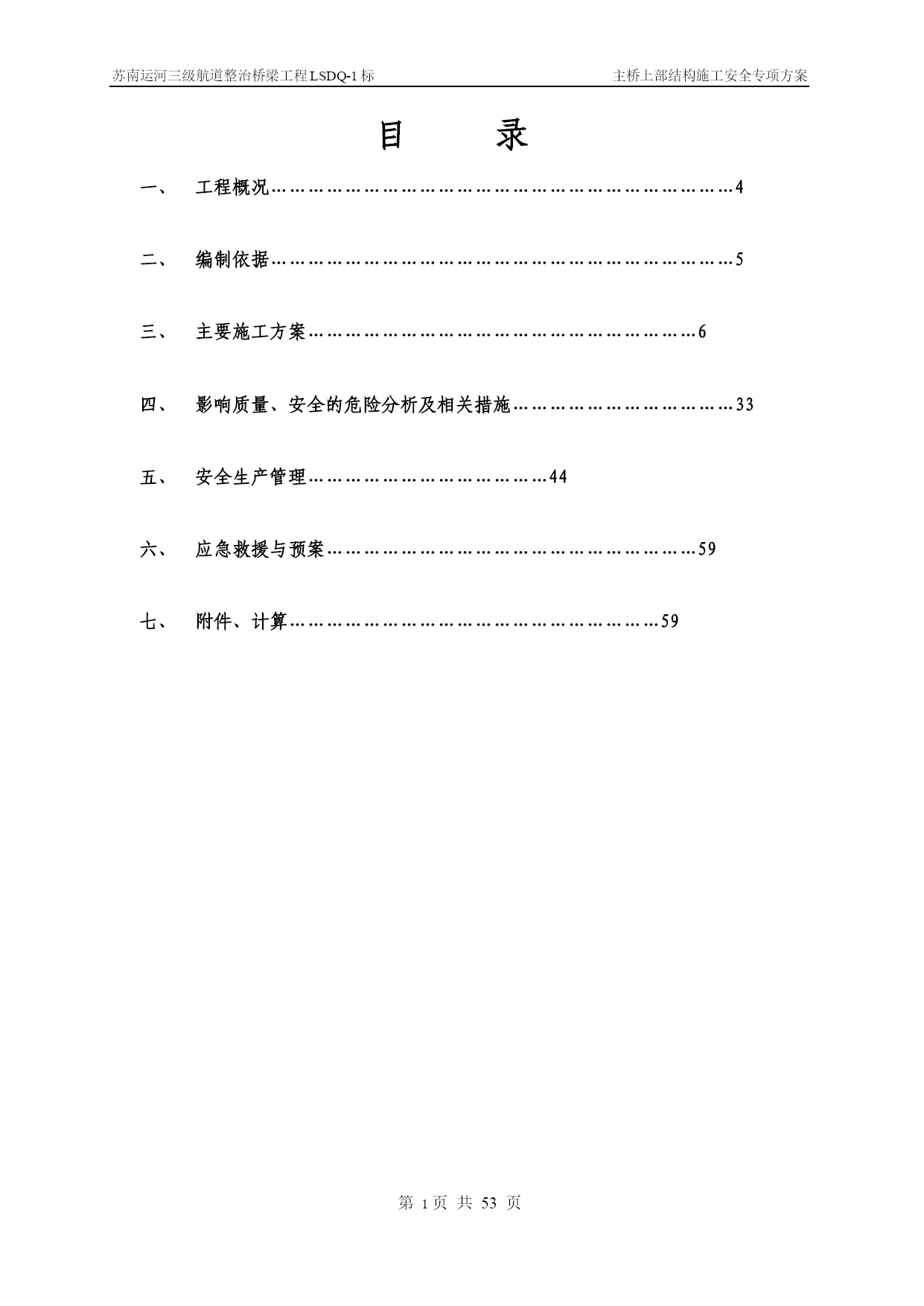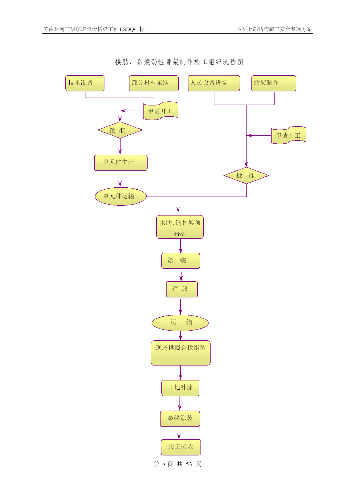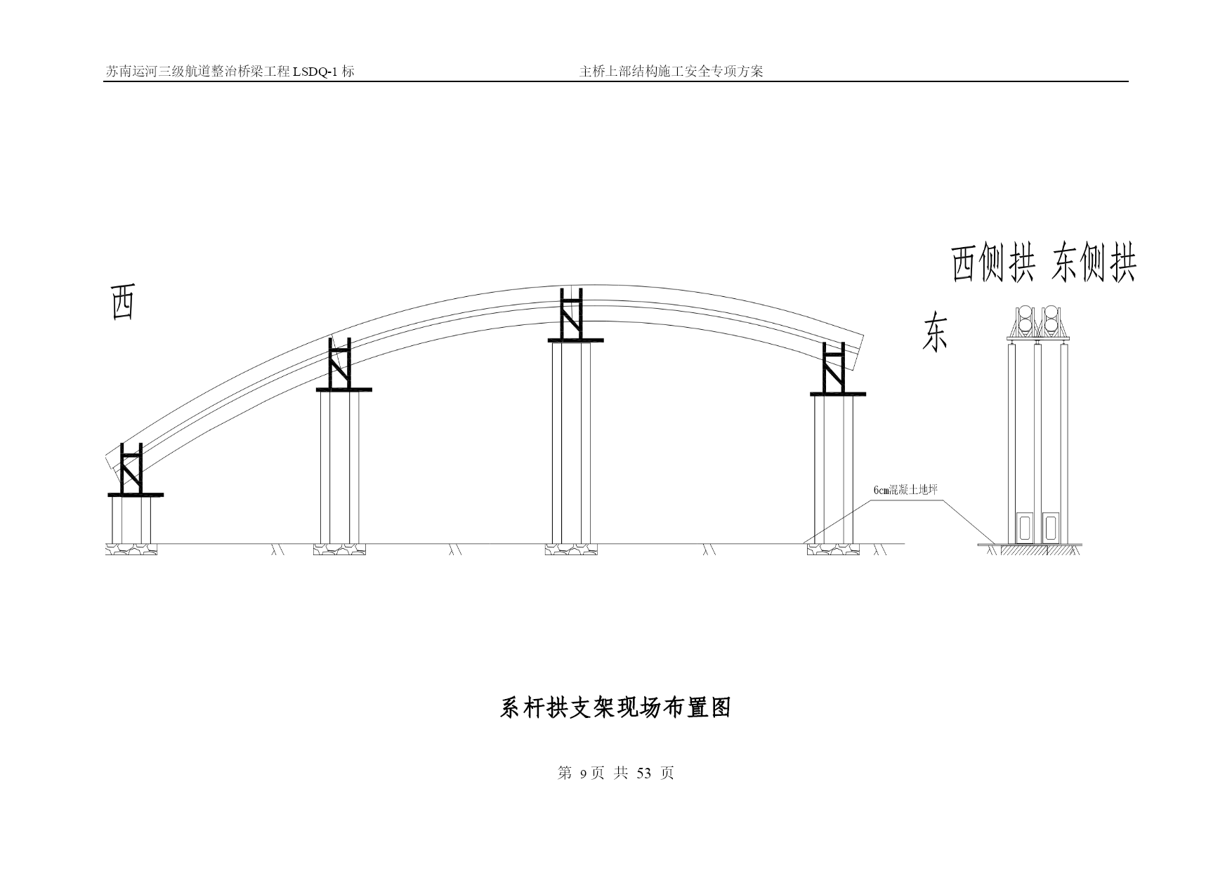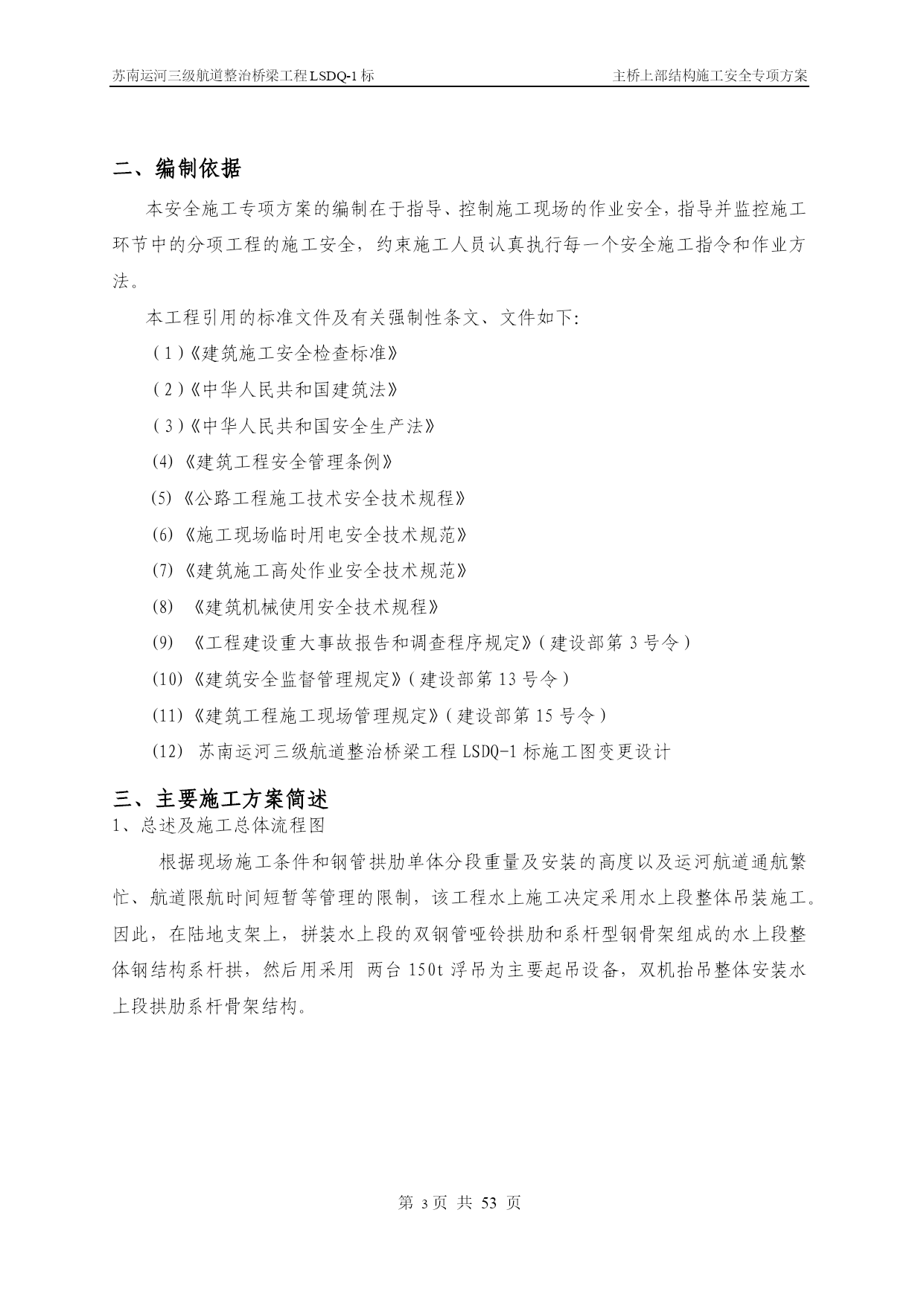 苏南运河三级航道整治桥梁工程LSDQ-1标主桥上部结构施工安全专项方案第PAGE17页共NUMPAGES\*MERGEFORMAT53页苏南运河三级航道整治桥梁工程LSDQ-1标主桥上部结构施工安全专项方案编制:审核:审批:江苏省交通工程集团有限公司苏南运河三级航道整治工程LSDQ-1标项目部二O一一年五月目录一、工程概况…………………………………………………………………4二、编制依据…………………………………………………………………5三、主要施工方案………………………………………………………6四、影响质量、安全的危险分析及相关措施………………………………33五、安全生产管理…………………………………44六、应急救援与预案……………………………………………………59七、附件、计算……………………………………………………59一、工程概况洛社大桥主桥采用下承式钢管混凝土系杆拱,计算跨径109.2m,矢跨比为1/4.55,矢高24.0m,拱轴线为二次抛物线,主桥全宽22.8m,拱肋横向间距17.4m,两侧人行道挑在系杆外侧。混凝土系杆采用箱形截面,系杆高2.4m,宽1.4m,供脚处局部加高、加宽,拱肋采用哑铃型钢管混凝土,截面高2.8m,每个钢管外径1.2m,钢管及腹板壁厚18mm,内充C40微膨混凝土;每片拱肋设间距5.35m的吊杆19根,吊杆采用OVM.GJ15-22钢绞线整束挤压成品索。拱肋横向设4道K撑,2道一字撑,K撑由外径120cm和90cm钢管焊接而成。端横梁高度为2.906-3.06m,宽3.8m,端横梁两侧均设牛腿以支承主桥行车道板和引桥上部结构:中横梁高度1.70-1.86m,宽0.55m,梁顶设有0.27m后浇混凝土。行车道板采用27cm厚实心预制板。桥面10cm现浇整体化混凝土内设10×10cm的D10冷扎焊接钢筋网片。主桥桥梁竖曲线由系杆的成桥线性来实现,桥面横坡由横梁高度调整。洛社大桥立面示意图洛社大桥拱肋断面示意图二、编制依据本安全施工专项方案的编制在于指导、控制施工现场的作业安全,指导并监控施工环节中的分项工程的施工安全,约束施工人员认真执行每一个安全施工指令和作业方法。本工程引用的标准文件及有关强制性条文、文件如下:(1)《建筑施工安全检查标准》(2)《中华人民共和国建筑法》(3)《中华人民共和国安全生产法》(4)《建筑工程安全管理条例》(5)《公路工程施工技术安全技术规程》(6)《施工现场临时用电安全技术规范》(7)《建筑施工高处作业安全技术规范》(8)《建筑机械使用安全技术规程》(9)《工程建设重大事故报告和调查程序规定》(建设部第3号令)(10)《建筑安全监督管理规定》(建设部第13号令)(11)《建筑工程施工现场管理规定》(建设部第15号令)(12)苏南运河三级航道整治桥梁工程LSDQ-1标施工图变更设计三、主要施工方案简述1、总述及施工总体流程图根据现场施工条件和钢管拱肋单体分段重量及安装的高度以及运河航道通航繁忙、航道限航时间短暂等管理的限制,该工程水上施工决定采用水上段整体吊装施工。因此,在陆地支架上,拼装水上段的双钢管哑铃拱肋和系杆型钢骨架组成的水上段整体钢结构系杆拱,然后用采用两台150t浮吊为主要起吊设备,双机抬吊整体安装水上段拱肋系杆骨架结构。主桥施工流程图第一次张拉吊杆钢束拱肋加工主墩下部结构施工搭设支架拼装合拢拱肋及系杆骨架加工10#墩陆上段劲性骨架及拱肋预埋段合拢段钢筋、模板安装拱脚施工端横梁施工安装北侧两道K撑吊装西合拢段拱肋及劲性骨架吊装东合拢段拱肋及劲性骨架安装剩余4道风撑、临时中横梁浇筑下弦钢管砼浇筑系杆砼安装中横梁,浇筑湿接头安装行车道板桥面整体化及人行道施工摊铺沥青、安装伸缩缝浇筑上弦钢管砼浇筑缀板砼荷载试验通车第二次张拉系杆临时钢束第三次张拉系杆临时钢束第四次张拉系杆临时钢束第一次张拉系杆钢束第二次张拉系杆钢束主墩钻孔灌注桩施工安装陆上段钢管拱及吊杆钢管安装系杆临时拉索并张拉后拆除临时水平索第二次张拉吊杆第三次张拉系杆钢束第三次张拉吊杆2、拱肋及系杆劲性骨架加工技术方案(一)、施工组织流程拱肋、系梁劲性骨架制作施工组织流程图部分材料采购人员设备进场胎架制作技术准备申请开工申请开工批准单元件生产批准单元件运输拱肋、钢骨架预拼装涂装存放运输现场拱圈合拢组装工地补涂最终涂装