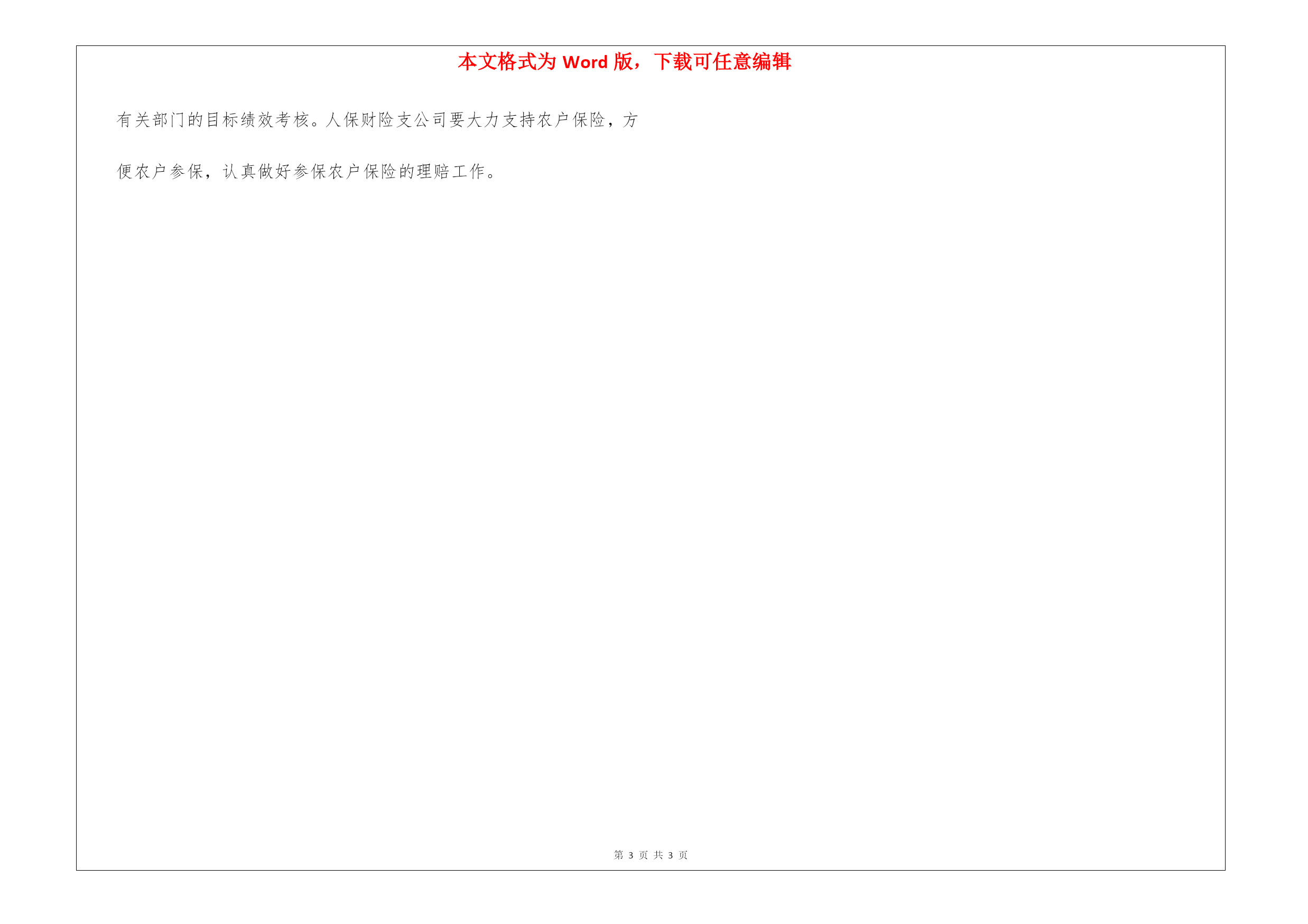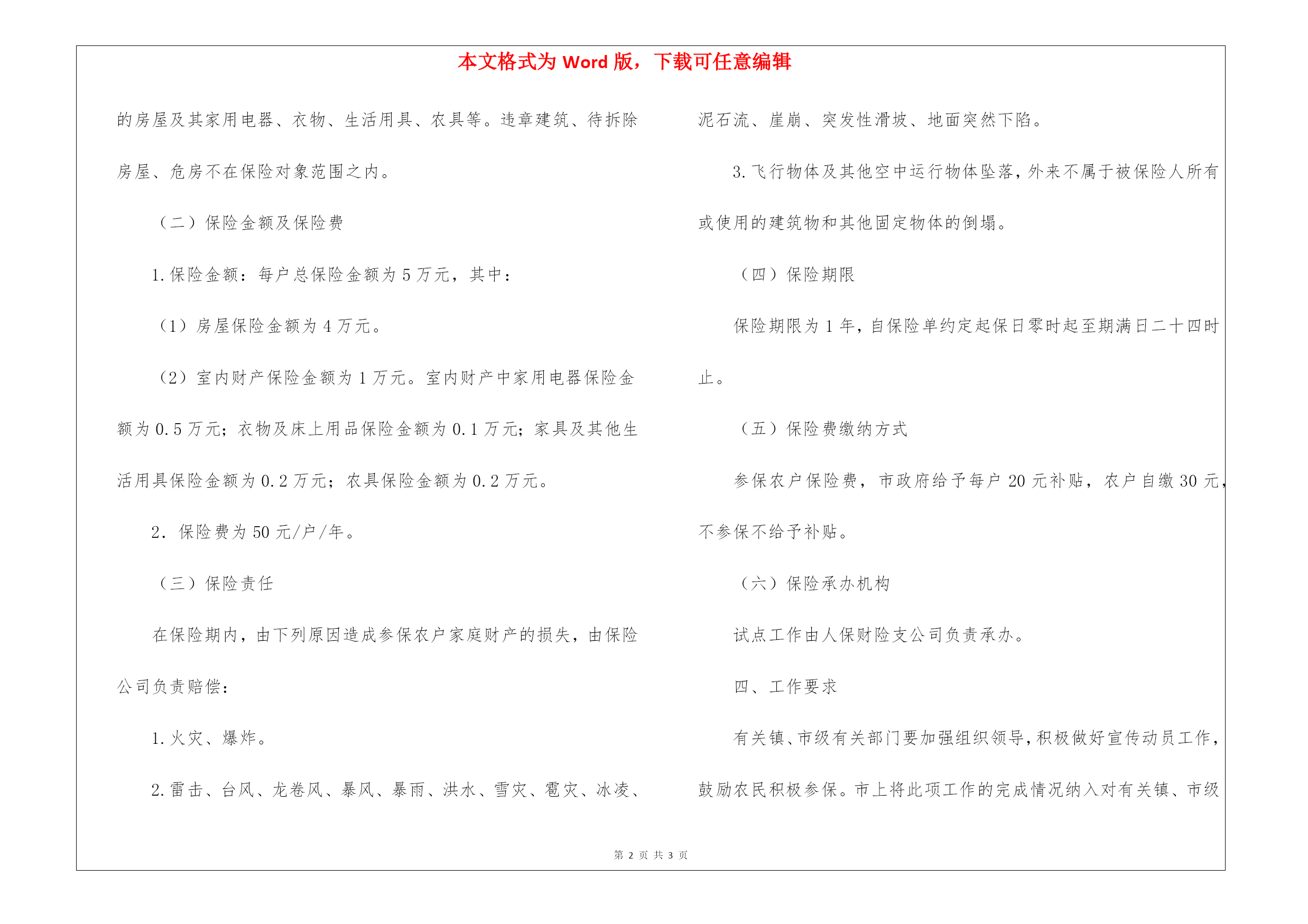 本文格式为Word版,下载可任意编辑第PAGE\*MERGEFORMAT3页共NUMPAGES\*MERGEFORMAT3页市域农房保险通知各镇人民政府(街道办事处),市级有关部门:为进一步推进我市政策性农业保险试点工作,积极探索和改革农村灾害救助方式,逐步建立和完善农村救灾保障机制,切实增强农业、农村和农民抵御自然灾害风险和应对重特大意外事故的能力,促进我市社会主义新农村建设。根据《中共省委、省人民政府关于进一步加大统筹城乡发展力度加快推动农业农村发展上新台阶的意见》、《省人民政府关于进一步推进我省政策性农业保险工作的意见》和《省财政厅关于开展年农业保险工作的通知》精神,经市政府研究,决定在我市部分镇开展政策性农房保险试点工作,现将有关事宜通知如下:一、充分认识开展政策性农房保险试点工作的重要性和必要性我市近年自然灾害发生频繁,特别是今年发生的暴雨泥石流灾害使部分农民蒙受了严重经济损失。农业保险在减少灾害损失和推进恢复生产中发挥了重要的作用,已成为深受农户欢迎的“民心工程”。各镇(街道)、市级有关部门、有关保险企业要进一步树立科学发展观,从推进社会主义新农村建设、构建和谐社会的高度,充分认识开展政策性农房保险的重要性和必要性,把开展政策性农房保险试点工作作为解决“三农”问题的重要措施之一,切实抓紧、抓好,确保该项工作落到实处。二、政策性农房保险试点工作原则坚持“政府组织推动、农户自愿参保、保险公司市场运作”和“低保障、低保费、广覆盖”的原则,在等六个镇先行试点,力求要实现应保尽保。其他镇(街道)要做好宣传和动员工作,本着自愿参与的原则,可向市政策性农业保险工作领导小组申报,经审批后可参与试点工作。试点工作从年起至年止。三、政策性农房保险试点工作方案(一)保险对象保险对象为具有我市农业户籍的农村居民自有且用于生活居住的房屋及其家用电器、衣物、生活用具、农具等。违章建筑、待拆除房屋、危房不在保险对象范围之内。(二)保险金额及保险费1.保险金额:每户总保险金额为5万元,其中:(1)房屋保险金额为4万元。(2)室内财产保险金额为1万元。室内财产中家用电器保险金额为0.5万元;衣物及床上用品保险金额为0.1万元;家具及其他生活用具保险金额为0.2万元;农具保险金额为0.2万元。2.保险费为50元/户/年。(三)保险责任在保险期内,由下列原因造成参保农户家庭财产的损失,由保险公司负责赔偿:1.火灾、爆炸。2.雷击、台风、龙卷风、暴风、暴雨、洪水、雪灾、雹灾、冰凌、泥石流、崖崩、突发性滑坡、地面突然下陷。3.飞行物体及其他空中运行物体坠落,外来不属于被保险人所有或使用的建筑物和其他固定物体的倒塌。(四)保险期限保险期限为1年,自保险单约定起保日零时起至期满日二十四时止。(五)保险费缴纳方式参保农户保险费,市政府给予每户20元补贴,农户自缴30元,不参保不给予补贴。(六)保险承办机构试点工作由人保财险支公司负责承办。四、工作要求有关镇、市级有关部门要加强组织领导,积极做好宣传动员工作,鼓励农民积极参保。市上将此项工作的完成情况纳入对有关镇、市级有关部门的目标绩效考核。人保财险支公司要大力支持农户保险,方便农户参保,认真做好参保农户保险的理赔工作。