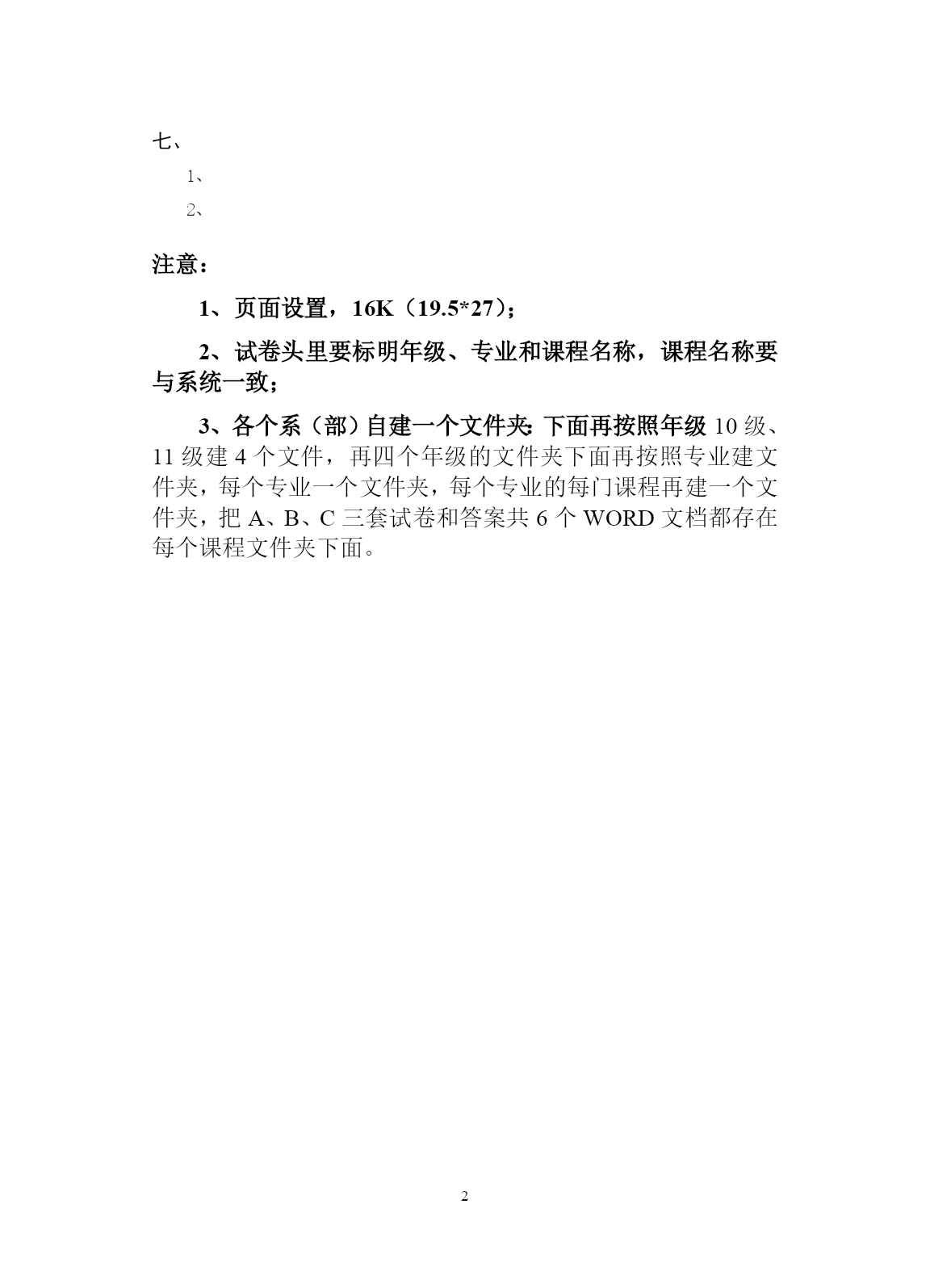 PAGEPAGE2海南工商职业学院2011—2012学年第一学期期末考试(年级专业)《科目名称》课程试卷A卷(考试时间:100分钟)说明:所有题目请作答在答题纸上,否则作答无效。一、1、2、3、二、1、2、三、1、2、3、四、1、2、五、1、2、六、1、2、七、1、2、注意:1、页面设置,16K(19.5*27);2、试卷头里要标明年级、专业和课程名称,课程名称要与系统一致;3、各个系(部)自建一个文件夹:下面再按照年级10级、11级建4个文件,再四个年级的文件夹下面再按照专业建文件夹,每个专业一个文件夹,每个专业的每门课程再建一个文件夹,把A、B、C三套试卷和答案共6个WORD文档都存在每个课程文件夹下面。