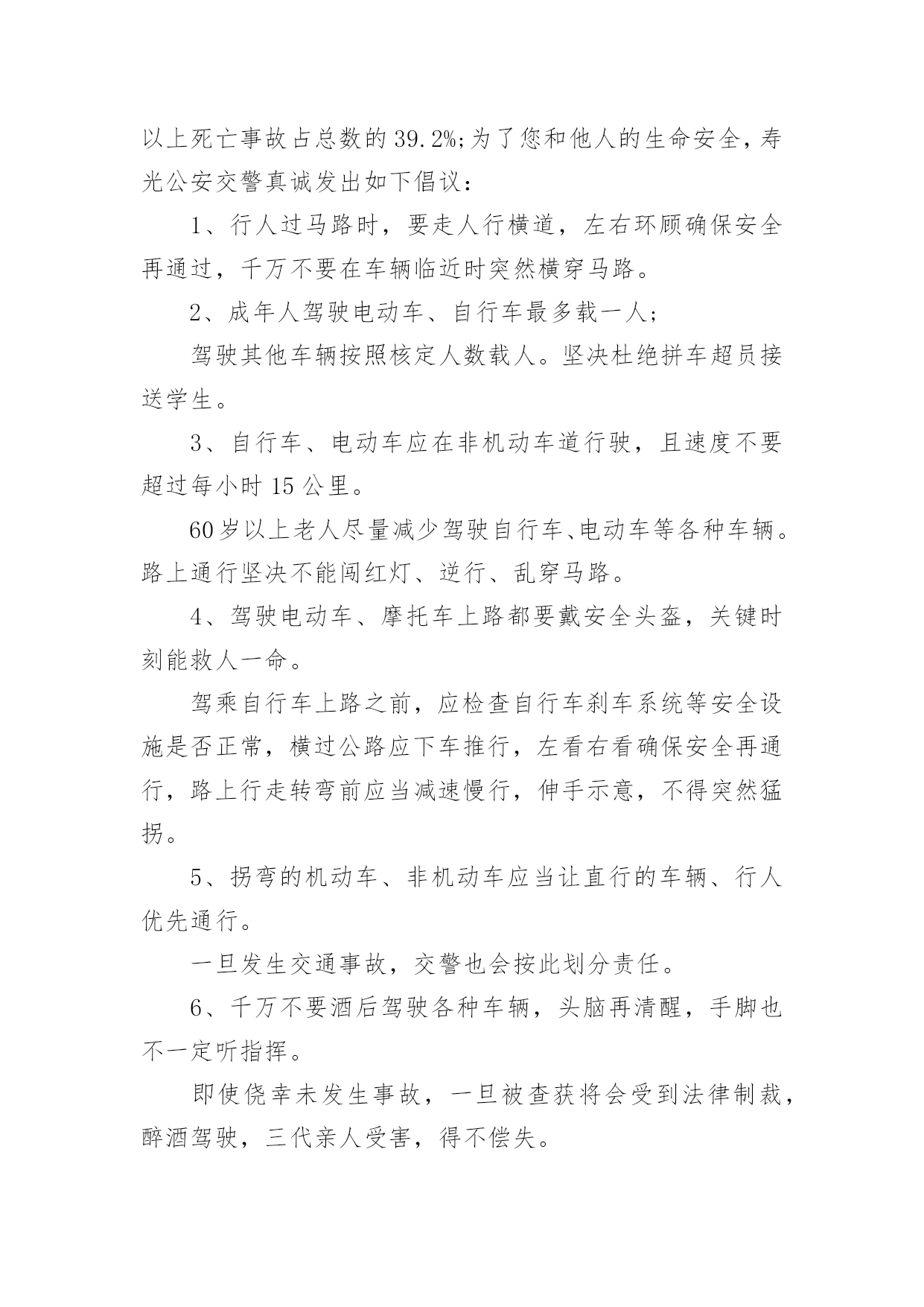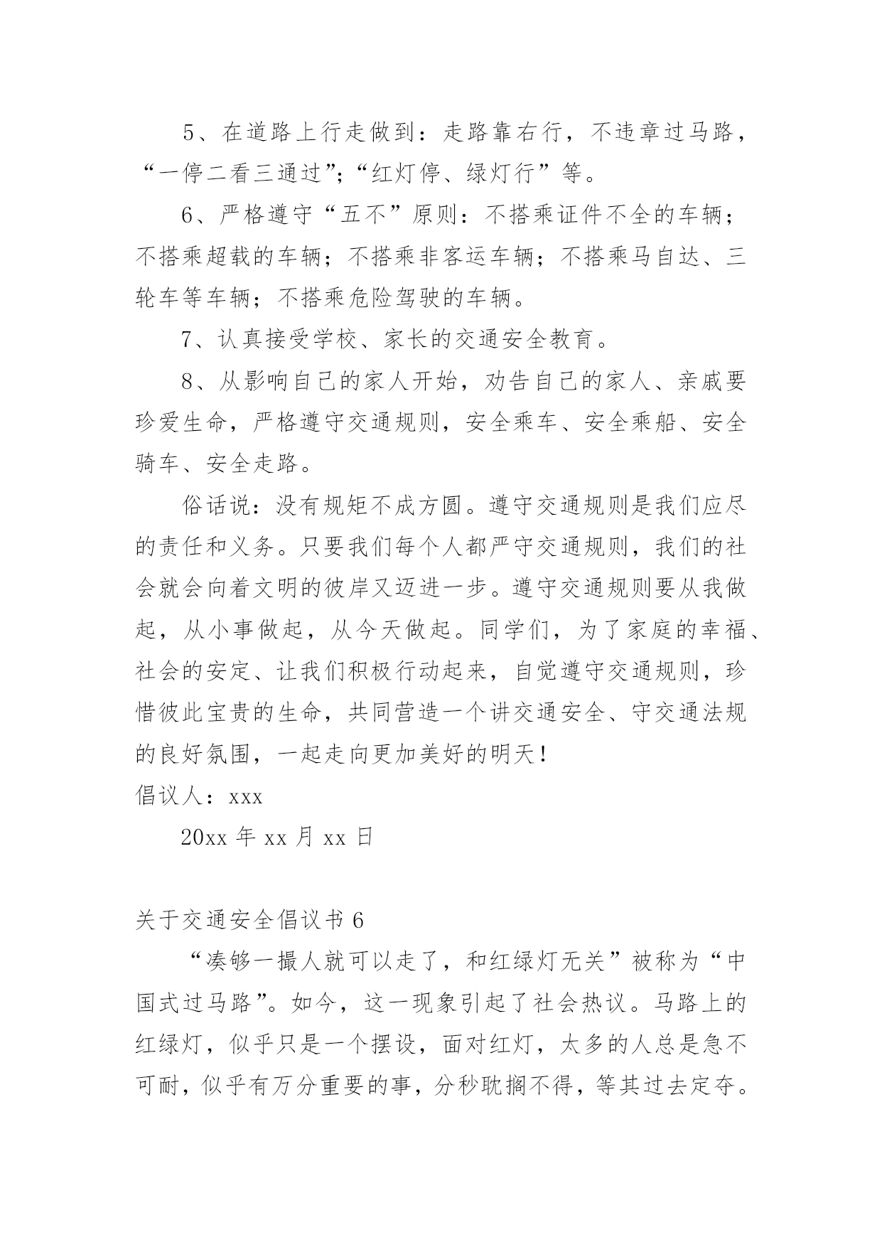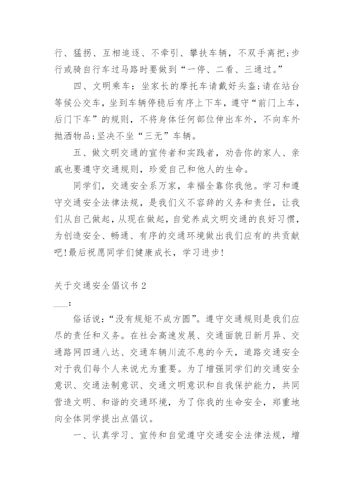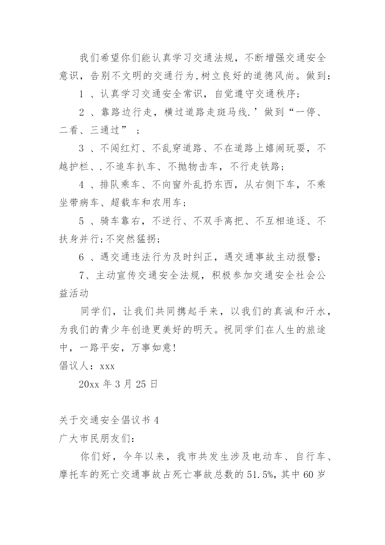交通安全倡议书关于交通安全倡议书(精选15篇)在学习、工作生活中,接触并使用倡议书的人越来越多,通过倡议书倡议者可以更好地申明发布倡议的目的。如何写一份恰当的倡议书呢?下面是小编收集整理的关于交通安全倡议书,仅供参考,大家一起来看看吧。关于交通安全倡议书1亲爱的同学们:在社会高速发展,交通面貌日新月异,交通路网四通八达,交通车辆川流不息的今天,道路交通安全对于我们每个人来说都尤为重要。为了增强同学们的交通安全意识、交通法制意识、交通文明意识和自我保护能力,共同营造文明、和谐的交通环境,为了你我的生命安全,六一班全体同学向全区的青少年朋友们提出以下几点倡议:一、认真学习、宣传和自觉遵守交通安全法律法规,增强社会公德意识和交通安全意识,树立文明交通新风。二、文明走路:必须在人行道行走,没有人行道的道路要在行走。不闯红灯,不三五成群并肩走,不在马路上追逐打闹嬉戏、使用滑板、旱冰鞋,不要穿越、倚坐在马路边的护栏、花台上,特别在路口,不要急拐猛跑。不准在道路上扒车、追车、强行拦车和抛物击车。三、文明骑车:做到不闯红灯,不走快车道,不扶身并行、猛拐、互相追逐、不牵引、攀扶车辆,不双手离把;步行或骑自行车过马路时要做到“一停、二看、三通过。”四、文明乘车:坐家长的摩托车请戴好头盔;请在站台等候公交车,坐到车辆停稳后有序上下车,遵守“前门上车,后门下车”的规则,不将身体任何部位伸出车外,不向车外抛洒物品;坚决不坐“三无”车辆。五、做文明交通的宣传者和实践者,劝告你的家人、亲戚也要遵守交通规则,珍爱自己和他人的生命。同学们,交通安全系万家,幸福全靠你我他。学习和遵守交通安全法律法规,是我们义不容辞的义务和责任,让我们从自己做起,从现在做起,自觉养成文明交通的良好习惯,为创造安全、畅通、有序的交通环境做出我们应有的共贡献吧!最后祝愿同学们健康成长,学习进步!关于交通安全倡议书2___:俗话说:“没有规矩不成方圆”。遵守交通规则是我们应尽的责任和义务。在社会高速发展、交通面貌日新月异、交通路网四通八达、交通车辆川流不息的今天,道路交通安全对于我们每个人来说尤为重要。为了增强同学们的交通安全意识、交通法制意识、交通文明意识和自我保护能力,共同营造文明、和谐的交通环境,为了你我的生命安全,郑重地向全体同学提出点倡议。一、认真学习、宣传和自觉遵守交通安全法律法规,增强社会公德意识和交通安全意识,树立文明交通新风。自觉遵守交通信号、交通标志、交通标线,服从交通警察的指挥;通过路口要遵守“红灯停、绿灯行”。二、文明走路。必须在人行道行走,没有人行道的靠路右边行走。不闯红灯,不三五成群并肩走,不贪图方便翻越、钻跨交通隔离护栏,不在马路上追逐打闹嬉戏,不在马路上使用划板,旱冰鞋,不要穿越、倚坐在马路边的护栏、花台上;在路口不要急拐猛跑;不准在道路上扒车、追车、强行拦车和抛物击车。三、文明乘车。坐家长的摩托车请戴好头盔。坐公交车请在站台指定地点等候,做到车辆停稳后有序上下车,遵守“前门上车,后门下车”的规则,不将身体任何部位伸出车外,不向车外抛洒物品。同学们,平平安安出门,快快乐乐回家。交通安全进万家,幸福全靠你我他。学习和遵守交通安全法律法规是我们义不容辞的义务和责任,让我们从自己做起,从现在做起,自觉养成文明交通的良好习惯,为创造安全、畅通、有序的交通环境作出我们应有的贡献!倡议人:___时间:____年__月__日关于交通安全倡议书3亲爱的同学们:大家好!我们希望你们能认真学习交通法规,不断增强交通安全意识,告别不文明的交通行为,树立良好的道德风尚。做到:1、认真学习交通安全常识,自觉遵守交通秩序;2、靠路边行走,横过道路走斑马线.’做到“一停、二看、三通过”;3、不闯红灯、不乱穿道路、不在道路上嬉闹玩耍,不越护栏、.不追车扒车、不抛物击车,不行走铁路;4、排队乘车、不向窗外乱扔东西,从右侧下车,不乘坐带病车、超载车和农用车;5、骑车靠右,不逆行、不双手离把、不互相追逐、不扶身并行;不突然猛拐;6、遇交通违法行为及时纠正,遇交通事故主动报警;7、主动宣传交通安全法规,积极参加交通安全社会公益活动同学们,让我们共同携起手来,以我们的真诚和汗水,为我们的青少年创造更美好的明天。祝同学们在人生的旅途中,一路平安,万事如意!倡议人:xxx20xx年3月25日关于交通安全倡议书4广大市民朋友们:你们好,今年以来,我市共发生涉及电动车、自行车、摩托车的死亡交通事故占死亡事故总数的51.5%,其中60岁以上死亡事故占总数的39.2%;为了您和他人的生命安全,寿光公安交警真诚发出如下倡议:1、行人过马路时,要走人行横道,左右环顾确保安全再通过,千万不要在车辆临近时突然横穿马路。2、成年人驾驶电动车、自行车最多载一人;驾驶其他车辆按照核定人数载人。坚决杜绝拼车超员接送学生