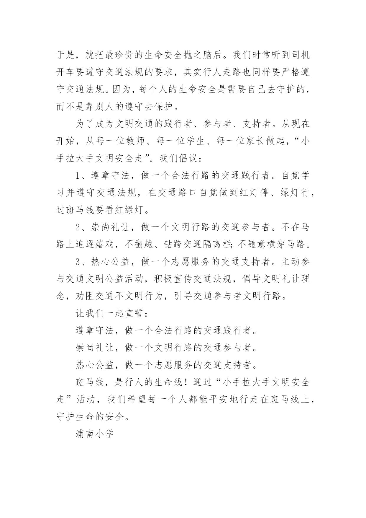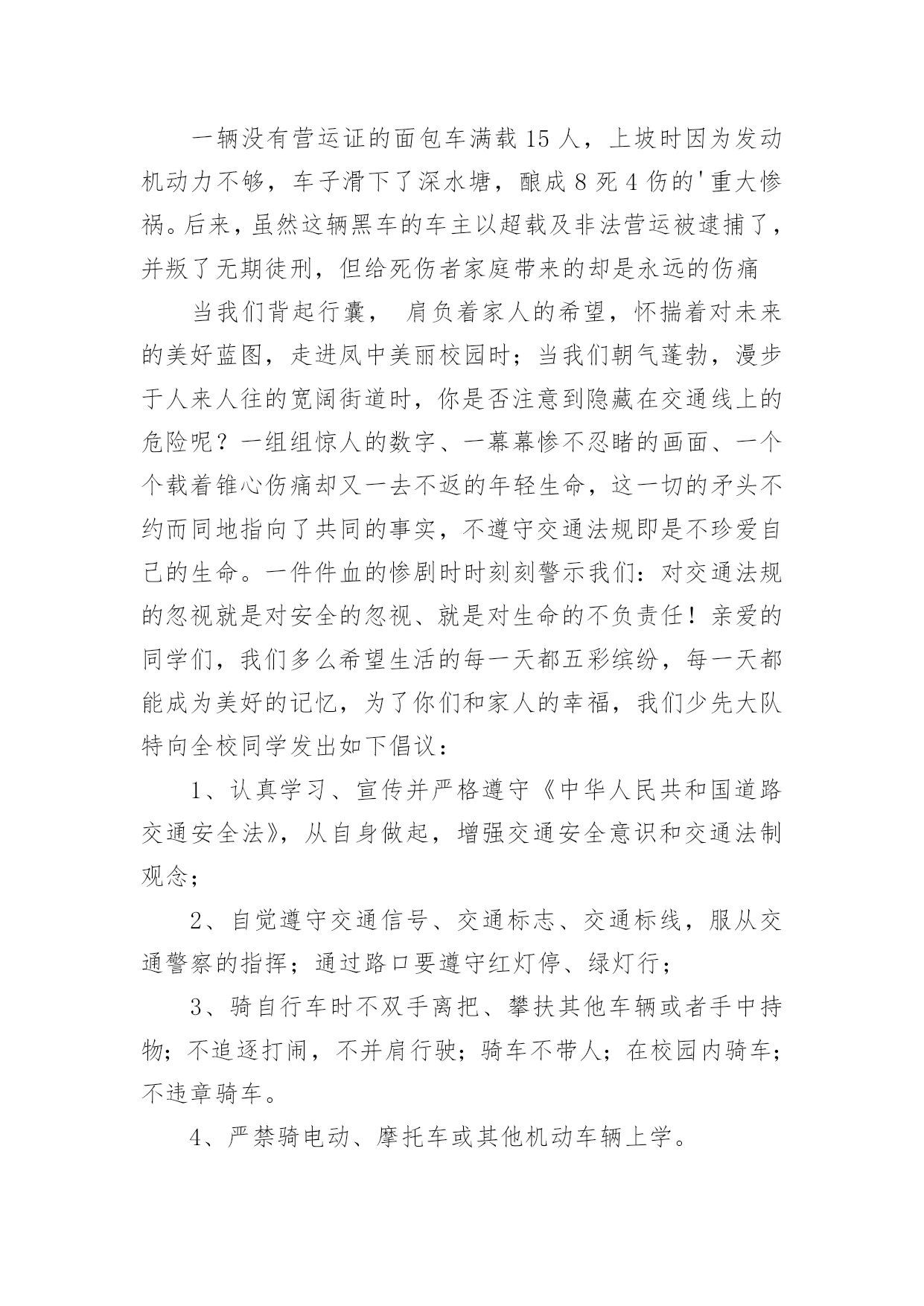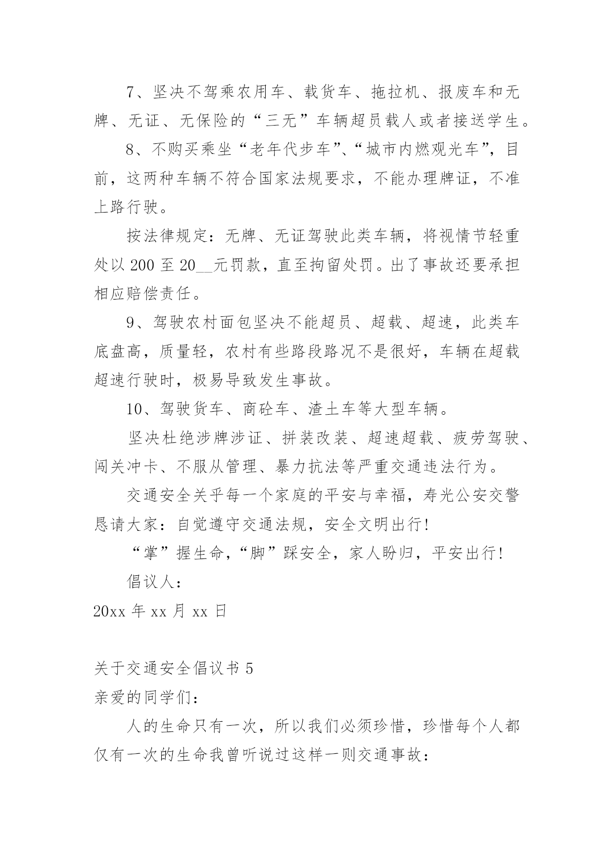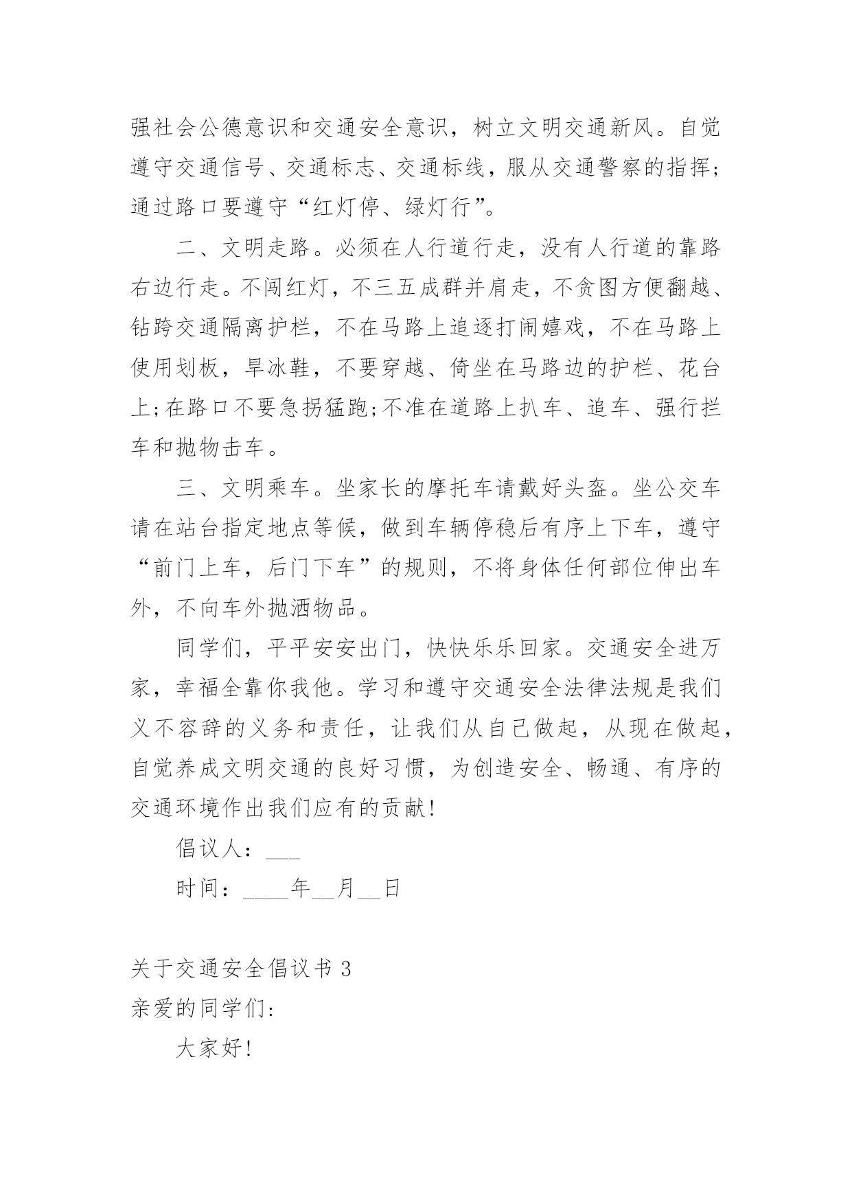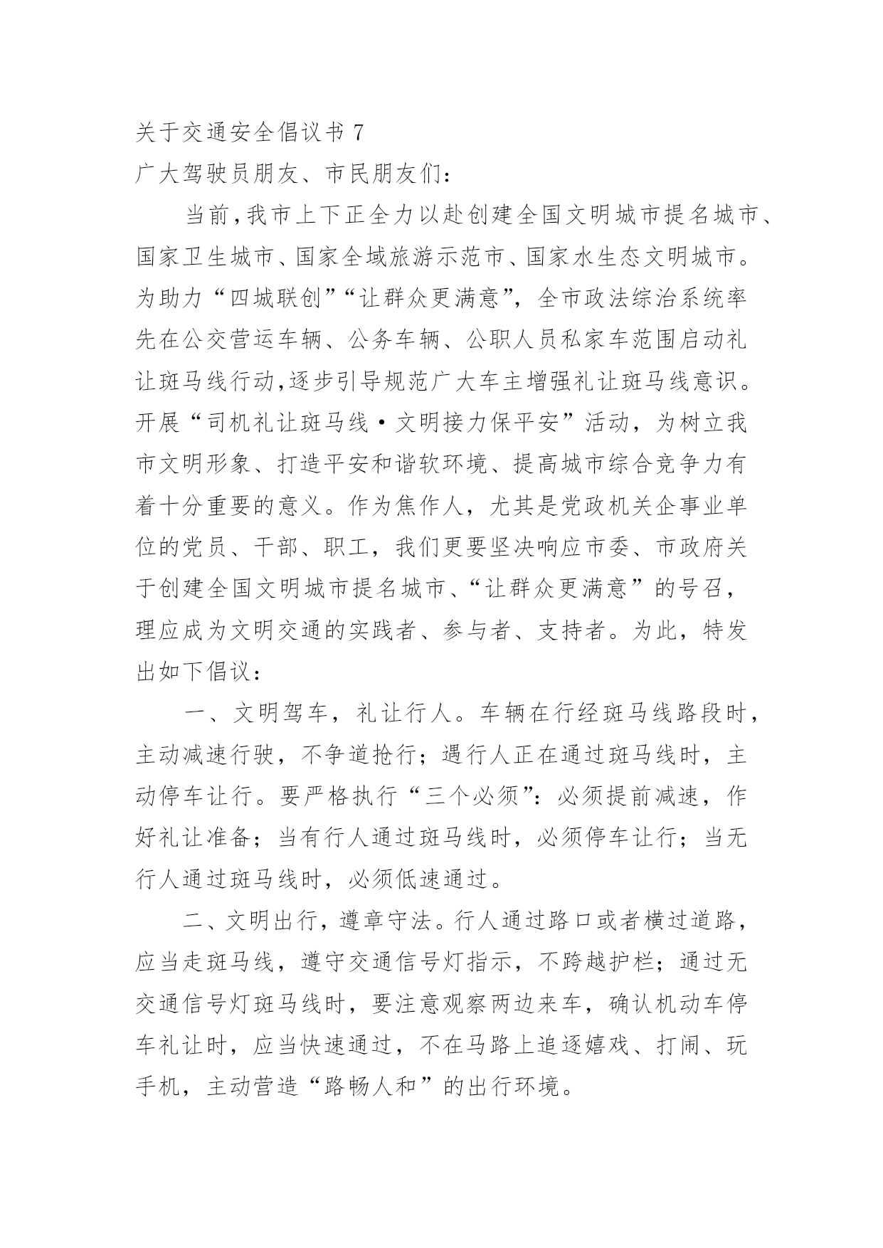 交通安全倡议书关于交通安全倡议书(精选15篇)在学习、工作生活中,接触并使用倡议书的人越来越多,通过倡议书倡议者可以更好地申明发布倡议的目的。如何写一份恰当的倡议书呢?下面是小编收集整理的关于交通安全倡议书,仅供参考,大家一起来看看吧。关于交通安全倡议书1亲爱的同学们:在社会高速发展,交通面貌日新月异,交通路网四通八达,交通车辆川流不息的今天,道路交通安全对于我们每个人来说都尤为重要。为了增强同学们的交通安全意识、交通法制意识、交通文明意识和自我保护能力,共同营造文明、和谐的交通环境,为了你我的生命安全,六一班全体同学向全区的青少年朋友们提出以下几点倡议:一、认真学习、宣传和自觉遵守交通安全法律法规,增强社会公德意识和交通安全意识,树立文明交通新风。二、文明走路:必须在人行道行走,没有人行道的道路要在行走。不闯红灯,不三五成群并肩走,不在马路上追逐打闹嬉戏、使用滑板、旱冰鞋,不要穿越、倚坐在马路边的护栏、花台上,特别在路口,不要急拐猛跑。不准在道路上扒车、追车、强行拦车和抛物击车。三、文明骑车:做到不闯红灯,不走快车道,不扶身并行、猛拐、互相追逐、不牵引、攀扶车辆,不双手离把;步行或骑自行车过马路时要做到“一停、二看、三通过。”四、文明乘车:坐家长的摩托车请戴好头盔;请在站台等候公交车,坐到车辆停稳后有序上下车,遵守“前门上车,后门下车”的规则,不将身体任何部位伸出车外,不向车外抛洒物品;坚决不坐“三无”车辆。五、做文明交通的宣传者和实践者,劝告你的家人、亲戚也要遵守交通规则,珍爱自己和他人的生命。同学们,交通安全系万家,幸福全靠你我他。学习和遵守交通安全法律法规,是我们义不容辞的义务和责任,让我们从自己做起,从现在做起,自觉养成文明交通的良好习惯,为创造安全、畅通、有序的交通环境做出我们应有的共贡献吧!最后祝愿同学们健康成长,学习进步!关于交通安全倡议书2___:俗话说:“没有规矩不成方圆”。遵守交通规则是我们应尽的责任和义务。在社会高速发展、交通面貌日新月异、交通路网四通八达、交通车辆川流不息的今天,道路交通安全对于我们每个人来说尤为重要。为了增强同学们的交通安全意识、交通法制意识、交通文明意识和自我保护能力,共同营造文明、和谐的交通环境,为了你我的生命安全,郑重地向全体同学提出点倡议。一、认真学习、宣传和自觉遵守交通安全法律法规,增强社会公德意识和交通安全意识,树立文明交通新风。自觉遵守交通信号、交通标志、交通标线,服从交通警察的指挥;通过路口要遵守“红灯停、绿灯行”。二、文明走路。必须在人行道行走,没有人行道的靠路右边行走。不闯红灯,不三五成群并肩走,不贪图方便翻越、钻跨交通隔离护栏,不在马路上追逐打闹嬉戏,不在马路上使用划板,旱冰鞋,不要穿越、倚坐在马路边的护栏、花台上;在路口不要急拐猛跑;不准在道路上扒车、追车、强行拦车和抛物击车。三、文明乘车。坐家长的摩托车请戴好头盔。坐公交车请在站台指定地点等候,做到车辆停稳后有序上下车,遵守“前门上车,后门下车”的规则,不将身体任何部位伸出车外,不向车外抛洒物品。同学们,平平安安出门,快快乐乐回家。交通安全进万家,幸福全靠你我他。学习和遵守交通安全法律法规是我们义不容辞的义务和责任,让我们从自己做起,从现在做起,自觉养成文明交通的良好习惯,为创造安全、畅通、有序的交通环境作出我们应有的贡献!倡议人:___时间:____年__月__日关于交通安全倡议书3亲爱的同学们:大家好!我们希望你们能认真学习交通法规,不断增强交通安全意识,告别不文明的交通行为,树立良好的道德风尚。做到:1、认真学习交通安全常识,自觉遵守交通秩序;2、靠路边行走,横过道路走斑马线.’做到“一停、二看、三通过”;3、不闯红灯、不乱穿道路、不在道路上嬉闹玩耍,不越护栏、.不追车扒车、不抛物击车,不行走铁路;4、排队乘车、不向窗外乱扔东西,从右侧下车,不乘坐带病车、超载车和农用车;5、骑车靠右,不逆行、不双手离把、不互相追逐、不扶身并行;不突然猛拐;6、遇交通违法行为及时纠正,遇交通事故主动报警;7、主动宣传交通安全法规,积极参加交通安全社会公益活动同学们,让我们共同携起手来,以我们的真诚和汗水,为我们的青少年创造更美好的明天。祝同学们在人生的旅途中,一路平安,万事如意!倡议人:xxx20xx年3月25日关于交通安全倡议书4广大市民朋友们:你们好,今年以来,我市共发生涉及电动车、自行车、摩托车的死亡交通事故占死亡事故总数的51.5%,其中60岁以上死亡事故占总数的39.2%;为了您和他人的生命安全,寿光公安交警真诚发出如下倡议:1、行人过马路时,要走人行横道,左右环顾确保安全再通过,千万不要在车辆临近时突然横穿马路。2、成年人驾驶电动车、自行车最多载一人;驾驶其他车辆按照核定人数载人。坚决杜绝拼车超员接送学生