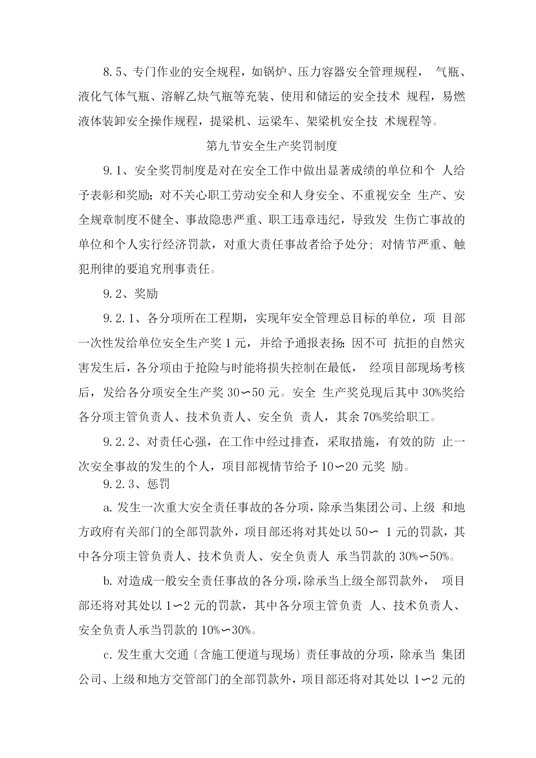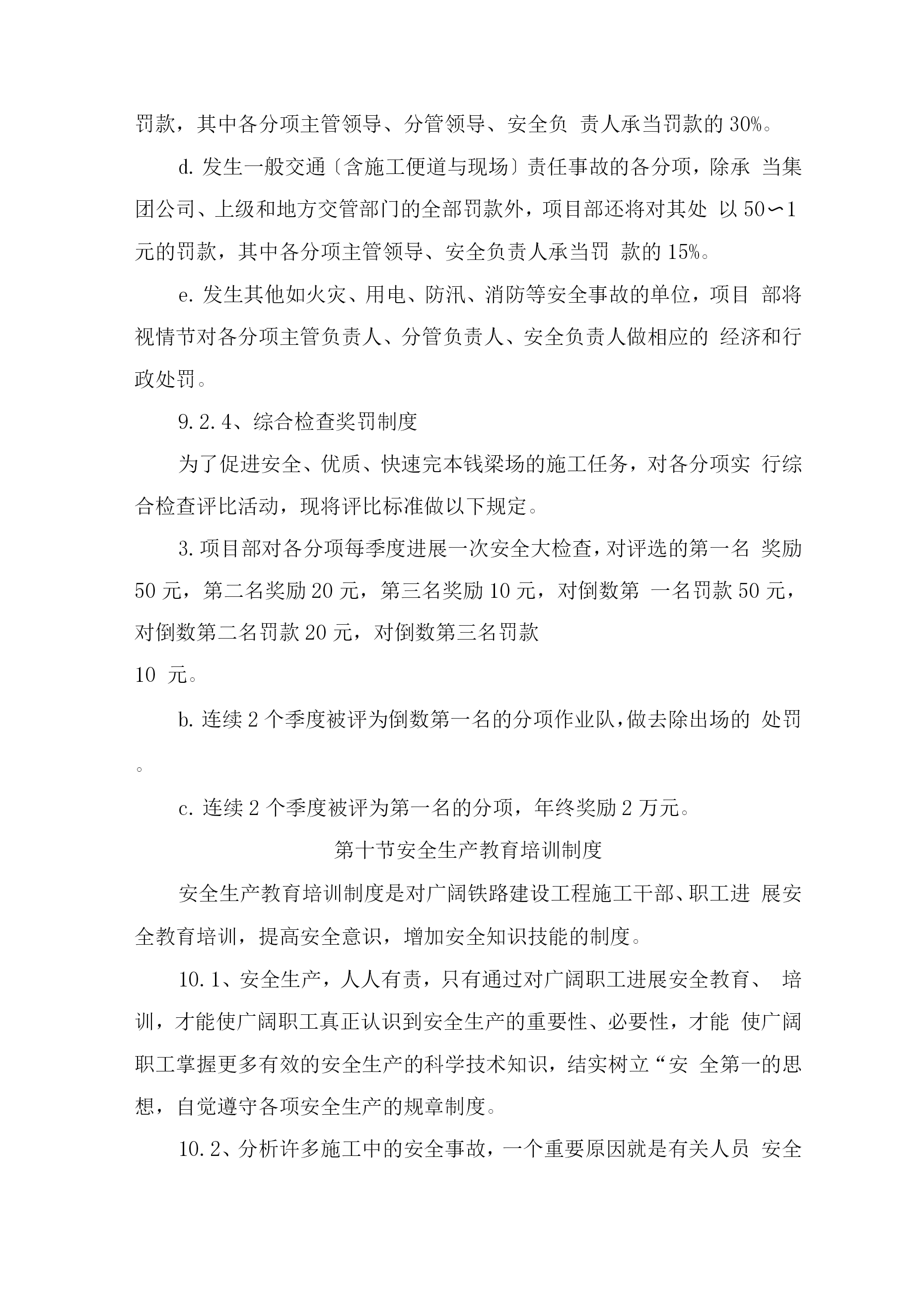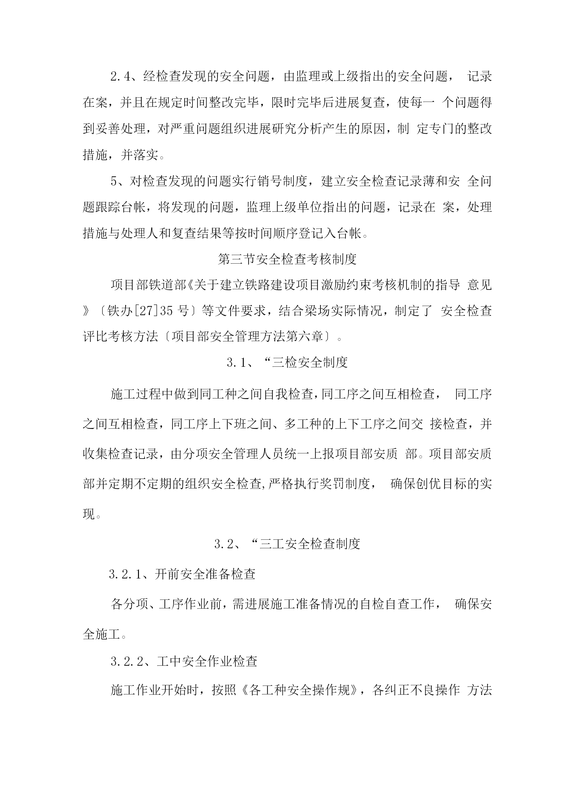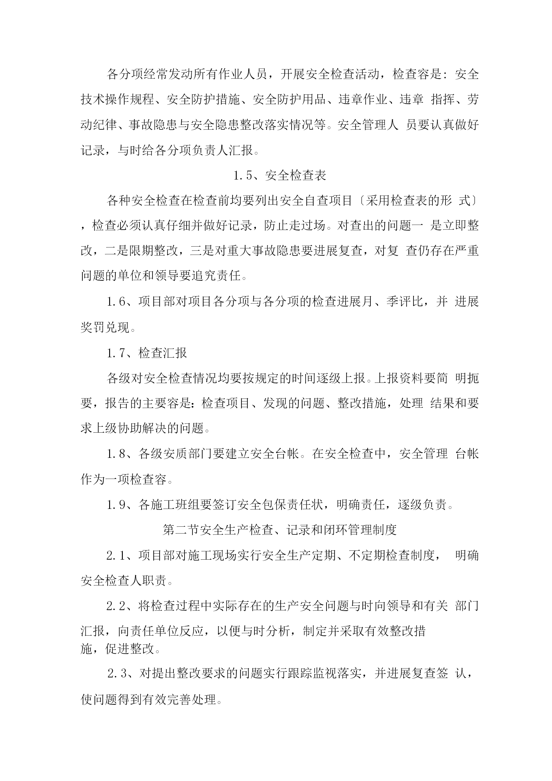 安全环保管理制度第一节安全生产检查制度安全生产检查制度是上级管理部门或施工单位自身对安全施工状况进展定期或不定期检查的制度,通过检查可以发现问题,查出隐患,从而采取有效措施,堵塞漏洞,把事故消灭在发生之前,做到防患于未然,是“预防为主的具体表达,通过检查,还可以总结出好的经验加以推广,为进一步搞好安全工作打下根底;安全检查制度是安全生产的保障。1.1、定期安全检查项目部每月进展一次安全大检查,各分项每半月进展一次安全普查,各施工班组每日进展自检、互检、交接检的检查;凡与安全有关的问题均属检查容;项目经理部检查由总工程师主持,安质环保部牵头,工程技术部、物资设备部、综合办公室等部门派员参加,各分项相关作业队必须积极配合上级部门的专项与重点安全检查;各分项安全检查由各分项技术负责人主持,相关作业队参加。1.2、不定期安全检查根据工程进展情况、施工任务、气候环境等情况进展不定期安全检查,同时专职的安全工程师进展日常的巡回检查;检查的主要容是:易燃易爆品的保管与使用、大型吊装设备作业、混凝土浇注、拉、防火、防触电、防倒塌、防盗、防食物中毒等;安质环保部组织,有关部门参加。1.3、专项安全检查对钢筋加工吊装、混凝土浇注、钢绞线拉等分项工程存在的安全隐患,不定期地进展专业性安全检查。检查由安质环保部门主持,有关部门参加。检查的容和方式由安质部门确定,对存在的安全隐患下发限期整改通知书,并按期复查。1.4、群众性安全检查各分项经常发动所有作业人员,开展安全检查活动,检查容是:安全技术操作规程、安全防护措施、安全防护用品、违章作业、违章指挥、劳动纪律、事故隐患与安全隐患整改落实情况等。安全管理人员要认真做好记录,与时给各分项负责人汇报。1.5、安全检查表各种安全检查在检查前均要列出安全自查项目〔采用检查表的形式〕,检查必须认真仔细并做好记录,防止走过场。对查出的问题一是立即整改,二是限期整改,三是对重大事故隐患要进展复查,对复查仍存在严重问题的单位和领导要追究责任。1.6、项目部对项目各分项与各分项的检查进展月、季评比,并进展奖罚兑现。1.7、检查汇报各级对安全检查情况均要按规定的时间逐级上报。上报资料要简明扼要,报告的主要容是:检查项目、发现的问题、整改措施,处理结果和要求上级协助解决的问题。1.8、各级安质部门要建立安全台帐。在安全检查中,安全管理台帐作为一项检查容。1.9、各施工班组要签订安全包保责任状,明确责任,逐级负责。第二节安全生产检查、记录和闭环管理制度2.1、项目部对施工现场实行安全生产定期、不定期检查制度,明确安全检查人职责。2.2、将检查过程中实际存在的生产安全问题与时向领导和有关部门汇报,向责任单位反应,以便与时分析,制定并采取有效整改措施,促进整改。2.3、对提出整改要求的问题实行跟踪监视落实,并进展复查签认,使问题得到有效完善处理。2.4、经检查发现的安全问题,由监理或上级指出的安全问题,记录在案,并且在规定时间整改完毕,限时完毕后进展复查,使每一个问题得到妥善处理,对严重问题组织进展研究分析产生的原因,制定专门的整改措施,并落实。5、对检查发现的问题实行销号制度,建立安全检查记录薄和安全问题跟踪台帐,将发现的问题,监理上级单位指出的问题,记录在案,处理措施与处理人和复查结果等按时间顺序登记入台帐。第三节安全检查考核制度项目部铁道部《关于建立铁路建设项目激励约束考核机制的指导意见》〔铁办[27]35号〕等文件要求,结合梁场实际情况,制定了安全检查评比考核方法〔项目部安全管理方法第六章〕。3.1、“三检安全制度施工过程中做到同工种之间自我检查,同工序之间互相检查,同工序之间互相检查,同工序上下班之间、多工种的上下工序之间交接检查,并收集检查记录,由分项安全管理人员统一上报项目部安质部。项目部安质部并定期不定期的组织安全检查,严格执行奖罚制度,确保创优目标的实现。3.2、“三工安全检查制度3.2.1、开前安全准备检查各分项、工序作业前,需进展施工准备情况的自检自查工作,确保安全施工。3.2.2、工中安全作业检查施工作业开始时,按照《各工种安全操作规》,各纠正不良操作方法,控制工程的安全标准。记录、整理安全问题记录。对工程施工过程中出现的各种施工安全问题进展报告、处理。3.2.3、工后安全交接检查本项工序作业完成后,班组负责人、安全负责人配合项目部有关部门进展工程安全评定、工程验收等工作。第四节防火安全管理制度4.1、施工现场的防火工作,必须认真贯彻“预防为主,防消结合的方针,立足自防自救,坚持安全第一,实行“谁主管,谁负责的原那么,承受上级领导和当地公安消防部门的监视和指导。4.2、对职工进展经常性的防火宣传教育,普与消防知识,增强消防观念,自觉