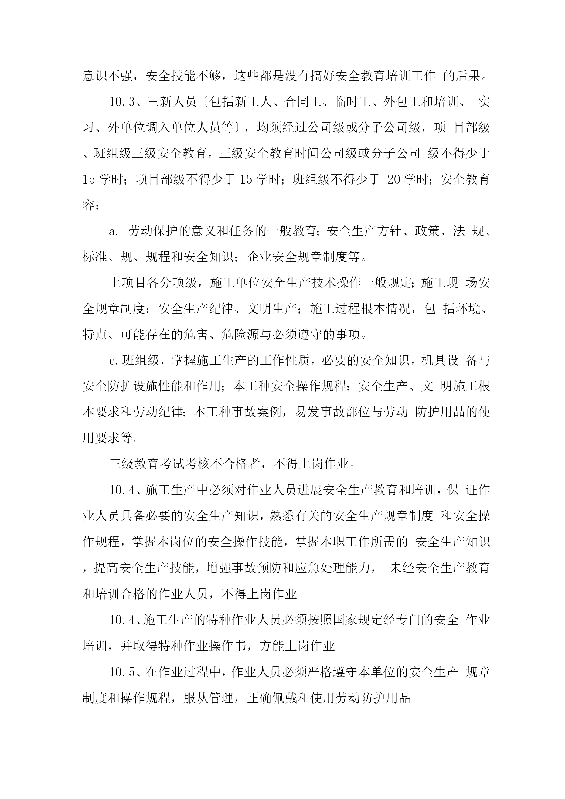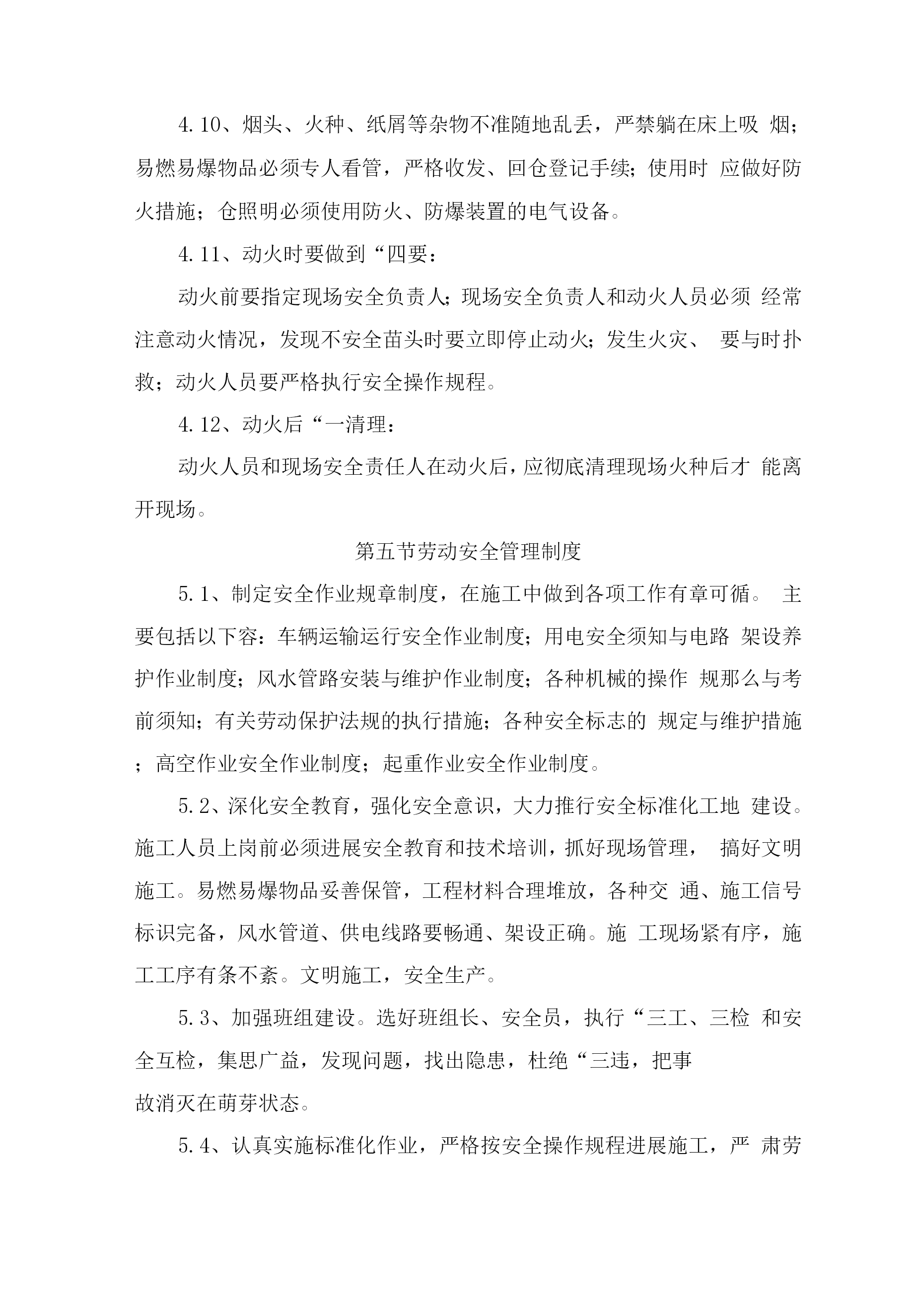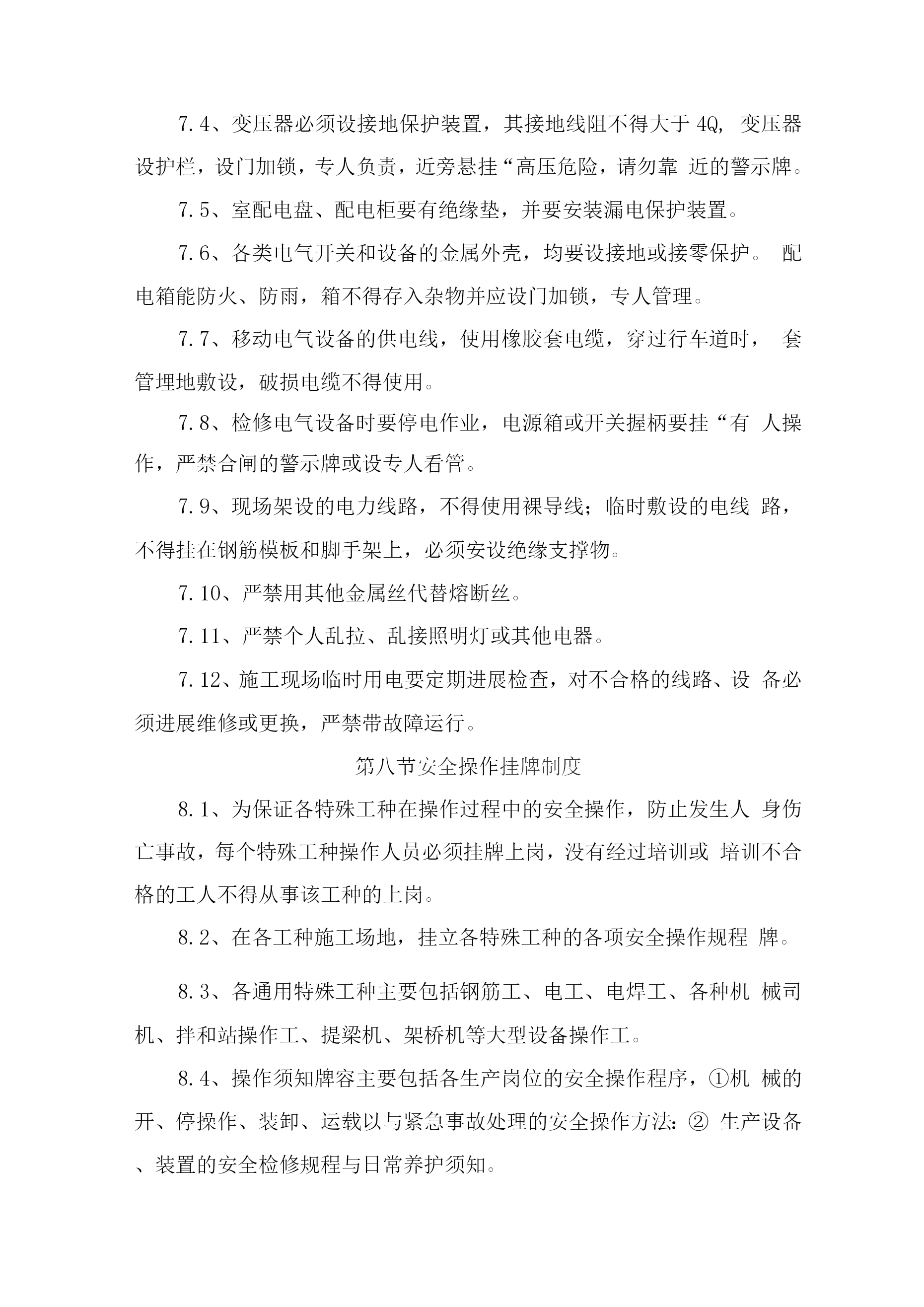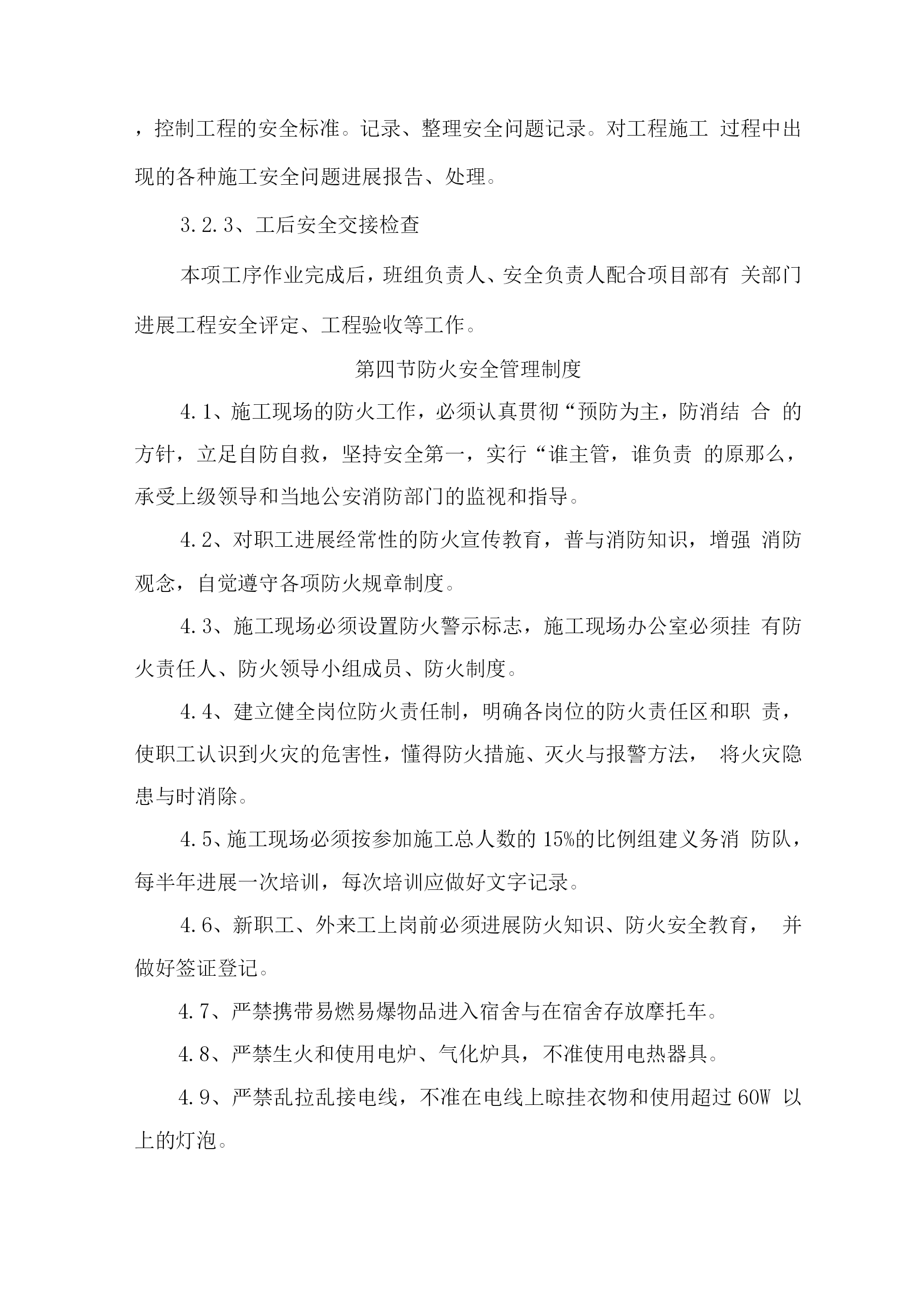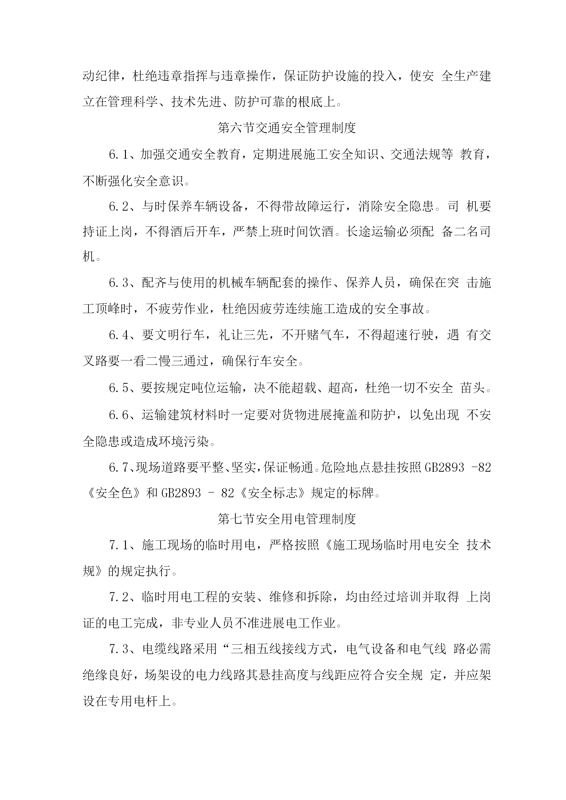 安全环保管理制度第一节安全生产检查制度安全生产检查制度是上级管理部门或施工单位自身对安全施工状况进展定期或不定期检查的制度,通过检查可以发现问题,查出隐患,从而采取有效措施,堵塞漏洞,把事故消灭在发生之前,做到防患于未然,是“预防为主的具体表达,通过检查,还可以总结出好的经验加以推广,为进一步搞好安全工作打下根底;安全检查制度是安全生产的保障。1.1、定期安全检查项目部每月进展一次安全大检查,各分项每半月进展一次安全普查,各施工班组每日进展自检、互检、交接检的检查;凡与安全有关的问题均属检查容;项目经理部检查由总工程师主持,安质环保部牵头,工程技术部、物资设备部、综合办公室等部门派员参加,各分项相关作业队必须积极配合上级部门的专项与重点安全检查;各分项安全检查由各分项技术负责人主持,相关作业队参加。1.2、不定期安全检查根据工程进展情况、施工任务、气候环境等情况进展不定期安全检查,同时专职的安全工程师进展日常的巡回检查;检查的主要容是:易燃易爆品的保管与使用、大型吊装设备作业、混凝土浇注、拉、防火、防触电、防倒塌、防盗、防食物中毒等;安质环保部组织,有关部门参加。1.3、专项安全检查对钢筋加工吊装、混凝土浇注、钢绞线拉等分项工程存在的安全隐患,不定期地进展专业性安全检查。检查由安质环保部门主持,有关部门参加。检查的容和方式由安质部门确定,对存在的安全隐患下发限期整改通知书,并按期复查。1.4、群众性安全检查各分项经常发动所有作业人员,开展安全检查活动,检查容是:安全技术操作规程、安全防护措施、安全防护用品、违章作业、违章指挥、劳动纪律、事故隐患与安全隐患整改落实情况等。安全管理人员要认真做好记录,与时给各分项负责人汇报。1.5、安全检查表各种安全检查在检查前均要列出安全自查项目〔采用检查表的形式〕,检查必须认真仔细并做好记录,防止走过场。对查出的问题一是立即整改,二是限期整改,三是对重大事故隐患要进展复查,对复查仍存在严重问题的单位和领导要追究责任。1.6、项目部对项目各分项与各分项的检查进展月、季评比,并进展奖罚兑现。1.7、检查汇报各级对安全检查情况均要按规定的时间逐级上报。上报资料要简明扼要,报告的主要容是:检查项目、发现的问题、整改措施,处理结果和要求上级协助解决的问题。1.8、各级安质部门要建立安全台帐。在安全检查中,安全管理台帐作为一项检查容。1.9、各施工班组要签订安全包保责任状,明确责任,逐级负责。第二节安全生产检查、记录和闭环管理制度2.1、项目部对施工现场实行安全生产定期、不定期检查制度,明确安全检查人职责。2.2、将检查过程中实际存在的生产安全问题与时向领导和有关部门汇报,向责任单位反应,以便与时分析,制定并采取有效整改措施,促进整改。2.3、对提出整改要求的问题实行跟踪监视落实,并进展复查签认,使问题得到有效完善处理。2.4、经检查发现的安全问题,由监理或上级指出的安全问题,记录在案,并且在规定时间整改完毕,限时完毕后进展复查,使每一个问题得到妥善处理,对严重问题组织进展研究分析产生的原因,制定专门的整改措施,并落实。5、对检查发现的问题实行销号制度,建立安全检查记录薄和安全问题跟踪台帐,将发现的问题,监理上级单位指出的问题,记录在案,处理措施与处理人和复查结果等按时间顺序登记入台帐。第三节安全检查考核制度项目部铁道部《关于建立铁路建设项目激励约束考核机制的指导意见》〔铁办[27]35号〕等文件要求,结合梁场实际情况,制定了安全检查评比考核方法〔项目部安全管理方法第六章〕。3.1、“三检安全制度施工过程中做到同工种之间自我检查,同工序之间互相检查,同工序之间互相检查,同工序上下班之间、多工种的上下工序之间交接检查,并收集检查记录,由分项安全管理人员统一上报项目部安质部。项目部安质部并定期不定期的组织安全检查,严格执行奖罚制度,确保创优目标的实现。3.2、“三工安全检查制度3.2.1、开前安全准备检查各分项、工序作业前,需进展施工准备情况的自检自查工作,确保安全施工。3.2.2、工中安全作业检查施工作业开始时,按照《各工种安全操作规》,各纠正不良操作方法,控制工程的安全标准。记录、整理安全问题记录。对工程施工过程中出现的各种施工安全问题进展报告、处理。3.2.3、工后安全交接检查本项工序作业完成后,班组负责人、安全负责人配合项目部有关部门进展工程安全评定、工程验收等工作。第四节防火安全管理制度4.1、施工现场的防火工作,必须认真贯彻“预防为主,防消结合的方针,立足自防自救,坚持安全第一,实行“谁主管,谁负责的原那么,承受上级领导和当地公安消防部门的监视和指导。4.2、对职工进展经常性的防火宣传教育,普与消防知识,增强消防观念,自觉