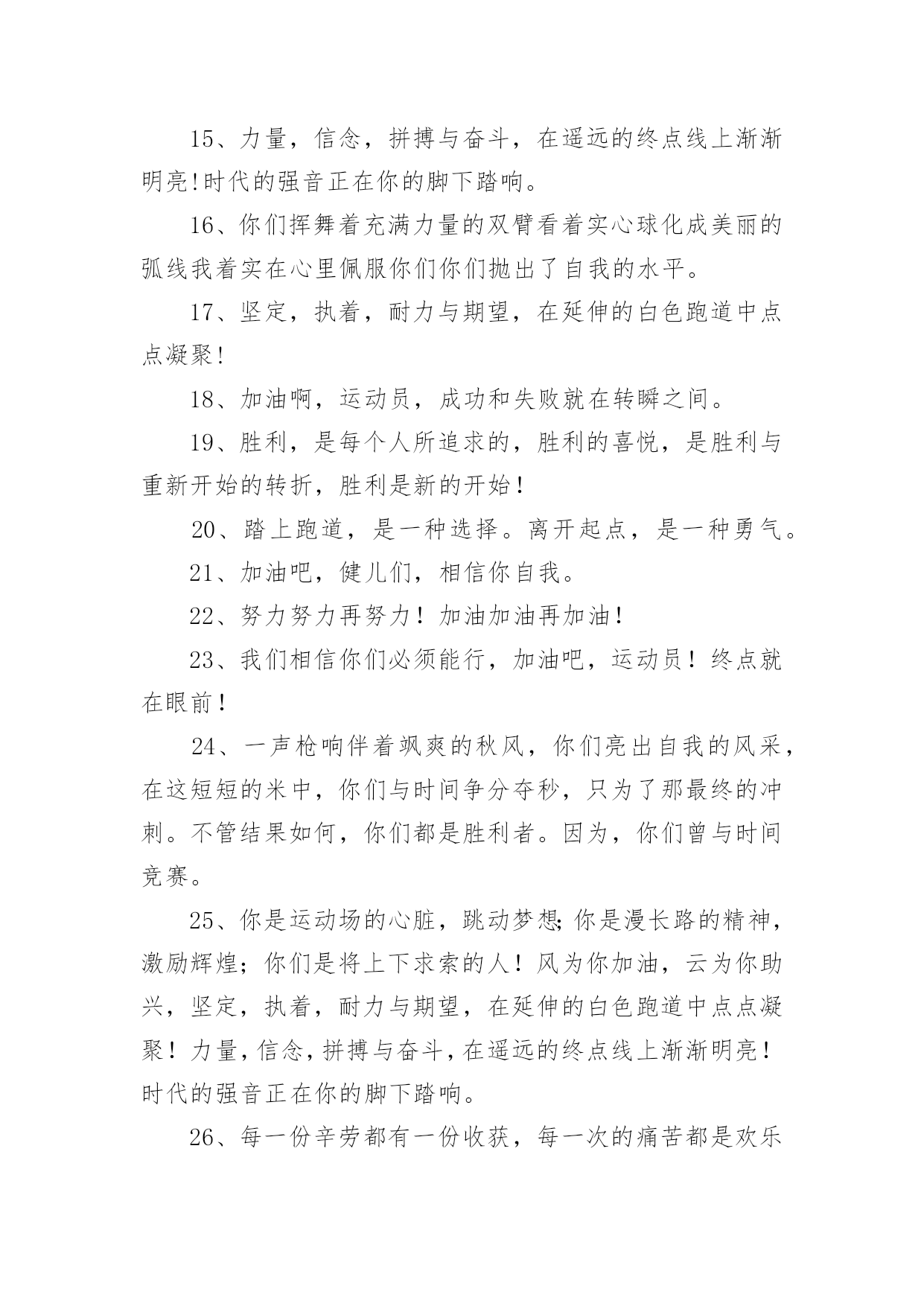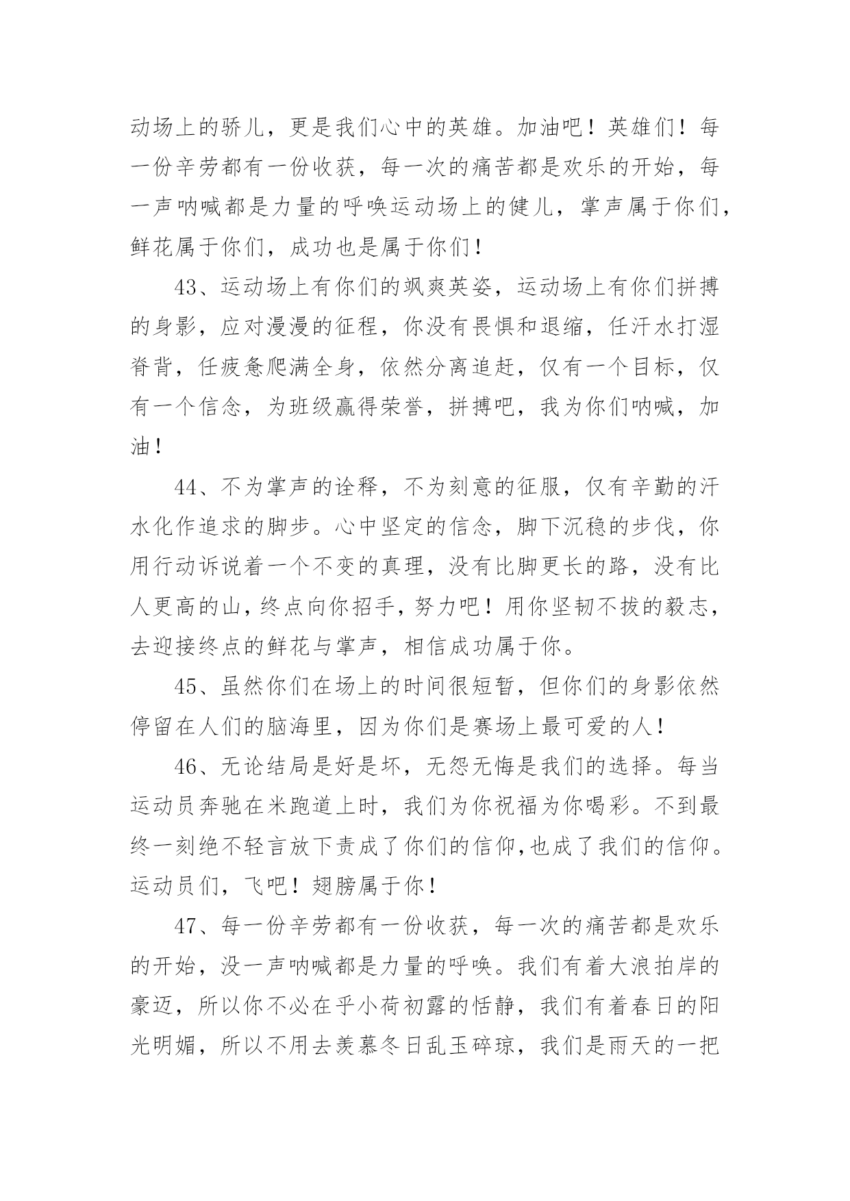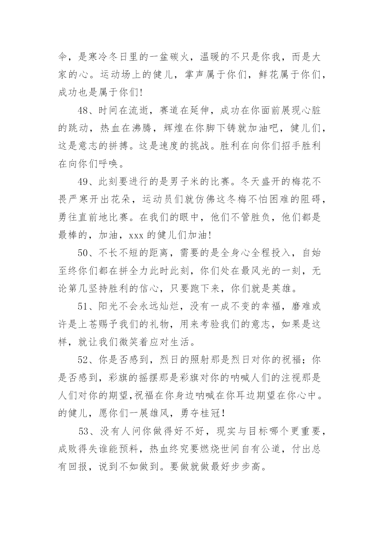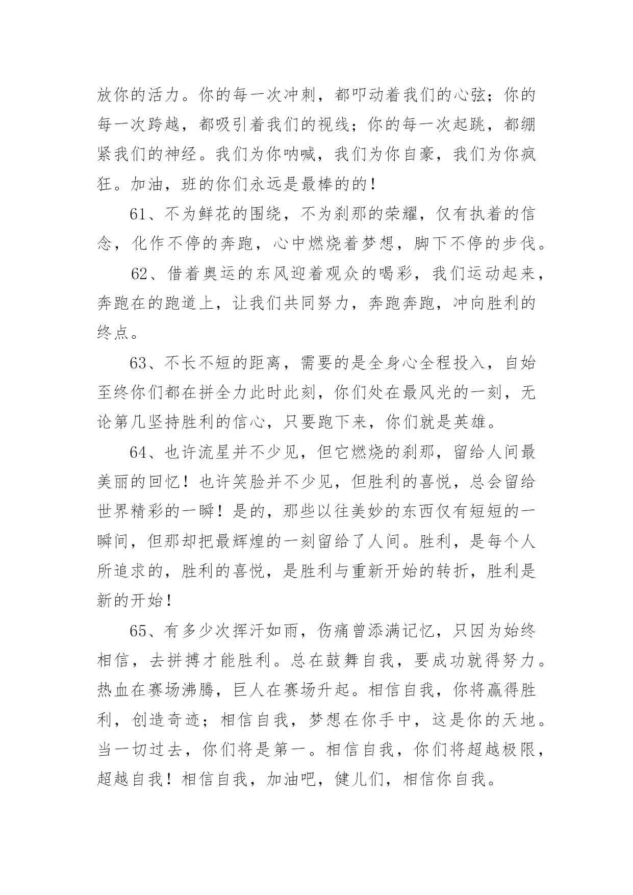 运动会加油稿【热门】运动会加油稿随着社会一步步向前发展,我们需要用到加油稿的情形越来越多,借助加油稿可以点燃对方的激情,激发对方的斗志。那么你有了解过加油稿吗?下面是小编收集整理的运动会加油稿,欢迎大家借鉴与参考,希望对大家有所帮助。运动会加油稿11、坚持的信念是我们期盼的眼神,加油吧健儿们。2、一根小小的木棒,演绎的是奋斗和拼搏加油吧!3、坚持就是胜利!加油加油!加油!!!4、相信自我,加油吧,健儿们,相信你自我。5、加油吧,运动员!终点就在我们眼前!6、用你的精神,去开拓出,一片属于你的长跑天地!7、让我们一齐高呼:我们能行我们能赢!8、亲爱的健儿们,向前冲!我们在为你鼓掌。9、挑战运动极限,演绎健康风采!10、大家加油啊!胜利就在眼前,不要放下,努力拼搏!11、胜利在向你们招手,胜利在向你们呼唤。12、离开起点,是一种勇气。驰骋赛场,是一种胜利。13、论何成功,谈何荣辱,心中的信念仅有一个:拼搏!14、看,那健儿们奋勇拼搏的身影!15、力量,信念,拼搏与奋斗,在遥远的终点线上渐渐明亮!时代的强音正在你的脚下踏响。16、你们挥舞着充满力量的双臂看着实心球化成美丽的弧线我着实在心里佩服你们你们抛出了自我的水平。17、坚定,执着,耐力与期望,在延伸的白色跑道中点点凝聚!18、加油啊,运动员,成功和失败就在转瞬之间。19、胜利,是每个人所追求的,胜利的喜悦,是胜利与重新开始的转折,胜利是新的开始!20、踏上跑道,是一种选择。离开起点,是一种勇气。21、加油吧,健儿们,相信你自我。22、努力努力再努力!加油加油再加油!23、我们相信你们必须能行,加油吧,运动员!终点就在眼前!24、一声枪响伴着飒爽的秋风,你们亮出自我的风采,在这短短的米中,你们与时间争分夺秒,只为了那最终的冲刺。不管结果如何,你们都是胜利者。因为,你们曾与时间竞赛。25、你是运动场的心脏,跳动梦想;你是漫长路的精神,激励辉煌;你们是将上下求索的人!风为你加油,云为你助兴,坚定,执着,耐力与期望,在延伸的白色跑道中点点凝聚!力量,信念,拼搏与奋斗,在遥远的终点线上渐渐明亮!时代的强音正在你的脚下踏响。26、每一份辛劳都有一份收获,每一次的痛苦都是欢乐的开始,没一声呐喊都是力量的呼唤。我们有着大浪拍岸的豪迈,所以你不必在乎小荷初露的恬静,我们有着春日的阳光明媚,所以不用去羡慕冬日乱玉碎琼,我们是雨天的一把伞,是寒冷冬日里的一盆碳火,温暖的不只是你我,而是大家的心。运动场上的健儿,掌声属于你们,鲜花属于你们,成功也是属于你们!27、超越对手,超越自我,是我们的目标,我们的信念,在清凉的初秋,在喧嚣的田径场上,你们点燃了似火的热情,无论成败,我们都为你们感到自豪,你们永远是我们的骄傲!28、踏着秋天的气息,迈着轻盈的脚步,我们迎来了心仪已久的运动会。那里就是展示自我的舞台。来吧,尽情释放你的活力。你的每一次冲刺,都叩动着我们的心弦;你的每一次跨越,都吸引着我们的视线;你的每一次起跳,都绷紧我们的神经。我们为你呐喊,我们为你自豪,我们为你疯狂。加油,班的你们永远是最棒的的!29、超越对手,超越自我,是我们的目标,是我们的信念,在清凉的初冬,在喧嚣的田径场上,。你们点燃了似火的热情,,无论成败,我们都为你们感到自豪,你们永远是我们的骄傲!30、在你的努力中,你滴下了汗水,它浸渍着你的全身,映射着太阳光辉,可是你知道吗那是每个毛孔,为之动容,而流下的泪水,这是速度与毅力的接力,这是期望与祈盼的接力,时间在那里凝固几分几秒也变得如此漫长。31、真心祝愿机会是什么?是不可错过的刹那间。呐喊是什么?是为那刹那间的真心祝愿。加油加油你肯定听到了那一声声呐喊你肯定看到了那双双期待的眼睛你肯定感受到了那发自内心的祝愿。32、亲眼看到同学矫健的身姿,我为你呐喊,你是我们的骄傲,言语不能表达我们的自豪与期盼,仅有鼓足劲,为你们加油!海燕在大海上翱翔,雄鹰在搏击长空,你奔驰在赛场上期望你能够勇往直前,向前胜利的彼岸,冲吧!33、梦想毕竟不一样于现实,失败是生活的一部分,谁也无法选择,无法拒绝。人生要自我去拼搏,去奋斗,在风雨中百折不挠勇往前进,在集资的每个驿站上都留下一段不悔的回忆。流泪不是失落,徘徊不是迷惑,成功属于那些战胜失败,坚持不懈勇于追求梦想的人。加油吧,运动健儿们!34、成功与失败就在一瞬间,但不管成功或失败,你们都冲过了心中的终点,你们永远是好样的,永远是我们心中最美的。你们在呐喊声中,努力努力再努力,拼搏拼搏再拼搏,我们为你呐喊,为你加油,运动会因你们而精彩。35、真的,人生要是能有一个草稿,能再誊写一次,那该多好!我们会绝对认真地叙写自我的人生,也许不必须比别人写得更好,但肯定要比自我第一次写得漂亮。或许,人生不可能像自我想象的那样完美,一生的路也不可能都是平坦的,人的情绪