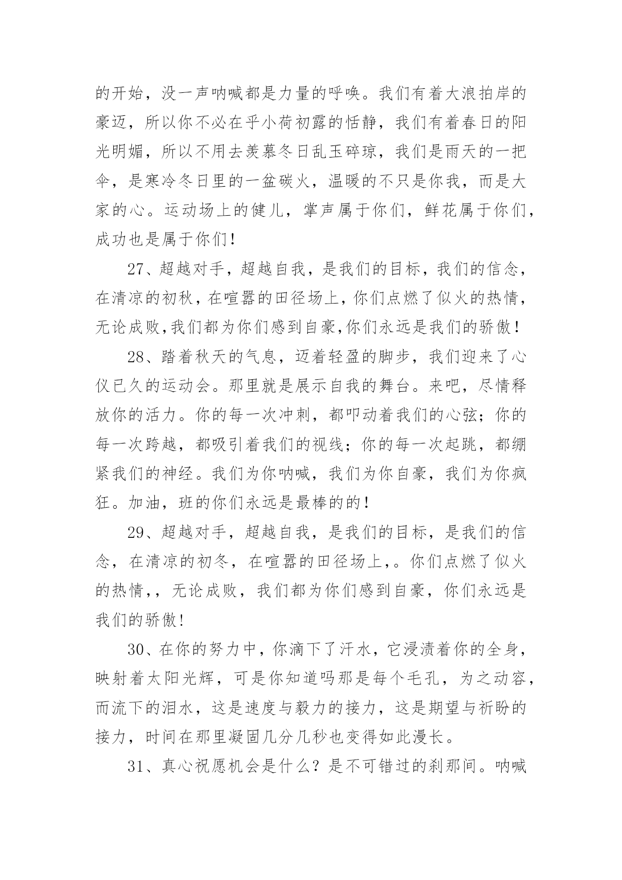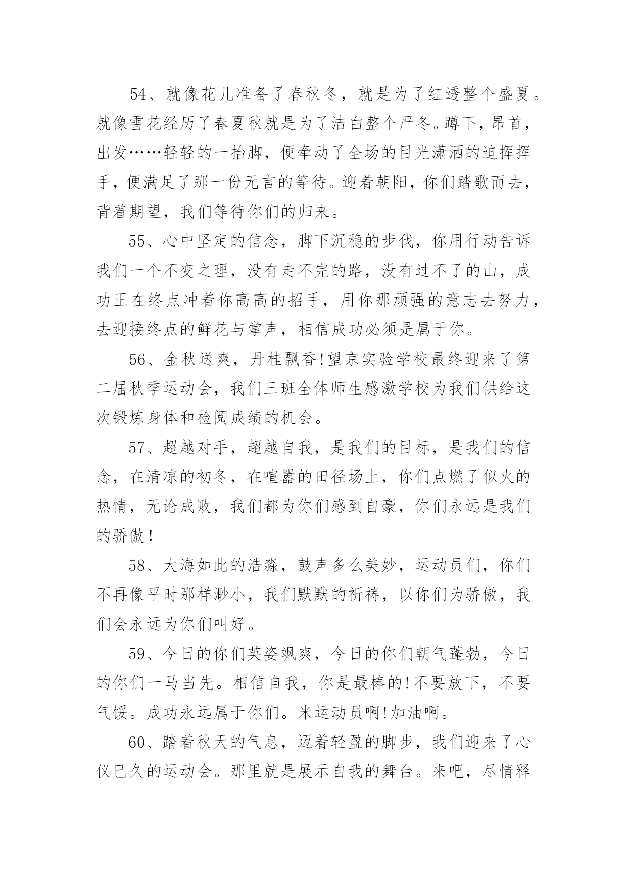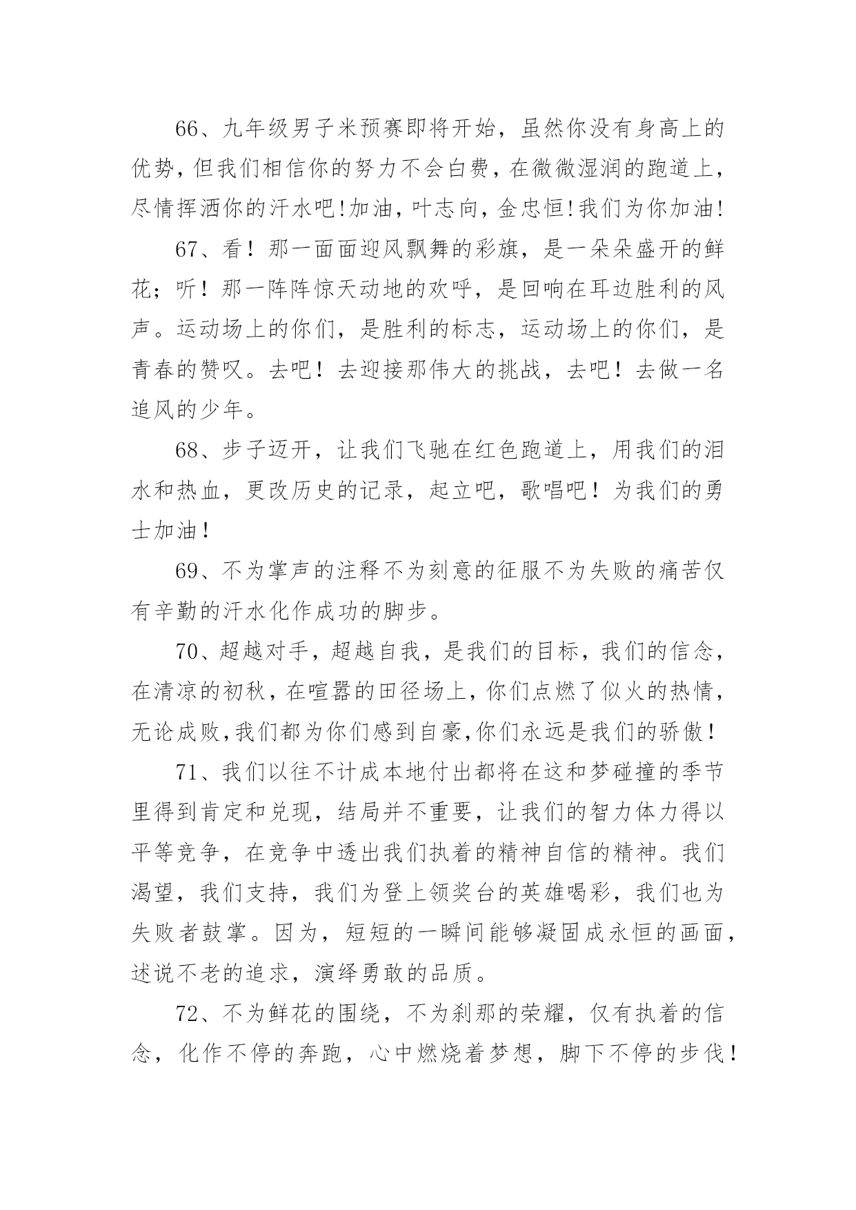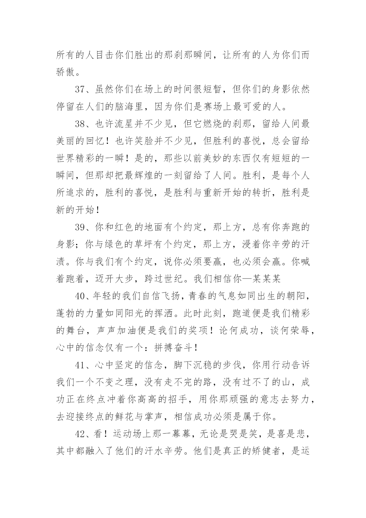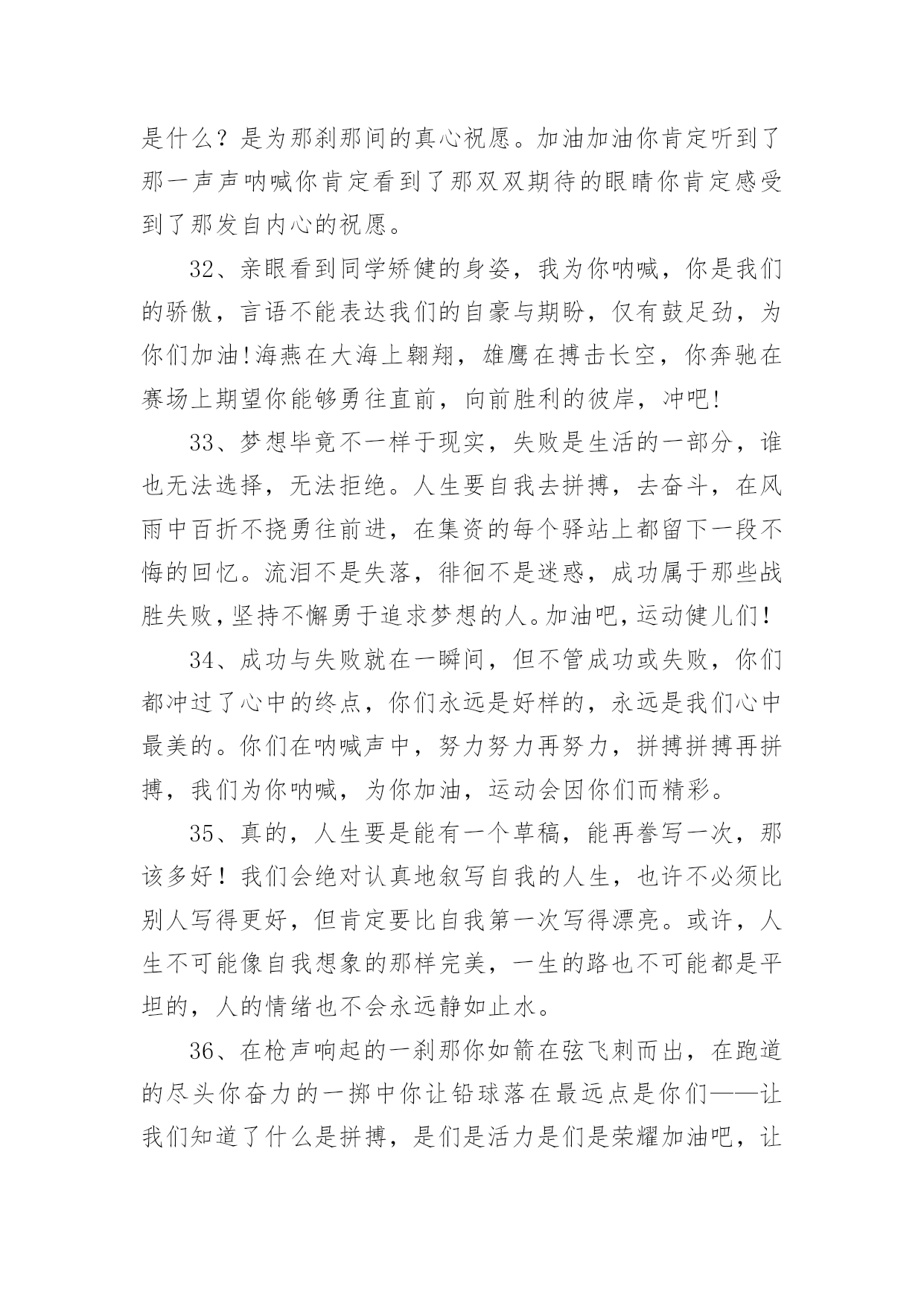 运动会加油稿【热门】运动会加油稿随着社会一步步向前发展,我们需要用到加油稿的情形越来越多,借助加油稿可以点燃对方的激情,激发对方的斗志。那么你有了解过加油稿吗?下面是小编收集整理的运动会加油稿,欢迎大家借鉴与参考,希望对大家有所帮助。运动会加油稿11、坚持的信念是我们期盼的眼神,加油吧健儿们。2、一根小小的木棒,演绎的是奋斗和拼搏加油吧!3、坚持就是胜利!加油加油!加油!!!4、相信自我,加油吧,健儿们,相信你自我。5、加油吧,运动员!终点就在我们眼前!6、用你的精神,去开拓出,一片属于你的长跑天地!7、让我们一齐高呼:我们能行我们能赢!8、亲爱的健儿们,向前冲!我们在为你鼓掌。9、挑战运动极限,演绎健康风采!10、大家加油啊!胜利就在眼前,不要放下,努力拼搏!11、胜利在向你们招手,胜利在向你们呼唤。12、离开起点,是一种勇气。驰骋赛场,是一种胜利。13、论何成功,谈何荣辱,心中的信念仅有一个:拼搏!14、看,那健儿们奋勇拼搏的身影!15、力量,信念,拼搏与奋斗,在遥远的终点线上渐渐明亮!时代的强音正在你的脚下踏响。16、你们挥舞着充满力量的双臂看着实心球化成美丽的弧线我着实在心里佩服你们你们抛出了自我的水平。17、坚定,执着,耐力与期望,在延伸的白色跑道中点点凝聚!18、加油啊,运动员,成功和失败就在转瞬之间。19、胜利,是每个人所追求的,胜利的喜悦,是胜利与重新开始的转折,胜利是新的开始!20、踏上跑道,是一种选择。离开起点,是一种勇气。21、加油吧,健儿们,相信你自我。22、努力努力再努力!加油加油再加油!23、我们相信你们必须能行,加油吧,运动员!终点就在眼前!24、一声枪响伴着飒爽的秋风,你们亮出自我的风采,在这短短的米中,你们与时间争分夺秒,只为了那最终的冲刺。不管结果如何,你们都是胜利者。因为,你们曾与时间竞赛。25、你是运动场的心脏,跳动梦想;你是漫长路的精神,激励辉煌;你们是将上下求索的人!风为你加油,云为你助兴,坚定,执着,耐力与期望,在延伸的白色跑道中点点凝聚!力量,信念,拼搏与奋斗,在遥远的终点线上渐渐明亮!时代的强音正在你的脚下踏响。26、每一份辛劳都有一份收获,每一次的痛苦都是欢乐的开始,没一声呐喊都是力量的呼唤。我们有着大浪拍岸的豪迈,所以你不必在乎小荷初露的恬静,我们有着春日的阳光明媚,所以不用去羡慕冬日乱玉碎琼,我们是雨天的一把伞,是寒冷冬日里的一盆碳火,温暖的不只是你我,而是大家的心。运动场上的健儿,掌声属于你们,鲜花属于你们,成功也是属于你们!27、超越对手,超越自我,是我们的目标,我们的信念,在清凉的初秋,在喧嚣的田径场上,你们点燃了似火的热情,无论成败,我们都为你们感到自豪,你们永远是我们的骄傲!28、踏着秋天的气息,迈着轻盈的脚步,我们迎来了心仪已久的运动会。那里就是展示自我的舞台。来吧,尽情释放你的活力。你的每一次冲刺,都叩动着我们的心弦;你的每一次跨越,都吸引着我们的视线;你的每一次起跳,都绷紧我们的神经。我们为你呐喊,我们为你自豪,我们为你疯狂。加油,班的你们永远是最棒的的!29、超越对手,超越自我,是我们的目标,是我们的信念,在清凉的初冬,在喧嚣的田径场上,。你们点燃了似火的热情,,无论成败,我们都为你们感到自豪,你们永远是我们的骄傲!30、在你的努力中,你滴下了汗水,它浸渍着你的全身,映射着太阳光辉,可是你知道吗那是每个毛孔,为之动容,而流下的泪水,这是速度与毅力的接力,这是期望与祈盼的接力,时间在那里凝固几分几秒也变得如此漫长。31、真心祝愿机会是什么?是不可错过的刹那间。呐喊是什么?是为那刹那间的真心祝愿。加油加油你肯定听到了那一声声呐喊你肯定看到了那双双期待的眼睛你肯定感受到了那发自内心的祝愿。32、亲眼看到同学矫健的身姿,我为你呐喊,你是我们的骄傲,言语不能表达我们的自豪与期盼,仅有鼓足劲,为你们加油!海燕在大海上翱翔,雄鹰在搏击长空,你奔驰在赛场上期望你能够勇往直前,向前胜利的彼岸,冲吧!33、梦想毕竟不一样于现实,失败是生活的一部分,谁也无法选择,无法拒绝。人生要自我去拼搏,去奋斗,在风雨中百折不挠勇往前进,在集资的每个驿站上都留下一段不悔的回忆。流泪不是失落,徘徊不是迷惑,成功属于那些战胜失败,坚持不懈勇于追求梦想的人。加油吧,运动健儿们!34、成功与失败就在一瞬间,但不管成功或失败,你们都冲过了心中的终点,你们永远是好样的,永远是我们心中最美的。你们在呐喊声中,努力努力再努力,拼搏拼搏再拼搏,我们为你呐喊,为你加油,运动会因你们而精彩。35、真的,人生要是能有一个草稿,能再誊写一次,那该多好!我们会绝对认真地叙写自我的人生,也许不必须比别人写得更好,但肯定要比自我第一次写得漂亮。或许,人生不可能像自我想象的那样完美,一生的路也不可能都是平坦的,人的情绪