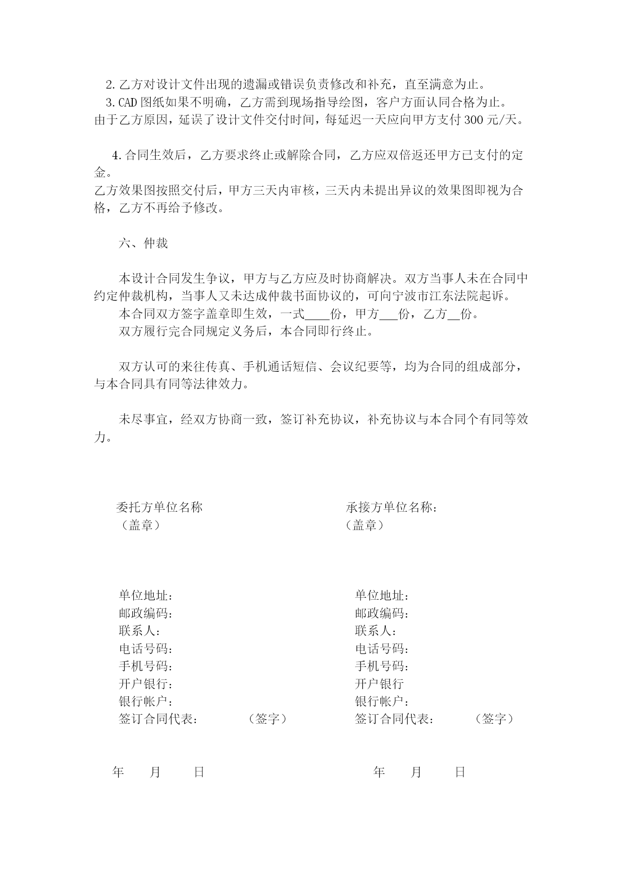 装饰设计合同委托方(甲方):承接方(乙方):甲方委托乙方进行环境设计。根据《中华人民共和国经济合同法》的有关规定,结合该设计的具体情况,为明确责任,紧密配合,搞好工作。经双方协商一致,就本设计签订如下合同,共同遵守。一、制作内容:二、设计工期:工期起始时间:年月日至年月日。三、付款方式:签订合同时甲方需预付乙方人民币元,(做为业务定金),合同签订天内再付款人民币元,设计完成后三天内付清余款人民币元。四、甲方责任及权利1.甲方按本合同规定的内容,在规定时间内向乙方提交基础资料及文件,并对其完整性、正确性及时限负责。2.在合同履行其间,甲方要求终止或解除合同,乙方未开始设计工作的,不退还甲方已付的定金;已开始设计工作的,甲方应根据乙方已进行的实际工作量,不足一半时,按该阶段设计费的一半支付;超过一半时,按该阶段设计费的全部支付。3.甲方必须按合同规定支付定金,收到定金作为乙方设计开工的标志。未收到定金,乙方有权推迟设计工作的开工时间,且交付文件的时间顺延。由于甲方原因,延误了设计文件交付时间或设计完成后剩余尾款结算三天后每延迟一天,应向乙方支付违约金300元/天。五:乙方责任及权利1.乙方应按合约规定的技术规范、标准进行设计,并对提交的设计文件的质量负责。2.乙方对设计文件出现的遗漏或错误负责修改和补充,直至满意为止。3.CAD图纸如果不明确,乙方需到现场指导绘图,客户方面认同合格为止。由于乙方原因,延误了设计文件交付时间,每延迟一天应向甲方支付300元/天。4.合同生效后,乙方要求终止或解除合同,乙方应双倍返还甲方已支付的定金。乙方效果图按照交付后,甲方三天内审核,三天内未提出异议的效果图即视为合格,乙方不再给予修改。六、仲裁本设计合同发生争议,甲方与乙方应及时协商解决。双方当事人未在合同中约定仲裁机构,当事人又未达成仲裁书面协议的,可向宁波市江东法院起诉。本合同双方签字盖章即生效,一式份,甲方份,乙方份。双方履行完合同规定义务后,本合同即行终止。双方认可的来往传真、手机通话短信、会议纪要等,均为合同的组成部分,与本合同具有同等法律效力。未尽事宜,经双方协商一致,签订补充协议,补充协议与本合同个有同等效力。委托方单位名称承接方单位名称:(盖章)(盖章)单位地址:单位地址:邮政编码:邮政编码:联系人:联系人:电话号码:电话号码:手机号码:手机号码:开户银行:开户银行银行帐户:银行帐户:签订合同代表:(签字)签订合同代表:(签字)年月日年月日