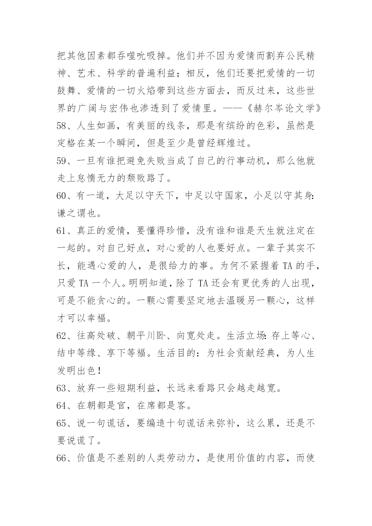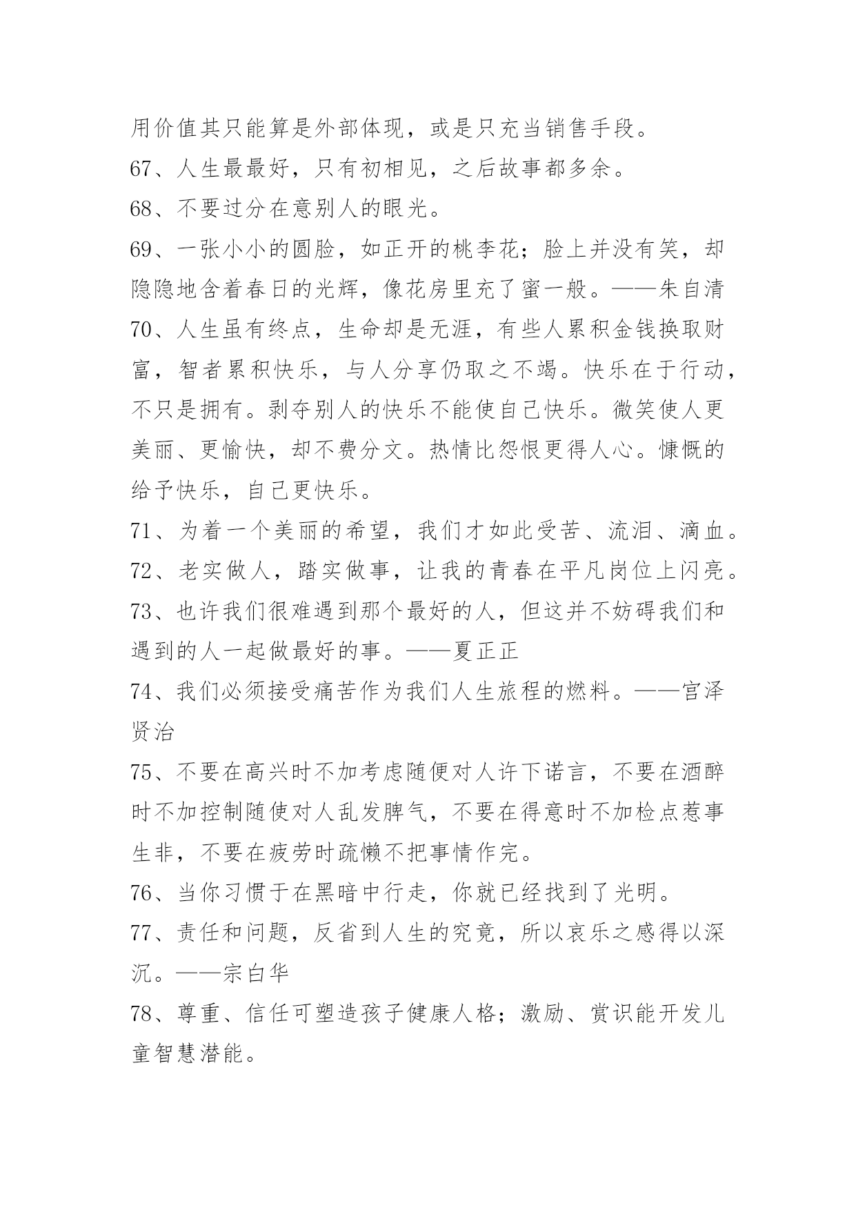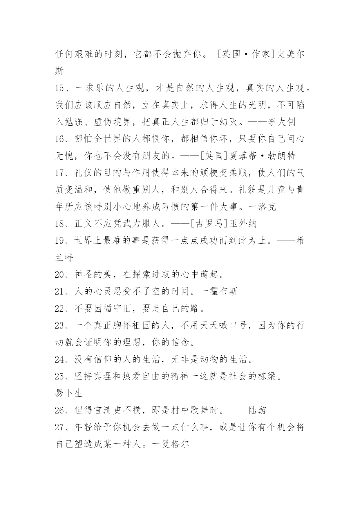 人生格言警句86条【必备】2021年人生格言警句86条持续就有力量,再怎么笨拙的枪手,总有命中的时候。下面是小编帮大家整理的人生格言警句86条,欢迎阅读,希望能够对大家有所帮助。1、我不让工作追求,而是去追求工作,常常努力于完全统驭工作,而不做工作的奴隶。人大凡具有完全统驭工作的信心,精神就必然振奋。一富兰克林2、对自己都不信任,还会信任什么真理。自信是走向成功之路的第一步,缺乏自信是失败的主要原因。患难可以试验一个人的品格,非常的境遇方才可以显出非常的气节,风平浪静的海面,所有船只都可以并驱竞胜,命运的铁拳击中要害的时候,只有大勇大智的人才能够处之泰然。因循观望的人,最善于惊叹他人的敏捷。3、最纯洁的信仰是对于高尚理想的信仰;他是超越个人的祸福观念的。生前的利害不足萦其心,生后的赏罚也不在其念。——佚名4、不是安逸,而是劳动是有德行人的标志。卓越的人不沉溺于舒适的安逸之中,而不断为了善行而努力。他优越于众人之上,从事为小人所不理解和不赞同的工作。——程灏5、要爱惜自己的青春,世界上没有比青春更美好的了,没有比青春更珍贵的了!青春就像黄金,你想做成什么,就能成为什么。6、有道德的人是命令着自己。[德]赫尔巴特《论世界的美的启示为教育的主要工作》7、每个人在少年时都拥有圣洁的空间,当明白空间之外总在刮风时,慢慢就学会在空间周围筑防护栏,并涂上五色的油漆,那一片空间才能保持住圣洁。8、你要记住,在敢于担当培养一个人的`任务之前,自己就必须要造就成一个人,自己就必须是一个值得推崇的模范。——[法国]卢梭9、越有知识的人,越把知识放在肚子里,总缄默不语;越无知识的人,越把知识挂在嘴上,常常四处卖弄。10、学师范的人,本来是教少年男女的,是教少年男女去做人的,做人的最大事情是什么呢?就是要知道怎么样爱国,怎么样可以管国事。11、憎恨常常和美貌住在一起,不要太过草率地追求美貌。[德]瓦尔特12、发表自己不正确的意见——要比转述别人的一个真理更有意义,在第一种情况下,你才是人;而在第二种情况下,你不过是只鹦鹉!——[俄国]陀思安耶夫斯基13、语言作为工具,对于我们之重要,正如骏马对于骑士的重要。最好的骏马适合于最好的骑士,最好的语言适合于最好的思想。作品的善在于思想,美在于词章雕饰。美与善都是可喜的。——但丁14、书籍是最有耐心、最能忍耐和最令人愉快的伙伴。在任何艰难的时刻,它都不会抛弃你。[英国·作家]史美尔斯15、一求乐的人生观,才是自然的人生观,真实的人生观。我们应该顺应自然,立在真实上,求得人生的光明,不可陷入勉强、虚伪境界,把真正人生都归于幻灭。——李大钊16、哪怕全世界的人都恨你,都相信你坏,只要你自己问心无愧,你也不会没有朋友的。——[英国]夏落蒂·勃朗特17、礼仪的目的与作用使得本来的顽梗变柔顺,使人们的气质变温和,使他敬重别人,和别人合得来。礼貌是儿童与青年所应该特别小心地养成习惯的第一件大事。一洛克18、正义不应凭武力服人。——[古罗马]玉外纳19、世界上最难的事是获得一点点成功而到此为止。——希兰特20、神圣的美,在探索进取的心中萌起。21、人的心灵忍受不了空的时间。一霍布斯22、不要因循守旧,要走自己的路。23、一个真正胸怀祖国的人,不用天天喊口号,因为你的行动就会证明你的理想,你的信念。24、没有信仰的人的生活,无非是动物的生活。25、坚持真理和热爱自由的精神一这就是社会的栋梁。——易卜生26、但得官清吏不横,即是村中歌舞时。——陆游27、年轻给予你机会去做一点什么事,或是让你有个机会将自己塑造成某一种人。一曼格尔28、我们只求把自己交给所向往和为之奋斗的事物。——[法国]罗曼·罗兰29、我们要用智慧的汗水去湿润希望的沙漠,用勤劳的双手去开垦贫瘠的希望。30、能给人带来一丝乐趣的人,幸福的是他本身。31、一个真正的朋友一定会在你困难时竭力帮助。32、大人物并不全都伟大,小人物也并不全都渺小。(拉丁美洲)33、我的名誉就是我的财产,我仅仅为了它而生活。——[法国]司汤达34、自己如能自如地掌握自己,那么你的成功将指日可待。35、爱情能减少男人的刚强,增加女人的勇气。——李斯特36、再没有什么能比人的母亲更为伟大。——[美国]惠特曼37、我能想像到的人的最高尚行为,除了传播真理,就是公开放弃错误。——利斯特38、只有披荆棘的勇士,寻幽探胜,才能身入宝山满载而归。39、即使做一棵默默无闻的小草,也时刻不要忘记自己的使命。40、只要你的心里充满活力、希望,这爱的芬芳就永远属于你。41、和时间并驾齐驱的人永远年轻。42、看淡人生,是一种境界与豁然。涉世历事,有所为,有所不为,有所争,有所不争,有所求,有所不求。自身利益不轻丢,身外利益不强求。43、人生是跋涉,也是旅行;是等待,也是重逢;是探险,也是寻宝;是眼泪,也是歌声