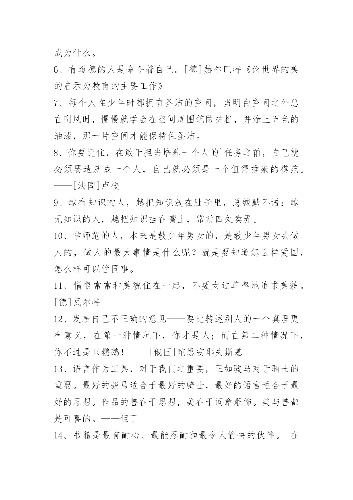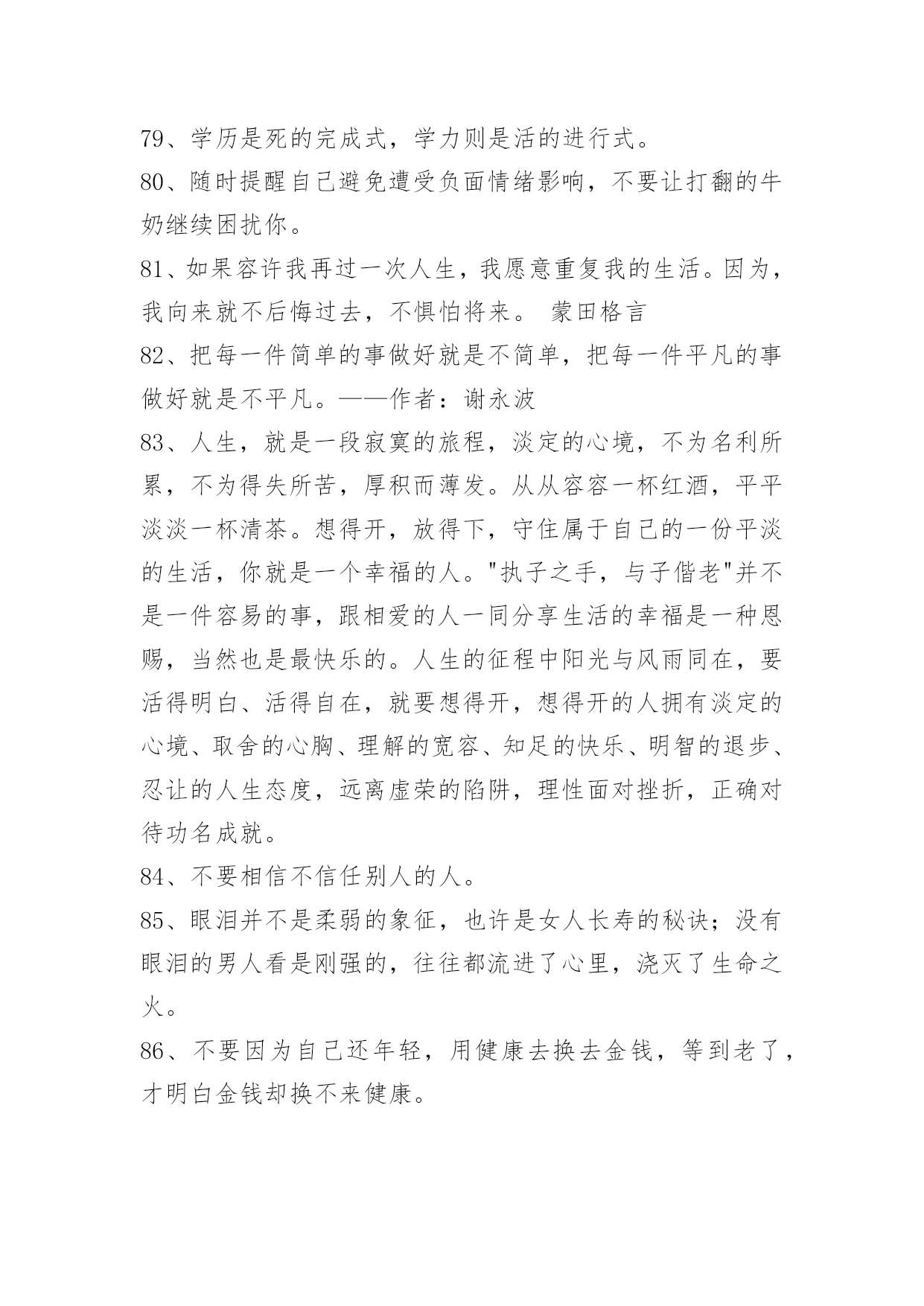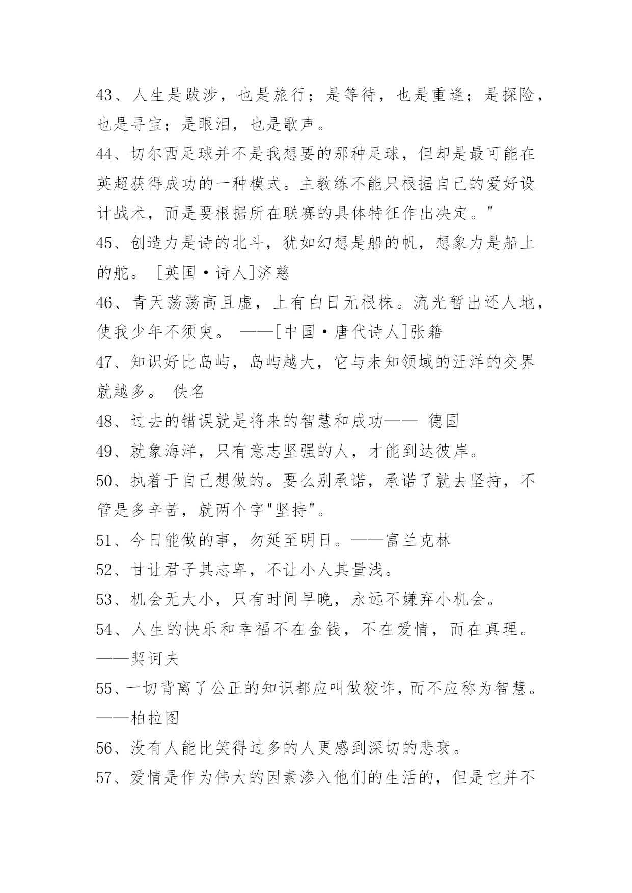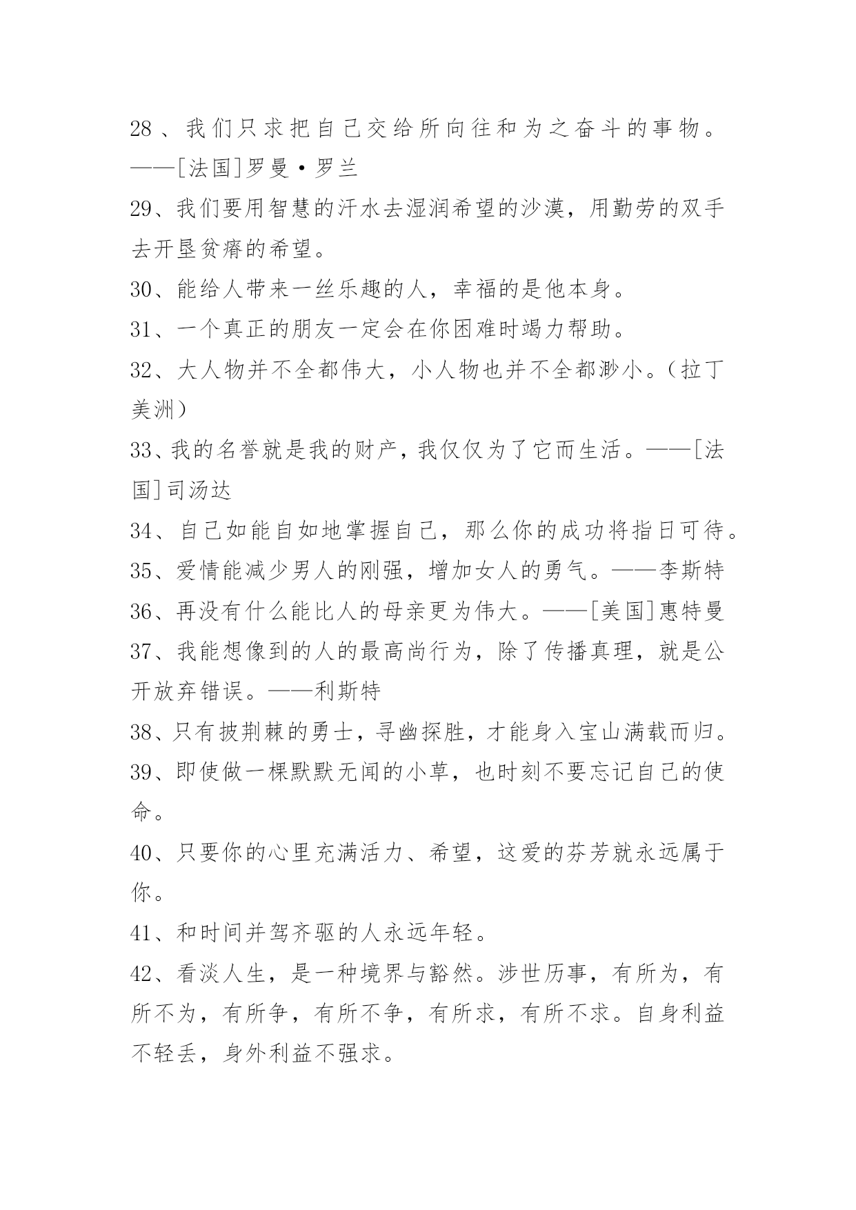 人生格言警句86条【必备】2021年人生格言警句86条持续就有力量,再怎么笨拙的枪手,总有命中的时候。下面是小编帮大家整理的人生格言警句86条,欢迎阅读,希望能够对大家有所帮助。1、我不让工作追求,而是去追求工作,常常努力于完全统驭工作,而不做工作的奴隶。人大凡具有完全统驭工作的信心,精神就必然振奋。一富兰克林2、对自己都不信任,还会信任什么真理。自信是走向成功之路的第一步,缺乏自信是失败的主要原因。患难可以试验一个人的品格,非常的境遇方才可以显出非常的气节,风平浪静的海面,所有船只都可以并驱竞胜,命运的铁拳击中要害的时候,只有大勇大智的人才能够处之泰然。因循观望的人,最善于惊叹他人的敏捷。3、最纯洁的信仰是对于高尚理想的信仰;他是超越个人的祸福观念的。生前的利害不足萦其心,生后的赏罚也不在其念。——佚名4、不是安逸,而是劳动是有德行人的标志。卓越的人不沉溺于舒适的安逸之中,而不断为了善行而努力。他优越于众人之上,从事为小人所不理解和不赞同的工作。——程灏5、要爱惜自己的青春,世界上没有比青春更美好的了,没有比青春更珍贵的了!青春就像黄金,你想做成什么,就能成为什么。6、有道德的人是命令着自己。[德]赫尔巴特《论世界的美的启示为教育的主要工作》7、每个人在少年时都拥有圣洁的空间,当明白空间之外总在刮风时,慢慢就学会在空间周围筑防护栏,并涂上五色的油漆,那一片空间才能保持住圣洁。8、你要记住,在敢于担当培养一个人的`任务之前,自己就必须要造就成一个人,自己就必须是一个值得推崇的模范。——[法国]卢梭9、越有知识的人,越把知识放在肚子里,总缄默不语;越无知识的人,越把知识挂在嘴上,常常四处卖弄。10、学师范的人,本来是教少年男女的,是教少年男女去做人的,做人的最大事情是什么呢?就是要知道怎么样爱国,怎么样可以管国事。11、憎恨常常和美貌住在一起,不要太过草率地追求美貌。[德]瓦尔特12、发表自己不正确的意见——要比转述别人的一个真理更有意义,在第一种情况下,你才是人;而在第二种情况下,你不过是只鹦鹉!——[俄国]陀思安耶夫斯基13、语言作为工具,对于我们之重要,正如骏马对于骑士的重要。最好的骏马适合于最好的骑士,最好的语言适合于最好的思想。作品的善在于思想,美在于词章雕饰。美与善都是可喜的。——但丁14、书籍是最有耐心、最能忍耐和最令人愉快的伙伴。在任何艰难的时刻,它都不会抛弃你。[英国·作家]史美尔斯15、一求乐的人生观,才是自然的人生观,真实的人生观。我们应该顺应自然,立在真实上,求得人生的光明,不可陷入勉强、虚伪境界,把真正人生都归于幻灭。——李大钊16、哪怕全世界的人都恨你,都相信你坏,只要你自己问心无愧,你也不会没有朋友的。——[英国]夏落蒂·勃朗特17、礼仪的目的与作用使得本来的顽梗变柔顺,使人们的气质变温和,使他敬重别人,和别人合得来。礼貌是儿童与青年所应该特别小心地养成习惯的第一件大事。一洛克18、正义不应凭武力服人。——[古罗马]玉外纳19、世界上最难的事是获得一点点成功而到此为止。——希兰特20、神圣的美,在探索进取的心中萌起。21、人的心灵忍受不了空的时间。一霍布斯22、不要因循守旧,要走自己的路。23、一个真正胸怀祖国的人,不用天天喊口号,因为你的行动就会证明你的理想,你的信念。24、没有信仰的人的生活,无非是动物的生活。25、坚持真理和热爱自由的精神一这就是社会的栋梁。——易卜生26、但得官清吏不横,即是村中歌舞时。——陆游27、年轻给予你机会去做一点什么事,或是让你有个机会将自己塑造成某一种人。一曼格尔28、我们只求把自己交给所向往和为之奋斗的事物。——[法国]罗曼·罗兰29、我们要用智慧的汗水去湿润希望的沙漠,用勤劳的双手去开垦贫瘠的希望。30、能给人带来一丝乐趣的人,幸福的是他本身。31、一个真正的朋友一定会在你困难时竭力帮助。32、大人物并不全都伟大,小人物也并不全都渺小。(拉丁美洲)33、我的名誉就是我的财产,我仅仅为了它而生活。——[法国]司汤达34、自己如能自如地掌握自己,那么你的成功将指日可待。35、爱情能减少男人的刚强,增加女人的勇气。——李斯特36、再没有什么能比人的母亲更为伟大。——[美国]惠特曼37、我能想像到的人的最高尚行为,除了传播真理,就是公开放弃错误。——利斯特38、只有披荆棘的勇士,寻幽探胜,才能身入宝山满载而归。39、即使做一棵默默无闻的小草,也时刻不要忘记自己的使命。40、只要你的心里充满活力、希望,这爱的芬芳就永远属于你。41、和时间并驾齐驱的人永远年轻。42、看淡人生,是一种境界与豁然。涉世历事,有所为,有所不为,有所争,有所不争,有所求,有所不求。自身利益不轻丢,身外利益不强求。43、人生是跋涉,也是旅行;是等待,也是重逢;是探险,也是寻宝;是眼泪,也是歌声