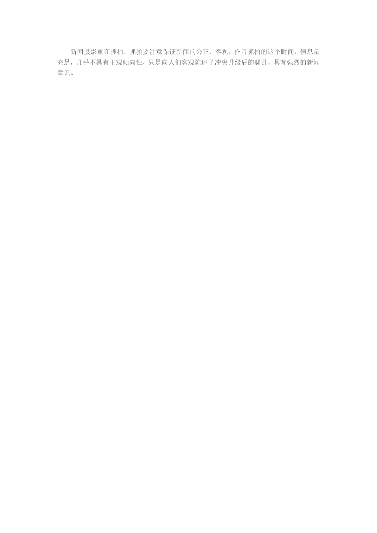 新闻照片摄影作品分析09年6月16日,德黑兰,大批伊朗总统候选人穆萨维的支持者走上街头进行反政府抗议活动。断续的骚乱一直持续到09年末尾,最新进展是12月7日,8所伊朗大学的学生再次走上街头与警方爆发了冲突,最终军警向学生开枪。这是一张抓拍的新闻照片,拍摄者采用的是自然光下拍摄,大全景构图。照片的重心是位于左侧黄金分割点处的火光,前景是奔跑的学生,后景是浓烟笼罩的城市建筑。摄影者注重画幅中的斜线、直线交错,注意光、影的分布。这张照片旨在体现骚动与混乱,摄影师的照相机不撒谎,它只是忠实的记录了12月7日这天发生的事件的一个瞬间,至于穆萨维的支持者和军警谁对谁错,从这张照片上是无从判断的,我们甚至可以大胆的猜测,摄影师在拍摄时也是迷茫的,所以他没有选择拍摄人们的面部表情,而是捕捉背影。这些学生奔向的是火光与烟雾,不是太阳,所以,我们可以看到,通过快门控制拍摄的近景处呼喊男子的表情是不能被识别的。还有一种可能就是,作者不想让政府当局看清这个学生的面容,是一种中立、保护态度。摄影术是瞬间的艺术,这张图片更多意义上来讲是瞬间的历史。它可以让人们直观的看到伊朗持续了半年“选举事件”的一个侧面。照片中最重要的是它所包含的信息。看到这张照片,人们无从判断这火是怎么来的,究竟是军警扔的燃烧弹,还是示威游行的学生们纵火焚烧的政府官员头像的海报?但是,读者们都能看出这火是一种征兆,是冲突不断升温后燃烧起来的,是伊朗内政中不和谐的音符。也许它是一种自由的象征,象征学生们对政府选举的质疑,象征人们对公平公正的渴望,燃起的是人们的希望,所以照片中的人们都奔向那里。也许这火是一种邪恶的元素,学生们被利用,然后无理取闹,破坏了伊朗人们安定的生活,浓烟笼罩在城市上空,就像一个不安定的魔鬼一直徘徊在德黑兰上空,阻挡光明前进的步伐。由于摄影师所站的位置,整幅图片在色彩方面能给人留下深刻印象。左侧偏蓝,象征着冷静与自由;右侧在火光的反映下偏红,预示着血腥与争斗。静止的建筑在画中因人物的运动显得也不安定了,有一种岌岌可危的感觉。新闻摄影重在抓拍,抓拍要注意保证新闻的公正、客观,作者抓拍的这个瞬间,信息量充足,几乎不具有主观倾向性,只是向人们客观陈述了冲突升级后的骚乱,具有强烈的新闻意识。