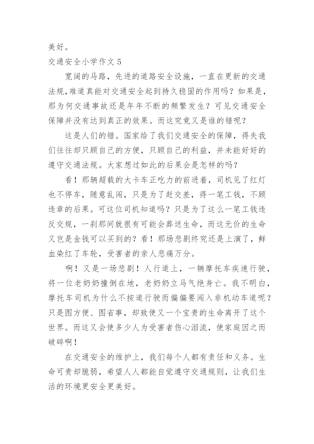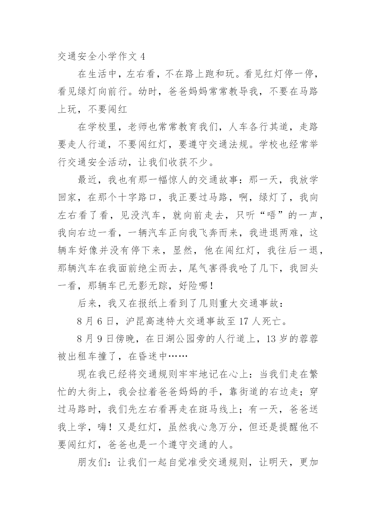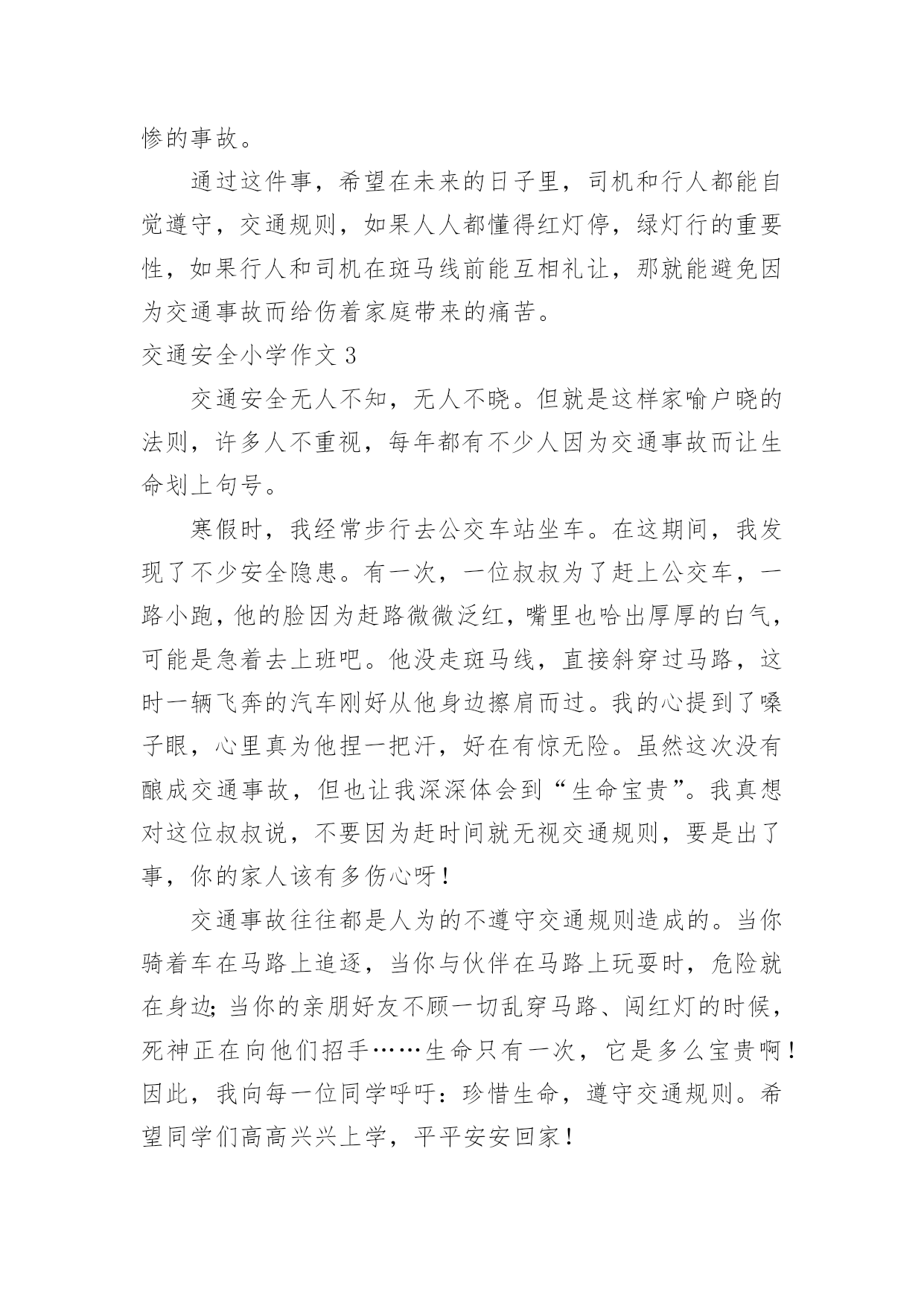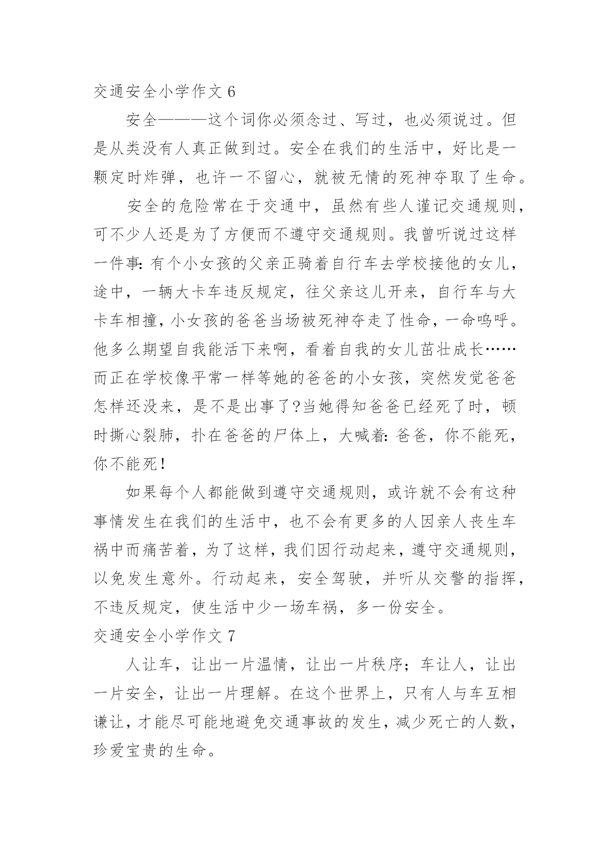 交通安全小学作文交通安全小学作文无论是身处学校还是步入社会,大家都尝试过写作文吧,作文要求篇章结构完整,一定要避免无结尾作文的出现。那么,怎么去写作文呢?下面是小编精心整理的交通安全小学作文,欢迎大家分享。交通安全小学作文1人们的生命总是一去不返,所以我们必须珍惜宝贵的生命,但有时让你丧失生命的却是一场小小的车祸。所以我们要行动起来,把交通安全永远记在心里。今天晚上,我正在收看新闻联播,发现了一起重大的交通事故——在高速公路上有十五辆车连撞造成人员伤亡,这是谁引起的交通事故?还是我们没有遵守交通规则呢?还有时,一些人为了赶时间还常常违章驾驶,我真为那些违章驾驶的人感到可耻,自己为了赶时间,把那一些无辜的人也牵连进来,让他们也受到伤害。有时在上学的路上,我总看见一些驾驶员趁着交警不注意的情况下闯红灯,他们都带着侥幸的心理想蒙混过关。但要是出了交通事故,就要你负责了。俗话说得好“不怕一万,只怕万一。”所以请大家不要因为时间急而闯红灯。闯红灯是一件多么“愚蠢”的事情呀!想到这里,我不禁从书柜里翻出一本书来:《机动车道路交通安全法》翻过一页又一页,我编了一则顺口溜送给大家,希望大家牢记心中:红灯停,绿灯行,交通安全要牢记。街头标志要遵守,警察手势要看懂。拐弯时,要打灯,街头巷尾要慢行。酒后驾车真不好,赔了车子又蹲狱。在高速,勿超车,切记车速要控好。大客货车忌超载,交通安全你我他。交通安全小学作文2现在,人们的生活水平提高了,许多家庭都有了私家车,外来人口也逐渐增多,因此,给交通安全带来了许多困扰。这天,奶奶带我放学回家。在楼下看见隔壁楼梯的阿姨在抽泣,阿姨的肩膀颤动着,晶莹的泪水顺着她秀丽的脸颊流下来。我和奶奶上前询问,才得知她妈妈被车撞到,送到医院急救的消息:那天下午,隔壁老奶奶骑着自行车接小孙女回家,来到斑马线前,她自觉地下了自行车,牵着车子走过斑马线。这时,一辆出租车直撞过来,一下子就把老奶奶和小孙女撞倒在地上。老奶奶一瞬间便失去知觉,不醒人世了。老奶奶被人紧急送到医院抢救,可还是不治身亡了。听了这件事,我顿时愣住了,看者阿姨伤心的样子,心里不由泛起一阵同情和怜悯。我想:老天爷真不公平,这么好的人,这么善良的老奶奶,却因一场交通事故被夺去了宝贵的生命。如果那位出租车司机遵守交通规则,在斑马线前减慢速度,让老奶奶和行人先过,再慢慢驾车离去。就不会造成这起悲惨的事故。通过这件事,希望在未来的日子里,司机和行人都能自觉遵守,交通规则,如果人人都懂得红灯停,绿灯行的重要性,如果行人和司机在斑马线前能互相礼让,那就能避免因为交通事故而给伤着家庭带来的痛苦。交通安全小学作文3交通安全无人不知,无人不晓。但就是这样家喻户晓的法则,许多人不重视,每年都有不少人因为交通事故而让生命划上句号。寒假时,我经常步行去公交车站坐车。在这期间,我发现了不少安全隐患。有一次,一位叔叔为了赶上公交车,一路小跑,他的脸因为赶路微微泛红,嘴里也哈出厚厚的白气,可能是急着去上班吧。他没走斑马线,直接斜穿过马路,这时一辆飞奔的汽车刚好从他身边擦肩而过。我的心提到了嗓子眼,心里真为他捏一把汗,好在有惊无险。虽然这次没有酿成交通事故,但也让我深深体会到“生命宝贵”。我真想对这位叔叔说,不要因为赶时间就无视交通规则,要是出了事,你的家人该有多伤心呀!交通事故往往都是人为的不遵守交通规则造成的。当你骑着车在马路上追逐,当你与伙伴在马路上玩耍时,危险就在身边;当你的亲朋好友不顾一切乱穿马路、闯红灯的时候,死神正在向他们招手……生命只有一次,它是多么宝贵啊!因此,我向每一位同学呼吁:珍惜生命,遵守交通规则。希望同学们高高兴兴上学,平平安安回家!交通安全小学作文4在生活中,左右看,不在路上跑和玩。看见红灯停一停,看见绿灯向前行。幼时,爸爸妈妈常常教导我,不要在马路上玩,不要闯红在学校里,老师也常常教育我们,人车各行其道,走路要走人行道,不要闯红灯,要遵守交通法规。学校也经常举行交通安全活动,让我们收获不少。最近,我也有那一幅惊人的交通故事:那一天,我放学回家,在那个十字路口,我正要过马路,啊,绿灯了,我向左右看了看,见没汽车,就向前走去,只听“唔”的一声,我向右边一看,一辆汽车正向我飞奔而来,我进退两难,这辆车好像并没有停下来,显然,他在闯红灯,我往后一退,那辆汽车在我面前绝尘而去,尾气害得我呛了几下,我回头一看,那辆车已无影无踪,好险哪!后来,我又在报纸上看到了几则重大交通事故:8月6日,沪昆高速特大交通事故至17人死亡。8月9日傍晚,在日湖公园旁的人行道上,13岁的蓉蓉被出租车撞了,在昏迷中……现在我已经将交通规则牢牢地记在心上:当我们走在繁忙的大街上,我会拉着爸爸妈妈的手,靠街道的右边走;穿过马路时,我们先左右看再走在斑马线上;有一天,爸爸送我上学,嗨!又是红灯,虽然我心